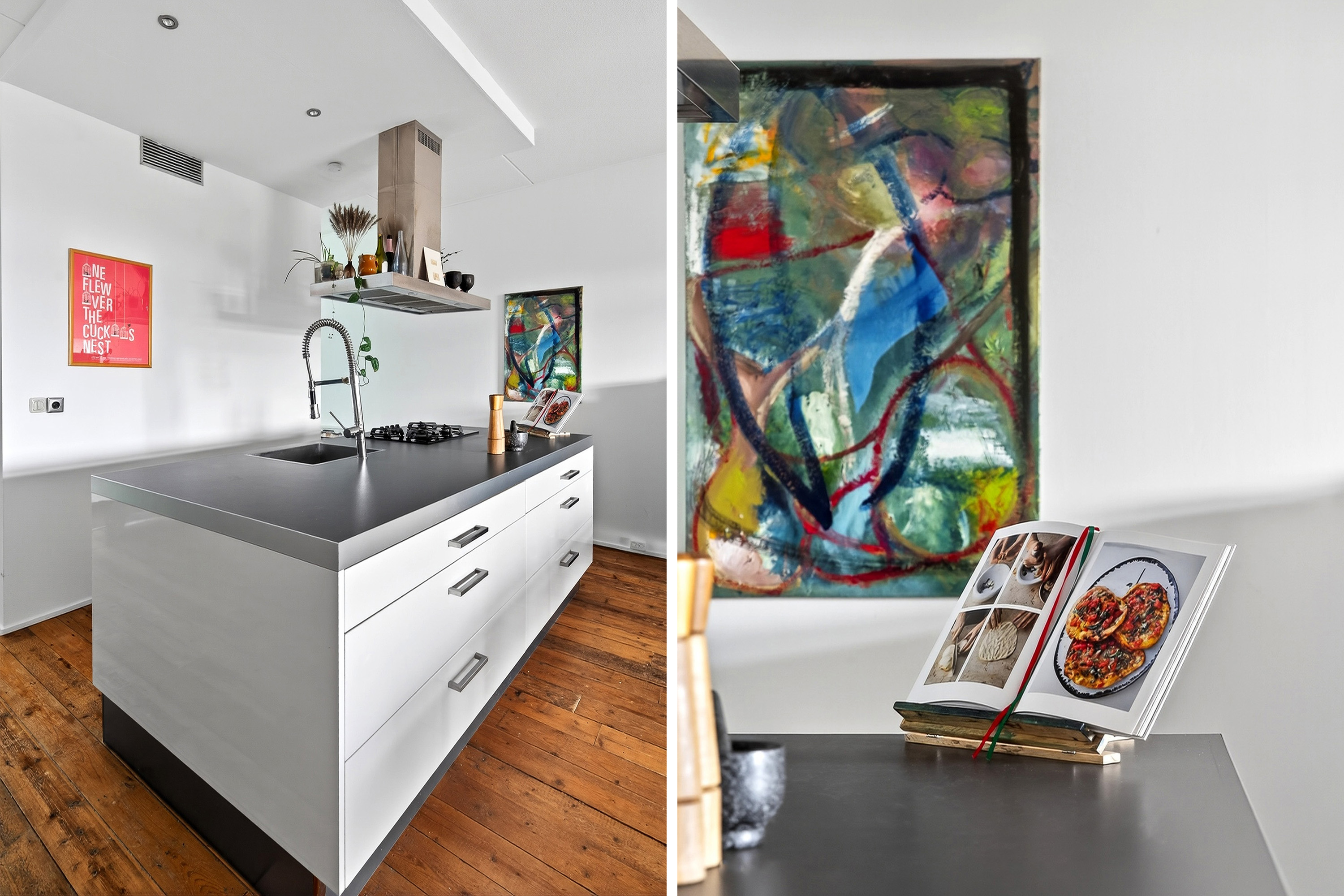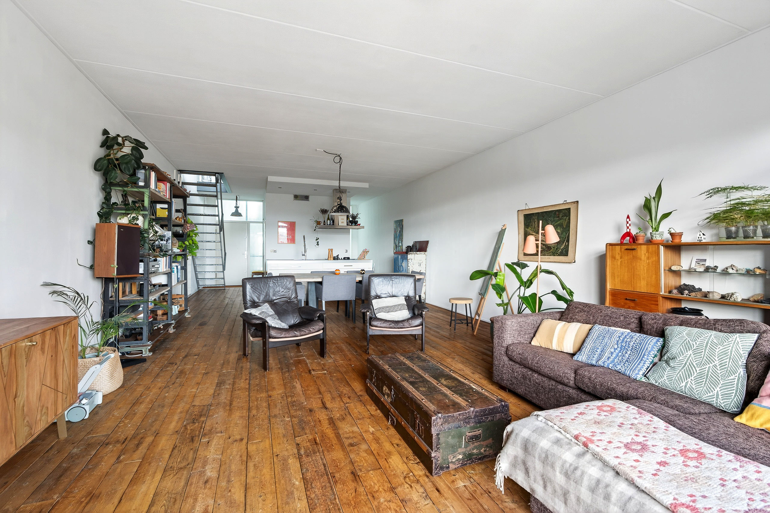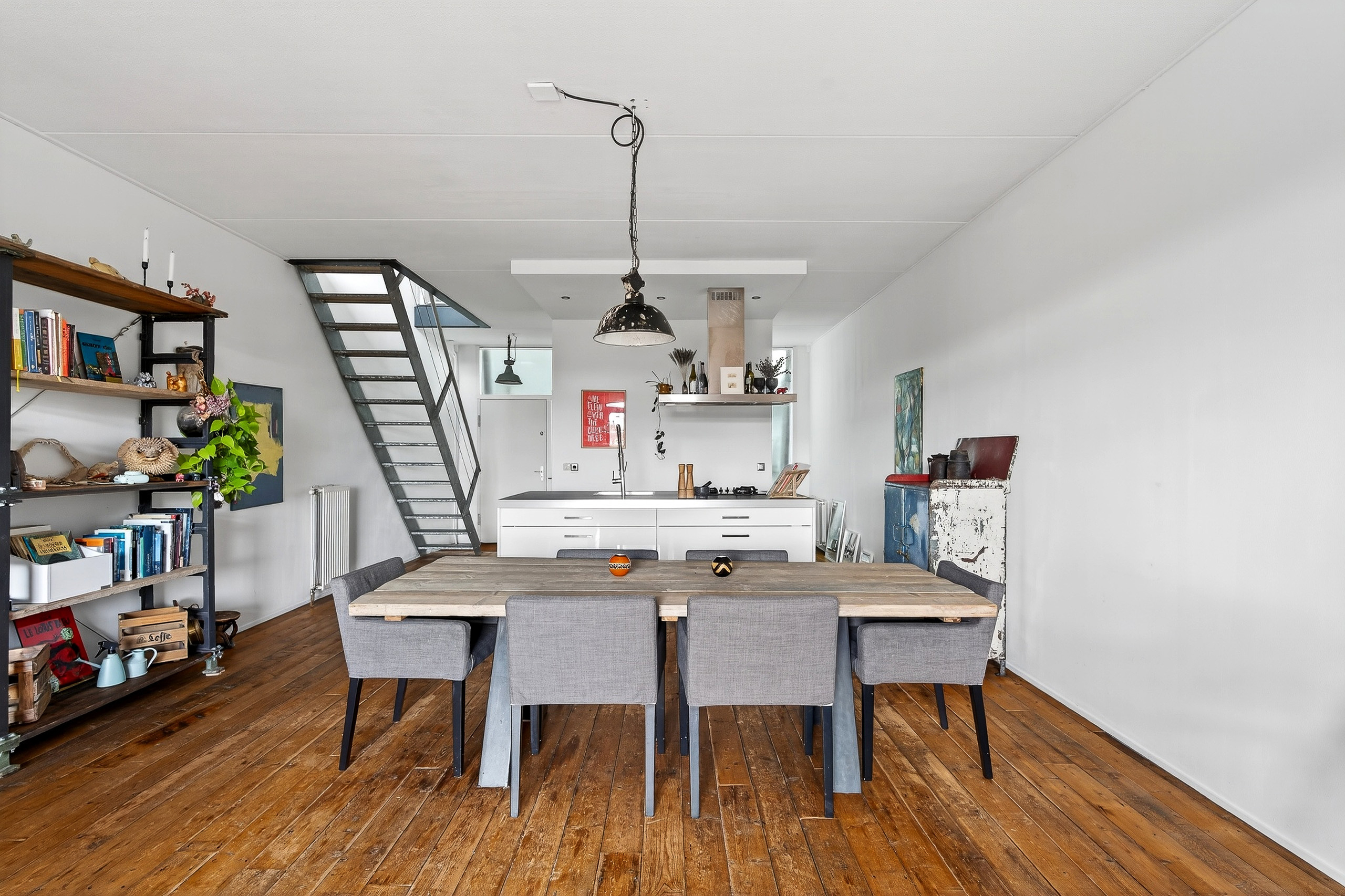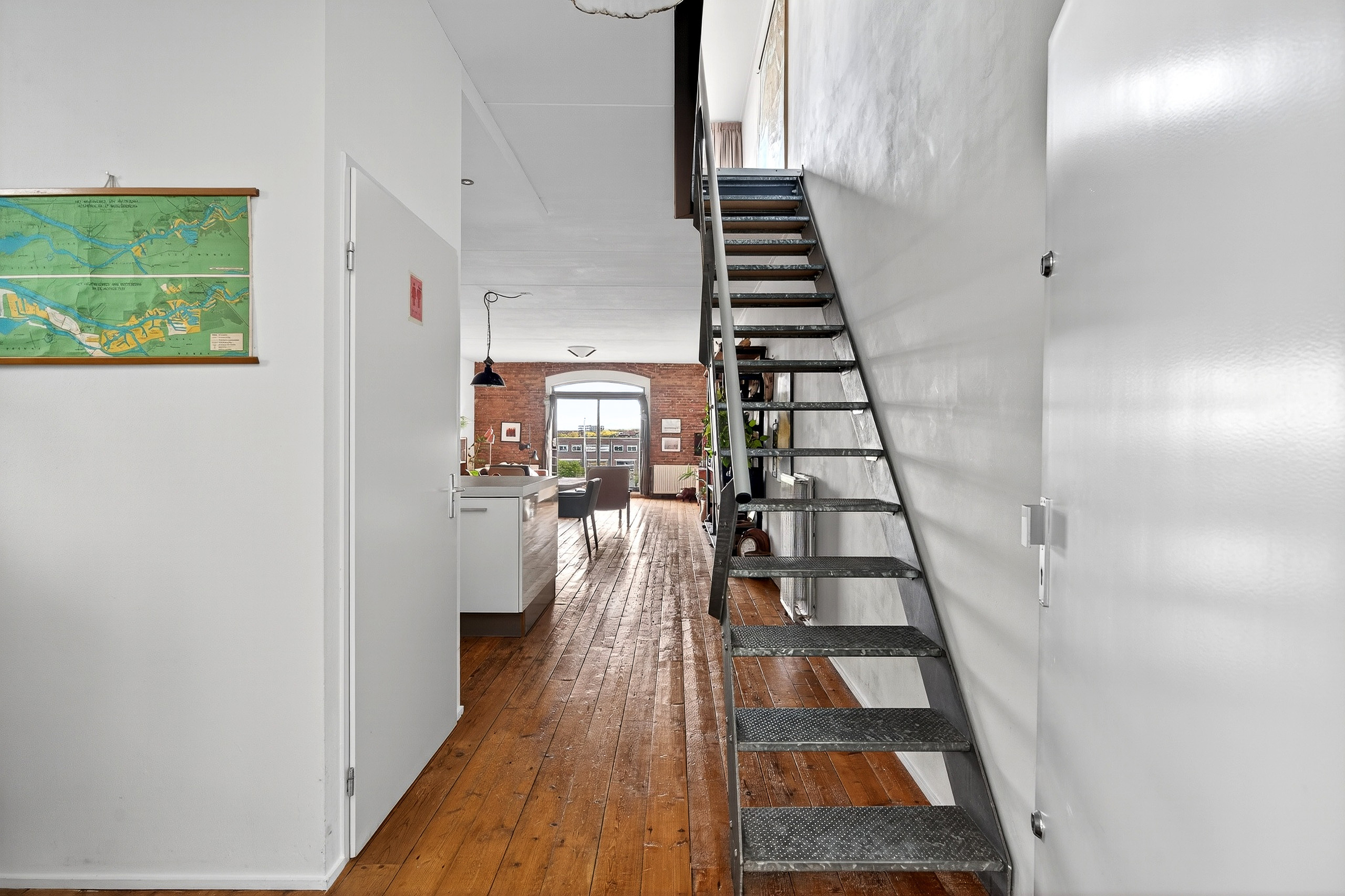 Via de interne galerij bereik je de woning op de derde verdieping. Bij binnenkomst word je direct verwelkomd in de entree, waar de open indeling zorgt voor een ruimtelijk en uniek gevoel. Het leefgedeelte sluit naadloos aan en is royaal opgezet, met grote raampartijen die veel licht binnenlaten. Centraal in de ruimte bevindt zich de open keuken, modern en praktisch ingericht. De afwerking is strak met een industriële touch: een robuuste houten vloer en originele details geven het geheel karakter en sfeer.