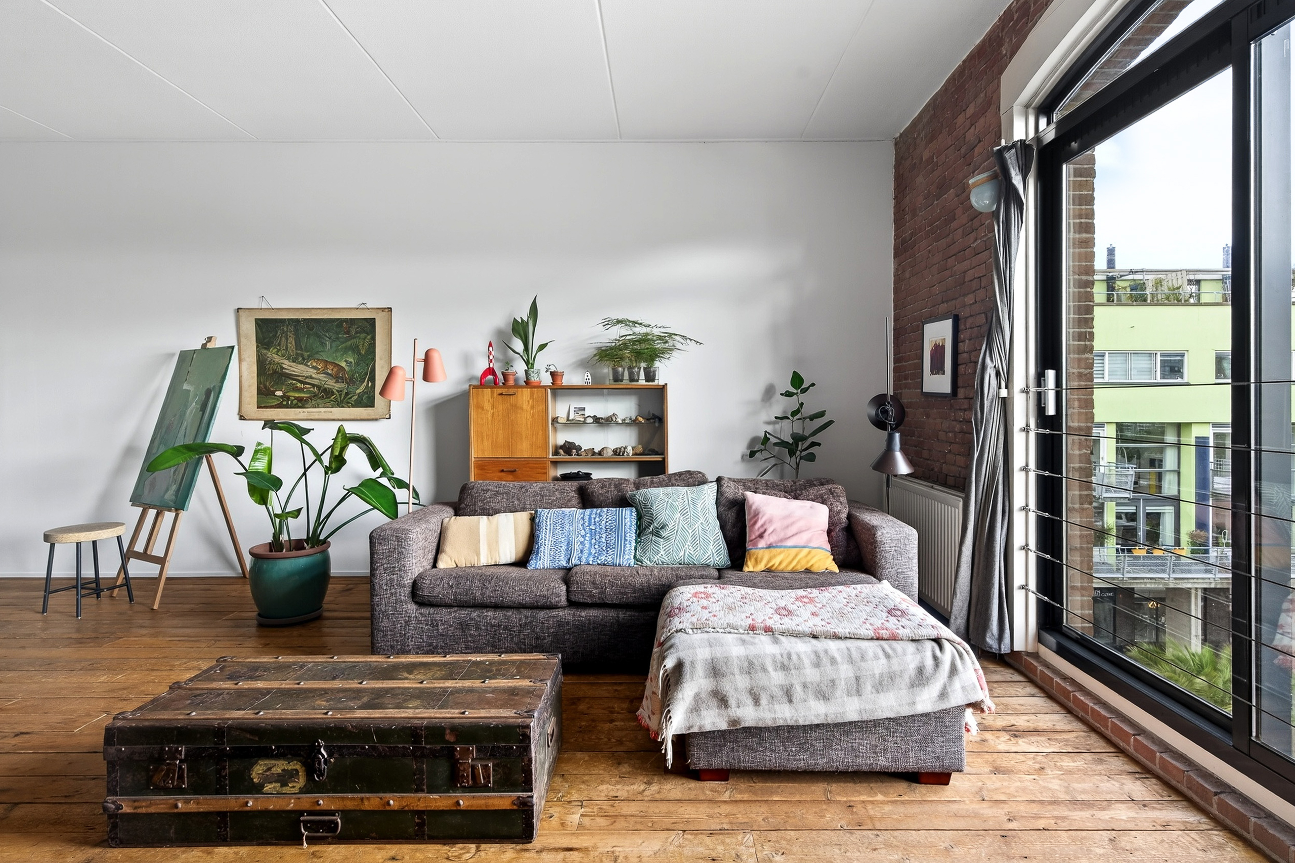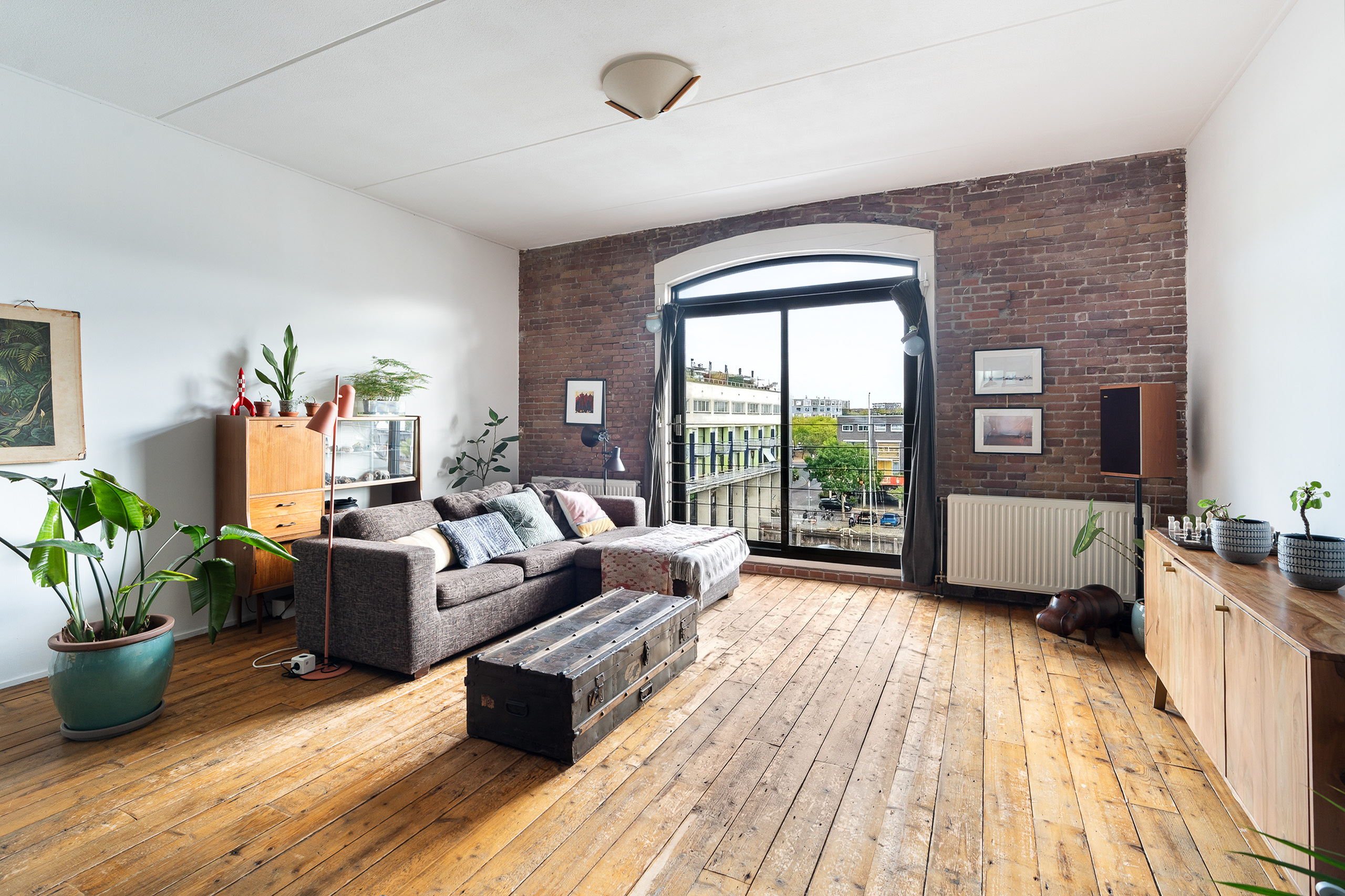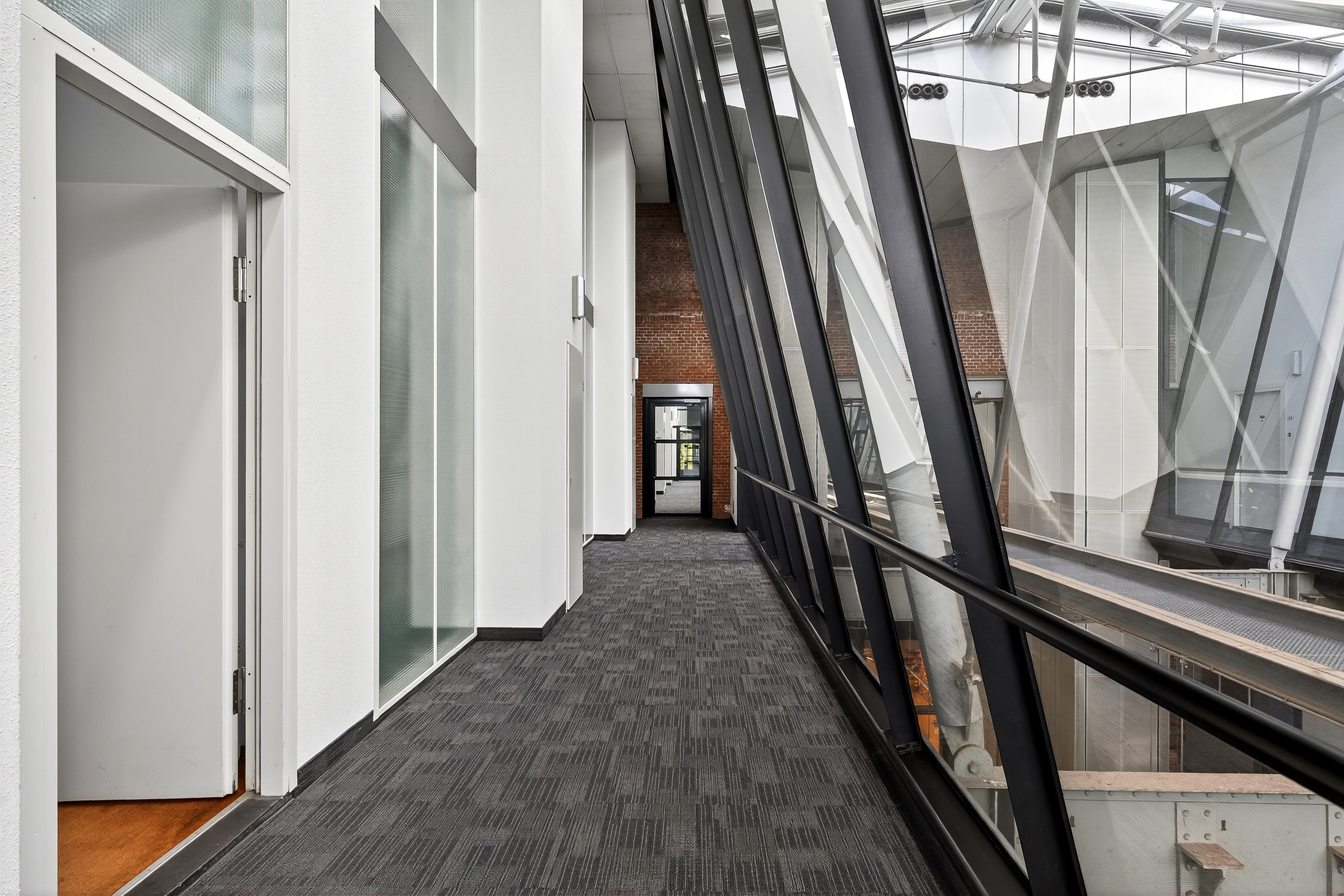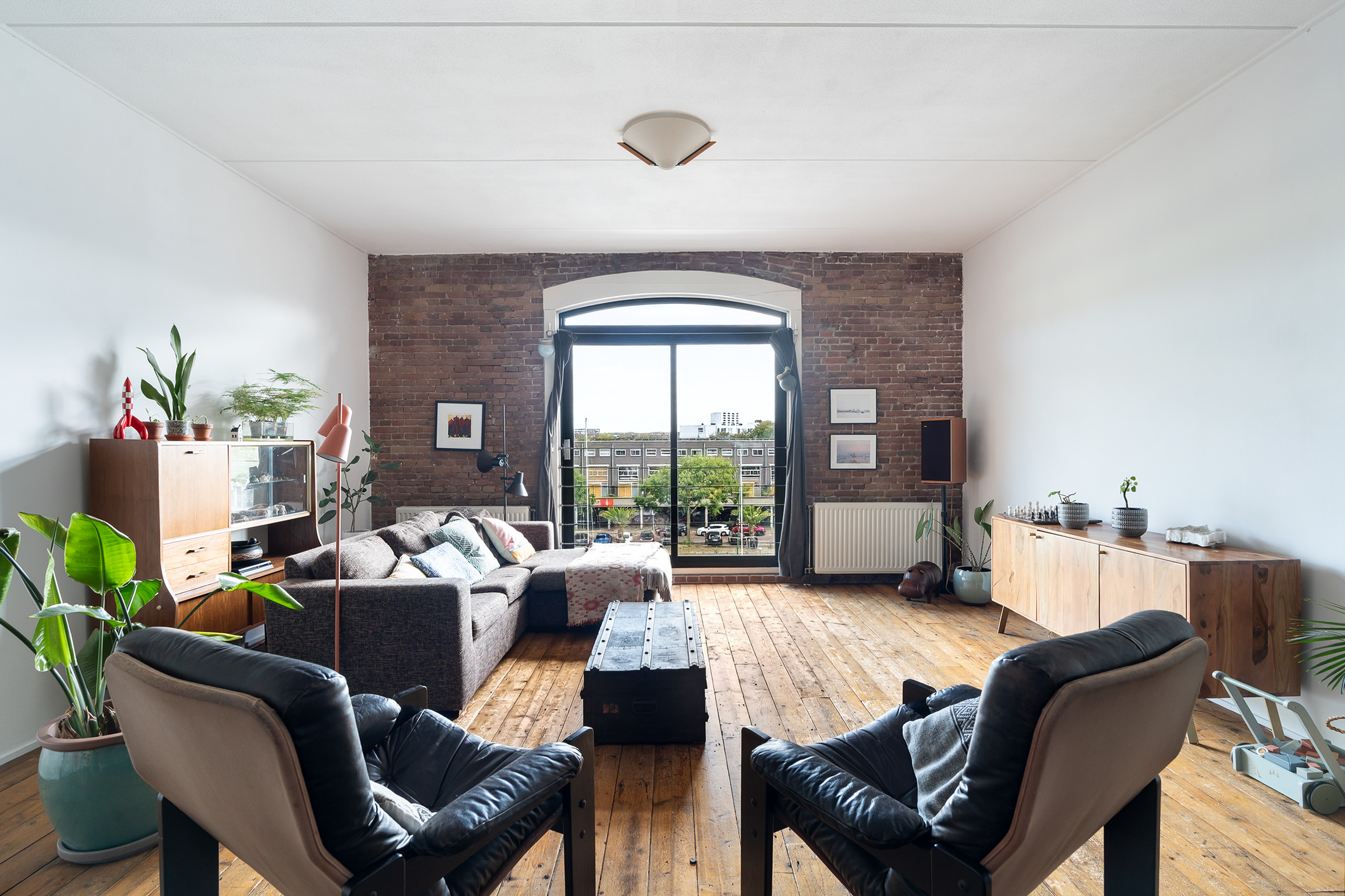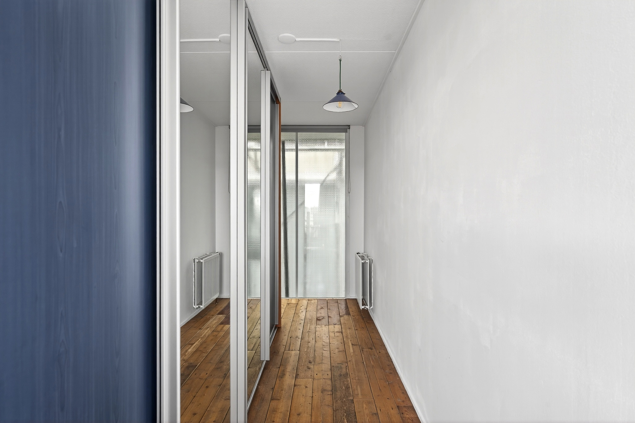 Via de interne galerij bereik je de woning op de derde verdieping. Bij binnenkomst word je direct verwelkomd in de entree, waar de open indeling zorgt voor een ruimtelijk en uniek gevoel. Het leefgedeelte sluit naadloos aan en is royaal opgezet, met grote raampartijen die veel licht binnenlaten. Centraal in de ruimte bevindt zich de open keuken, modern en praktisch ingericht. De afwerking is strak met een industriële touch: een robuuste houten vloer en originele details geven het geheel karakter en sfeer.