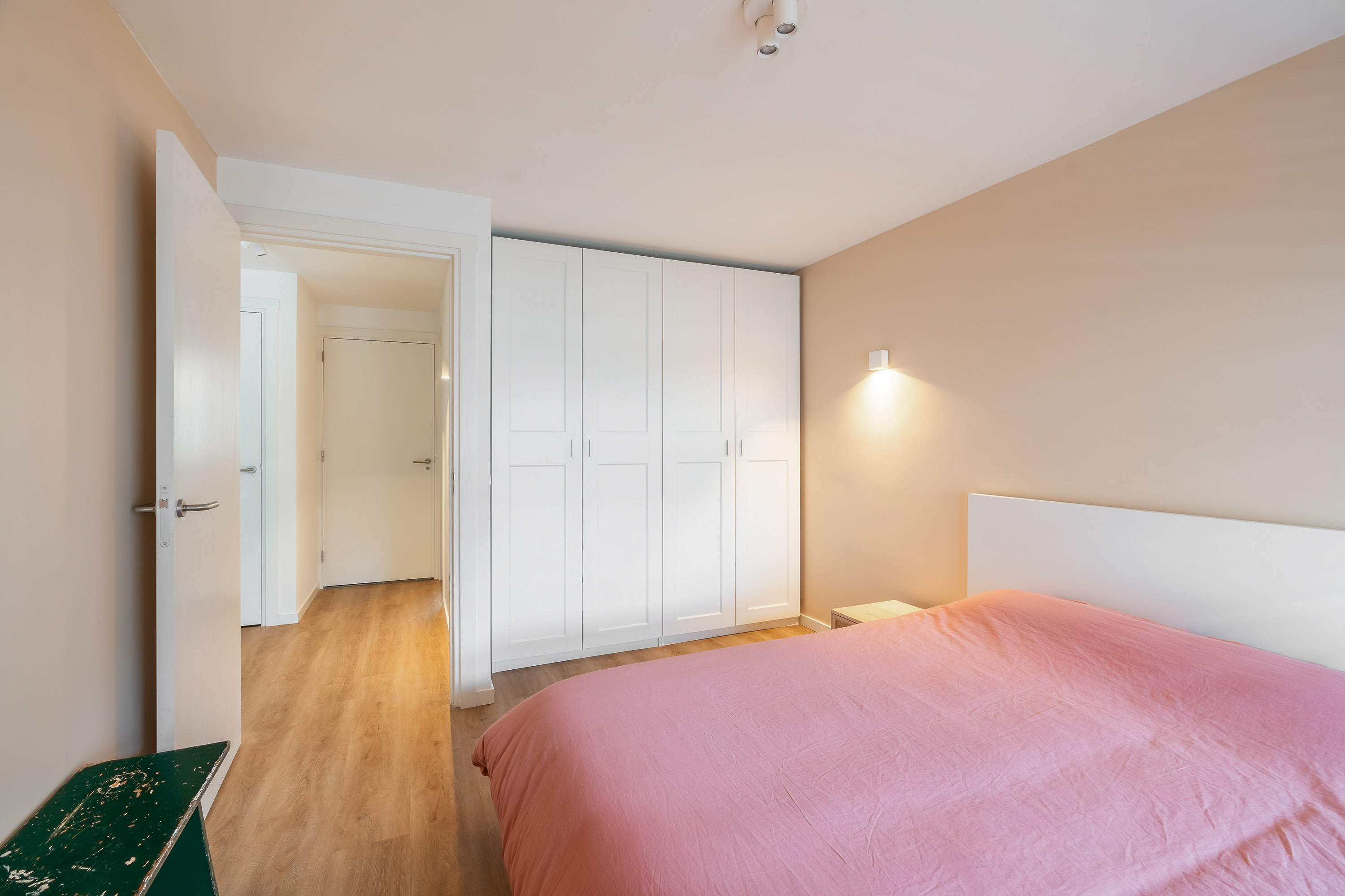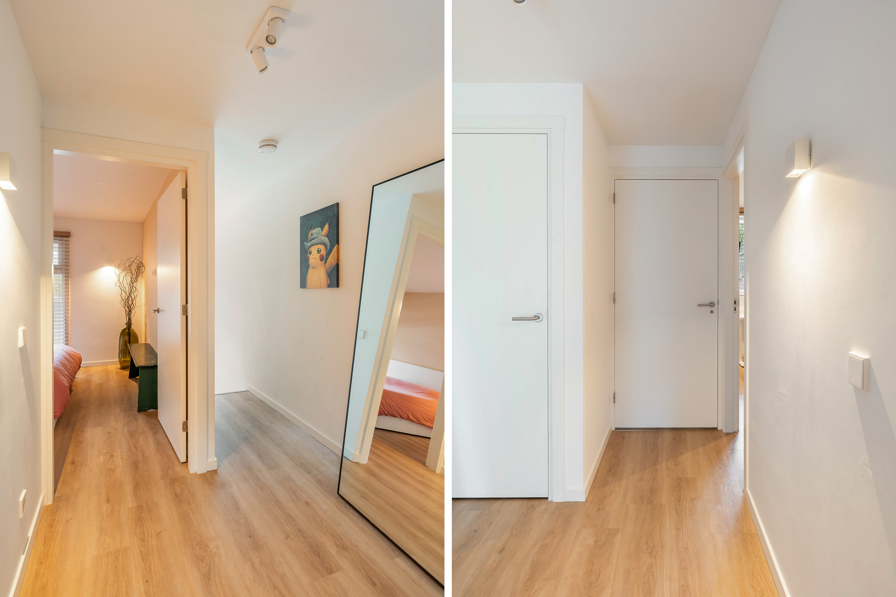 Vanaf de overloop zijn de verschillende vertrekken toegankelijk. Vanuit de hoofdslaapkamer, aan de voorzijde, is er niet alleen zicht naar buiten, maar ook een unieke doorkijk naar de woonkamer door de vide. Aan de andere zijde is de tweede slaapkamer gelegen, die ideaal ingericht kan worden als bijvoorbeeld werkkamer of kledingkamer. In de badkamer zijn rustige kleuren gecombineerd met trendy tegels en luxe materialen. Dit geeft een fijne, ontspannen sfeer. De ruimte is compleet uitgerust met een inloopdouche met rainshower, een wastafel, een toilet en een handdoekradiator. Op de overloop is een vaste kast met de cv-opstelling gevestigd.