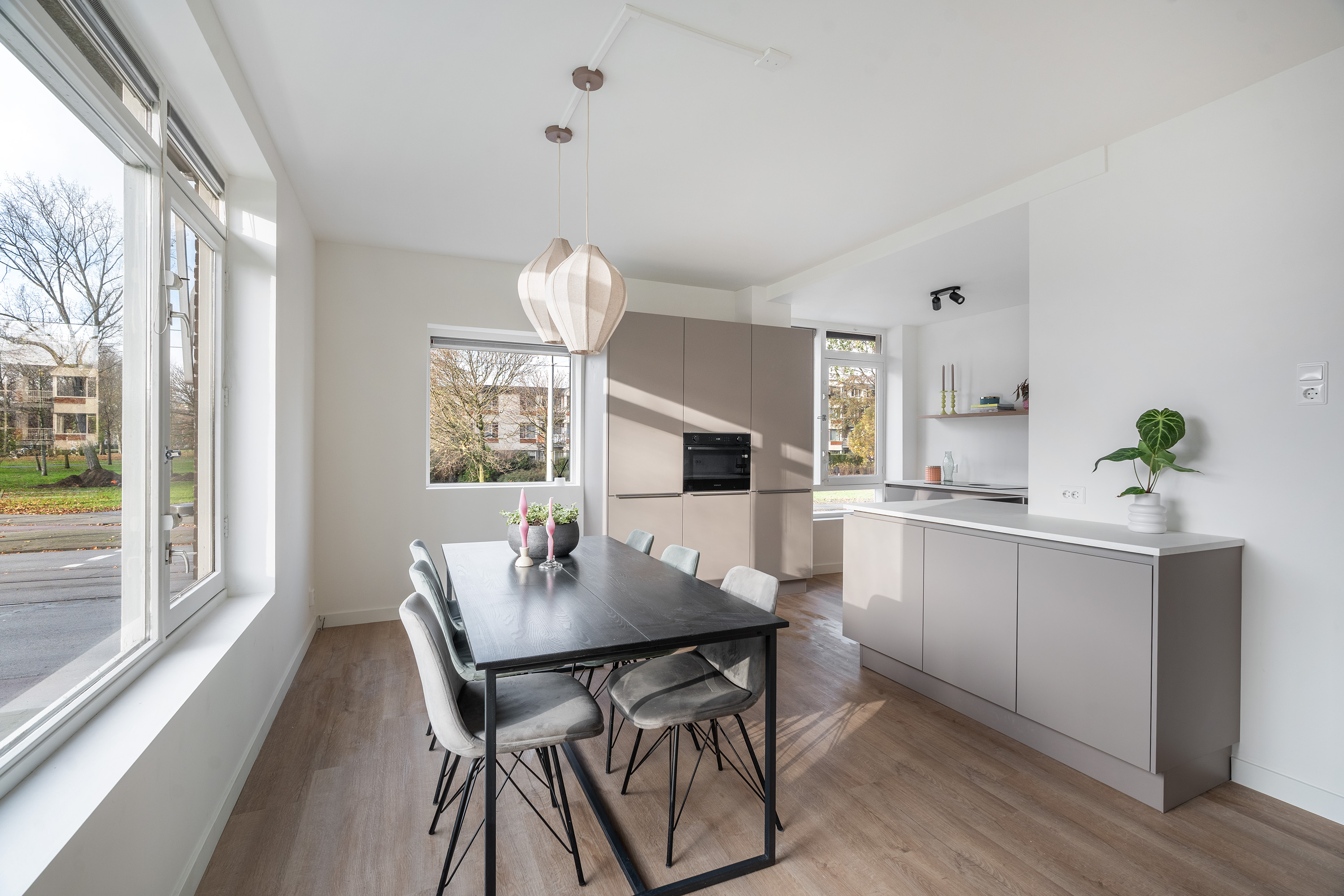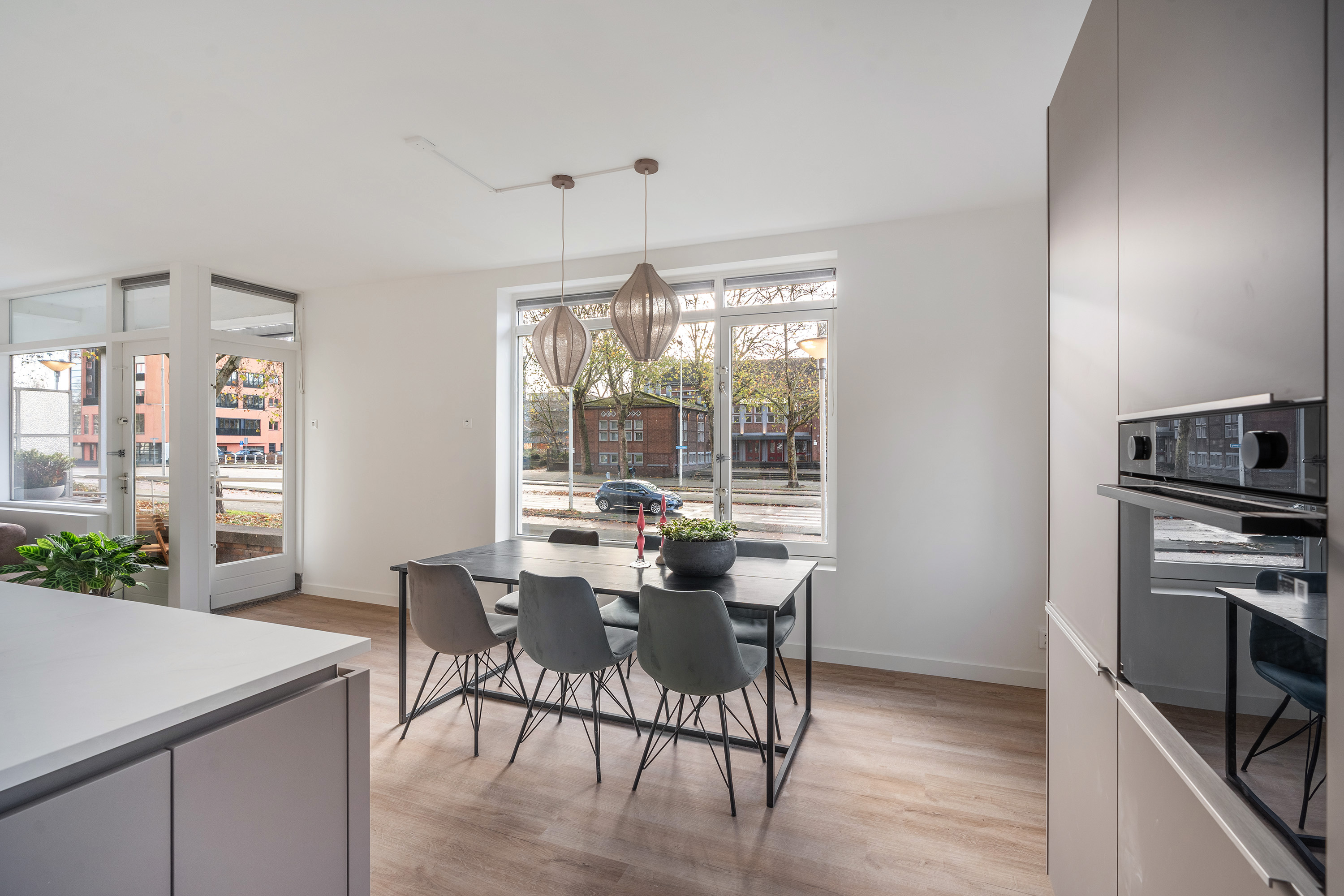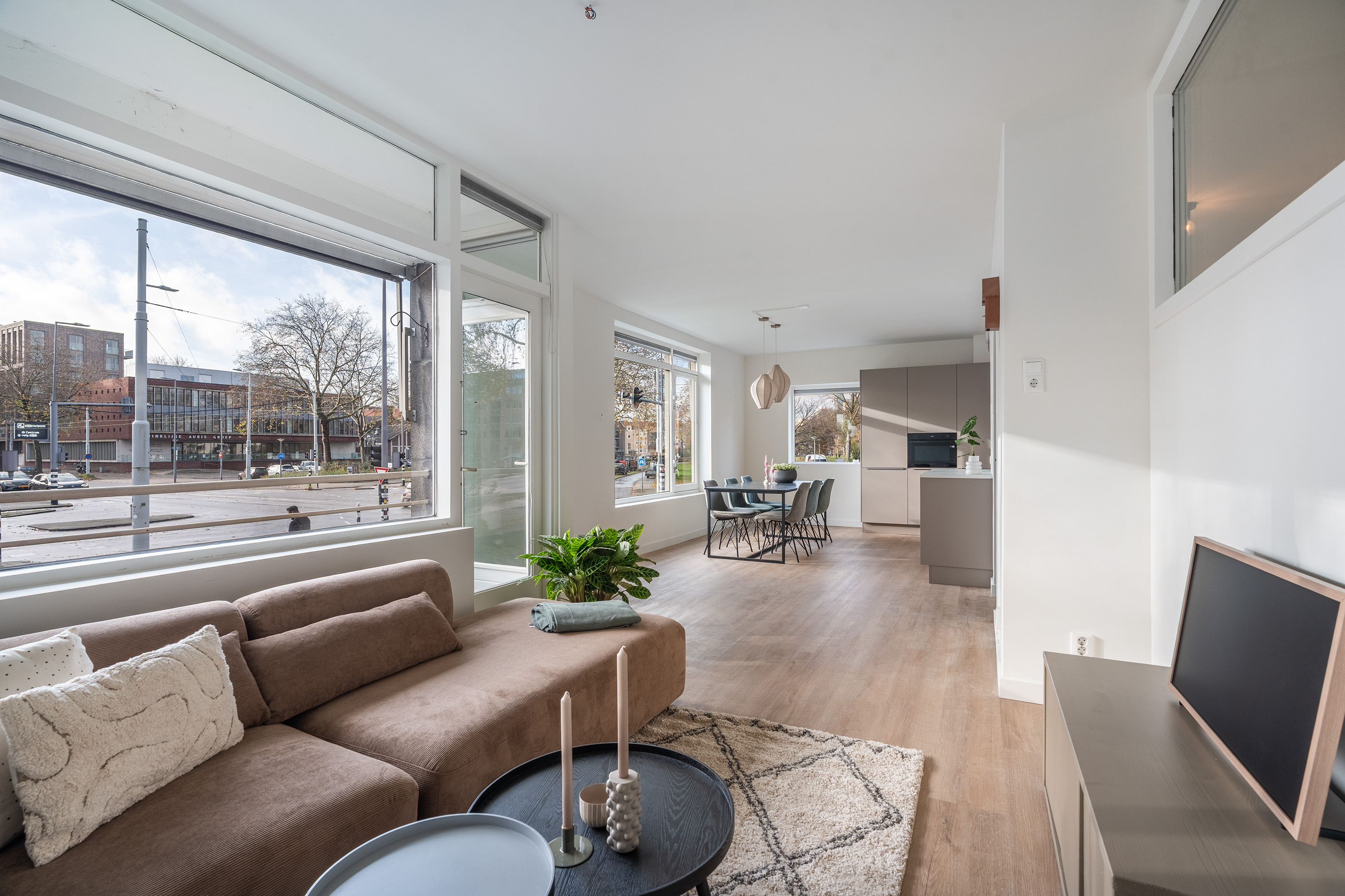Bij binnenkomst in de ruime entree ervaar je direct de prettige verbinding met de verschillende vertrekken. Het appartement is in 2025 volledig gerenoveerd en ademt daardoor de luxe en trends van nu. Stap het leefgedeelte binnen, waar de grote raampartijen over de volledige voorzijde voor een indrukwekkende lichtinval zorgen. De afwerking is neutraal, hoogwaardig en fris: een strakke pvc-vloer en glad gestuukte wanden vormen de perfecte basis.
