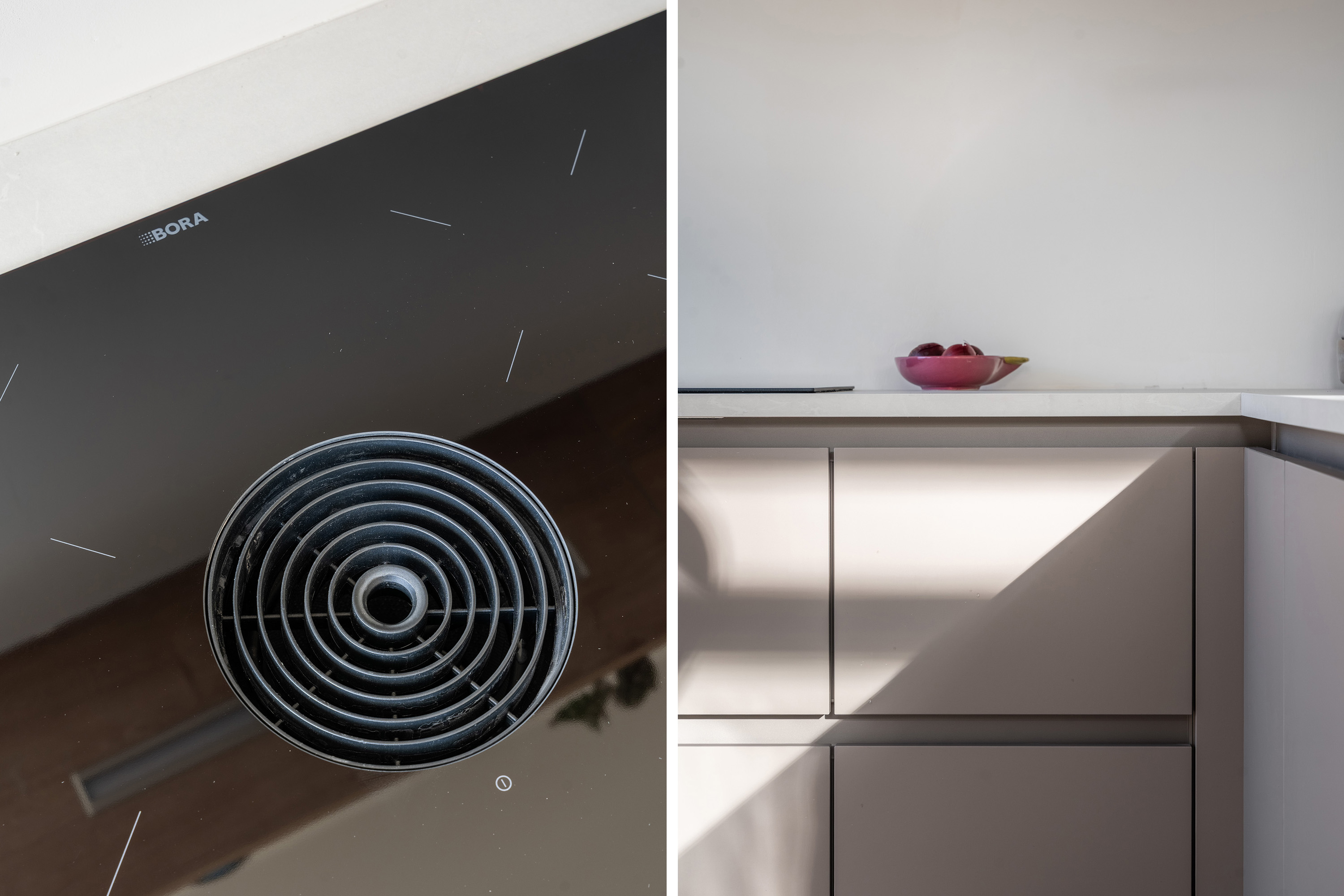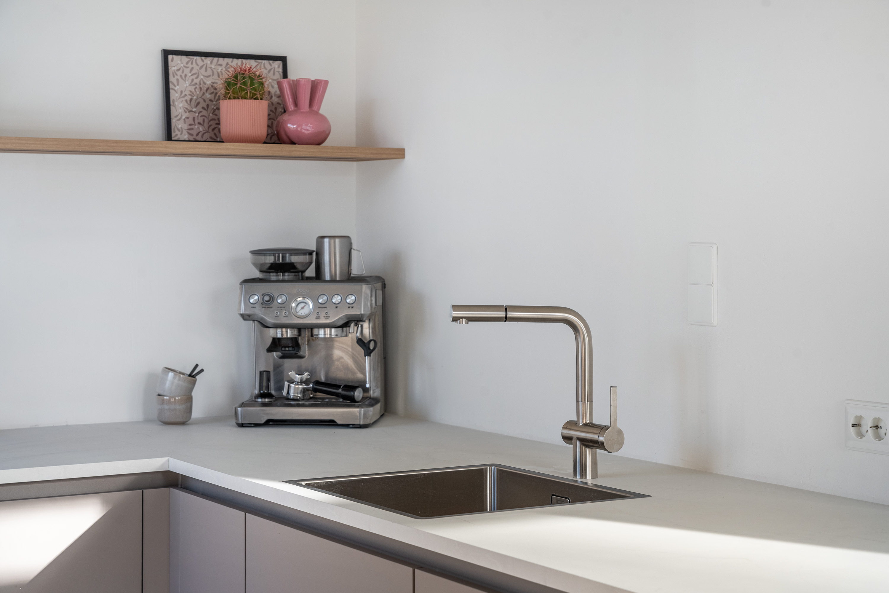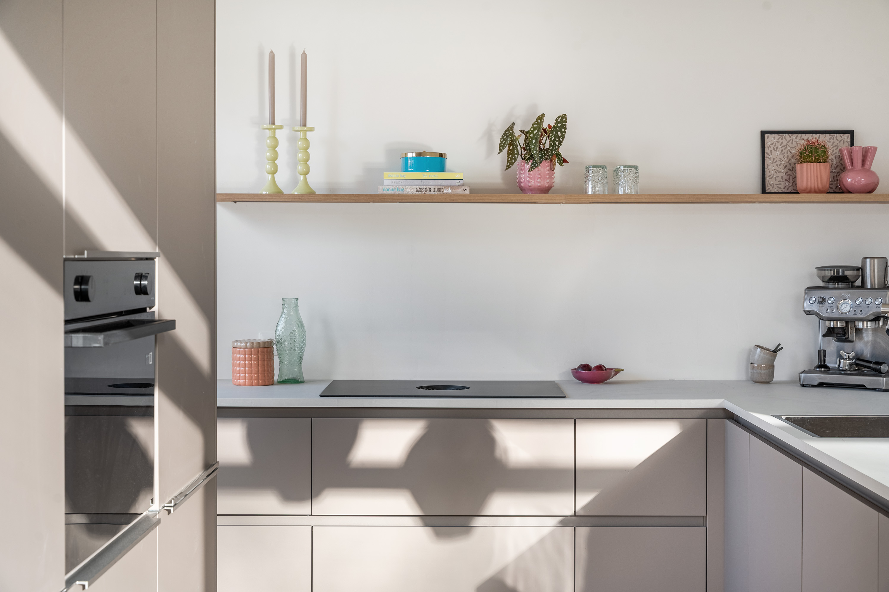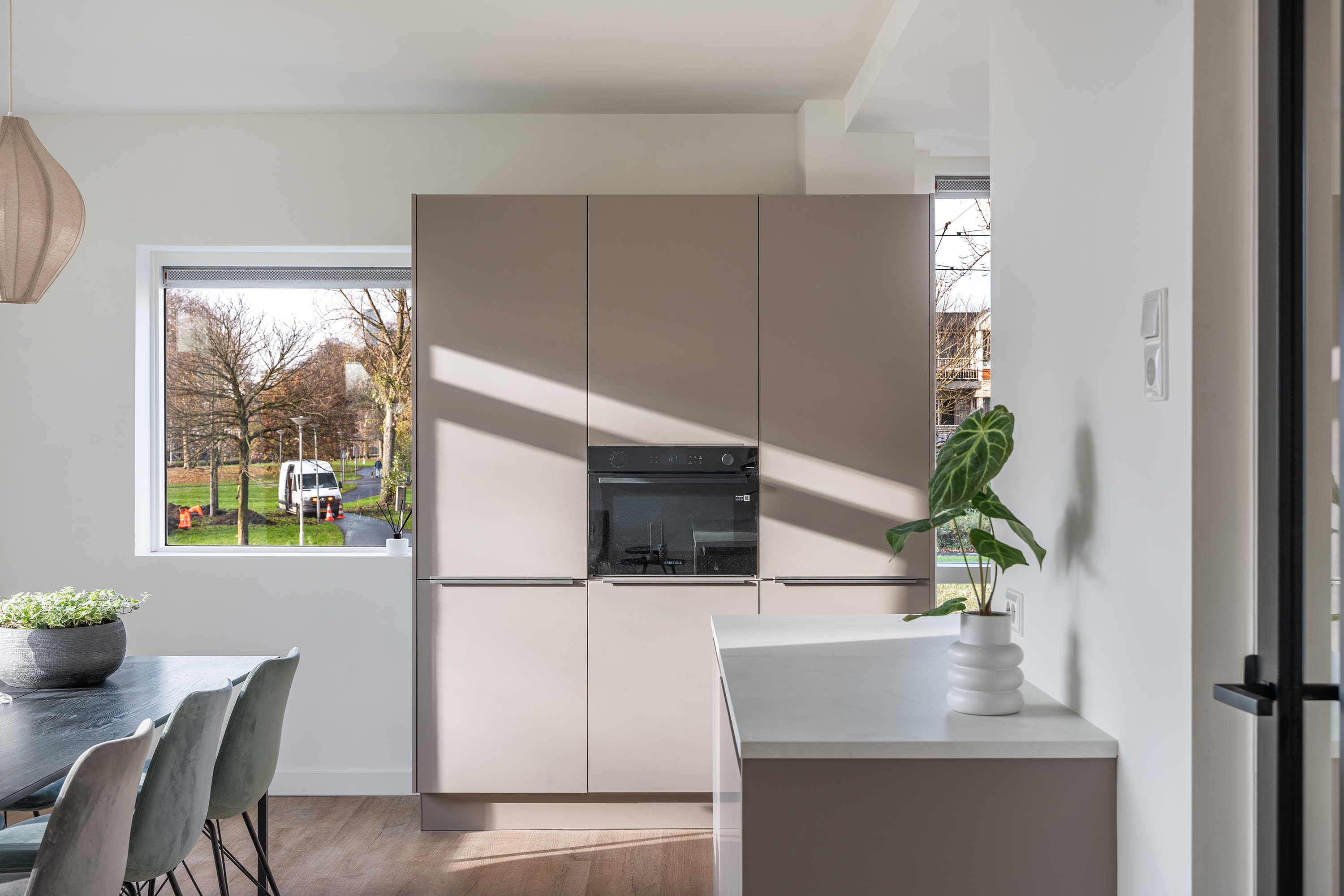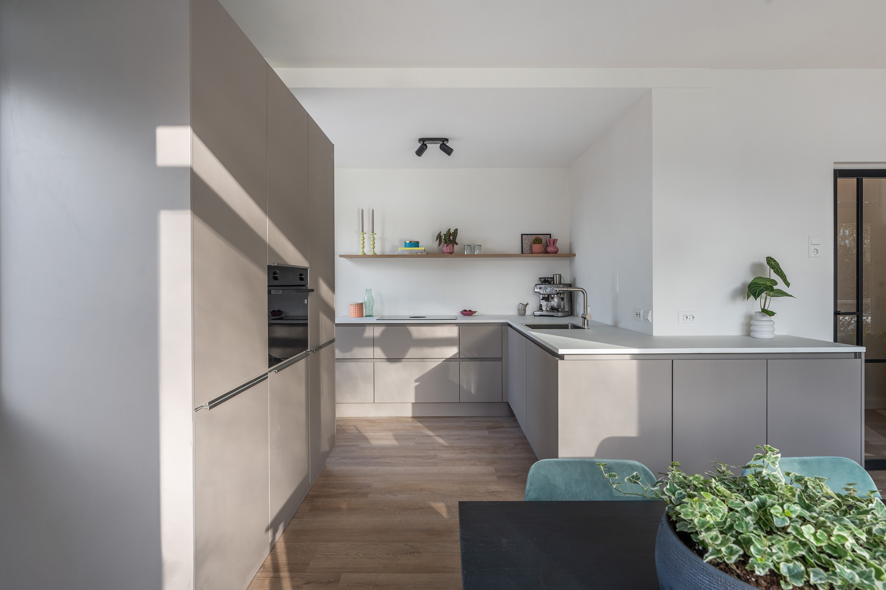 De open keuken (2025) sluit hier naadloos op aan, met beige fronten en een luxe afwerkingsniveau. De living beslaat de volledige breedte van het appartement en kan geheel naar eigen wens worden ingericht. Er is ruimte voor een comfortabele zithoek en een royale eethoek direct naast de keuken. De keuken is compleet uitgerust met onder meer een combi-oven, Bora kookplaat, koelkast, vriezer, vaatwasser en veel bergruimte. Aan het leefgedeelte grenst bovendien een zonnig balkon op het zuiden, waar je heerlijk kunt ontspannen.
