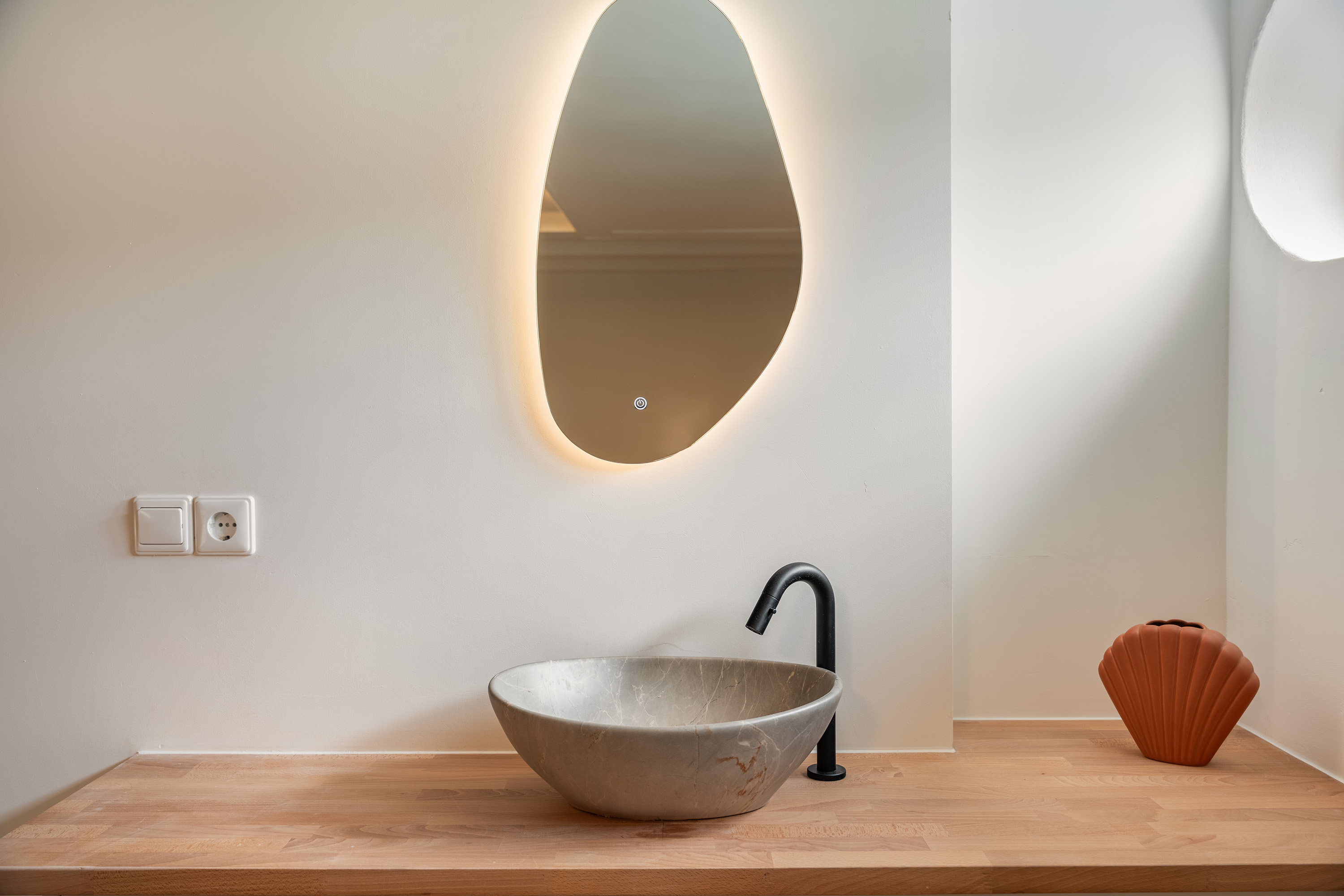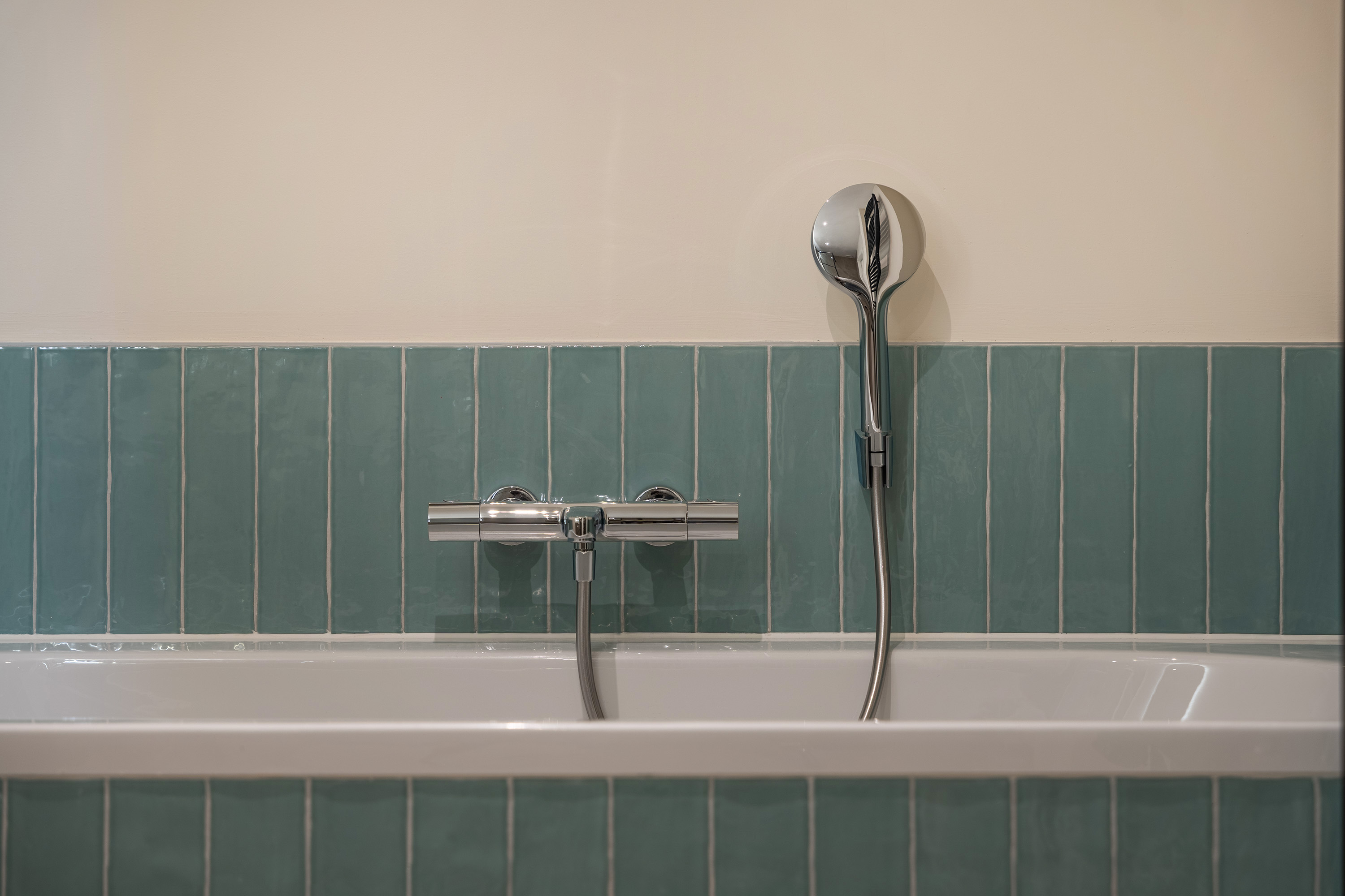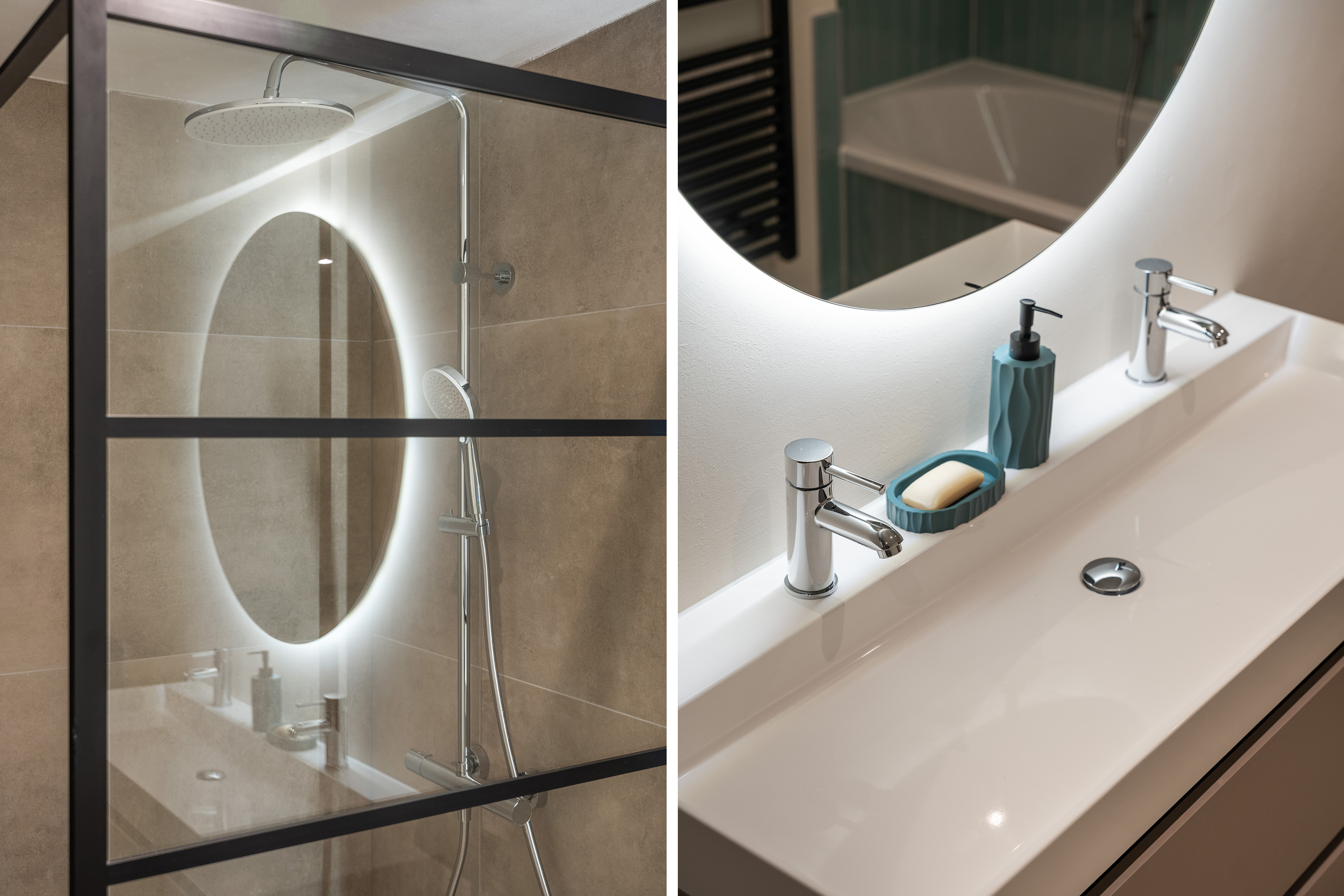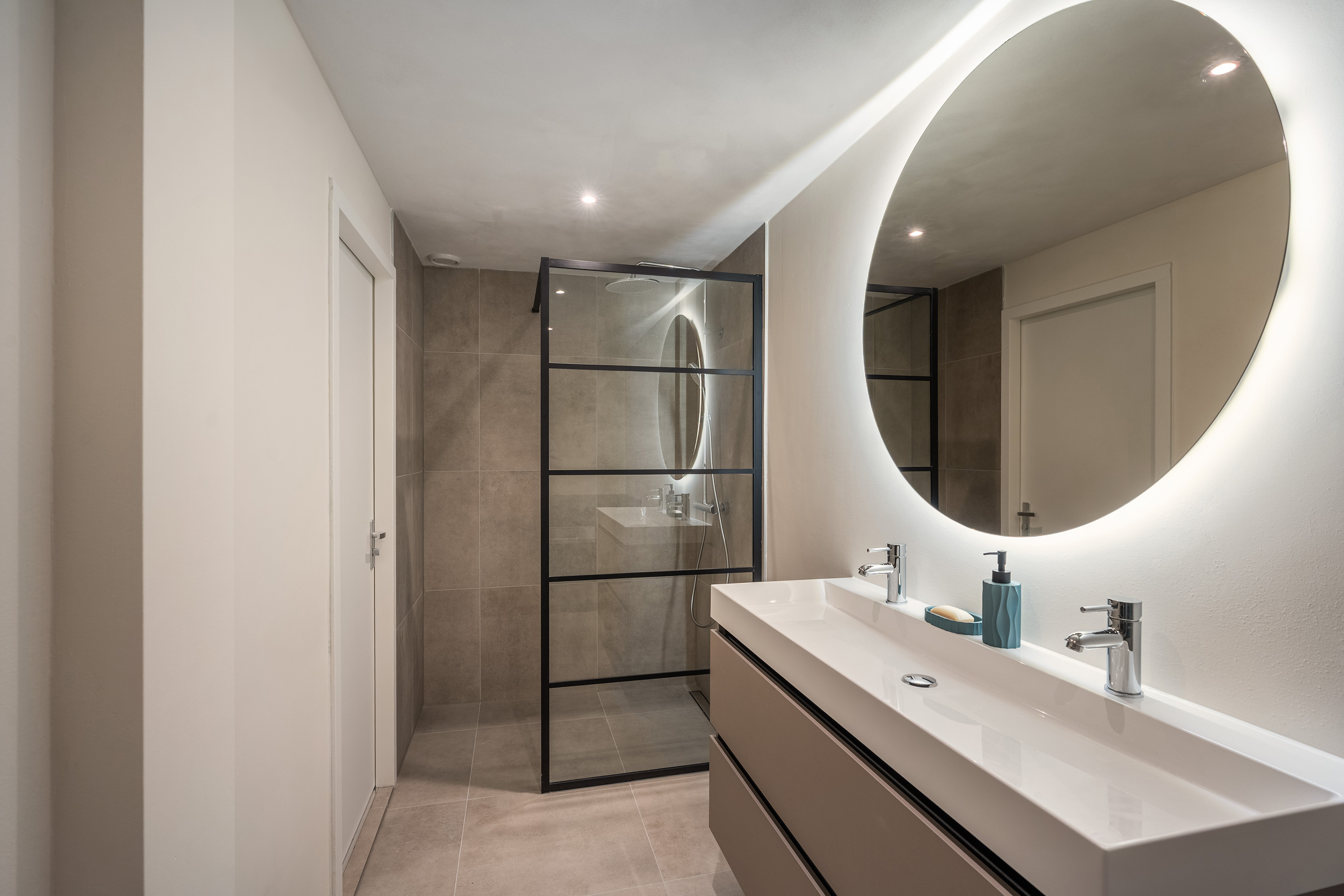 Terug in de entree bereik je de badkamer en het separate toilet. Ook de badkamer (2025) laat oog voor detail zien. Neutrale vloer- en wandtegels worden hier gecombineerd met een lichtblauwe tegelwand bij het ligbad, wat zorgt voor een verfijnde uitstraling. Het smaakvolle badkamermeubel met dubbele wastafel, ronde verlichte spiegel en de ruime inloopdouche met glas-in-staal wand maken het plaatje compleet. Een ideale plek om je dag prettig te beginnen én ontspannen af te sluiten.