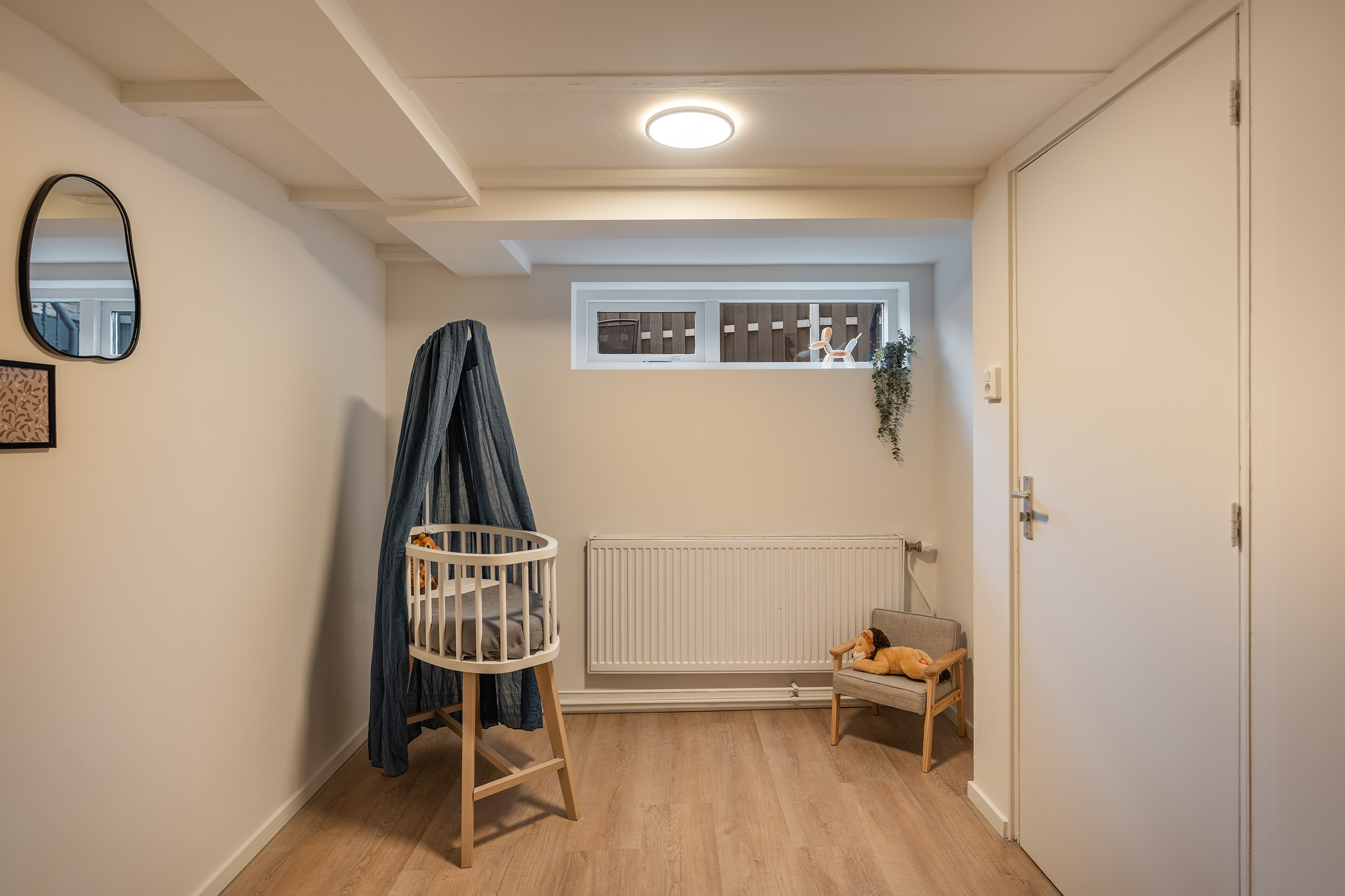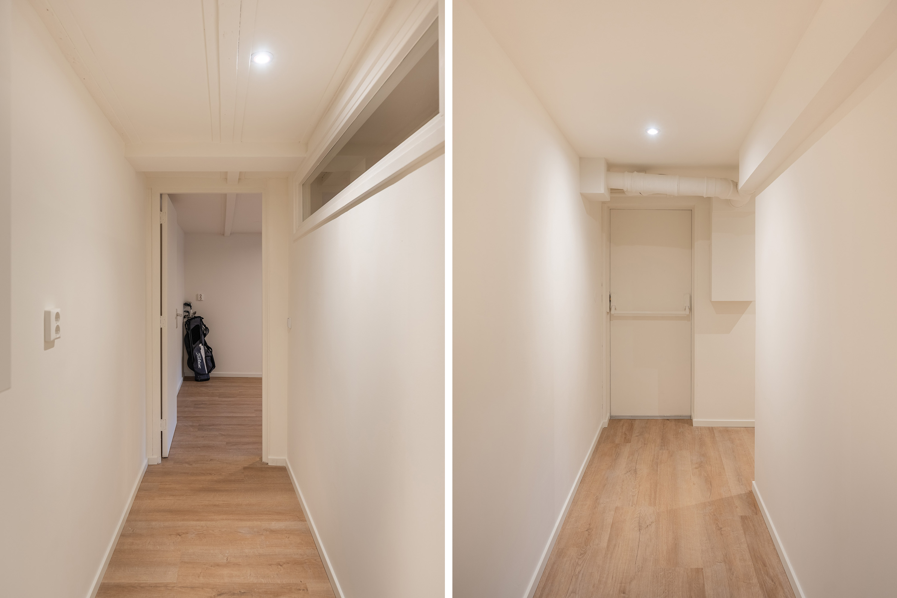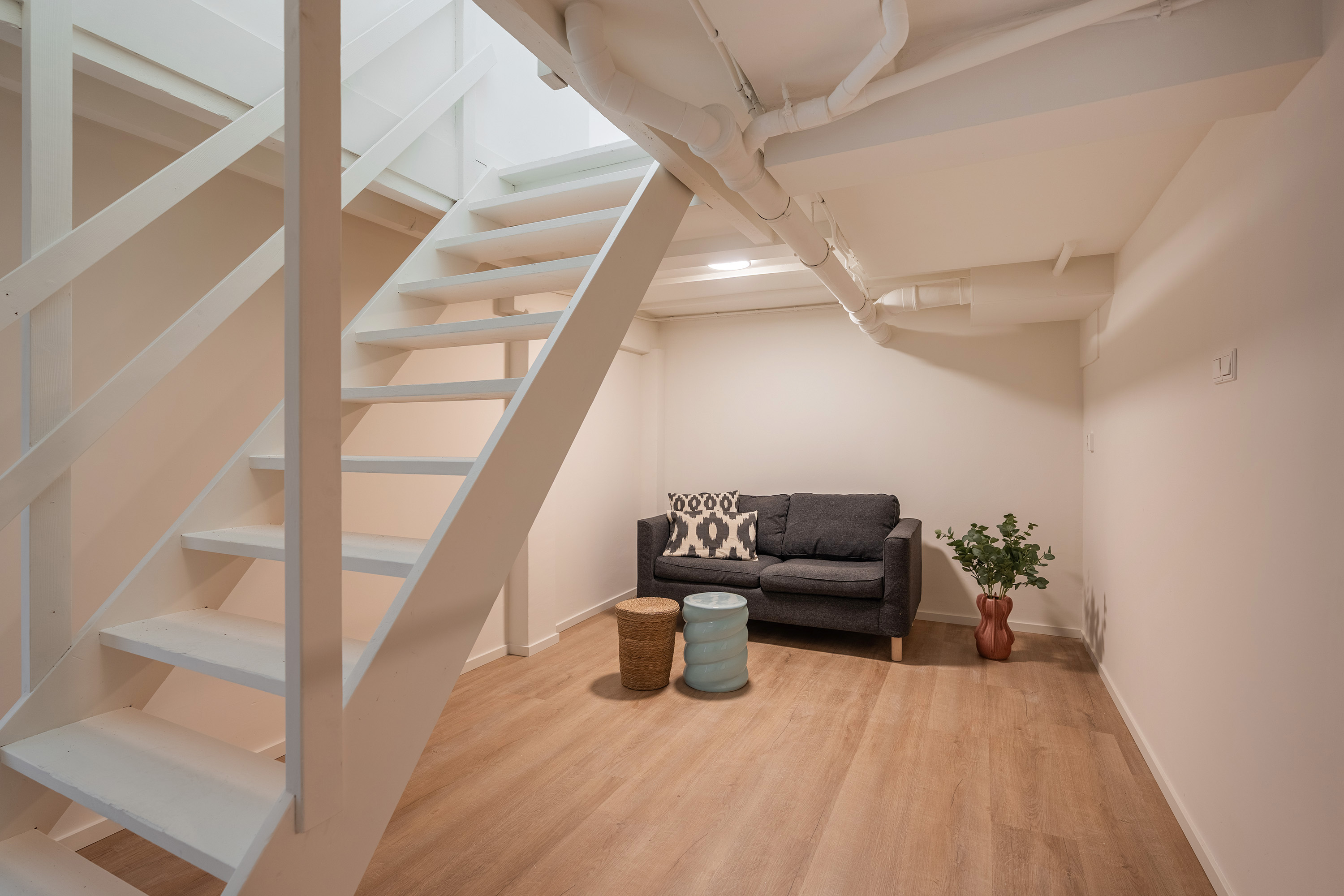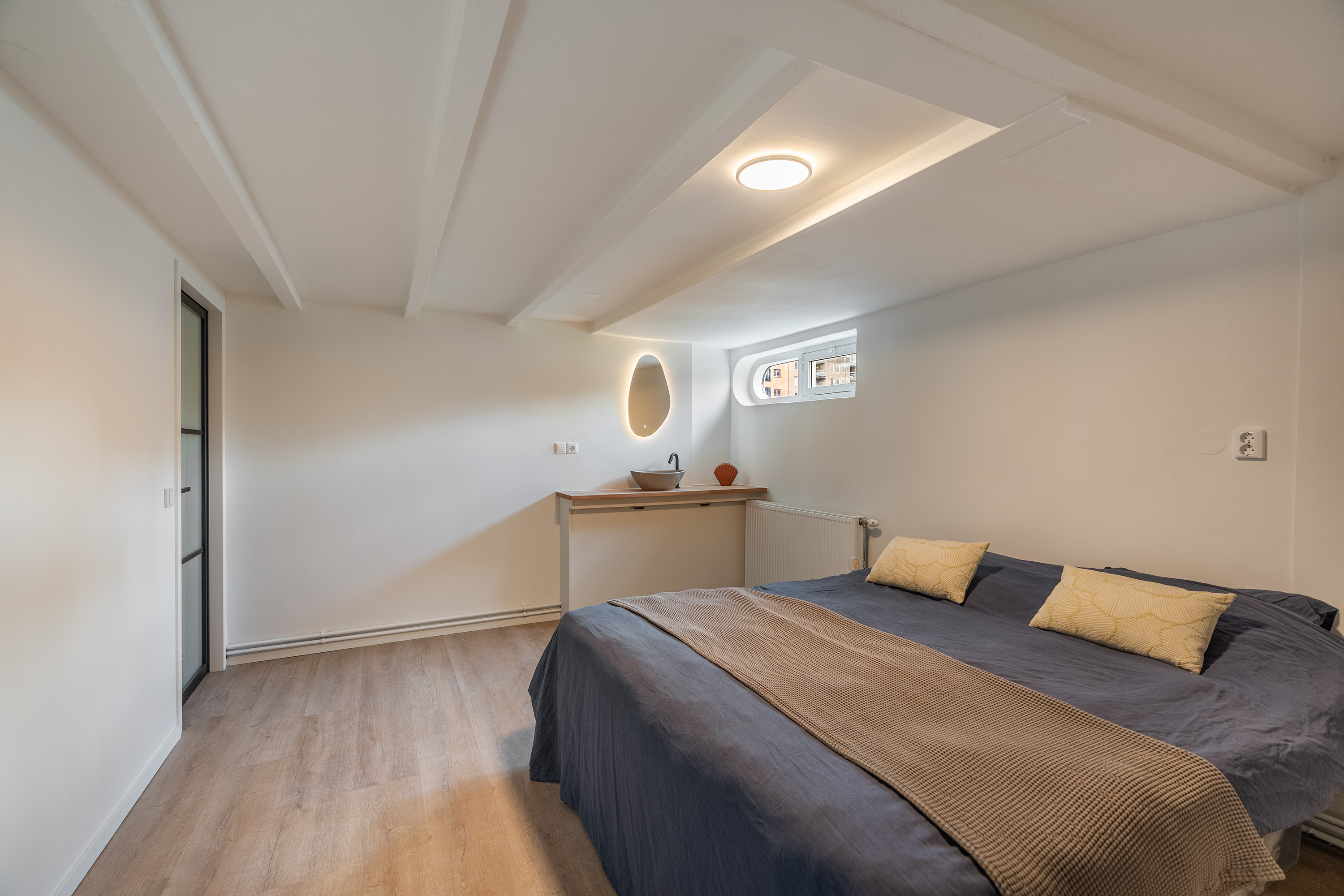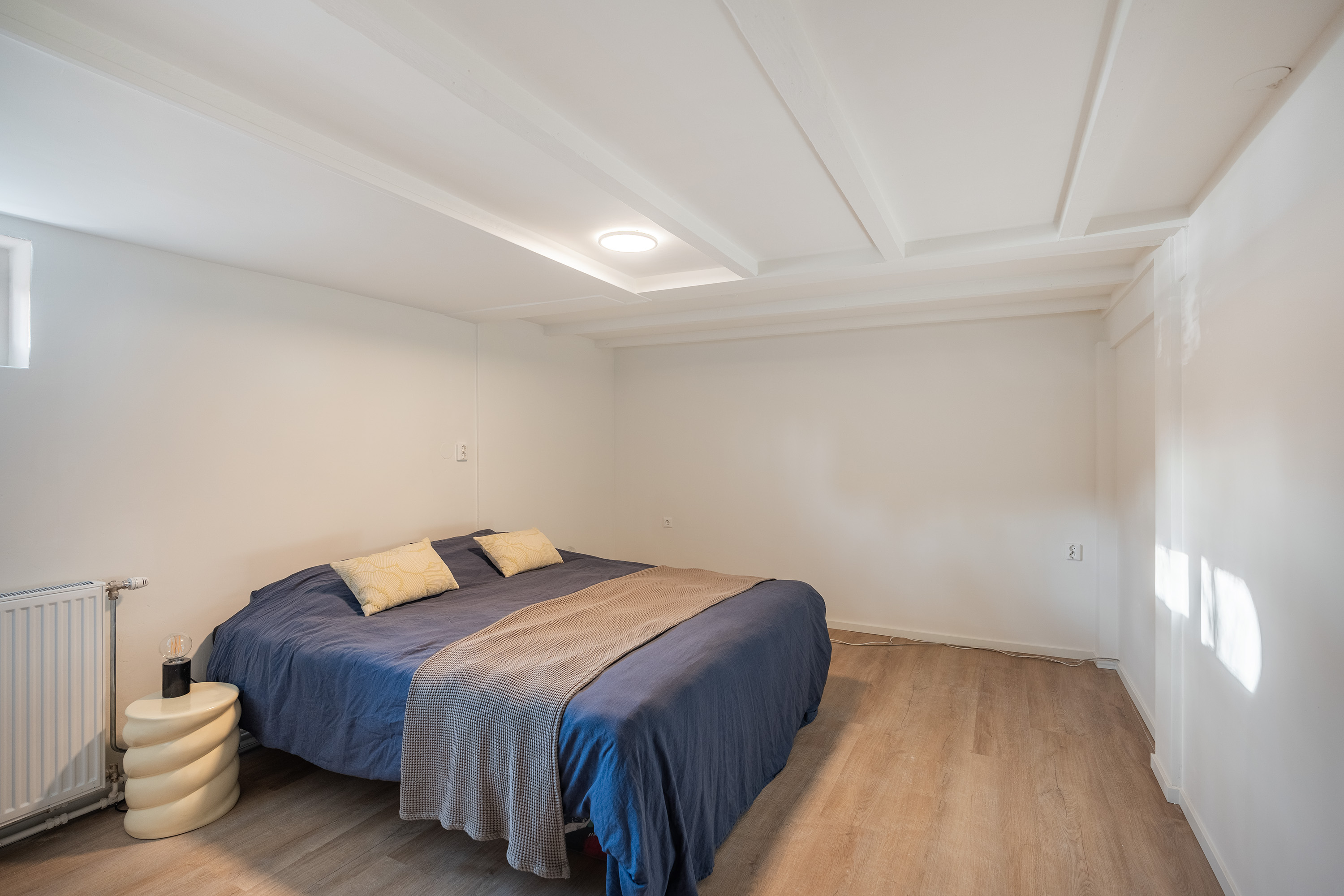 Via de hal op de eerste etage bereik je de slaapverdieping in het souterrain. De hoogwaardige afwerking van boven is hier volledig doorgezet: ook in het souterrain zijn de vloer, wanden en plafonds perfect afgewerkt. Alles is tot in detail verzorgd.