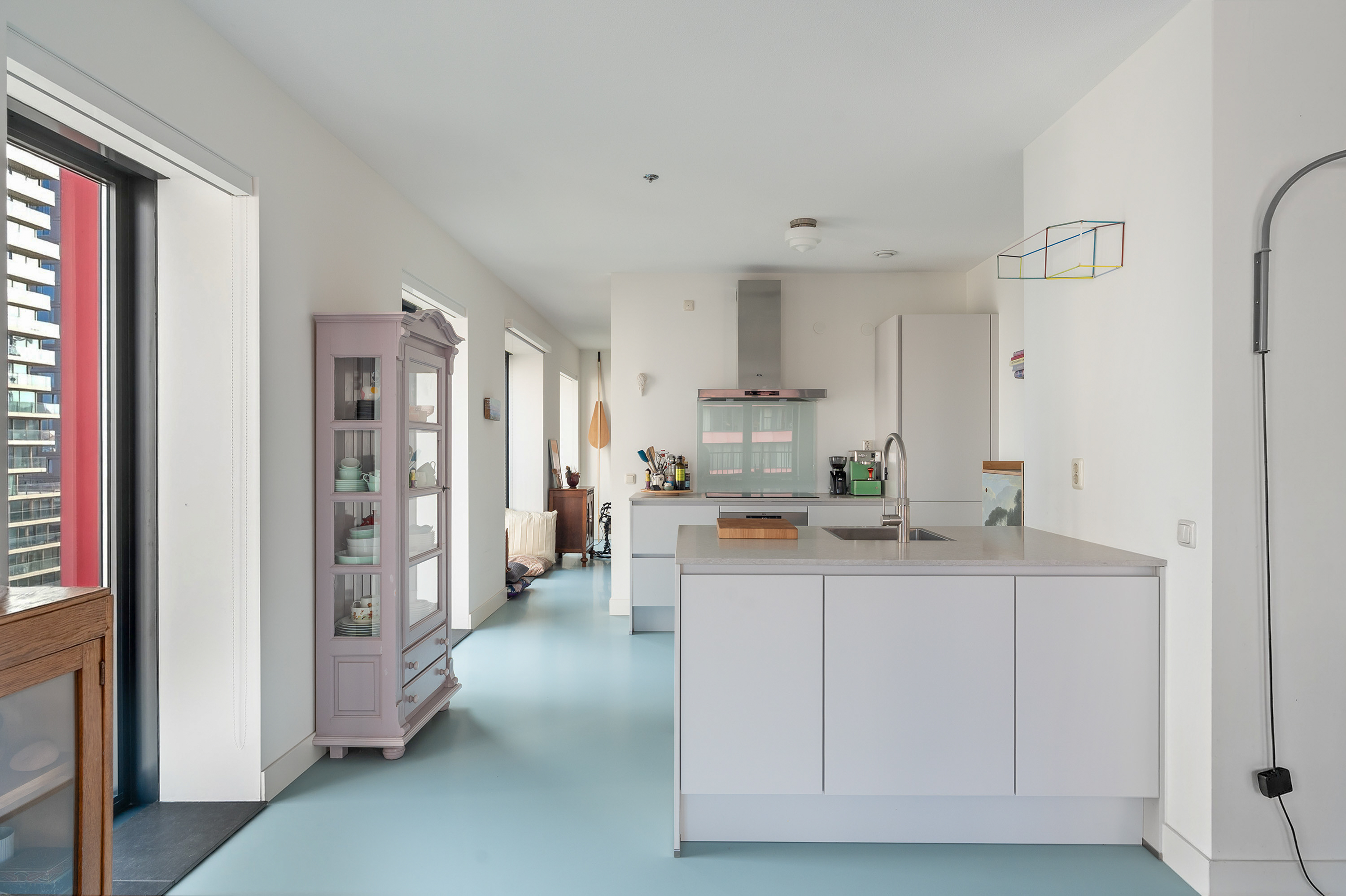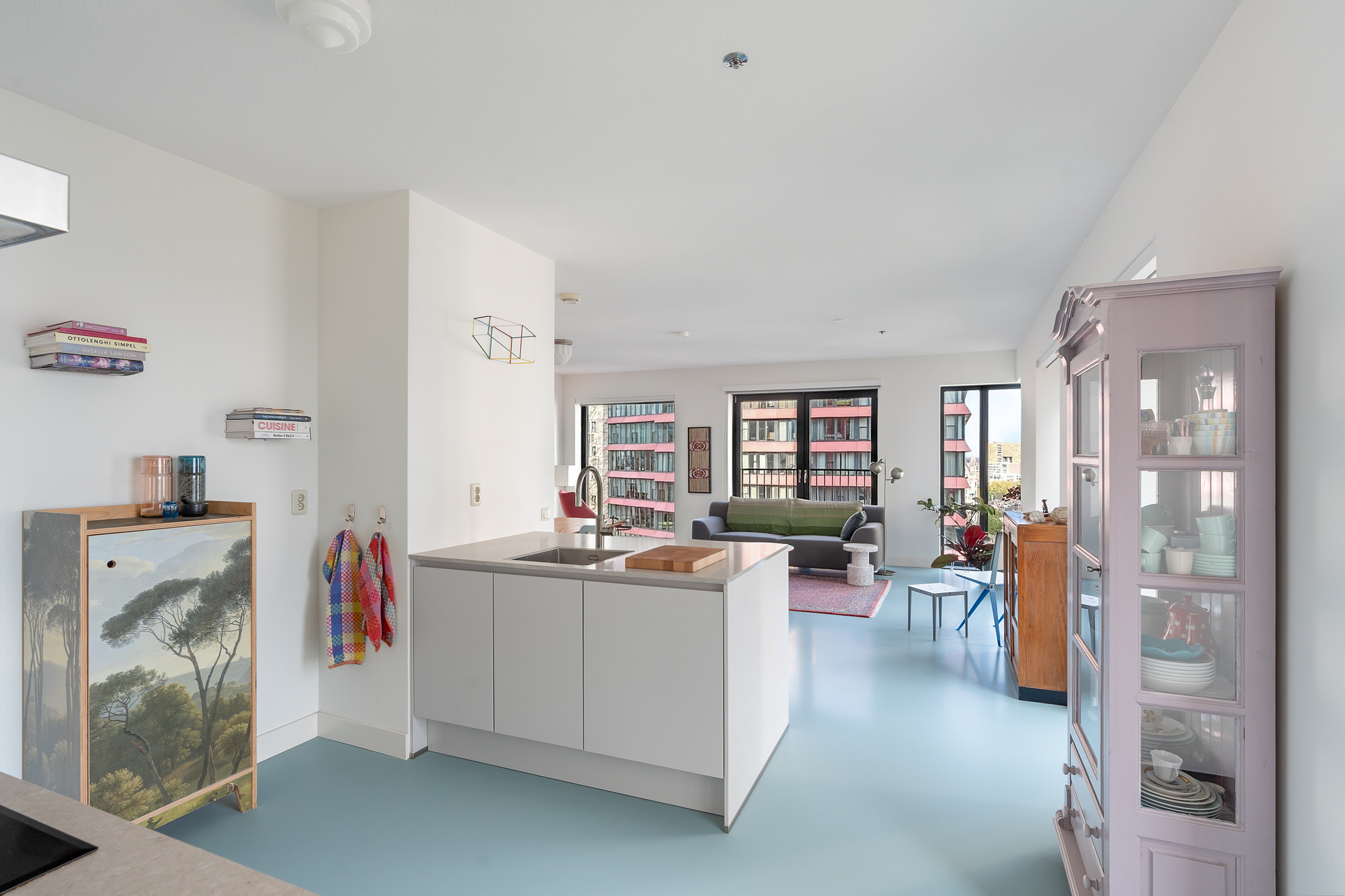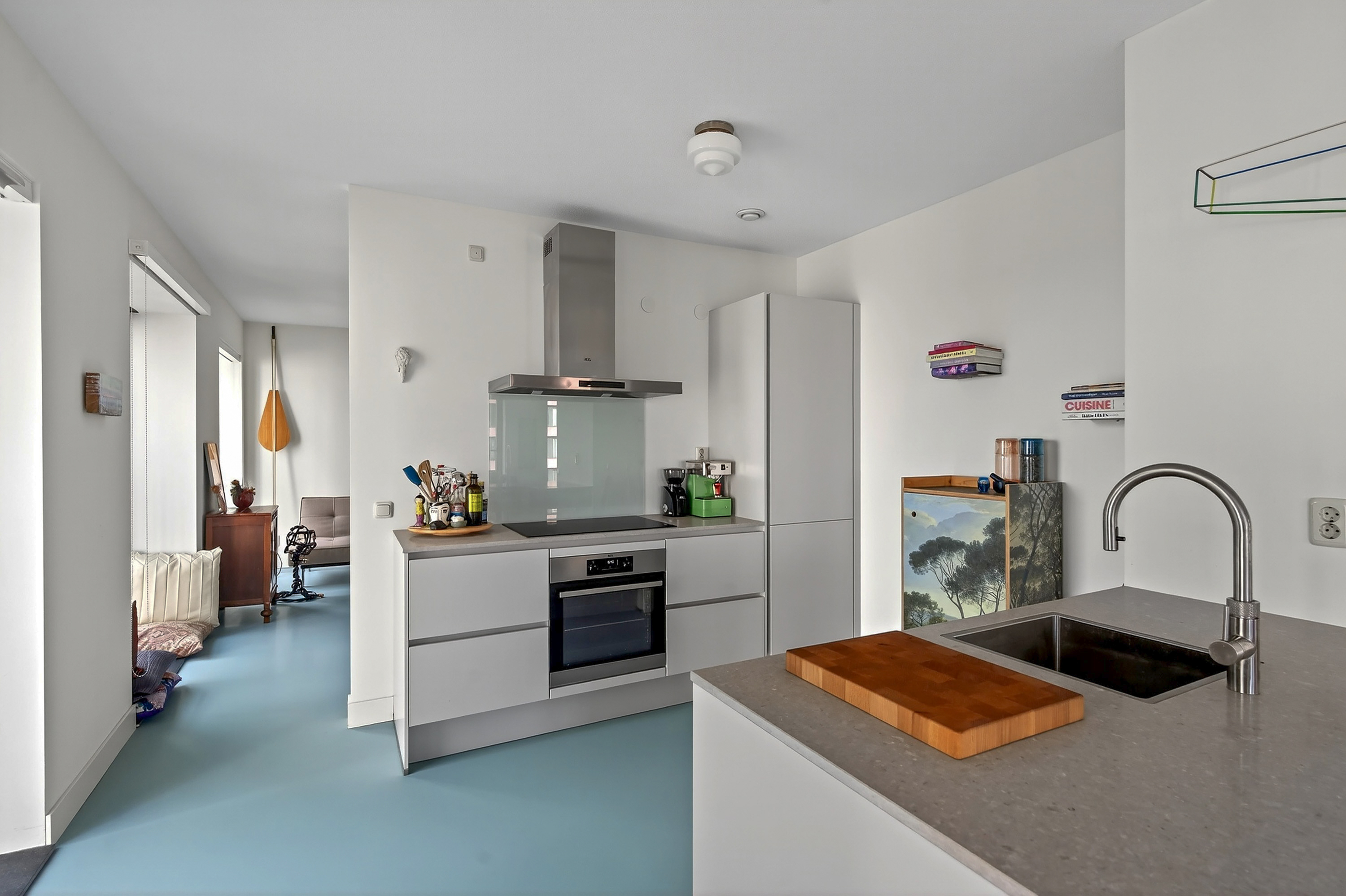 Vanuit de lange, uitgestrekte hal stap je het leefgedeelte binnen. Dankzij de gunstige hoekligging en hoge raampartijen van vloer tot plafond valt er volop daglicht binnen en word je omringd door een stadsuitzicht. Dit is elke dag genieten! Handig is dat je een aantal ramen kunt openzetten, zodat je eenvoudig kunt ventileren en frisse lucht naar binnen haalt. De strakke afwerking komt mooi tot uiting in de stoere gietvloer en de keurig afgewerkte wanden. Dankzij de open keuken blijf je tijdens het koken in verbinding met alle gezelligheid in de ruimte. De keuken is opgedeeld in een spoeleiland en aanrechtblad en beschikt over een inductiekookplaat, afzuigkap, oven, koel- en vriescombinatie, Quooker en een vaatwasser.