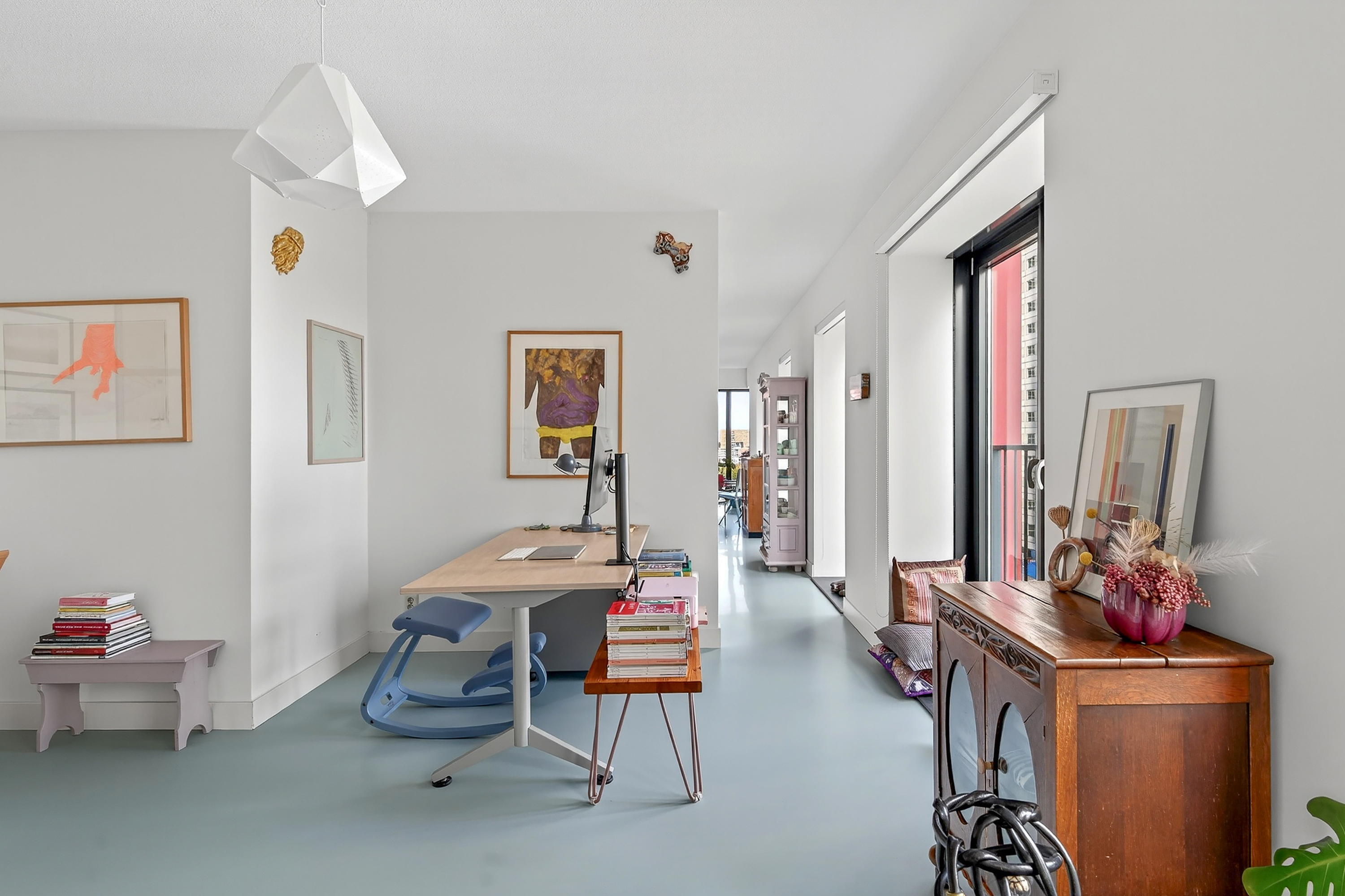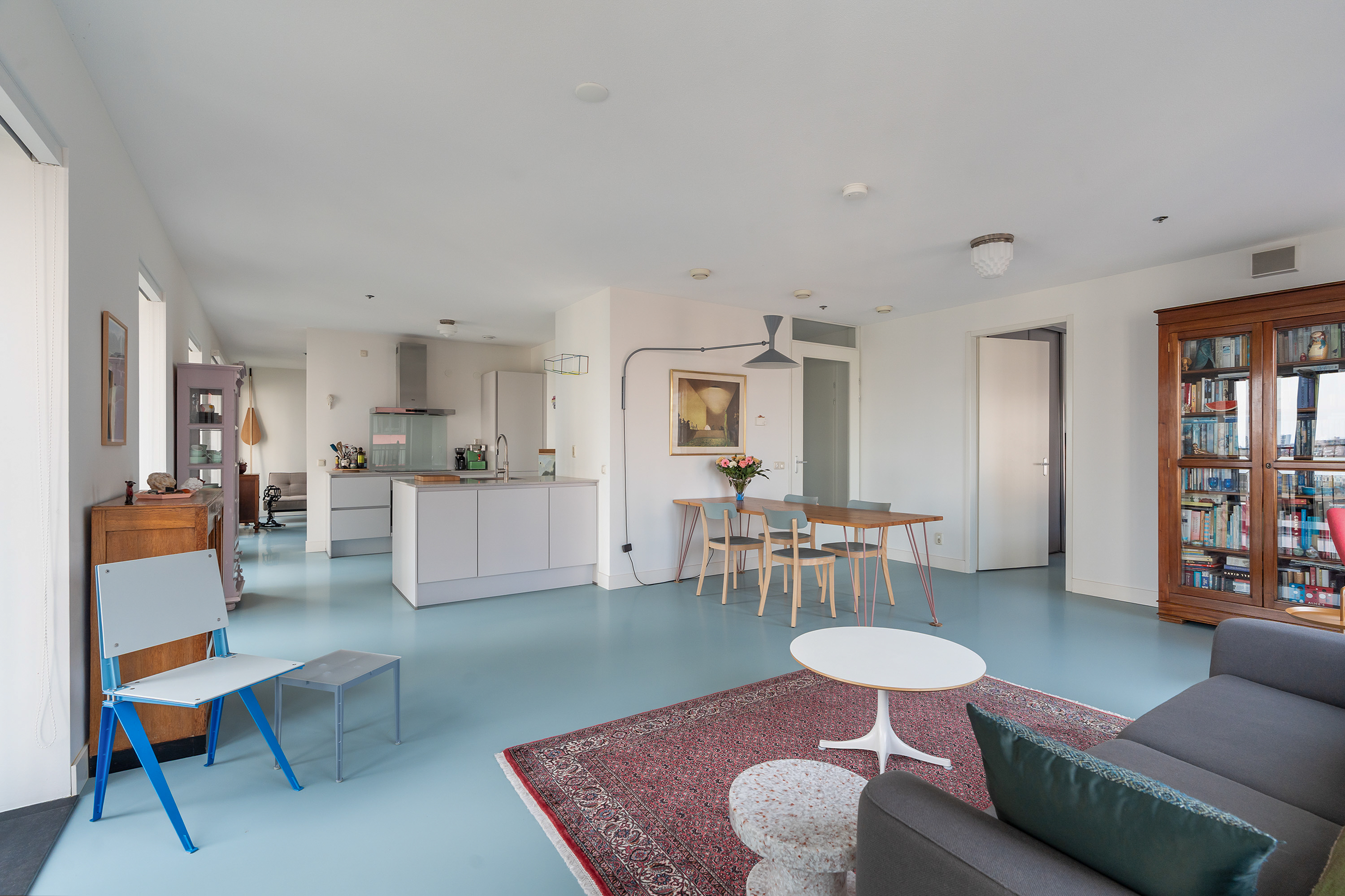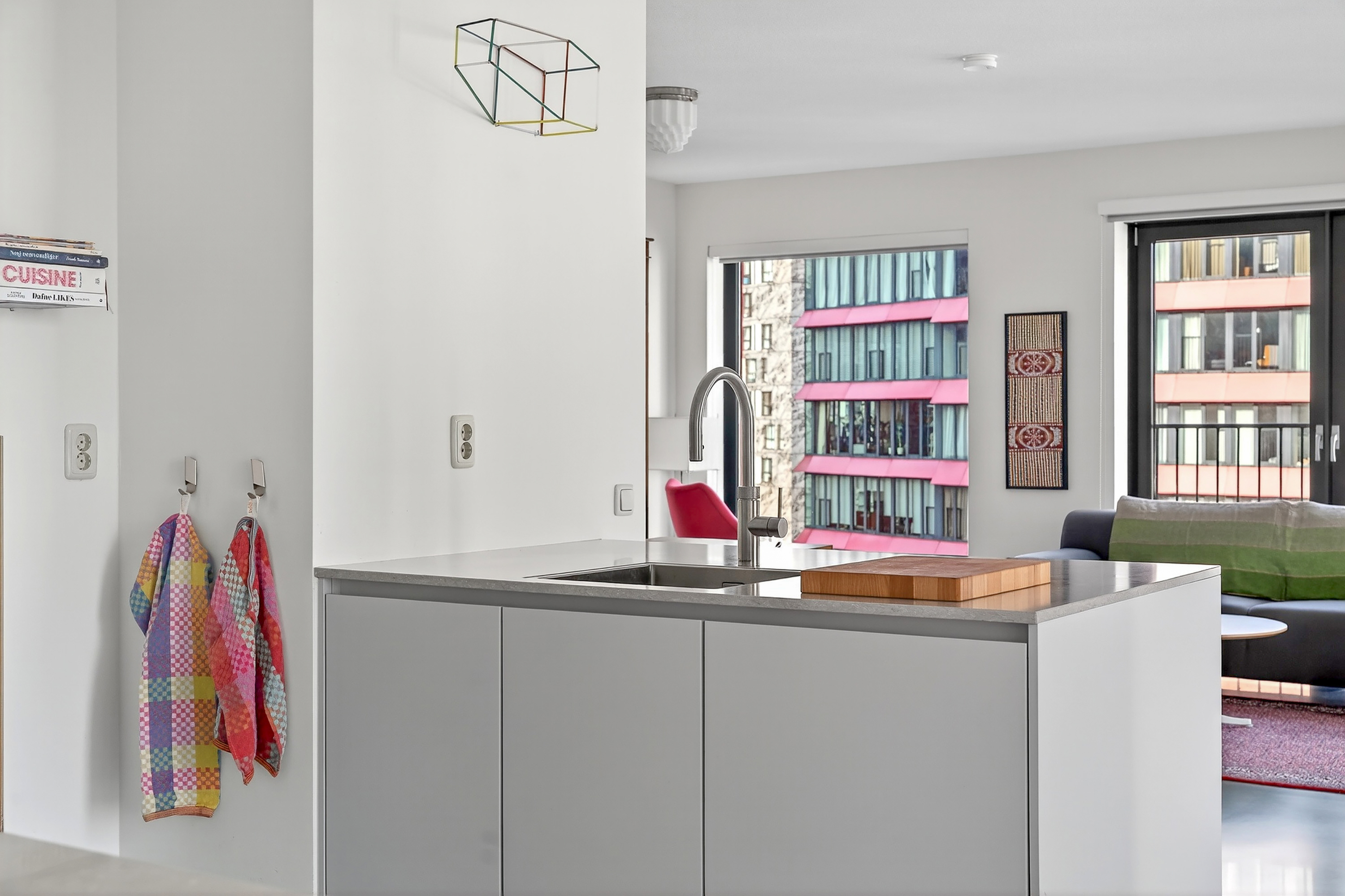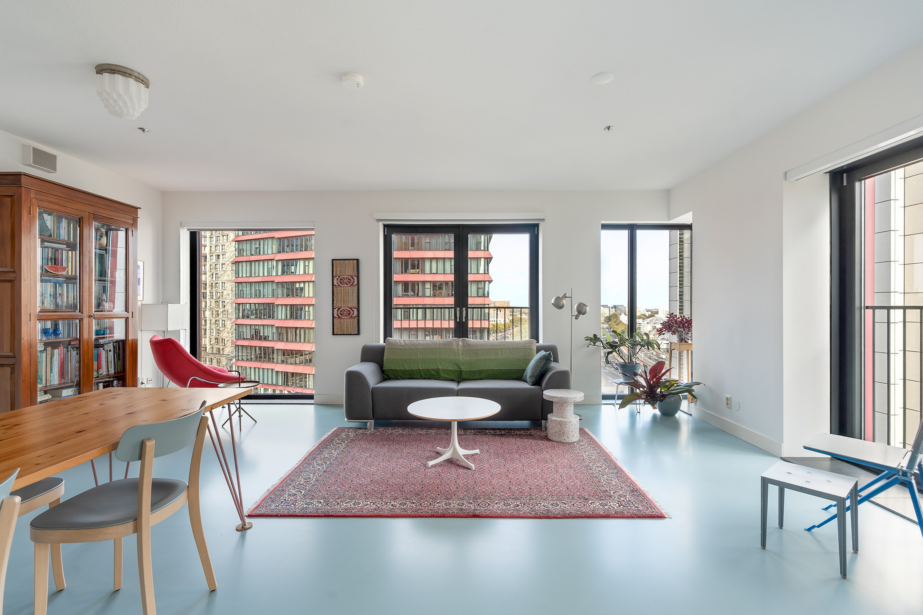 Vanuit de lange, uitgestrekte hal stap je het leefgedeelte binnen. Dankzij de gunstige hoekligging en hoge raampartijen van vloer tot plafond valt er volop daglicht binnen en word je omringd door een stadsuitzicht. Dit is elke dag genieten! Handig is dat je een aantal ramen kunt openzetten, zodat je eenvoudig kunt ventileren en frisse lucht naar binnen haalt. De strakke afwerking komt mooi tot uiting in de stoere gietvloer en de keurig afgewerkte wanden. Dankzij de open keuken blijf je tijdens het koken in verbinding met alle gezelligheid in de ruimte. De keuken is opgedeeld in een spoeleiland en aanrechtblad en beschikt over een inductiekookplaat, afzuigkap, oven, koel- en vriescombinatie, Quooker en een vaatwasser.
