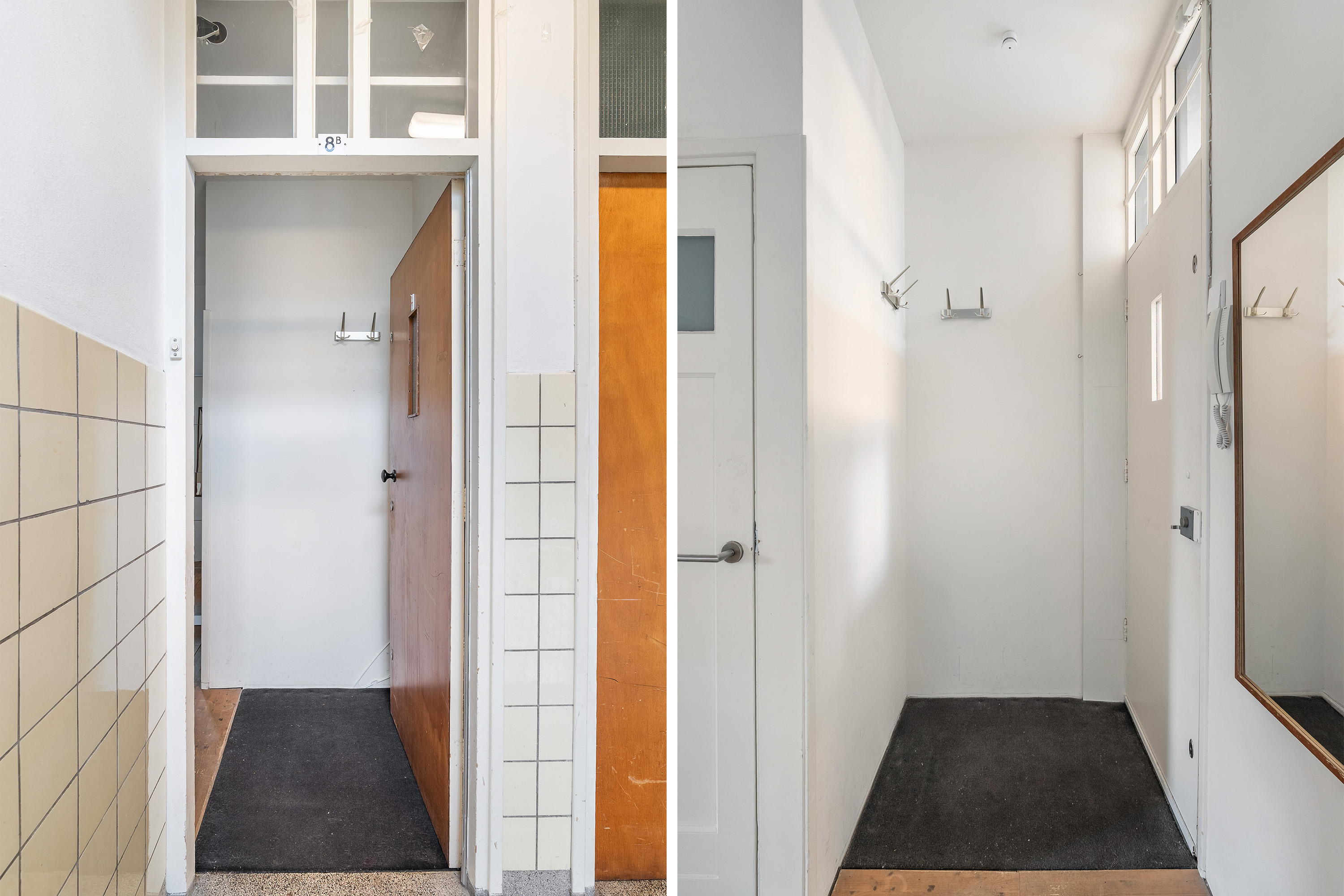 Entree met brievenbussen, bellentableau en trappenhuis.