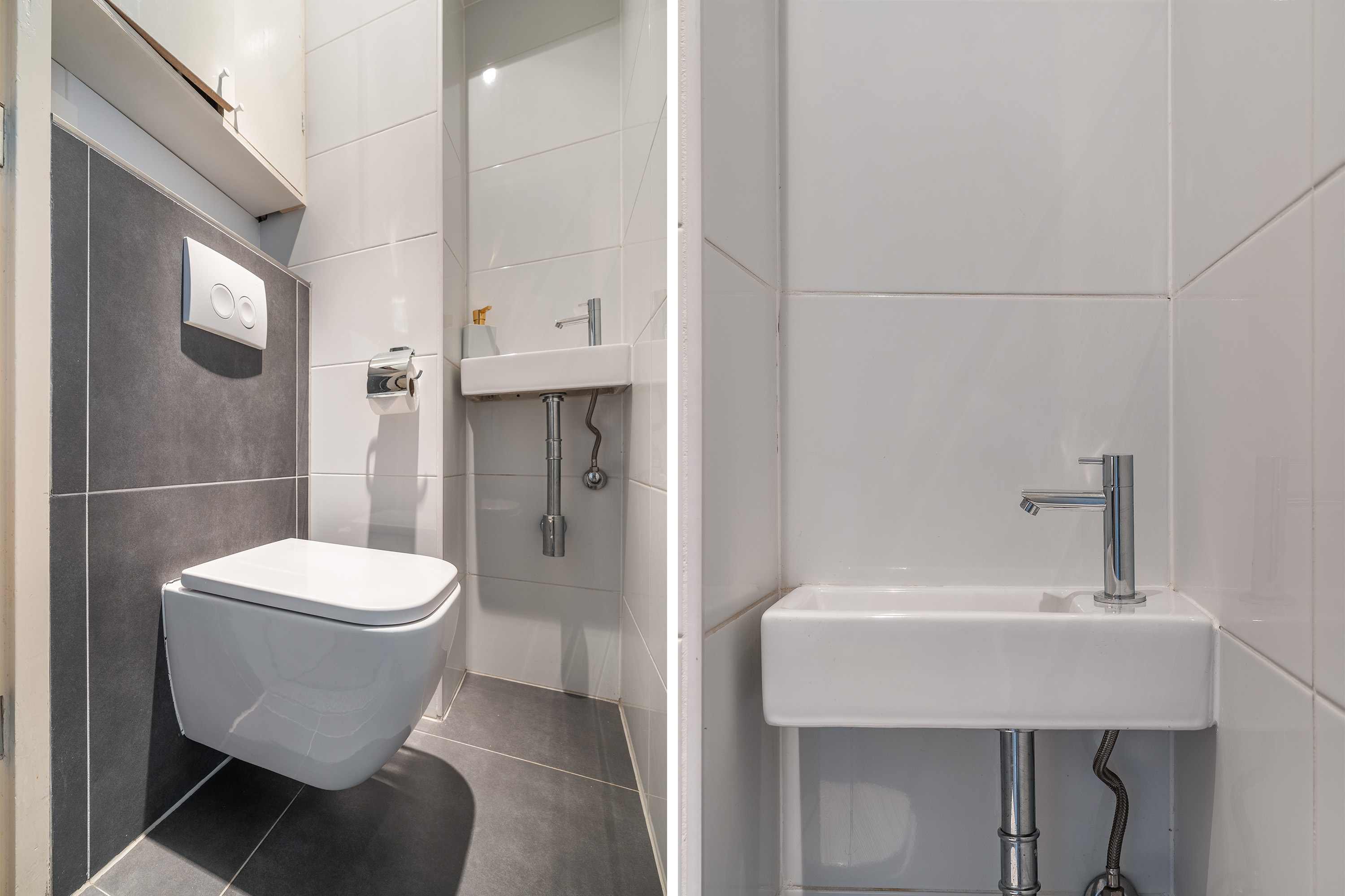 Vanuit de hal zijn het separate toilet met fonteintje en de trap naar de tweede verdieping bereikbaar.