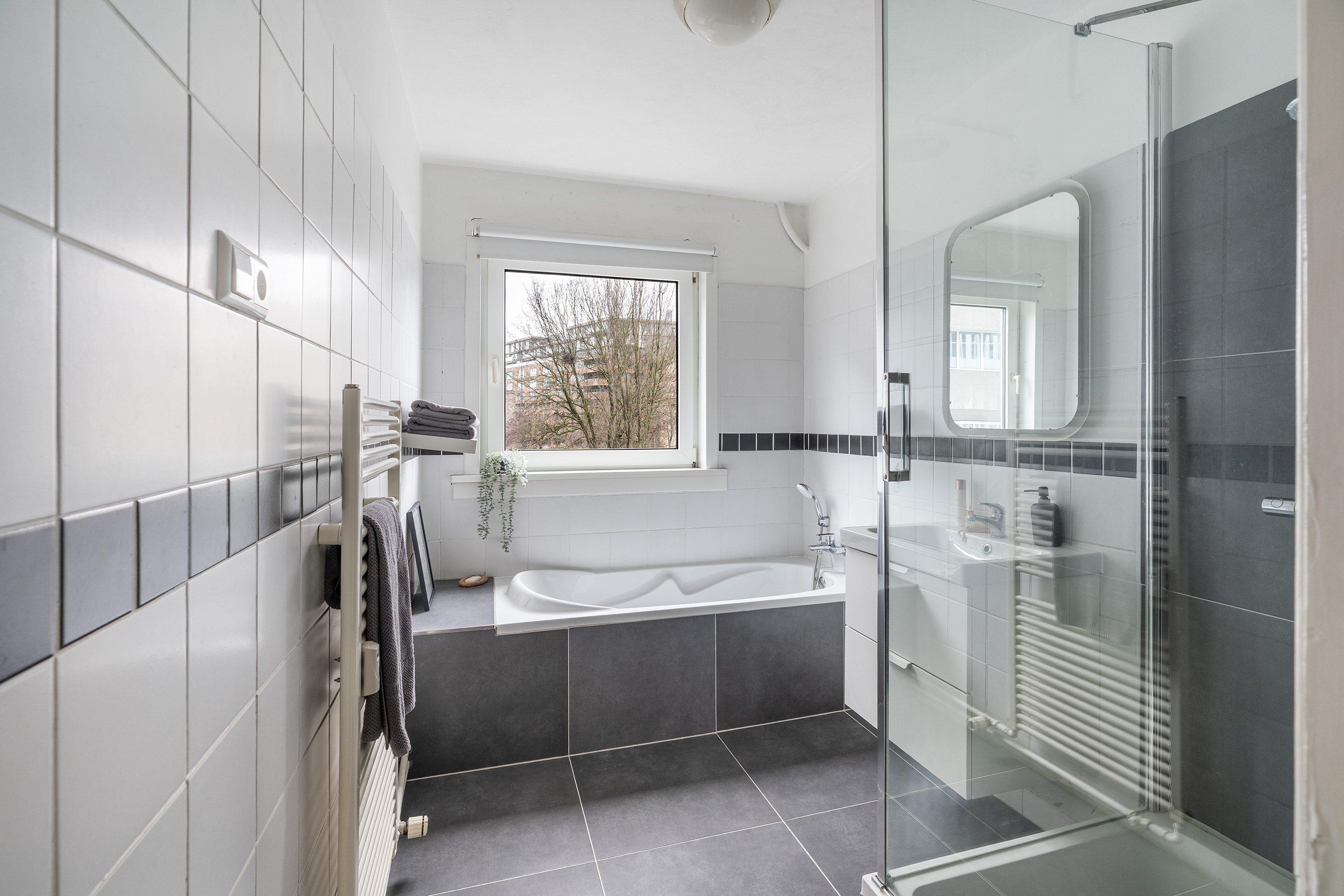 De badkamer heeft een moderne uitstraling en is volledig uitgerust met een ligbad, een ruime regendouche en een wastafel met stijlvol meubel. Daarnaast is er een tweede toilet met wasmachineaansluiting, praktisch geplaatst in de hal.