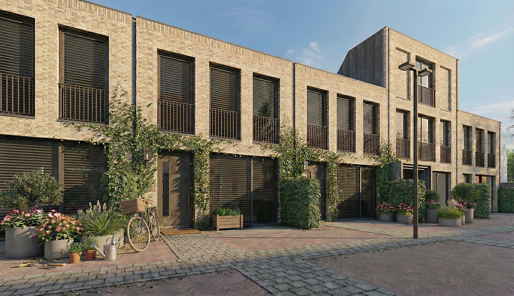 Er zullen 10 twee-laagse hofwoningen van ca 75m2 woonruimte gerealiseerd worden en 1 poortwoning van 85m2. De living heeft een diepte van ca 8 meter alwaar de keuken naar eigen idee ingericht kan worden. De verdieping biedt ruimte aan 2 slaapkamers en een badkamer. De poortwoning heeft op de begane grond een slaap-/werkkamer en de living bevindt zich hier op de eerste verdieping. Deze is extra breed doordat hij doorloopt boven de doorgang naar de Bergweg. Op de tweede verdieping zijn een slaapkamer en de badkamer gesitueerd. Het sedum dak zorgt voor warmte- en geluidsisolatie en heeft weinig onderhoud nodig.