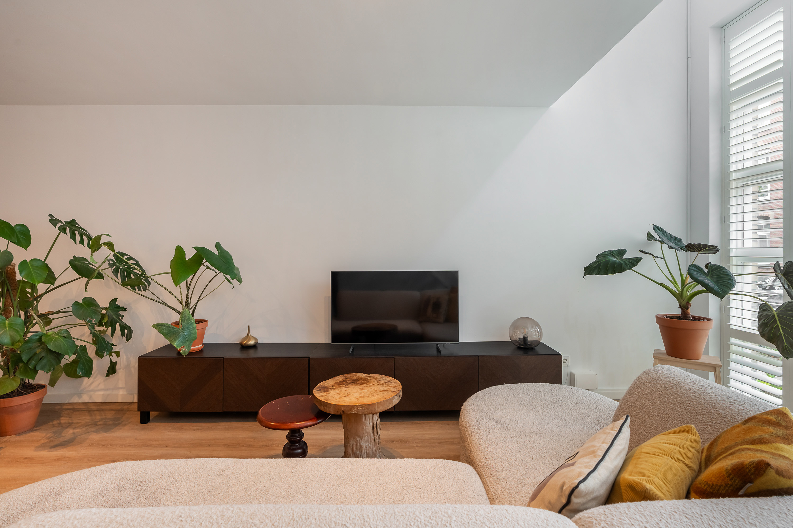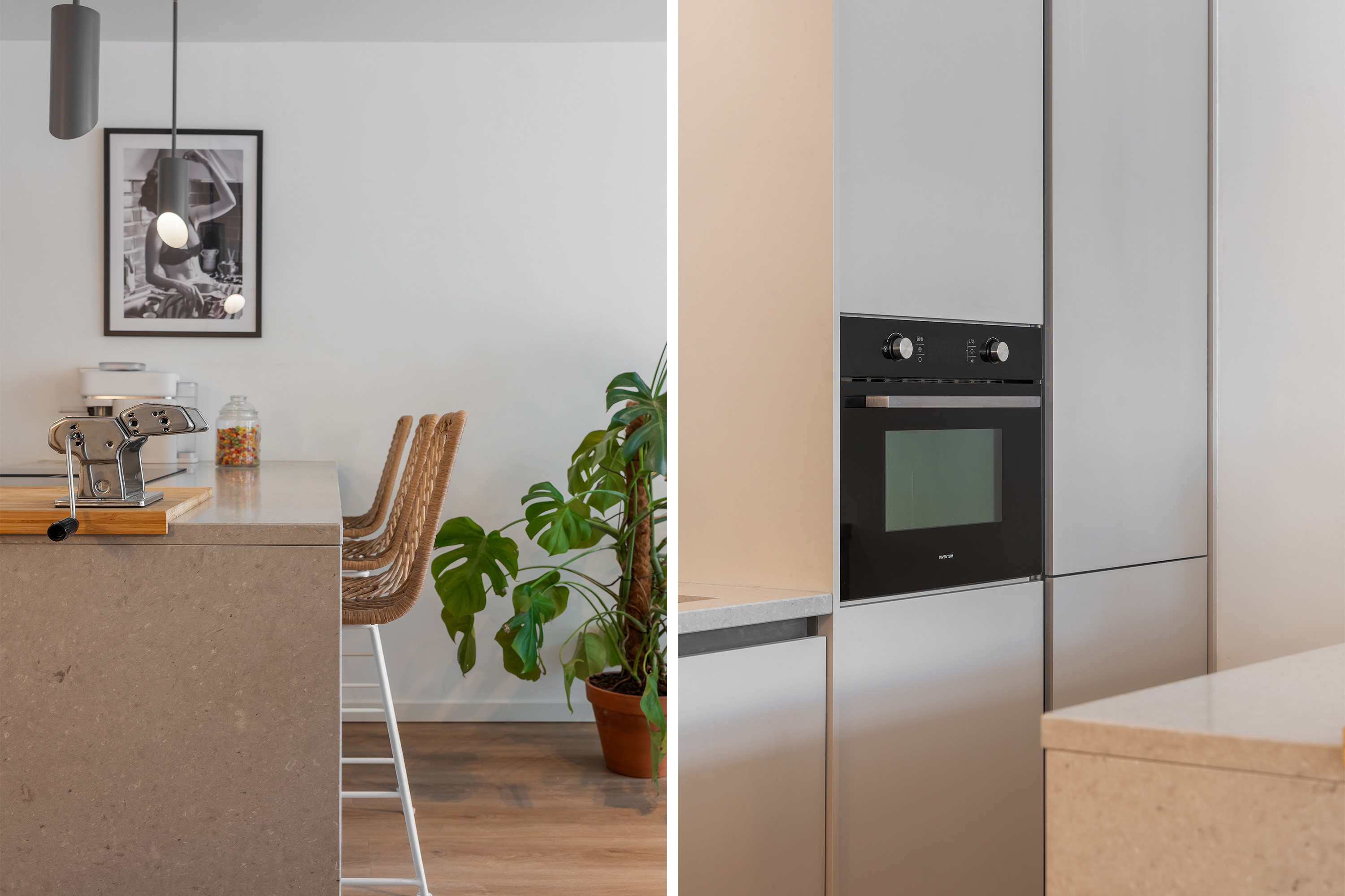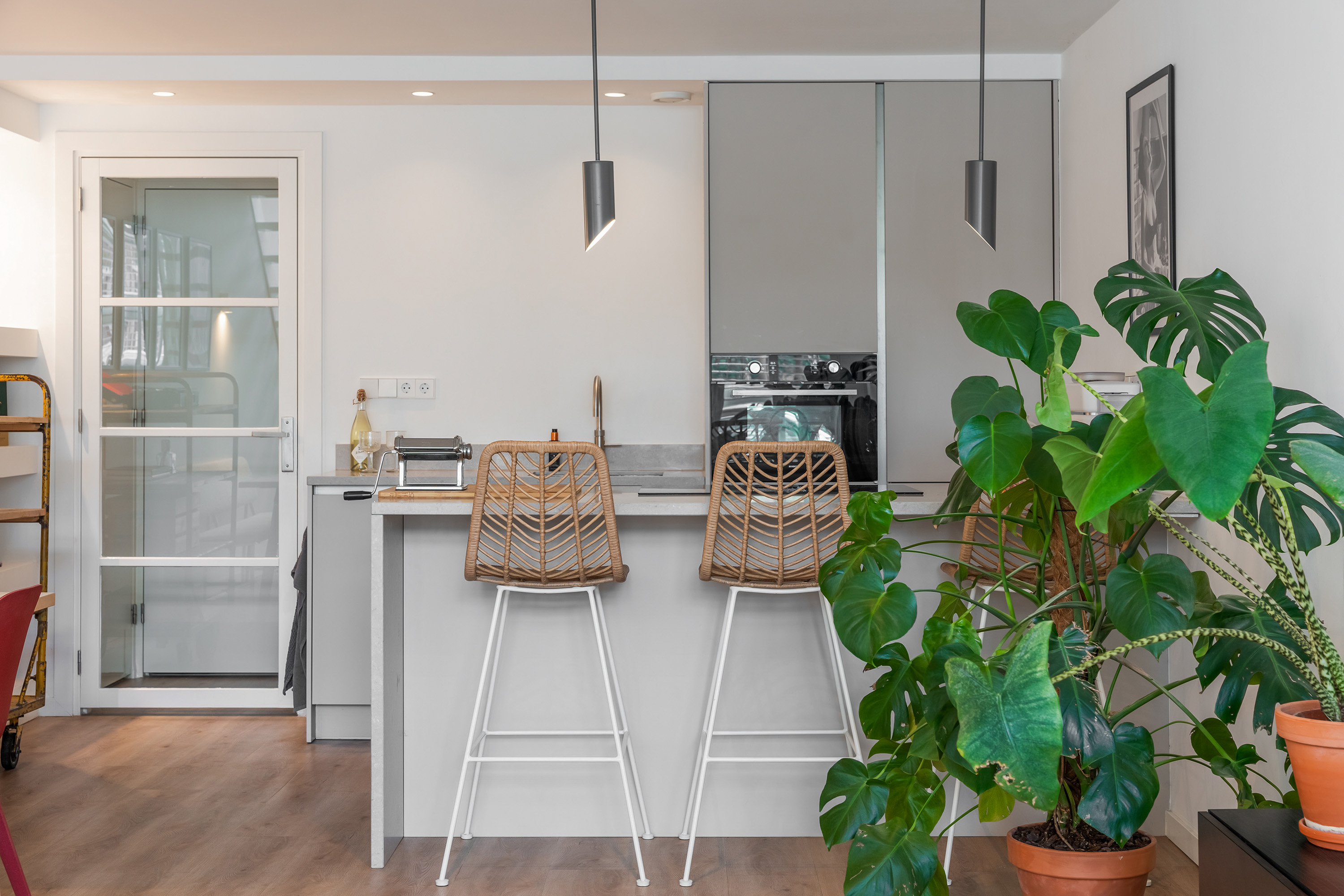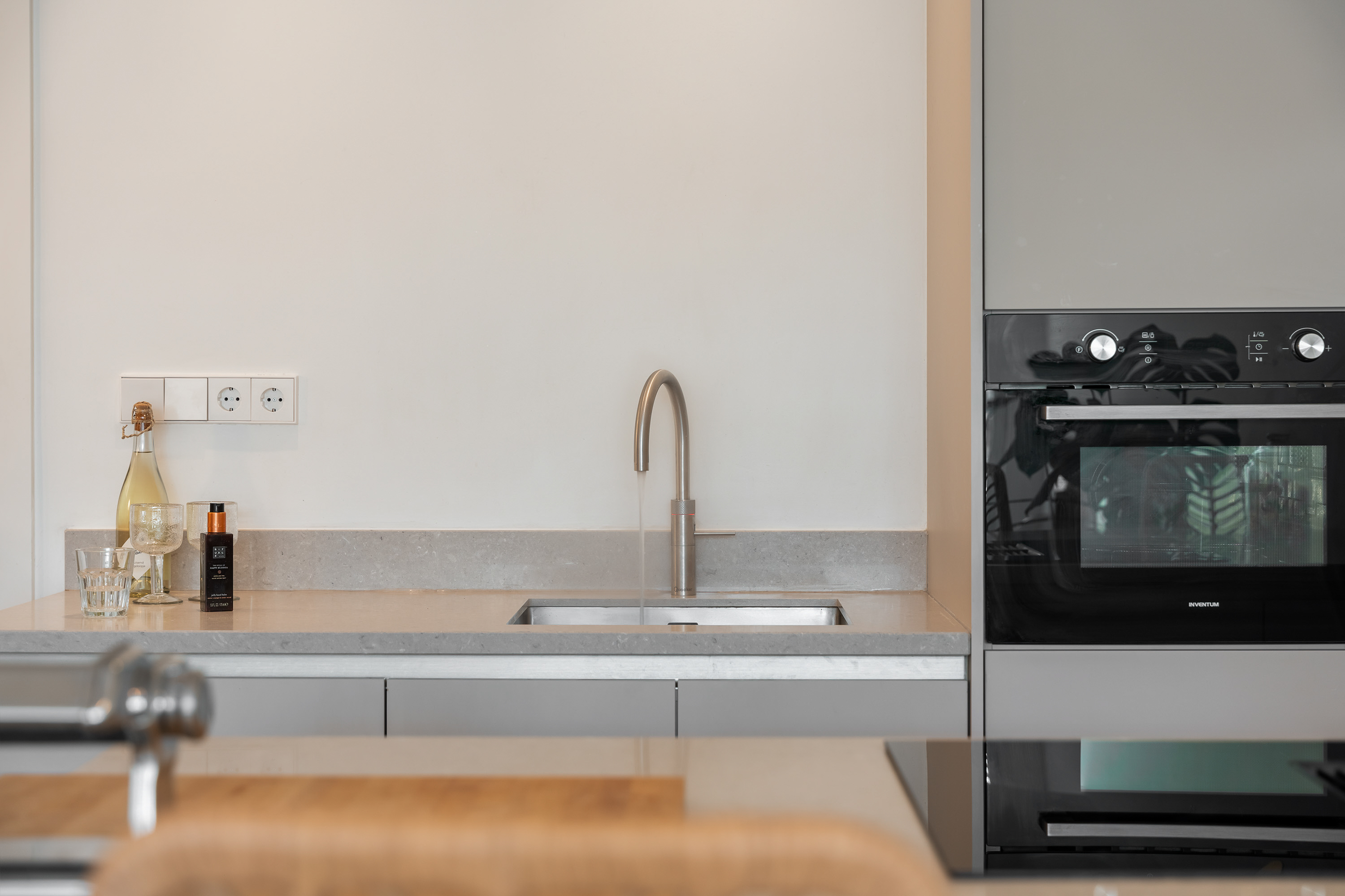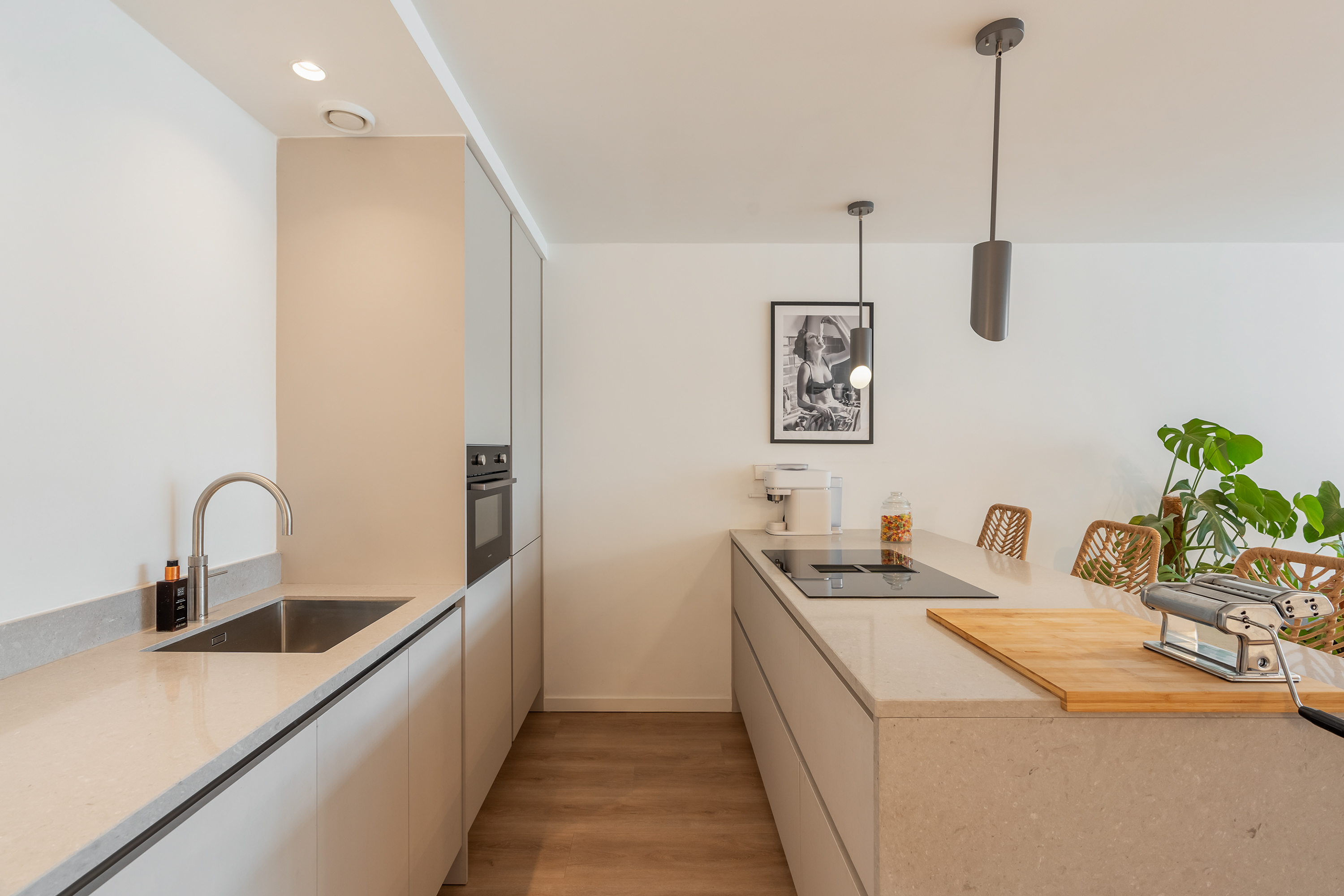 Bij binnenkomst stap je direct in het sfeervolle, open leefgedeelte. Wat direct opvalt, is dat alles tot in de puntjes is afgewerkt door de renovatie van 2023. De keurige PVC vloer met vloerverwarming, strakke wanden en luxe open keuken zorgen voor een moderne uitstraling en maken dit een plek waar je je direct thuis voelt. De keuken met kookeiland staat in directe verbinding met de woonkamer, waardoor alle gezelligheid samenkomt in één ruimte. Doordat er barkrukken aan het kookeiland kunnen worden geplaatst, ontstaat er een gezellige plek om aan te schuiven voor een ontbijt, een borrel of een goed gesprek tijdens het koken.