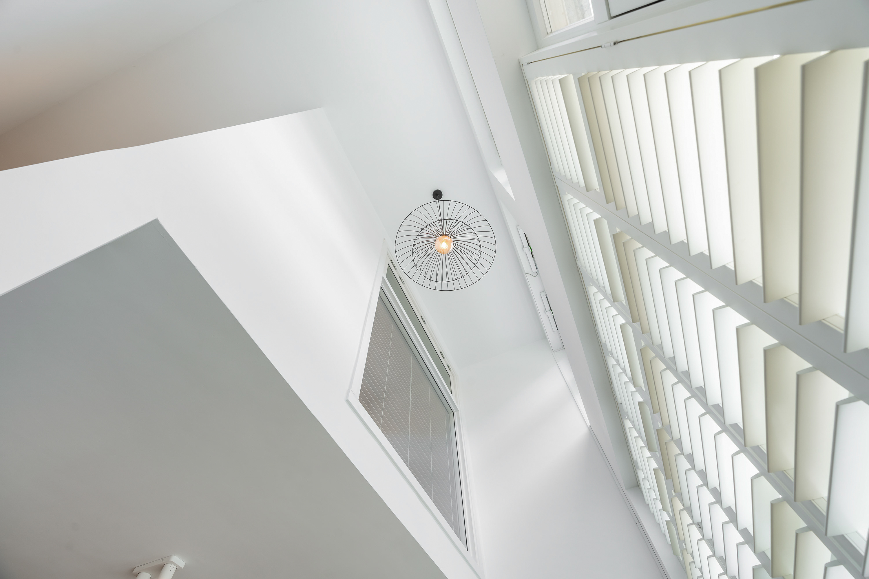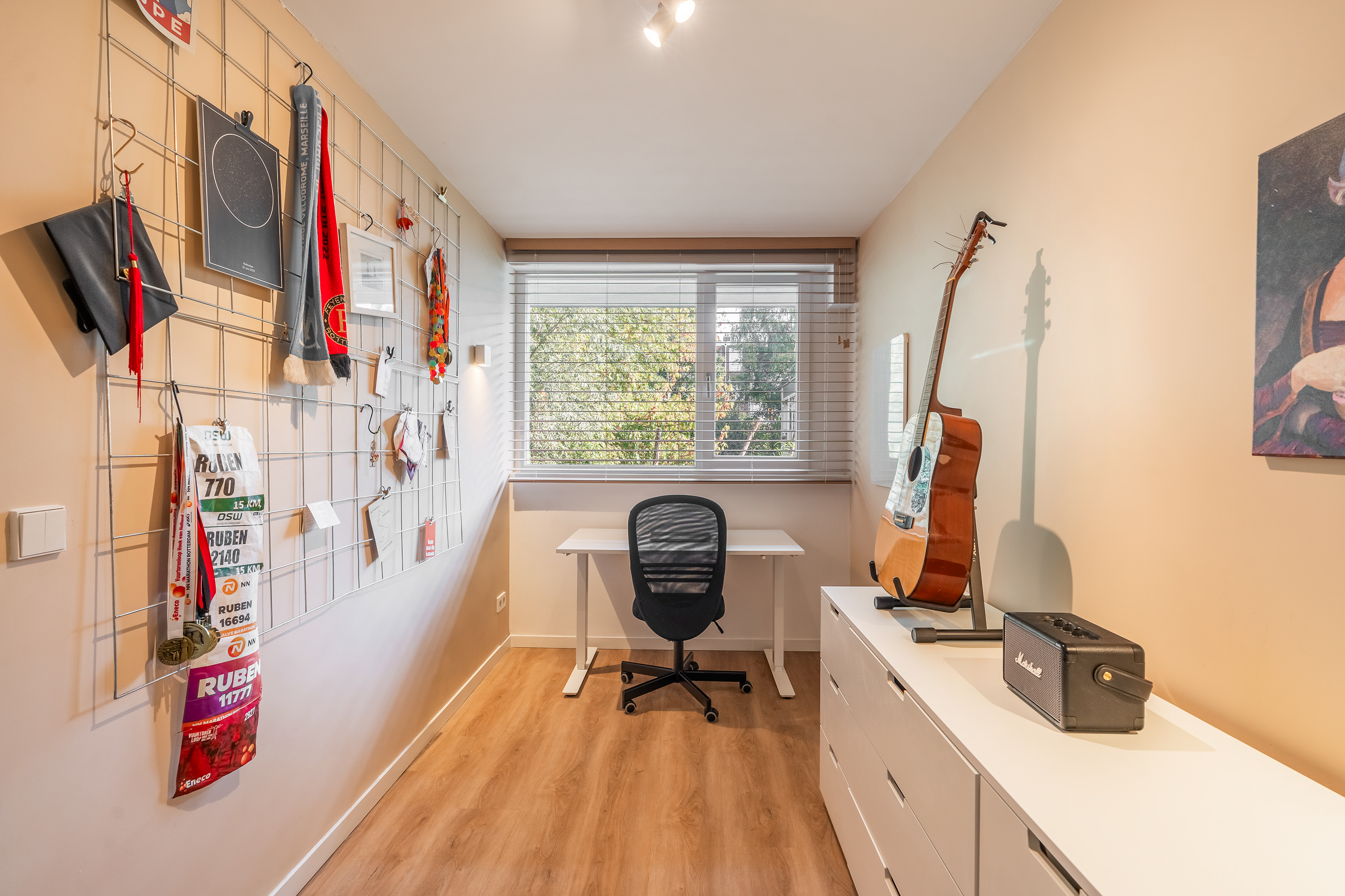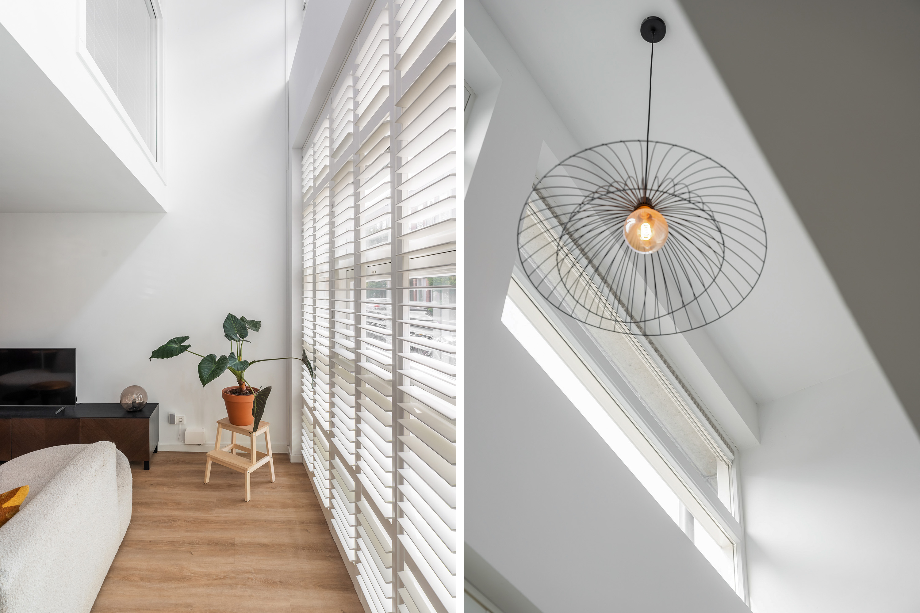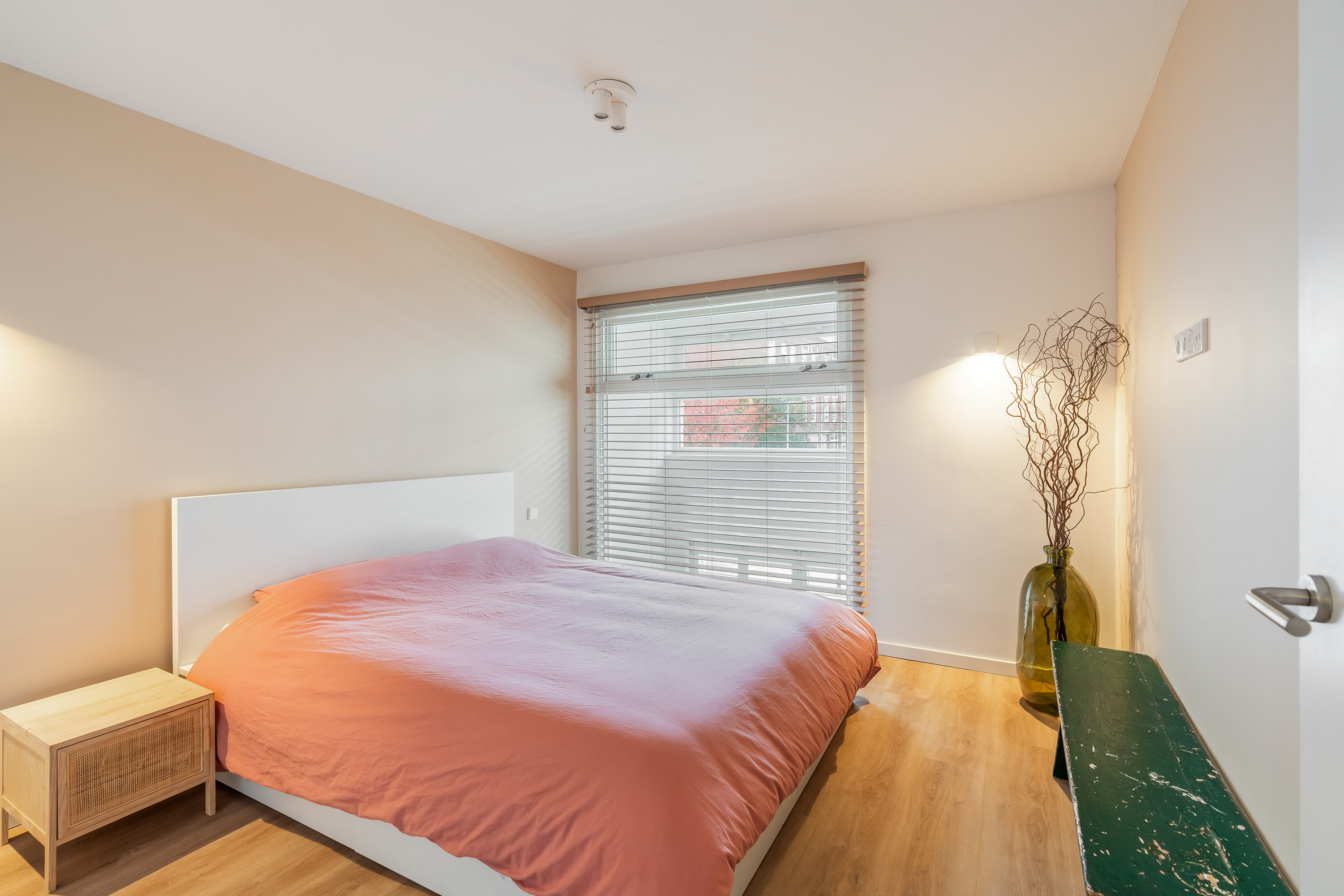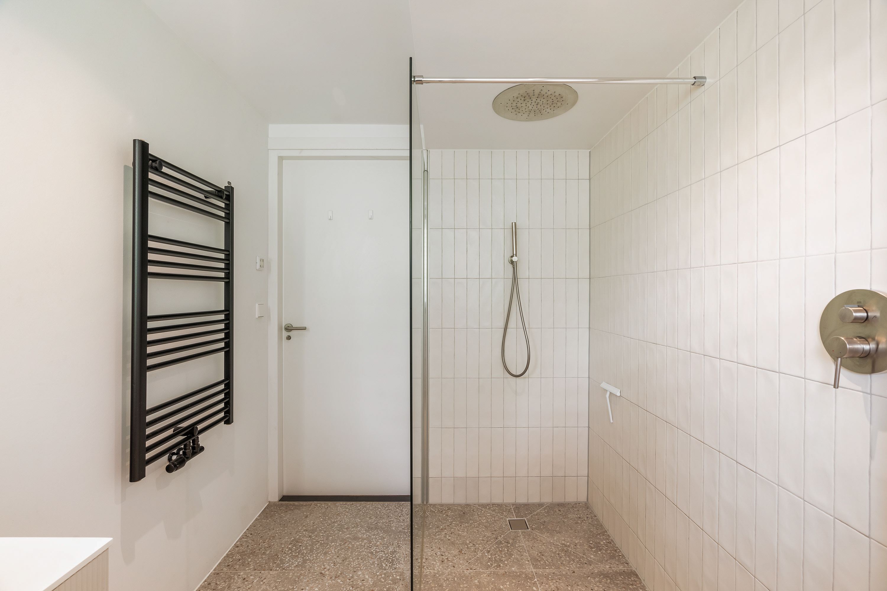 Vanaf de overloop zijn de verschillende vertrekken toegankelijk. Vanuit de hoofdslaapkamer, aan de voorzijde, is er niet alleen zicht naar buiten, maar ook een unieke doorkijk naar de woonkamer door de vide. Aan de andere zijde is de tweede slaapkamer gelegen, die ideaal ingericht kan worden als bijvoorbeeld werkkamer of kledingkamer. In de badkamer zijn rustige kleuren gecombineerd met trendy tegels en luxe materialen. Dit geeft een fijne, ontspannen sfeer. De ruimte is compleet uitgerust met een inloopdouche met rainshower, een wastafel, een toilet en een handdoekradiator. Op de overloop is een vaste kast met de cv-opstelling gevestigd.