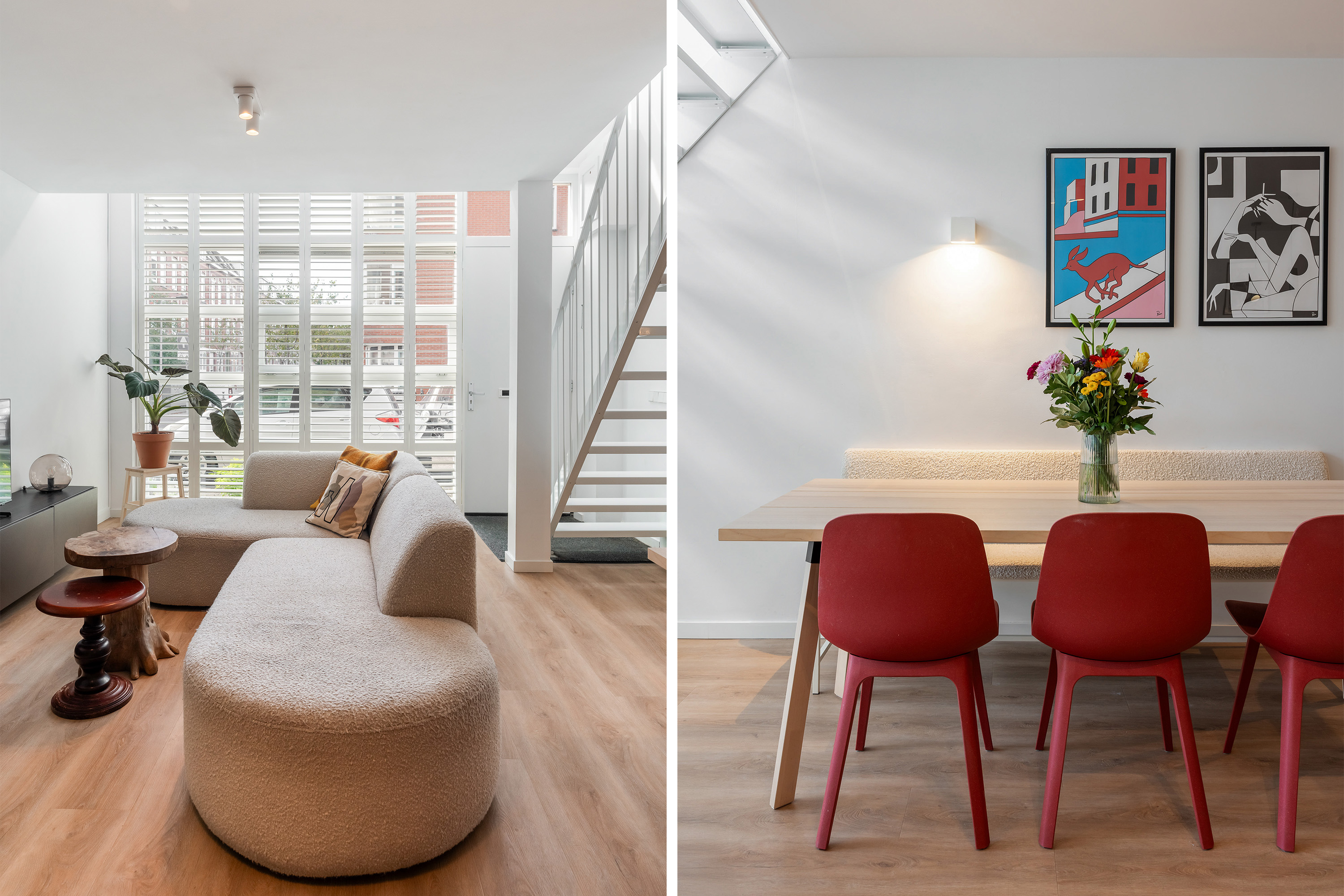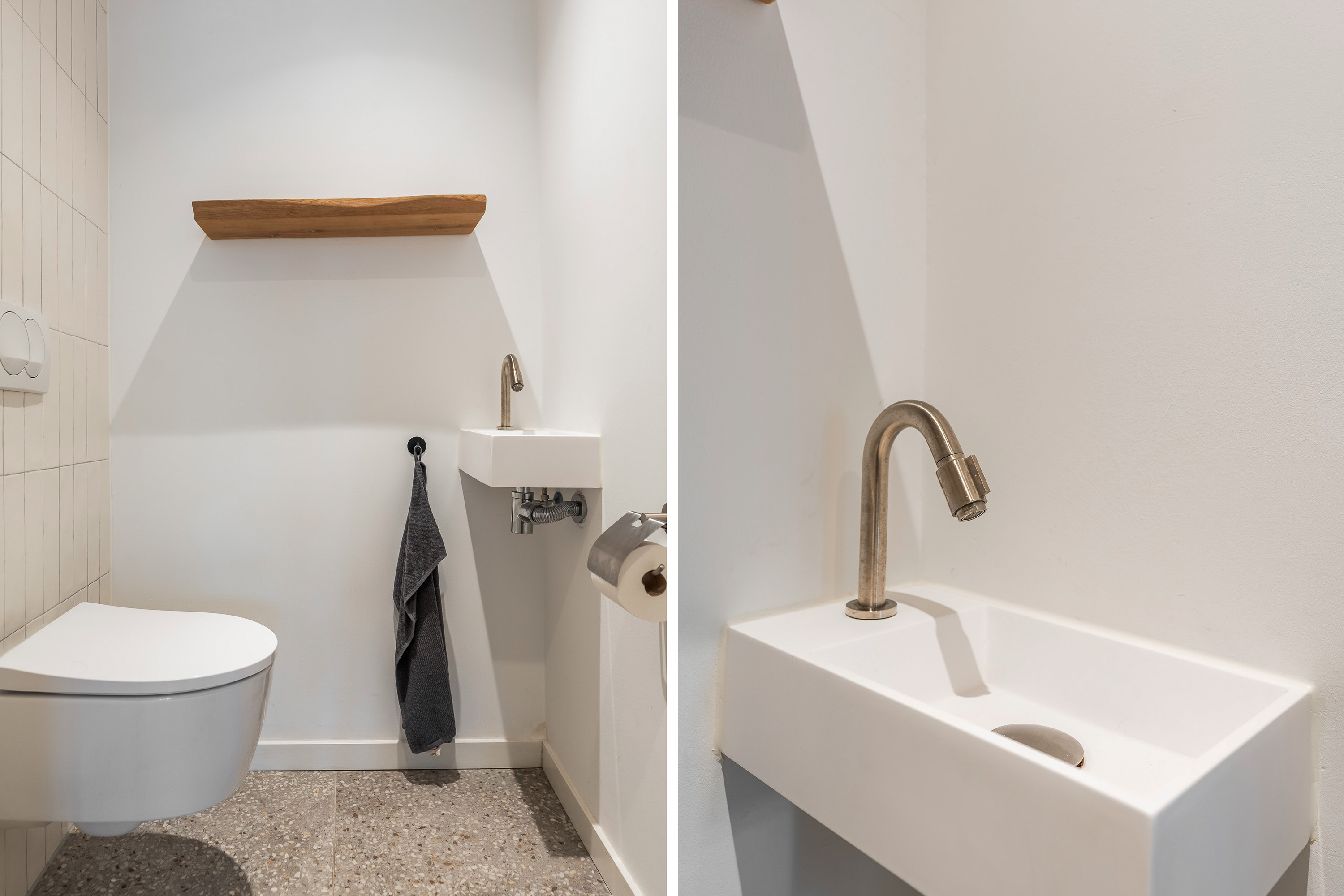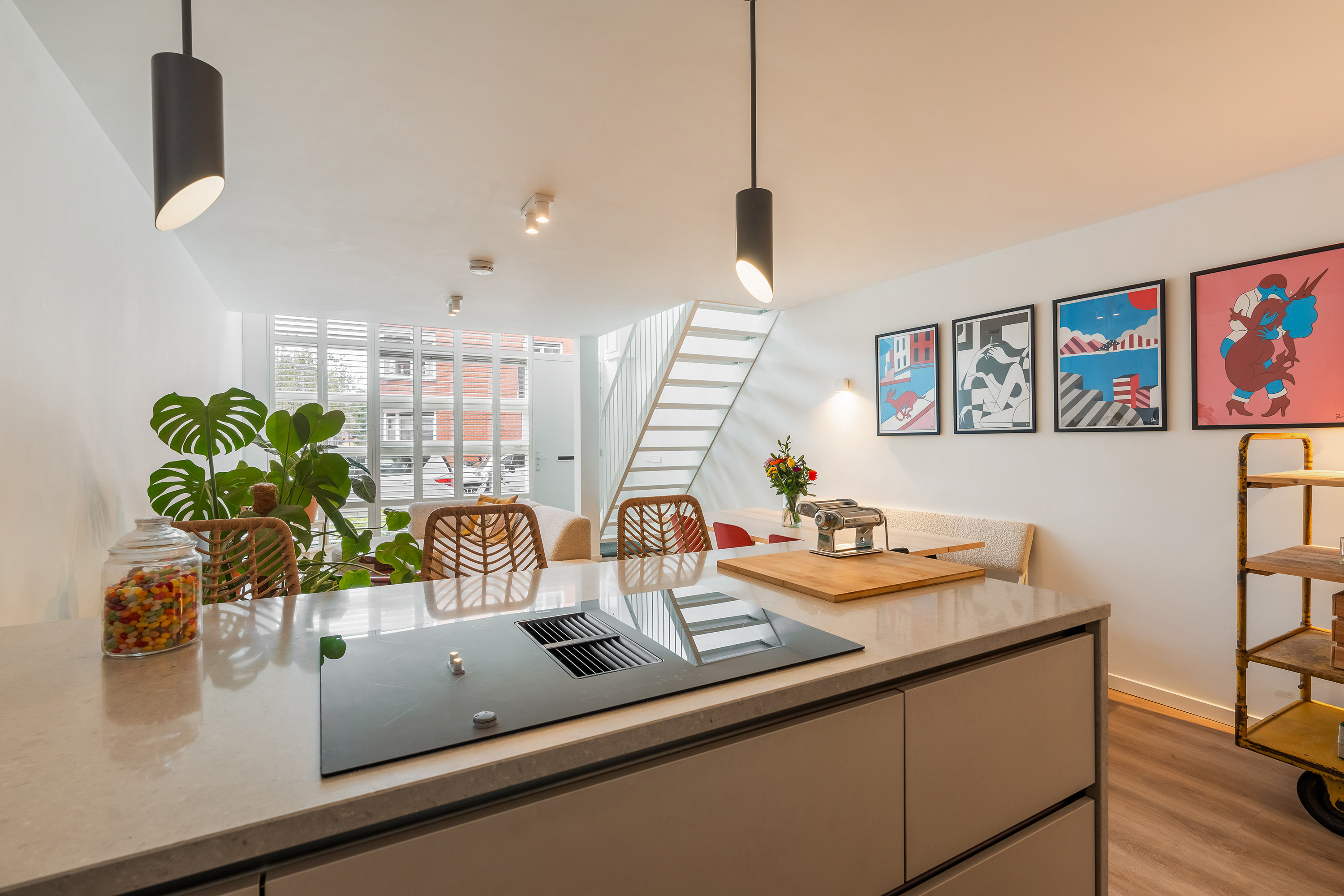 Verder is de keuken voorzien van een inductiekookplaat met geïntegreerde afzuiging, een combi-oven, een koel- en vriescombinatie, een vaatwasser en een Quooker. Vanuit de hal zijn de bijkeuken, de meterkast en het separate toilet met fonteintje te bereiken. In de bijkeuken zijn de aansluitingen voor de wasmachine en droger te vinden, evenals ruimte voor je fiets. Daarnaast bevindt zich hier een deur waarmee de woning ook via de achterom bereikbaar is. Terug in de woonkamer bevindt zich de trap naar de eerste verdieping. Dankzij de aanwezige vide zijn de ramen extra groot, wat zorgt voor veel lichtinval en een speelse indeling van de ruimte.