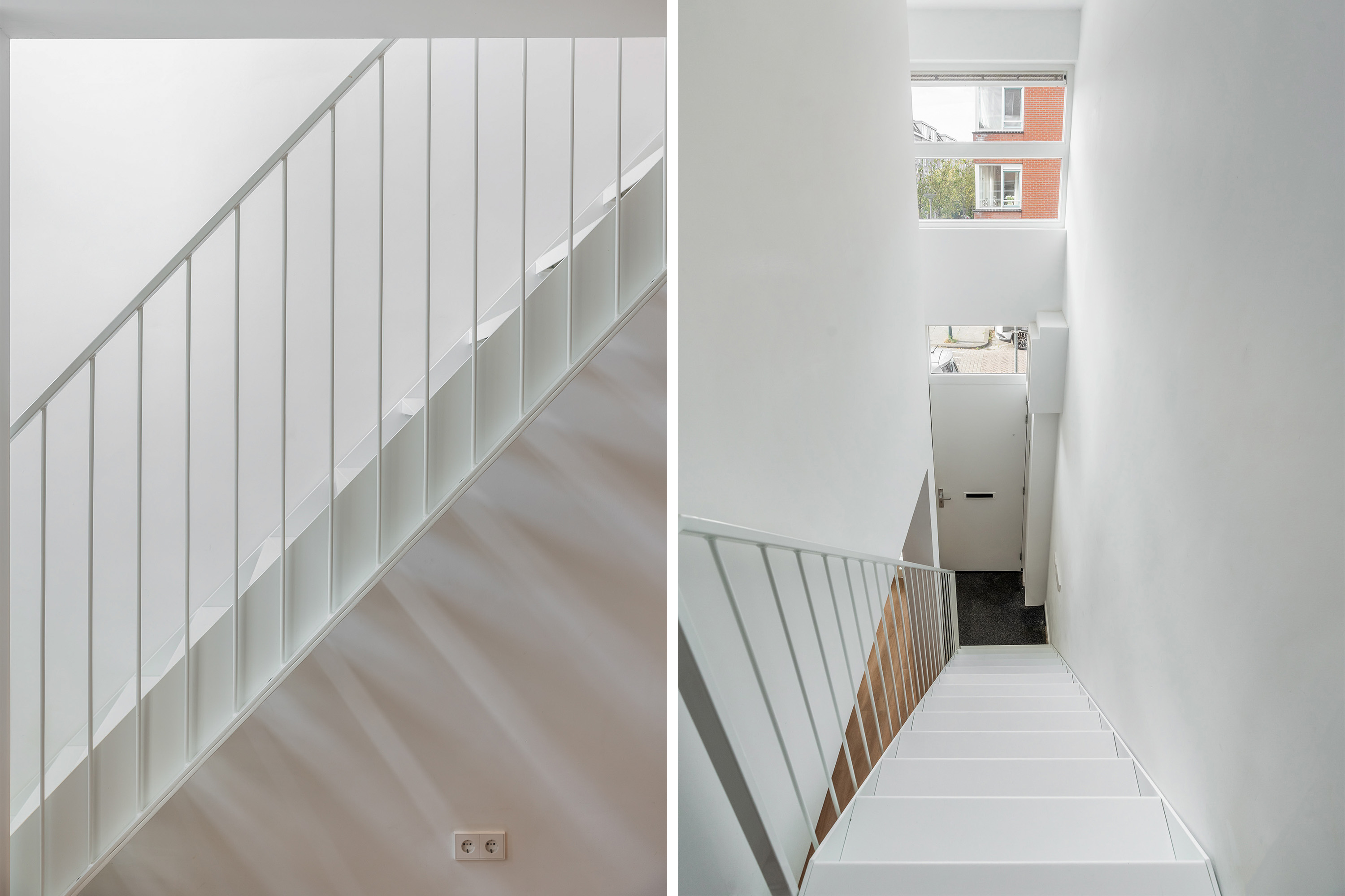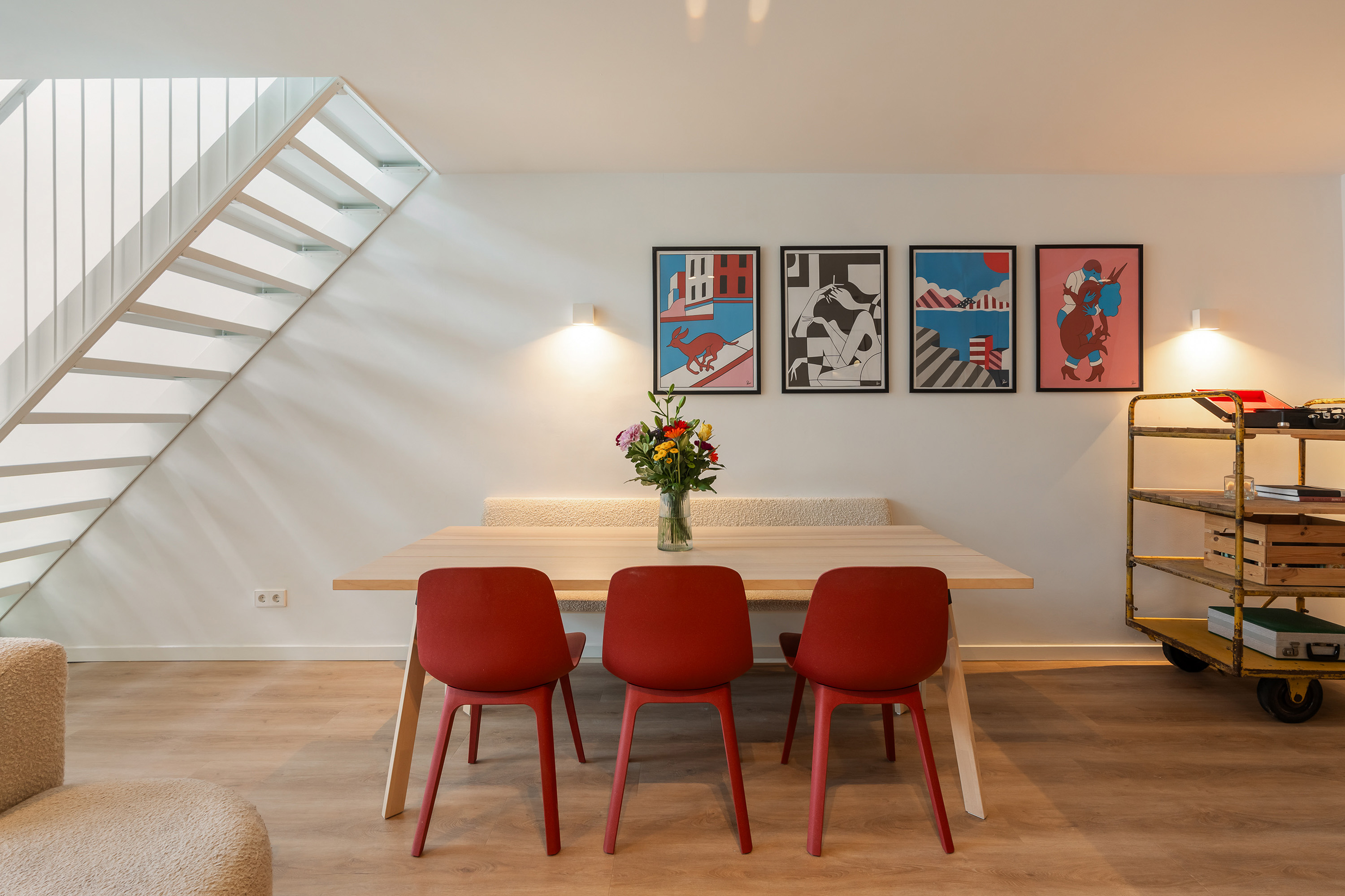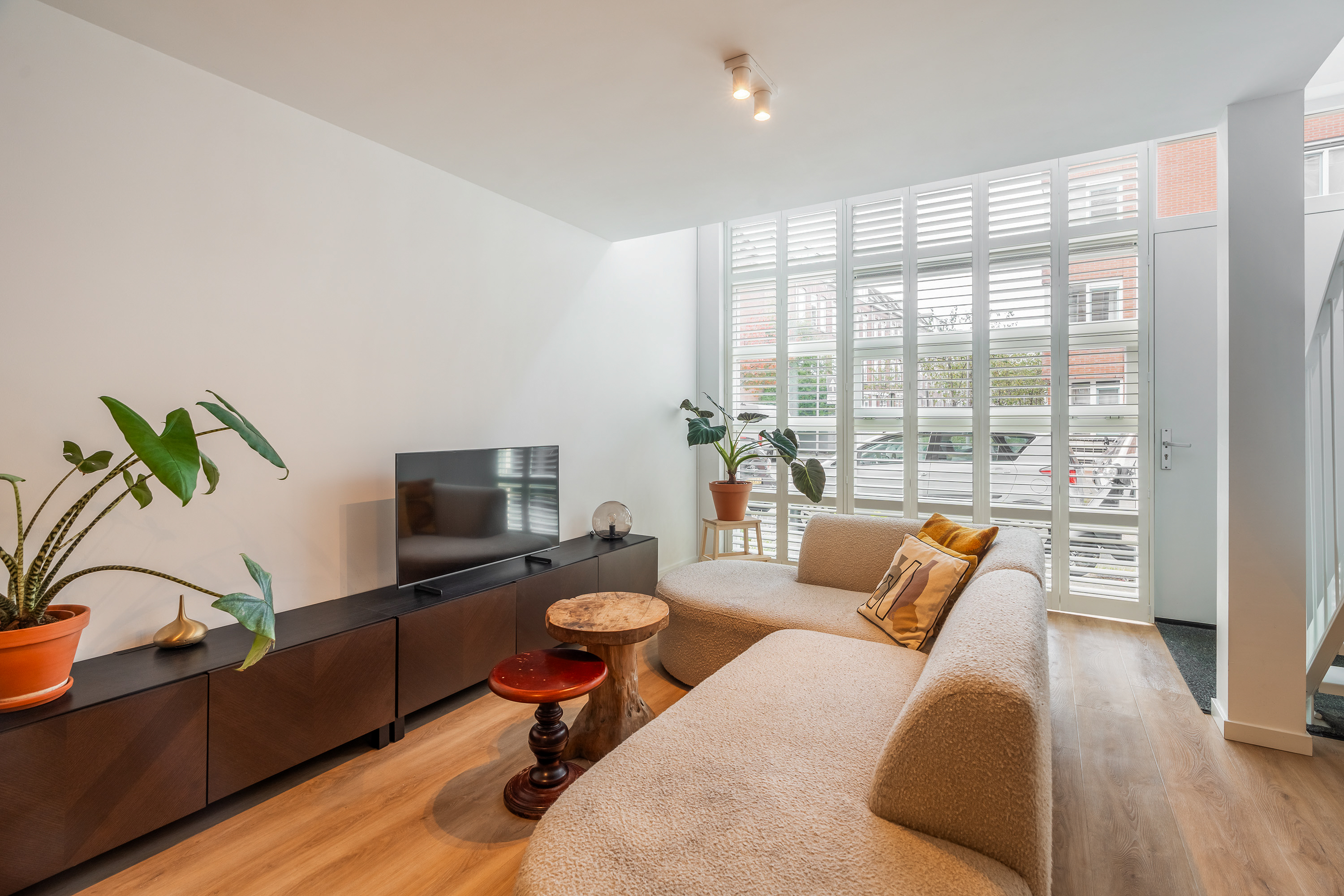 Verder is de keuken voorzien van een inductiekookplaat met geïntegreerde afzuiging, een combi-oven, een koel- en vriescombinatie, een vaatwasser en een Quooker. Vanuit de hal zijn de bijkeuken, de meterkast en het separate toilet met fonteintje te bereiken. In de bijkeuken zijn de aansluitingen voor de wasmachine en droger te vinden, evenals ruimte voor je fiets. Daarnaast bevindt zich hier een deur waarmee de woning ook via de achterom bereikbaar is. Terug in de woonkamer bevindt zich de trap naar de eerste verdieping. Dankzij de aanwezige vide zijn de ramen extra groot, wat zorgt voor veel lichtinval en een speelse indeling van de ruimte.