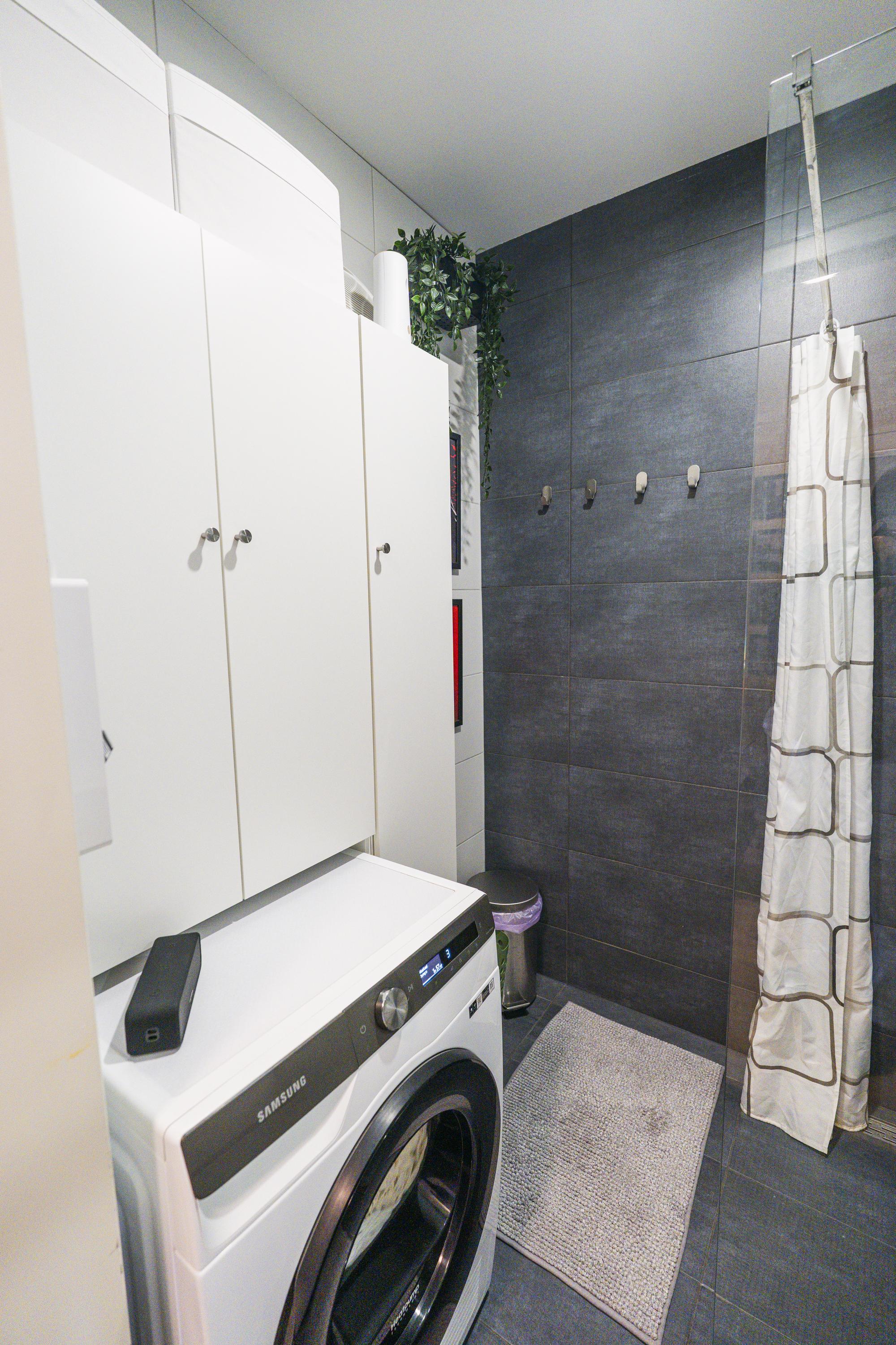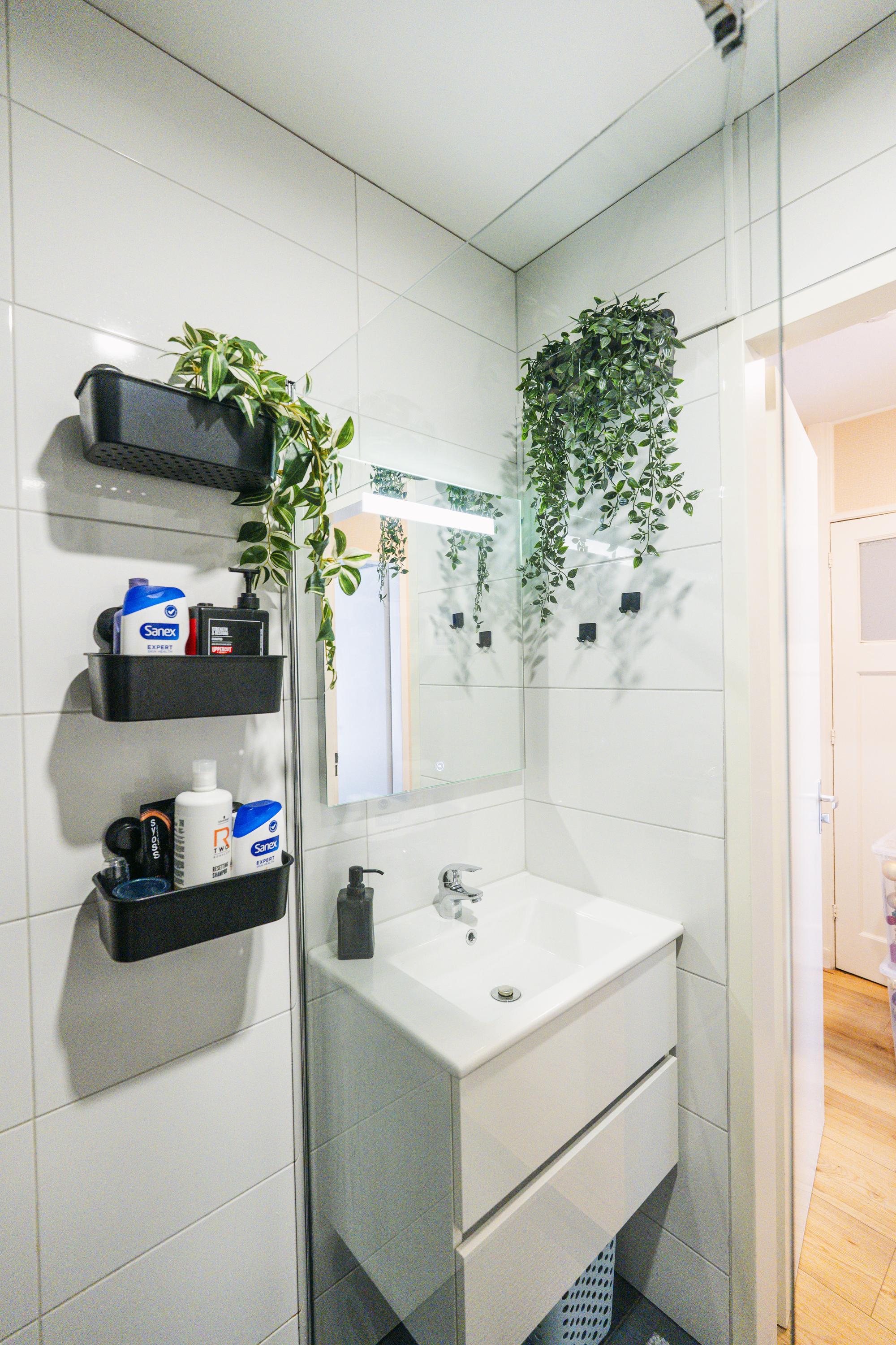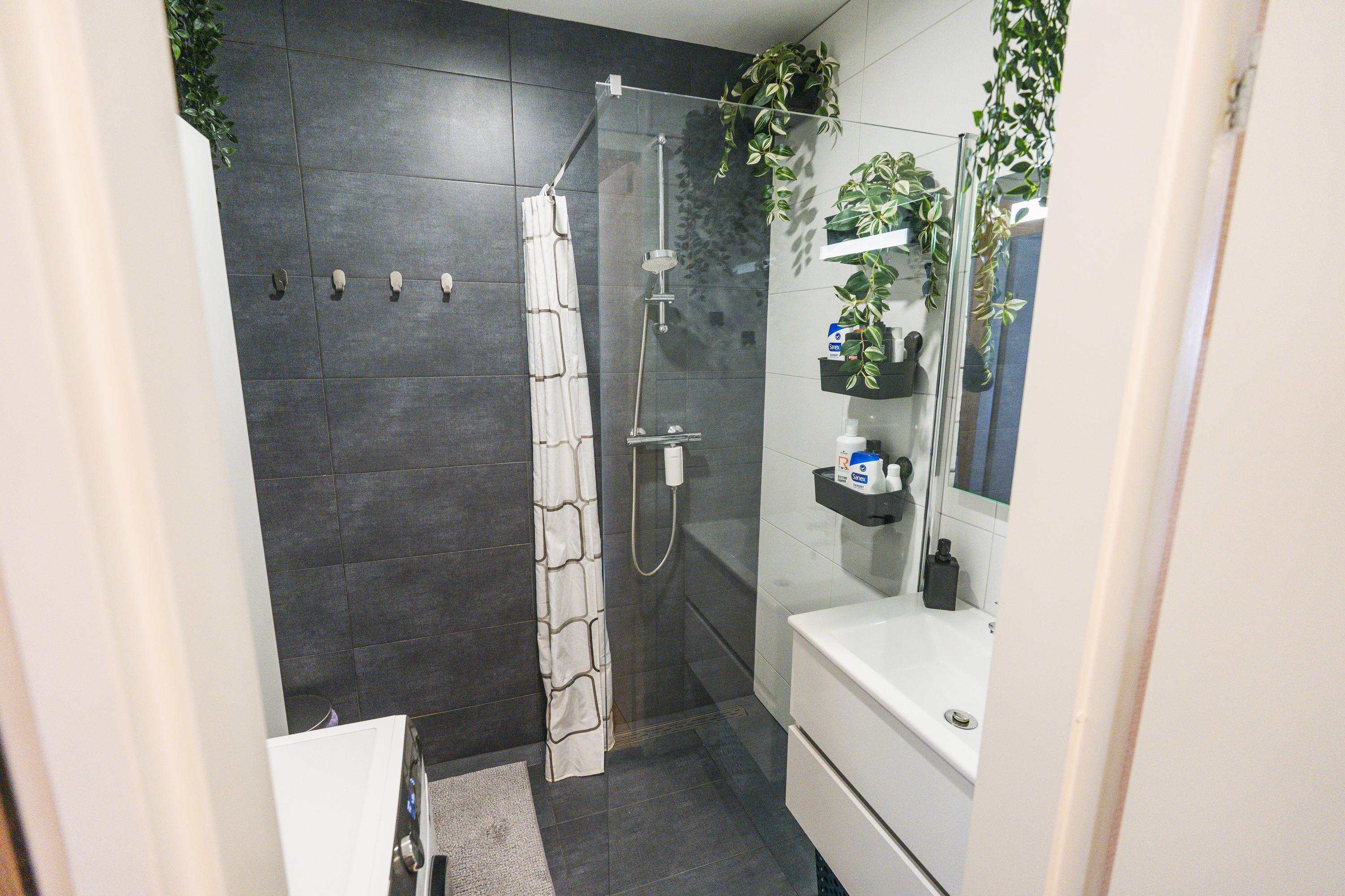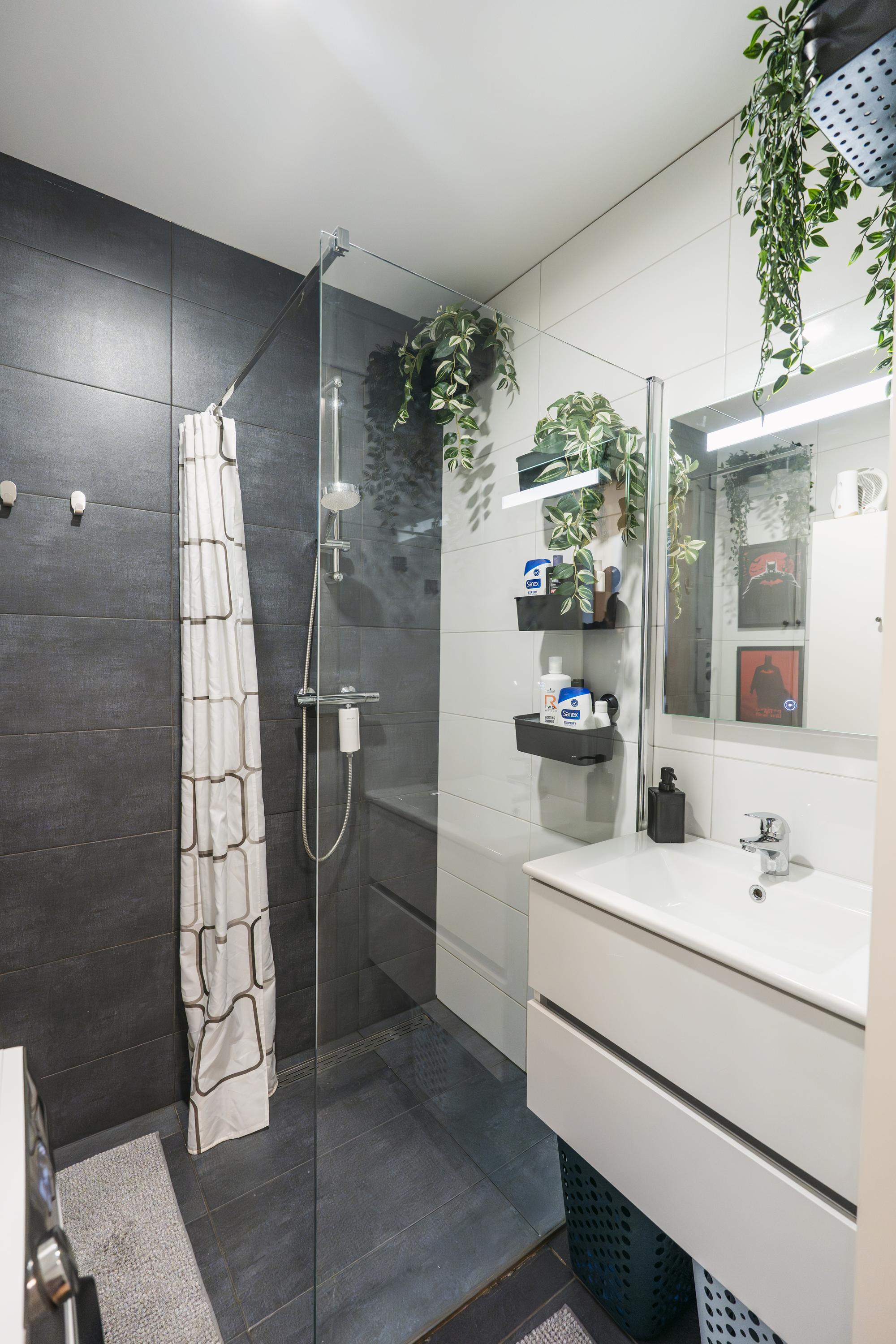 De badkamer is voorzien van een inloopdouche en een wastafelmeubel. Daarnaast is er een separaat toilet aanwezig. Ook beschikt de woning over een praktische wasruimte voor de wasmachine en extra bergruimte.