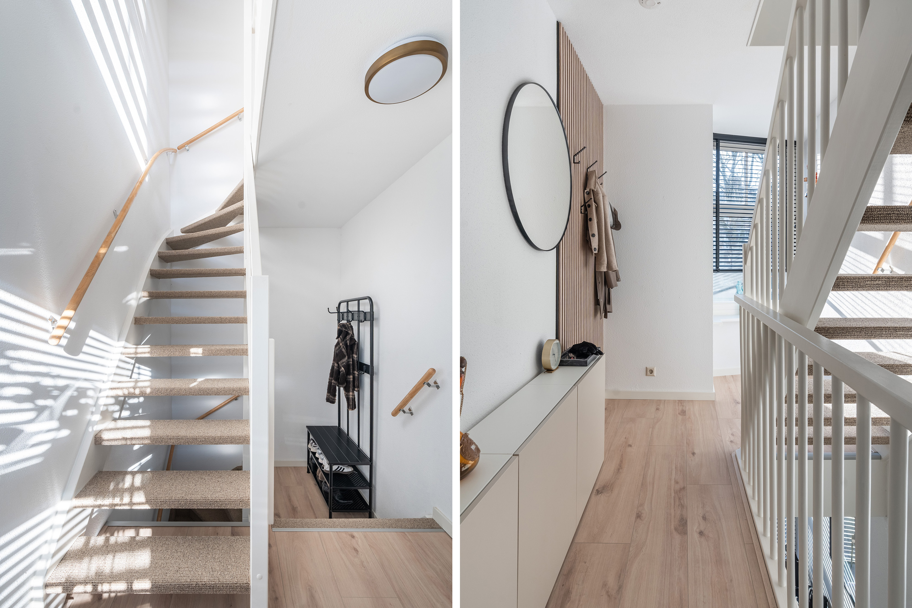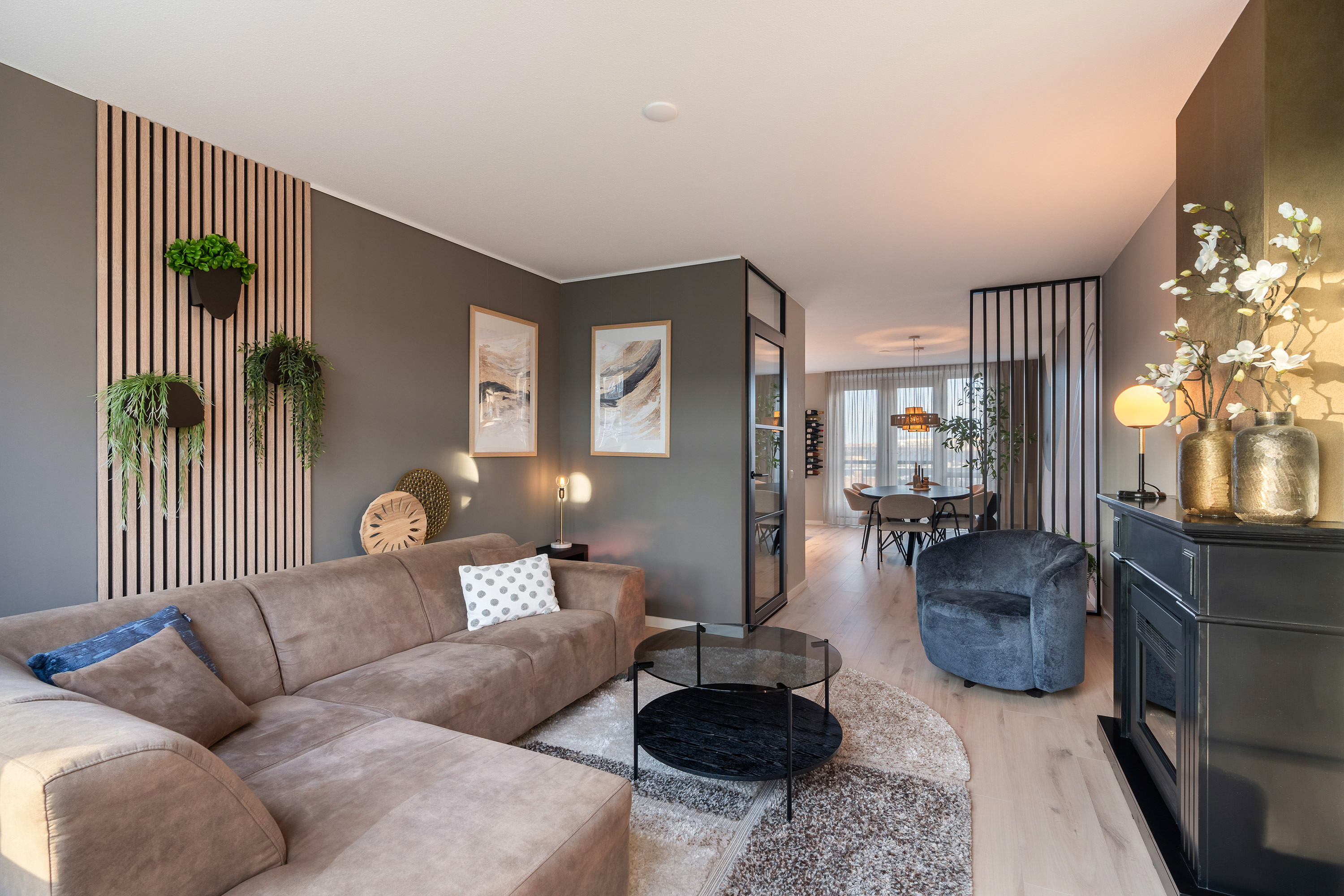 Via de overlopen met praktische bergruimte en garderobes kom je in de hal, afgewerkt in lichte tinten en voorzien van een stijlvolle zwarte deur en betreed je de royale woonkamer. De woning is recent in 2023 geheel intern opgeknapt. Direct valt het overvloedige daglicht op dat door de brede ramen naar binnen valt. De woonkamer heeft een warme vloerafwerking en stijlvolle details zoals geïntegreerde kasten, een haardmeubel en decoratieve wandpanelen.
