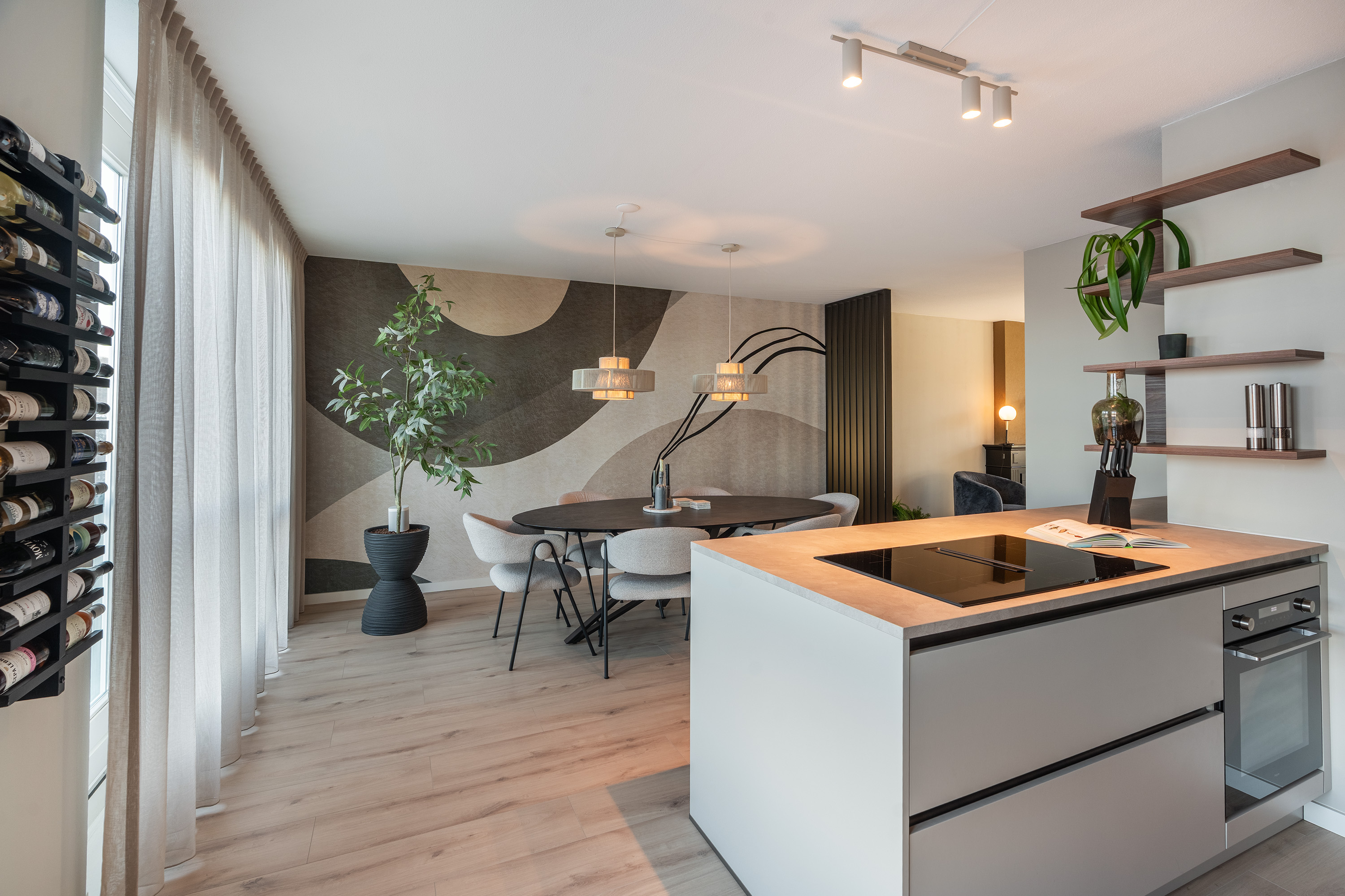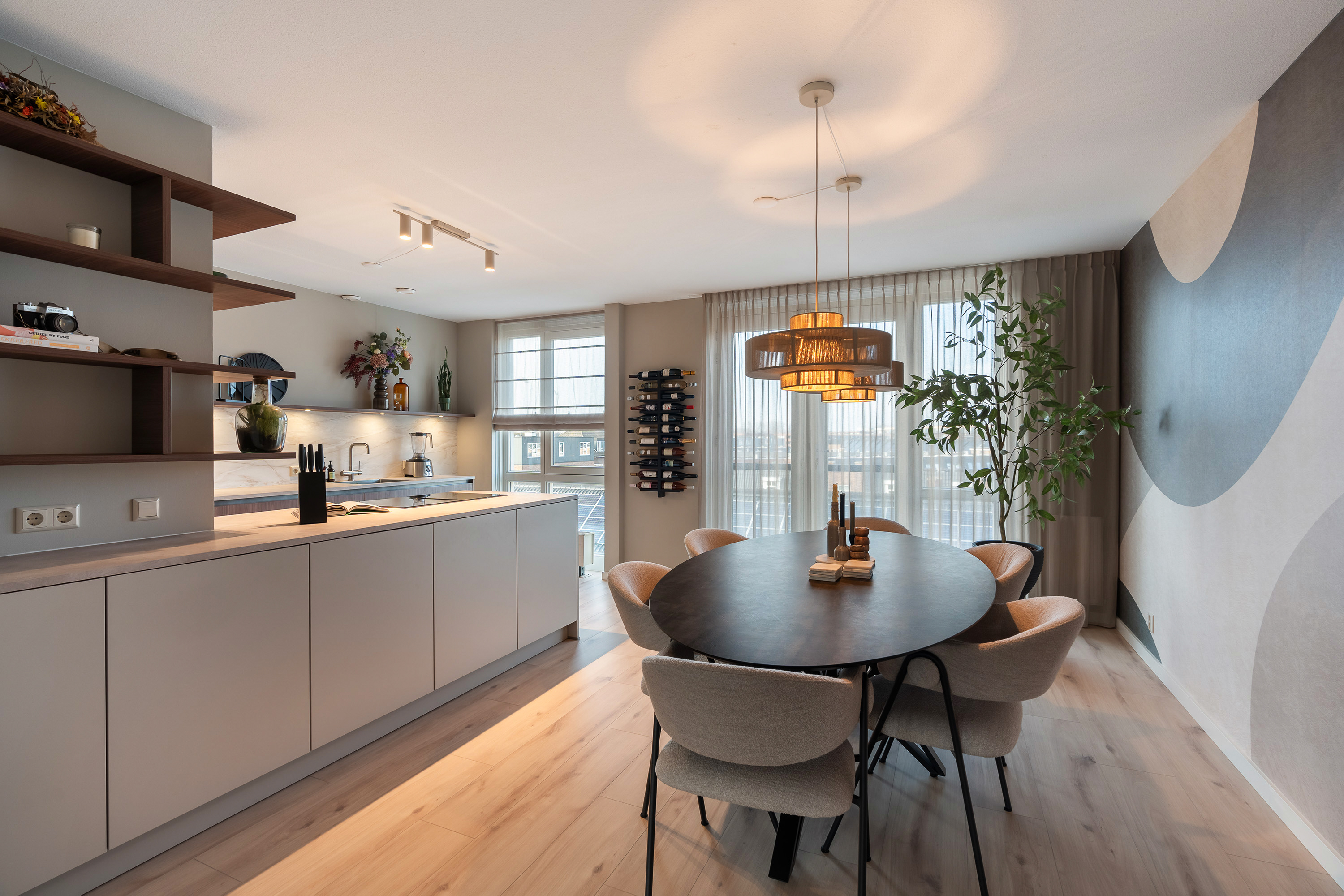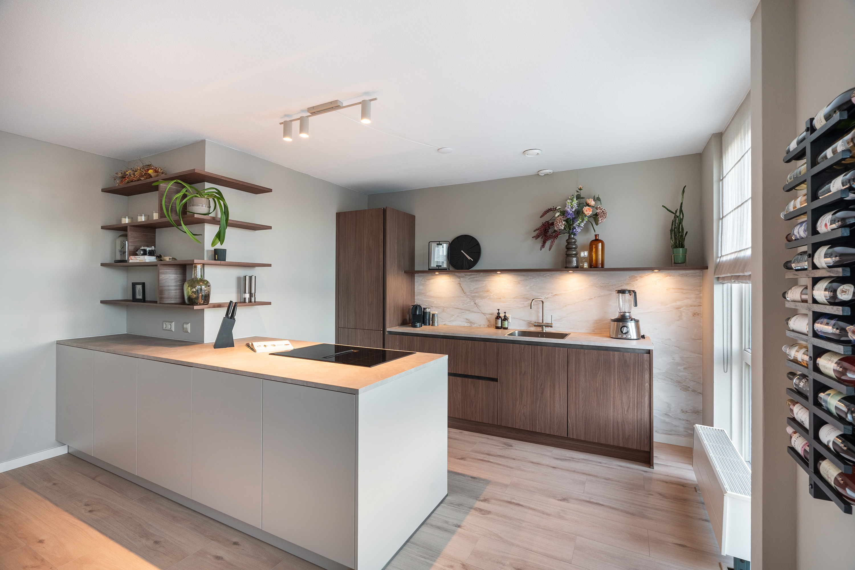 Aan de achterzijde bevindt zich de luxe leefkeuken (2023) met open eetkamer. Deze keuken is meer dan alleen een functionele ruimte, het is een uitnodigend middelpunt van het huis. Het verfijnde ontwerp combineert warme houttonen met een marmerlook werkblad en een strakke, greeploze afwerking. Het royale kookschiereiland is uitgerust met een inductiekookplaat met geïntegreerde afzuiging. Verder is de keuken voorzien van alle denkbare luxe: een kokend water kraan, een vaatwasser, een combi-oven, en een koel-vriescombinatie.