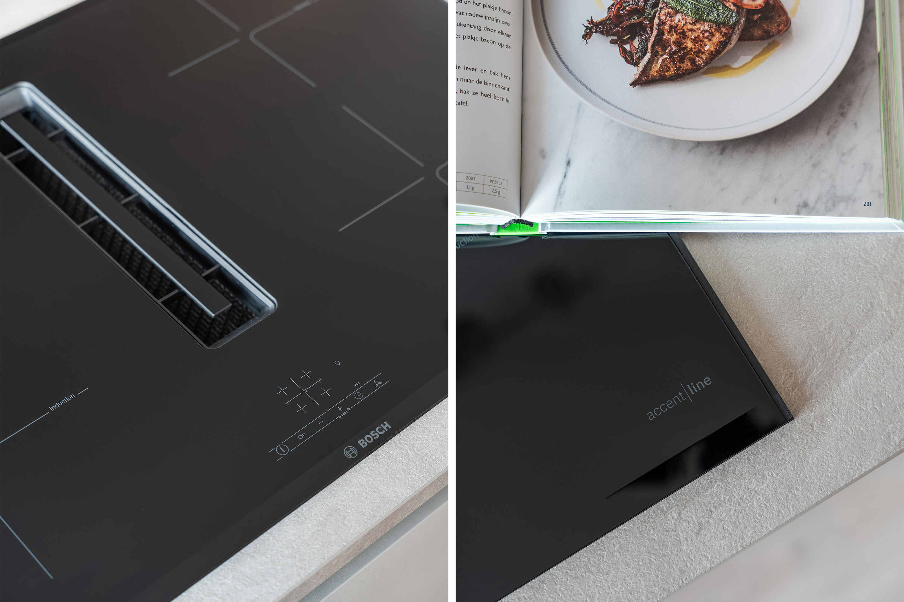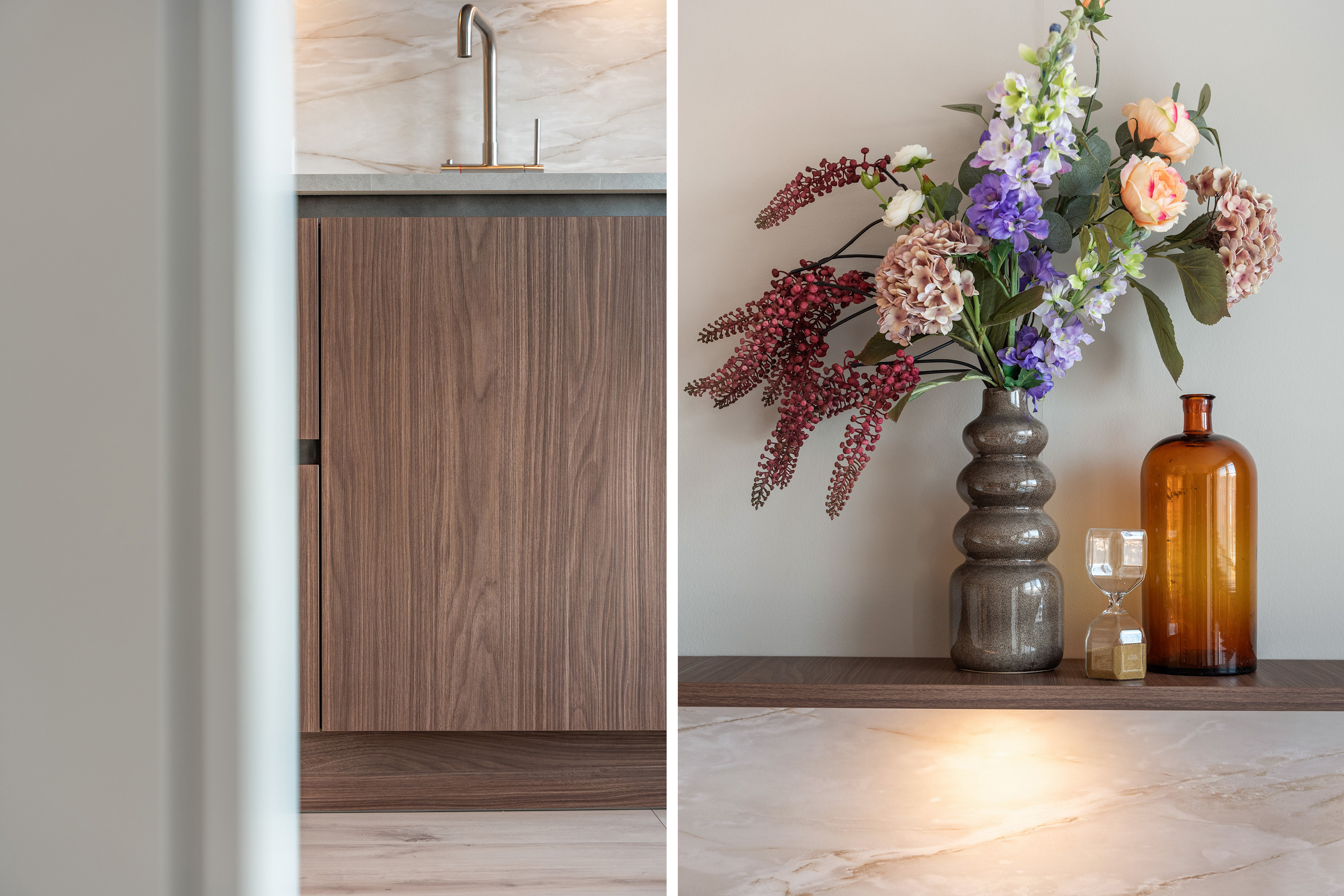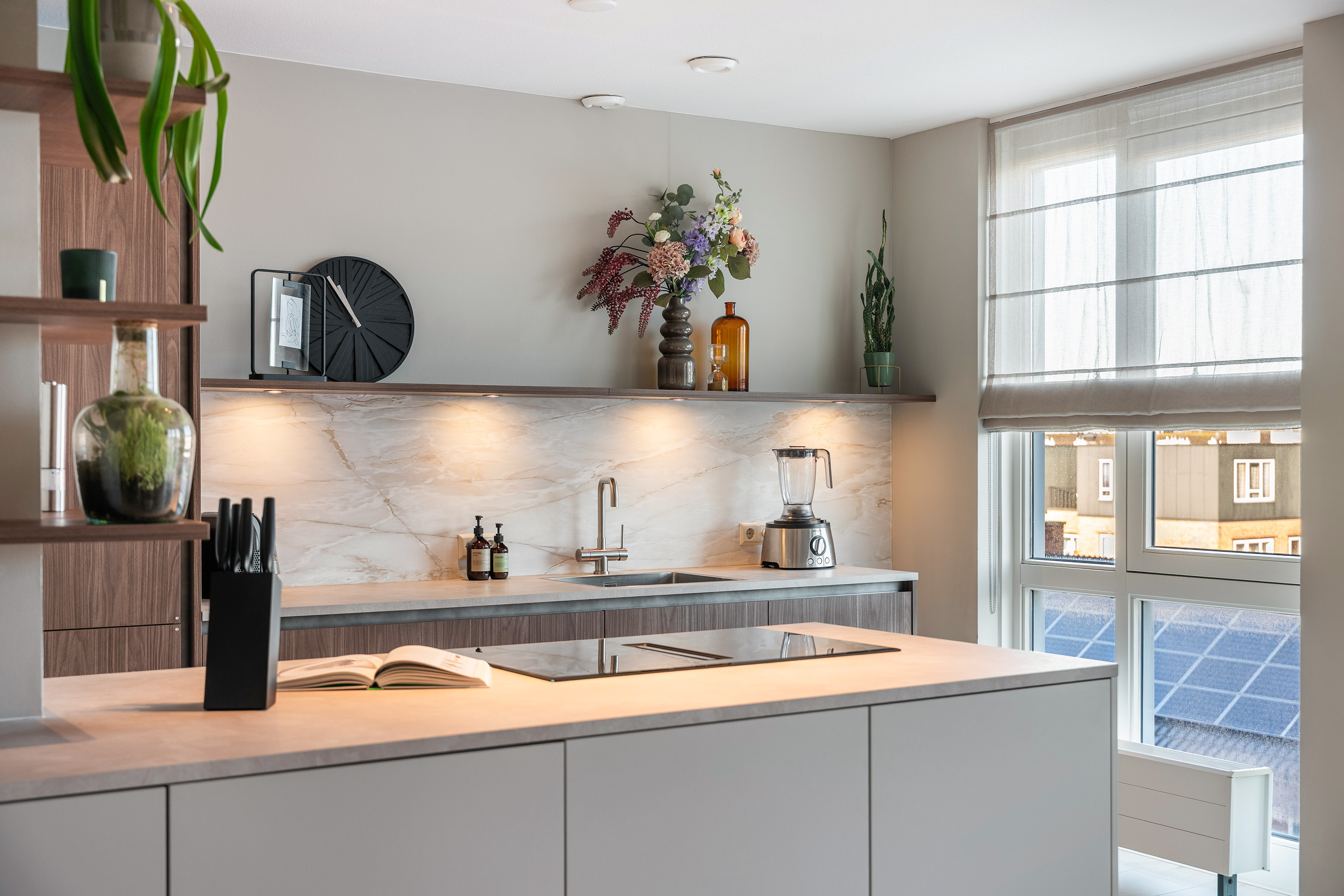 Aan de achterzijde bevindt zich de luxe leefkeuken (2023) met open eetkamer. Deze keuken is meer dan alleen een functionele ruimte, het is een uitnodigend middelpunt van het huis. Het verfijnde ontwerp combineert warme houttonen met een marmerlook werkblad en een strakke, greeploze afwerking. Het royale kookschiereiland is uitgerust met een inductiekookplaat met geïntegreerde afzuiging. Verder is de keuken voorzien van alle denkbare luxe: een kokend water kraan, een vaatwasser, een combi-oven, en een koel-vriescombinatie.