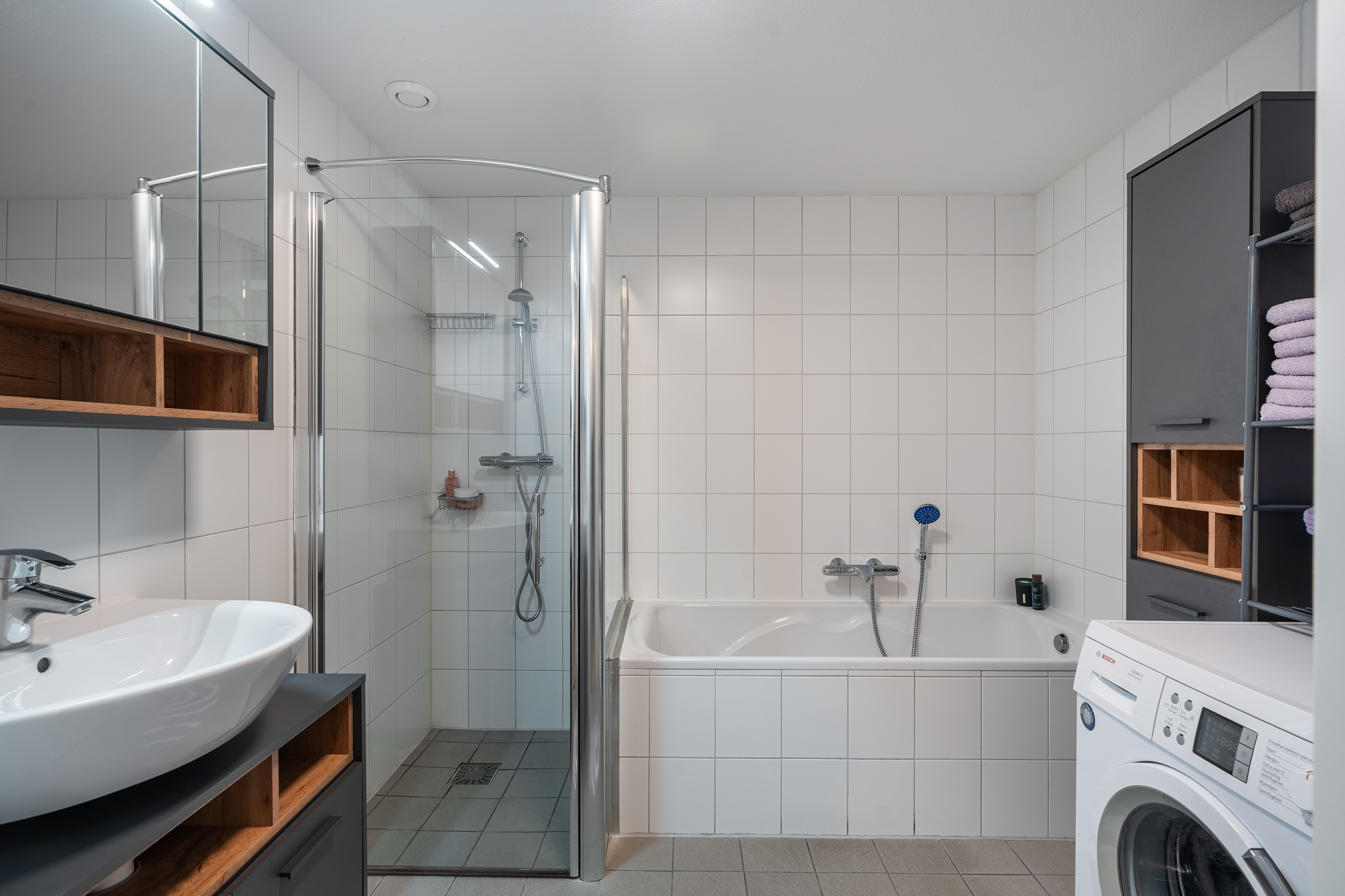 De centraal gelegen badkamer is compleet uitgerust en praktisch ingedeeld. Hier vind je een comfortabel ligbad, een aparte douche met glazen wand, een wastafelmeubel en aansluiting voor de wasmachine. Een separaat toilet op de overloop biedt extra gemak.