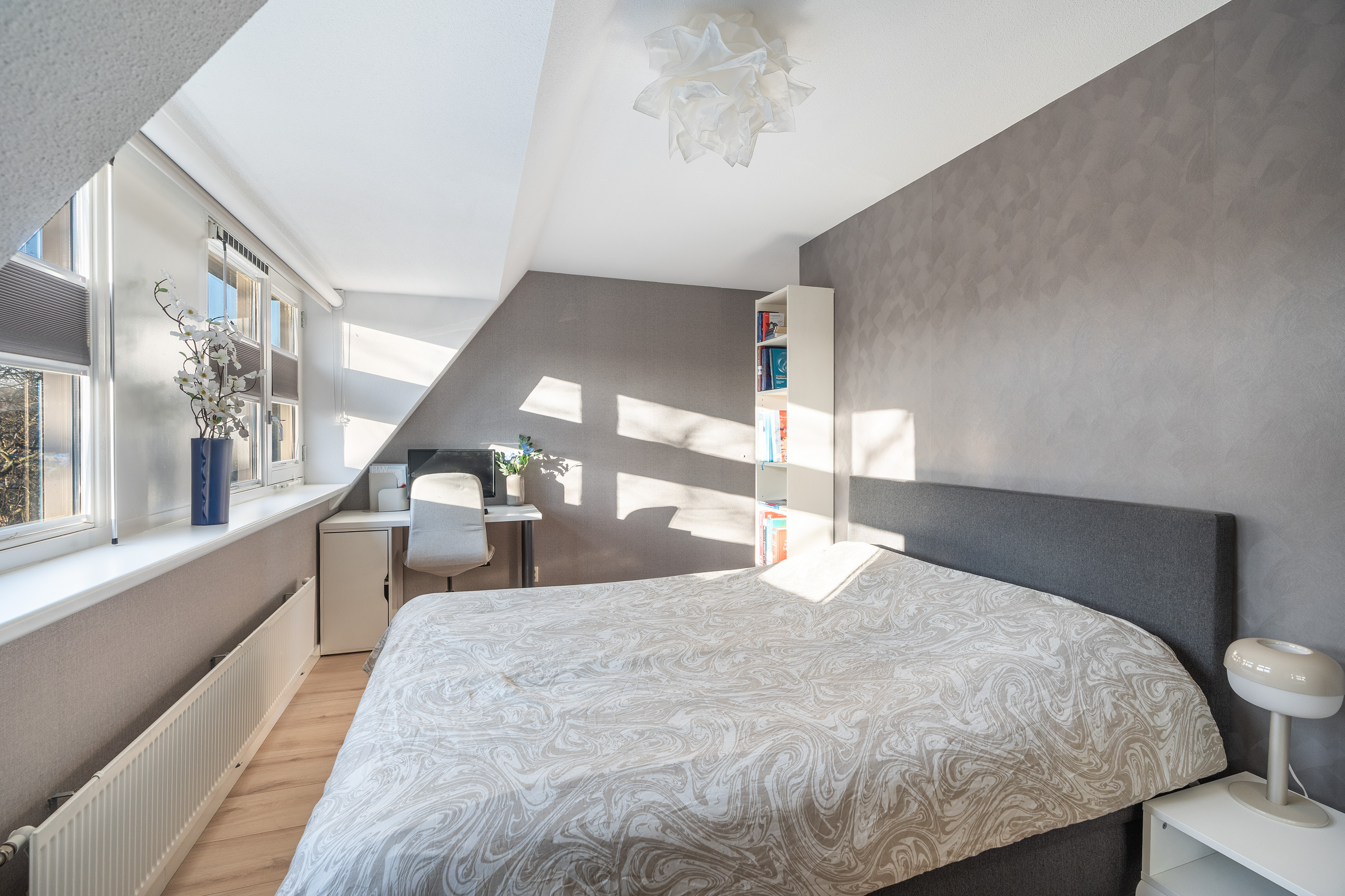 Aan de voorzijde bevindt zich de tweede slaapkamer, eveneens ruim van opzet.