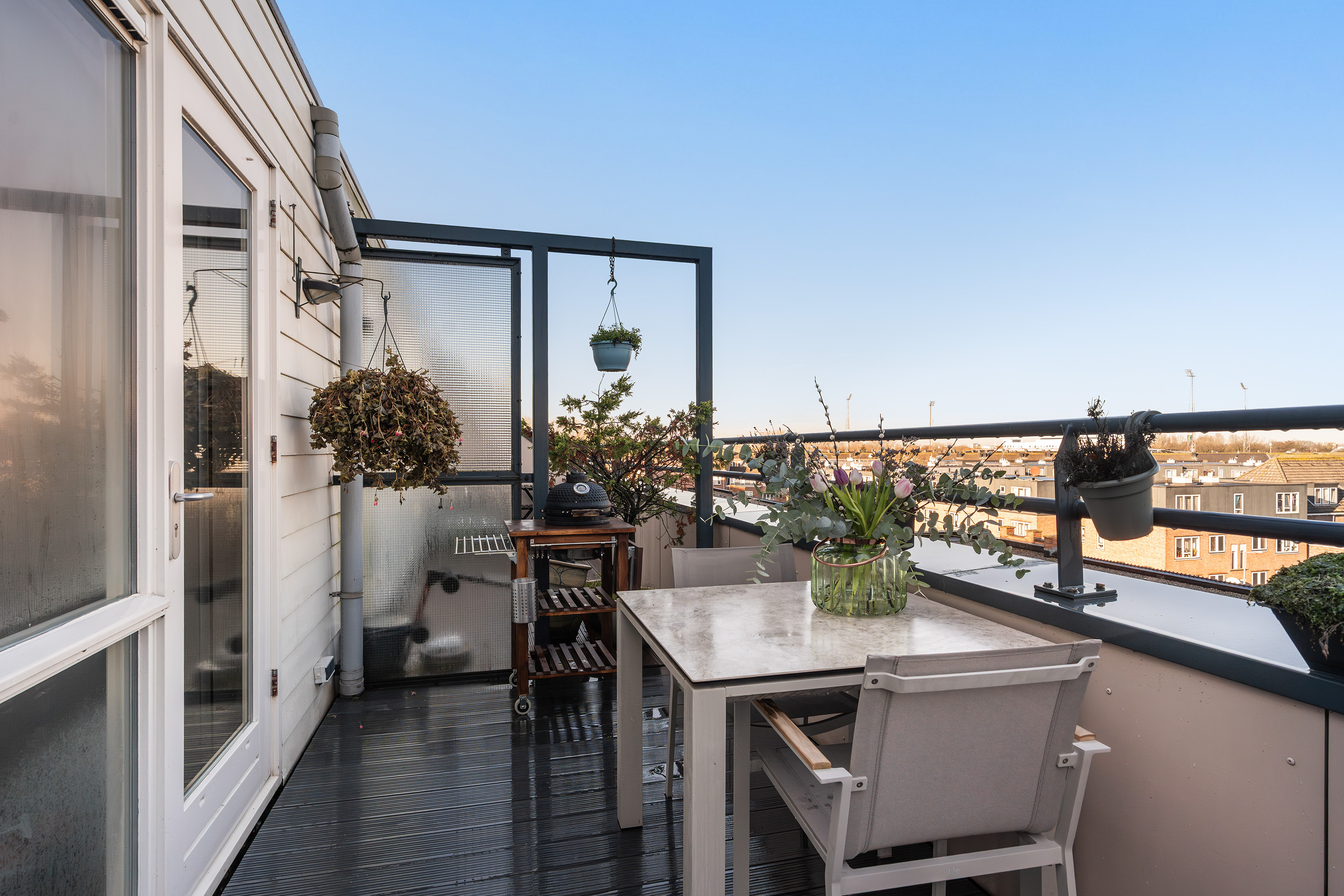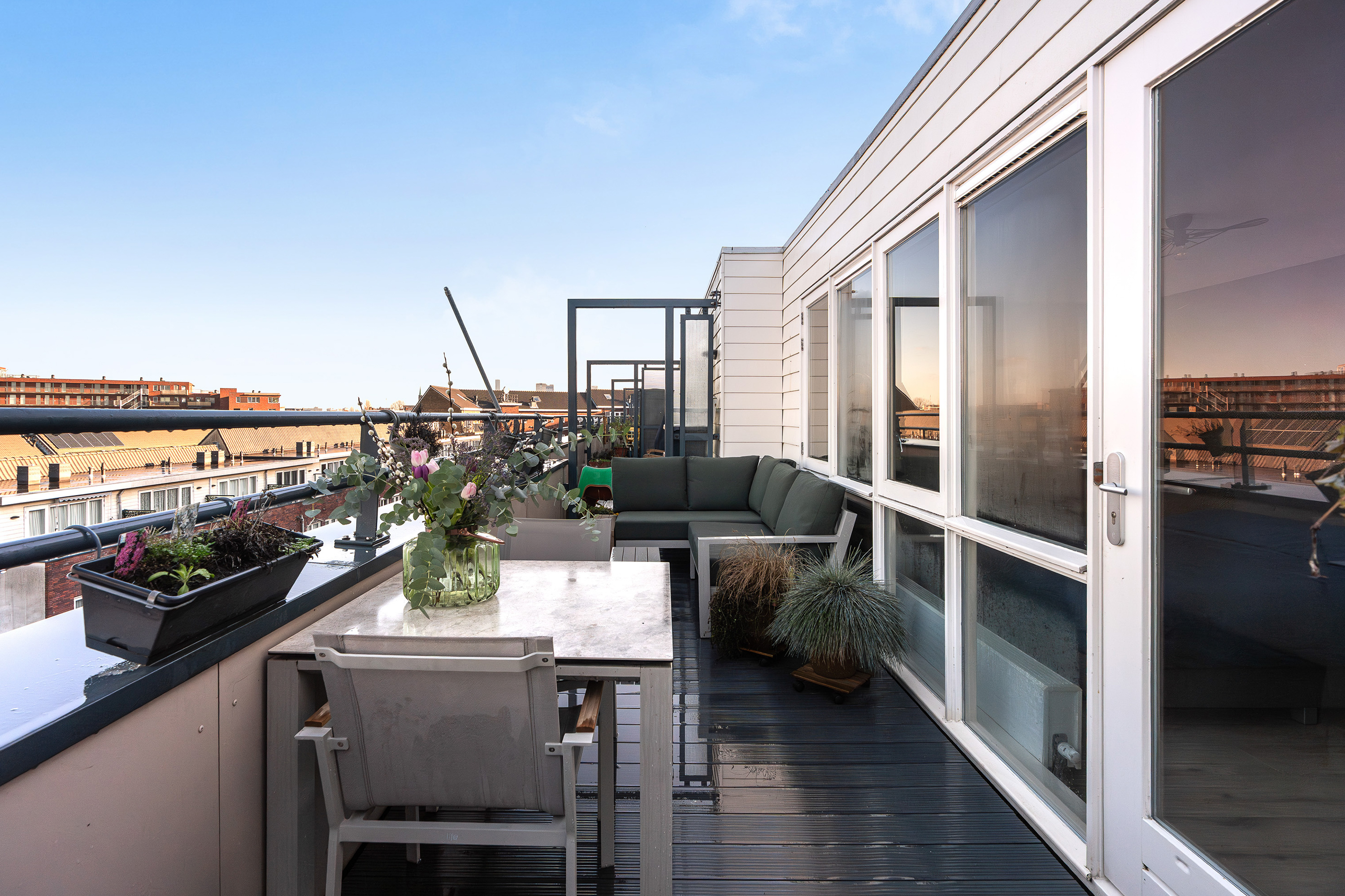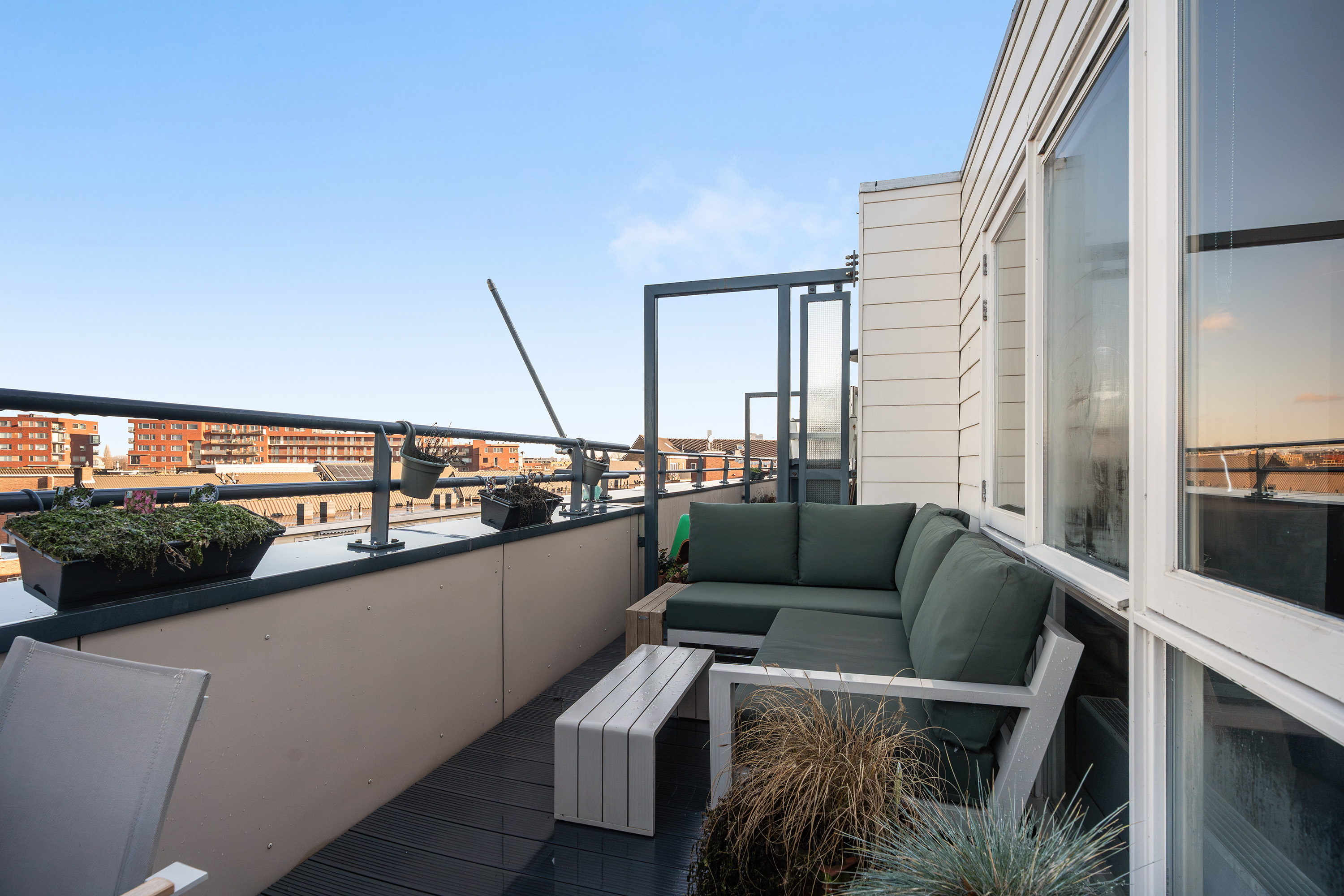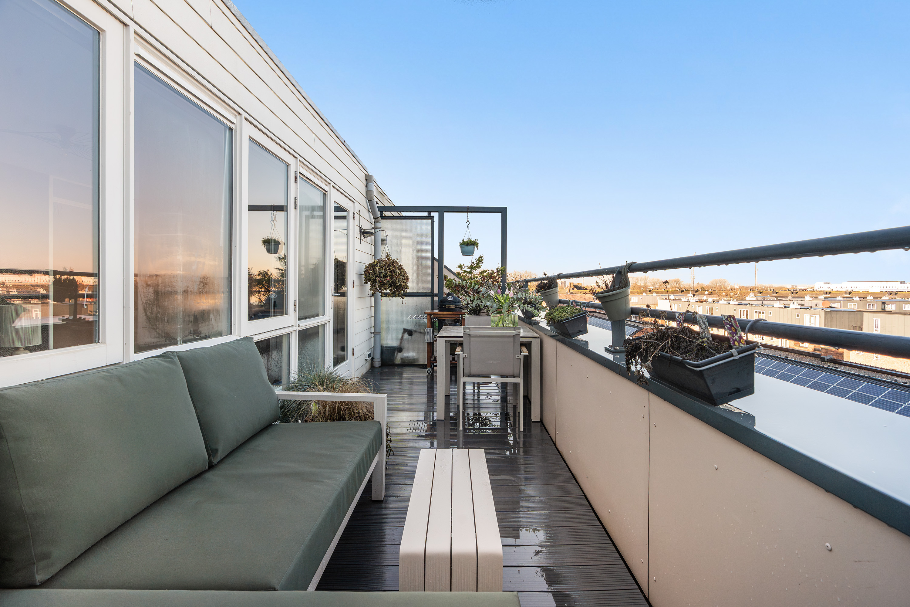 Vanuit deze kamer stap je direct het royale dakterras op, een heerlijk zonnige buitenruimte met meer dan genoeg plek voor zowel een loungebank als een eettafel. Een plek waar je in alle rust de dag begint met een koffie in de ochtendzon of afsluit met een glas wijn en een barbecue bij zonsondergang.