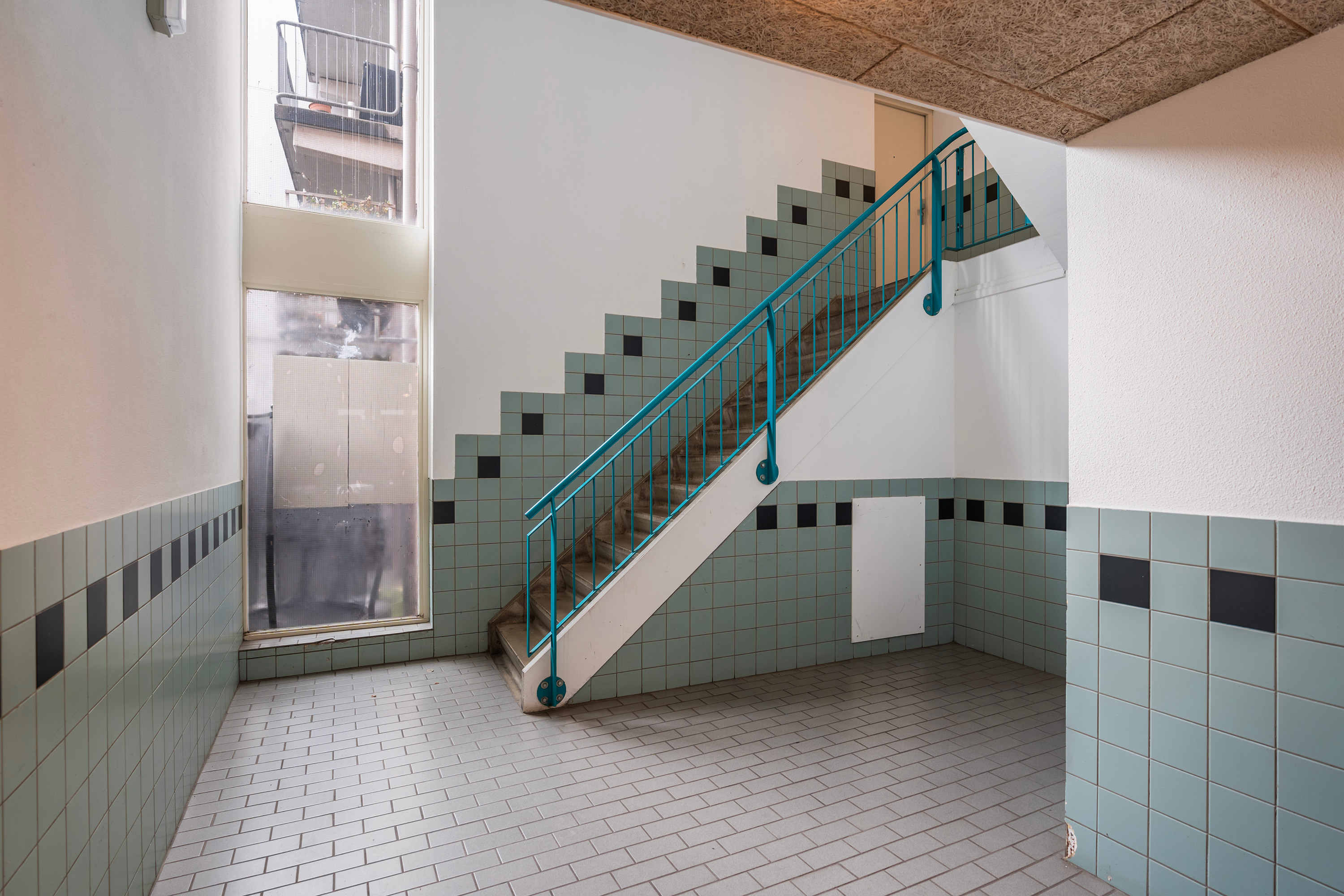 Gesloten portiek met brievenbussen, bellentableau en trappenhuis.