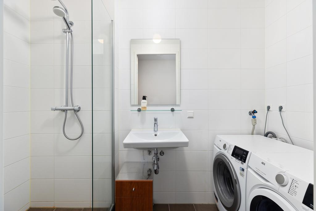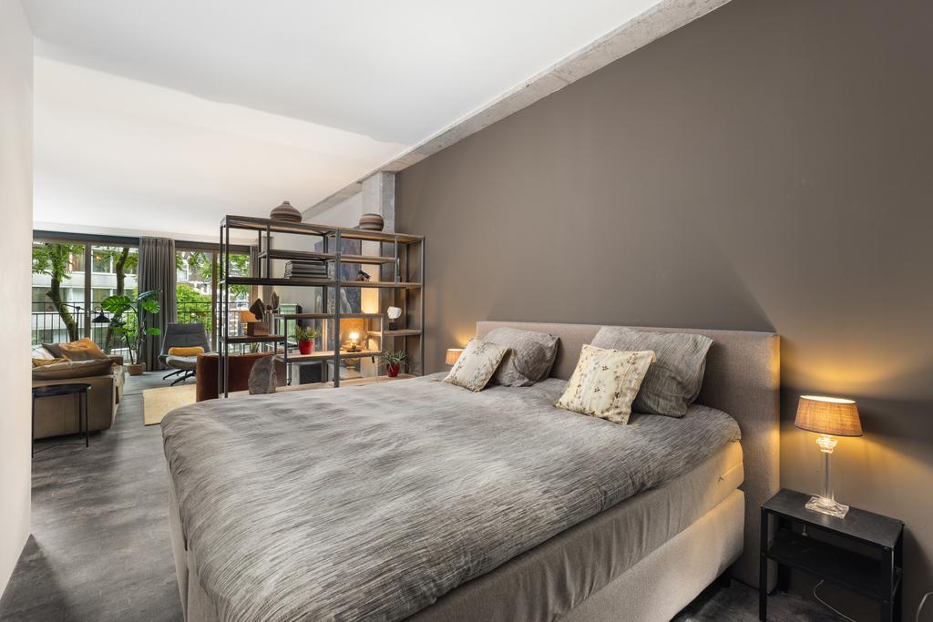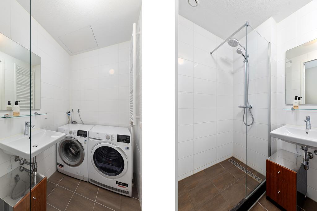 Het slaapgedeelte is slim afgescheiden van de woonkamer door een roomdivider, wat zorgt voor een open en ruimtelijk effect. Je hebt hier voldoende ruimte voor een tweepersoonsbed en een grote kledingkast. De volledig betegelde badkamer biedt een inloopdouche, een moderne wastafel en een designradiator. Hier vind je tevens de aansluitingen voor de wasmachine en droger. Het toilet is separaat.