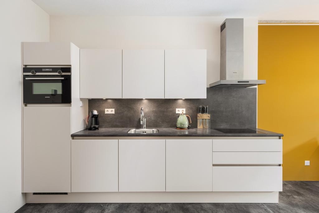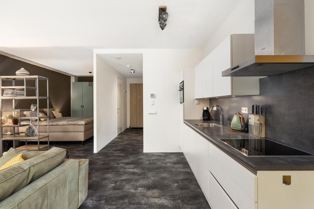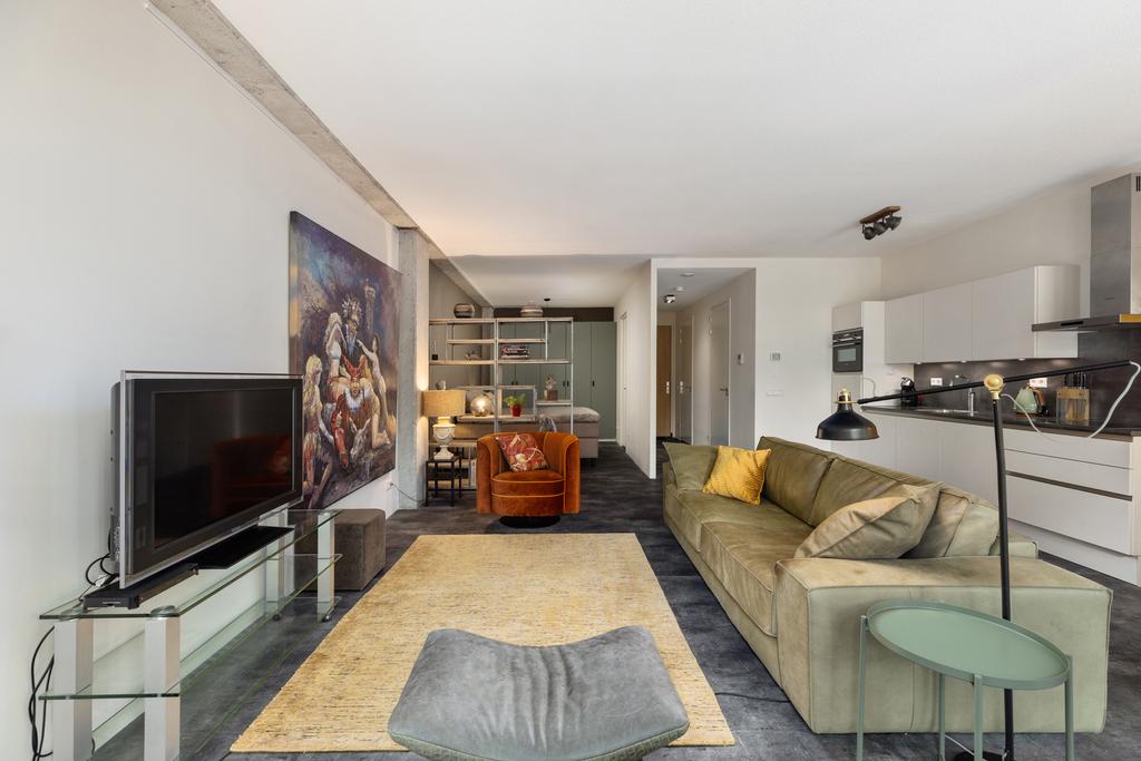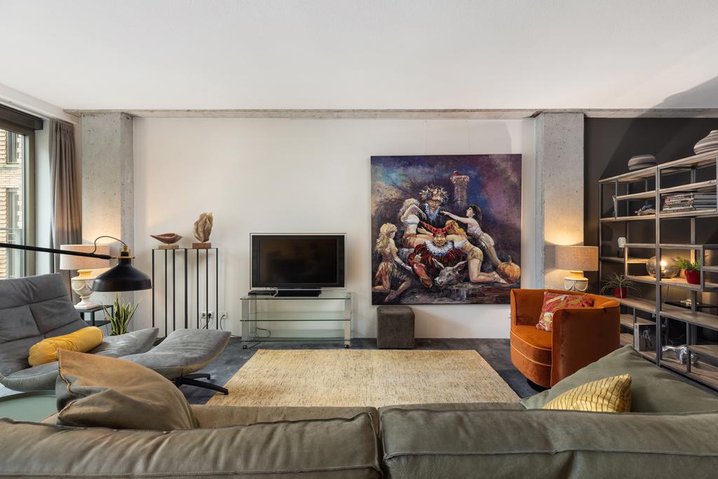 De luxe open keuken is uitgevoerd in stijlvol wit hoogglans en voorzien van diverse hoogwaardige inbouwapparatuur. Dit vormt een perfecte balans tussen modern design en functionaliteit. De living is strak afgewerkt met gestuukte muren en hoge plafonds van 272 cm. De originele betonnen elementen geven de loft een industriële look en het echte City Loft gevoel.
