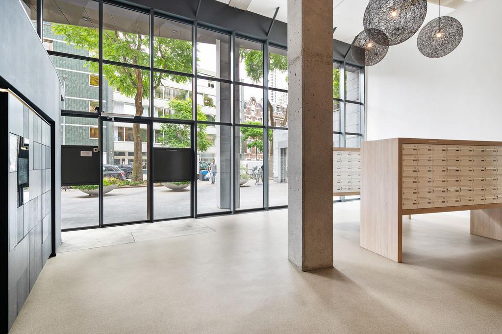 Entree in een stijlvolle hal en atrium. Voel je direct welkom door de luxe en warme omgeving. Tevens heb je hier toegang tot de brievenbussen, BringMe pakketjes bezorgsysteem, lift, fietsenstalling, berging en het trappenhuis.