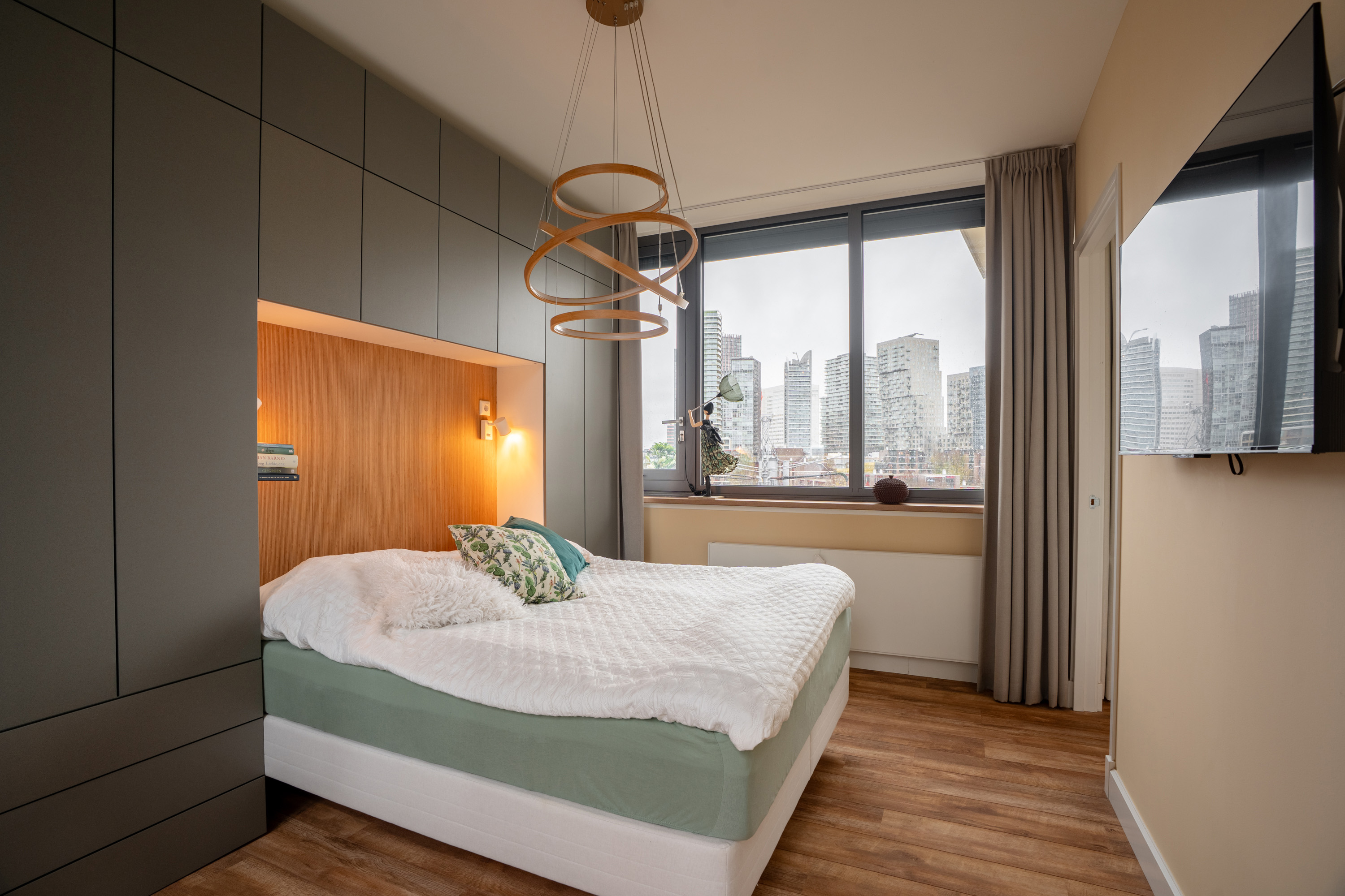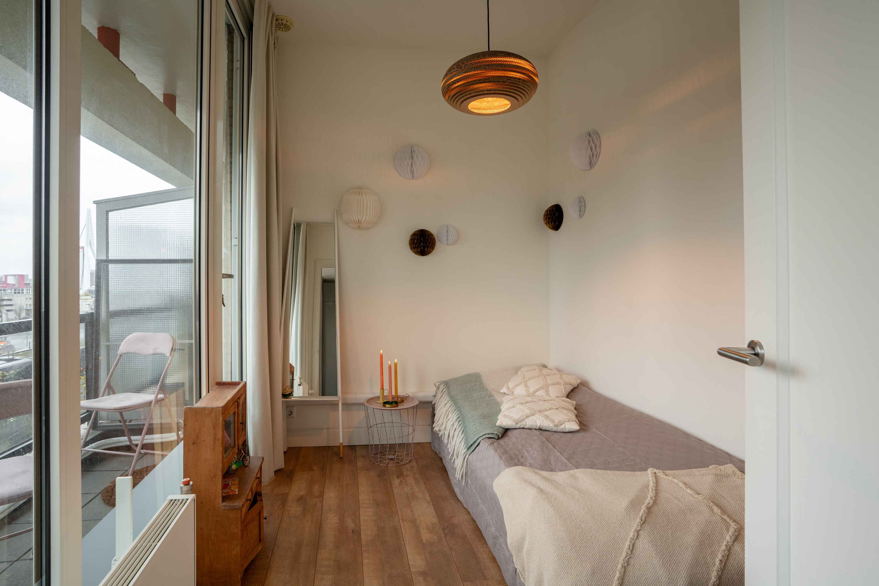 Op deze verdieping bevinden zich twee slaapkamers met beide het indrukwekkende stadse uitzicht aan de voorzijde! In de hoofdslaapkamer is een op maat gemaakte bedkastenwand gebouwd (blijft achter), die zorgt voor extra veel opbergruimte en daarnaast een stoere touch geeft. Hier vanuit loop je door naar de tweede slaapkamer met toegang tot het pandbrede balkon. En raad eens: ook hier bewonder je wederom het fantastische uitzicht! Alsof dat nog niet genoeg is, bereik je via de overloop aan de andere zijde het zeer royale terras op het westen. Heb je ooit zo heerlijk beschut buiten kunnen genieten, terwijl je toch midden in het bruisende stadsleven zit? Wat een pluspunt! Hier kijk je uit op de nieuwe luxe Baantoren (oplevering 2026). Terug op de overloop is een wasruimte en het separate toilet met fonteintje te vinden.
