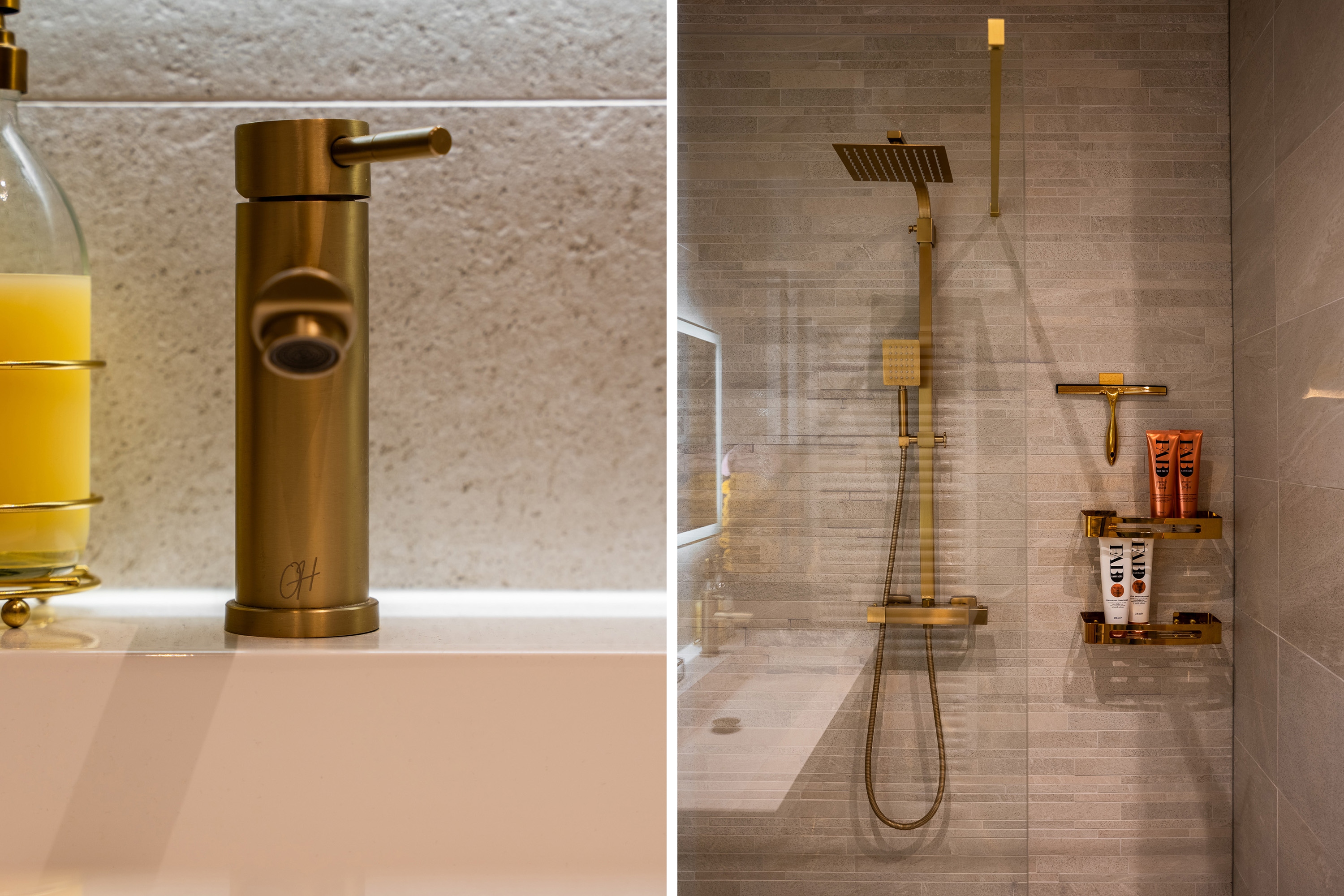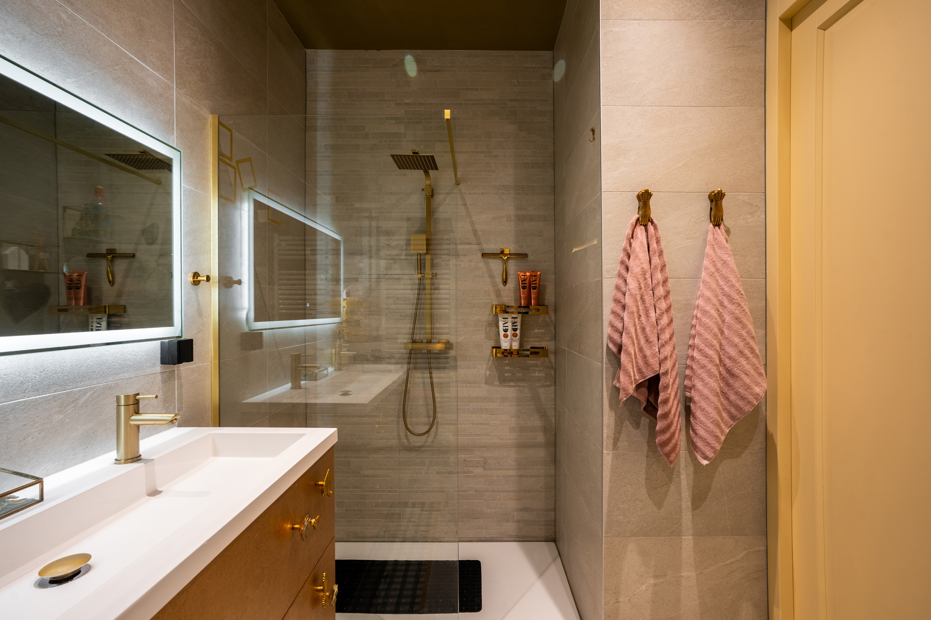 In de hal is de badkamer gevestigd met een luxueuze uitstraling. Deze is uitgerust met een inloopdouche met rainshower, een dubbele wastafel met zwevend meubel, een verlichte spiegel, zwevend toilet en handdoekradiator. De trap brengt je naar de vijfde verdieping.