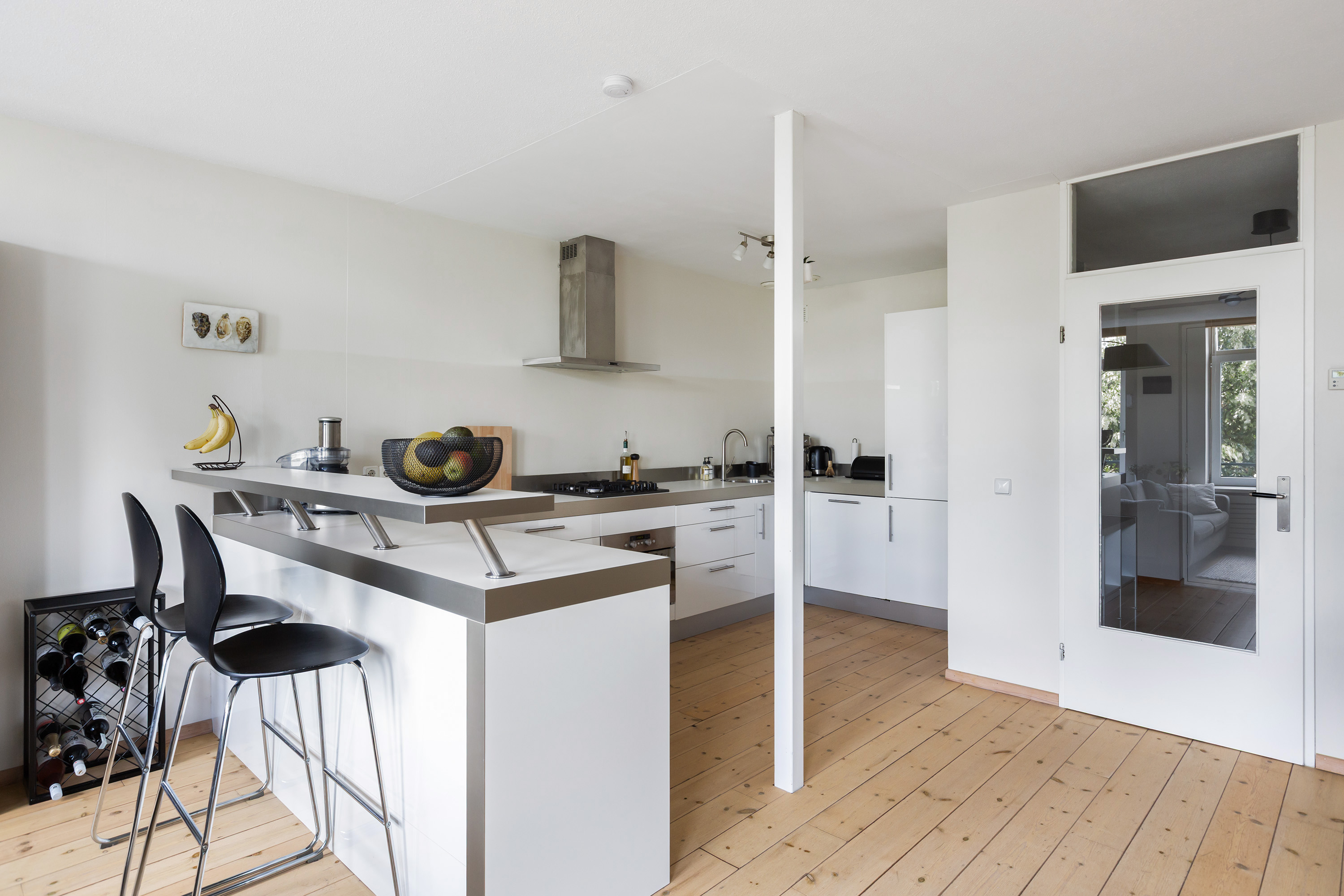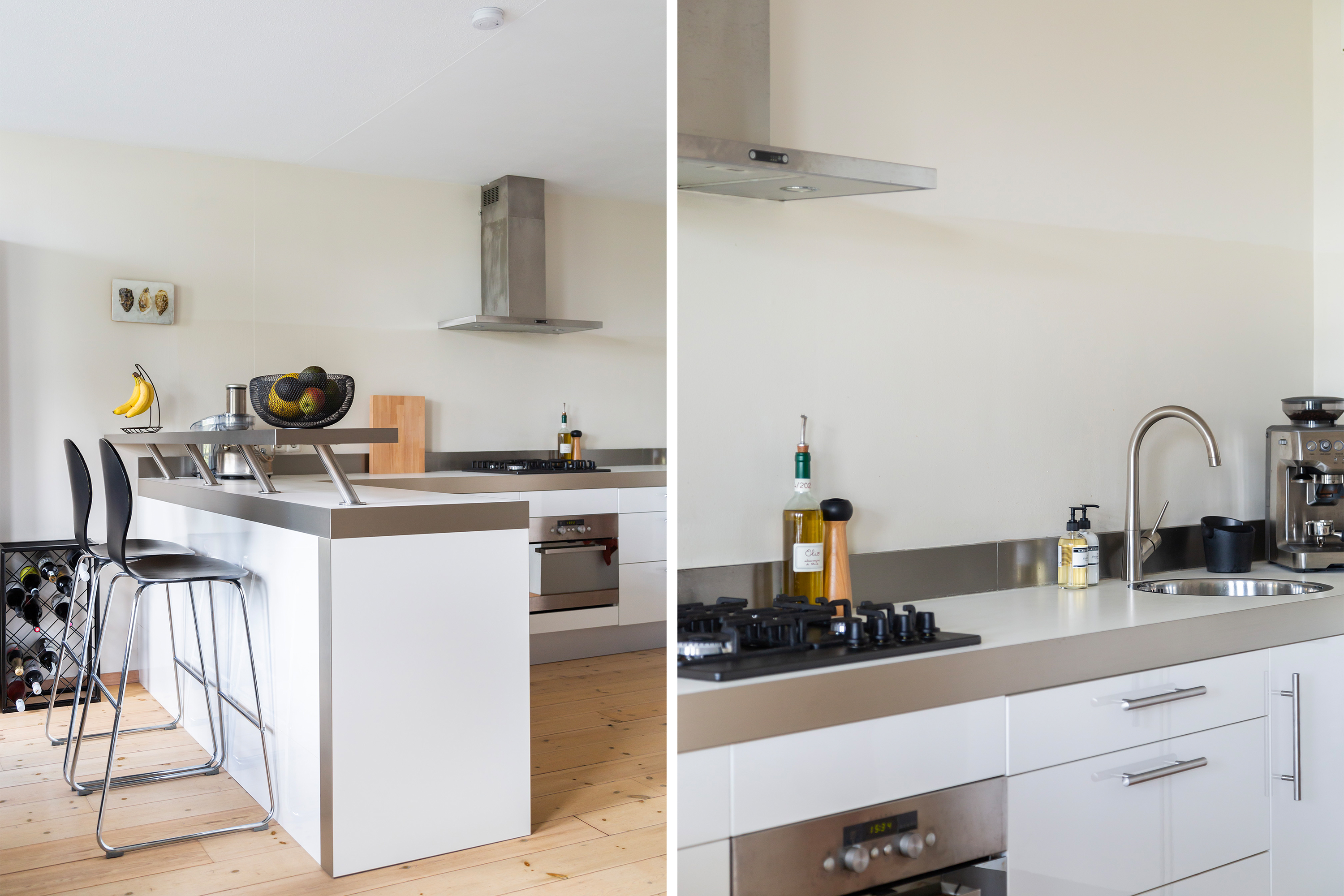 Vanuit de ruim opgezette hal is onder andere het fijne leefgedeelte bereikbaar. De praktische open indeling en de raampartijen over de gehele breedte creëren een lichte leefruimte met een heerlijk ruimtelijk gevoel met uitzicht op de iconische Hefbrug. Elke dag weer een feestje om hier thuis te komen! De mooie houten vloer en de stijlvolle keuken zorgen voor een warme sfeer met een moderne touch. De keuken vormt met de bar een gezellige verbinding met de woonkamer. Perfect om tijdens het koken in contact te blijven met je gezelschap! Verder is de keuken voorzien van een 4-pits gasfornuis (vervangen in 2018), afzuigkap, combi-oven, koel- en vriescombinatie, vaatwasser (Bosch 2022) en extra veel opbergruimte.