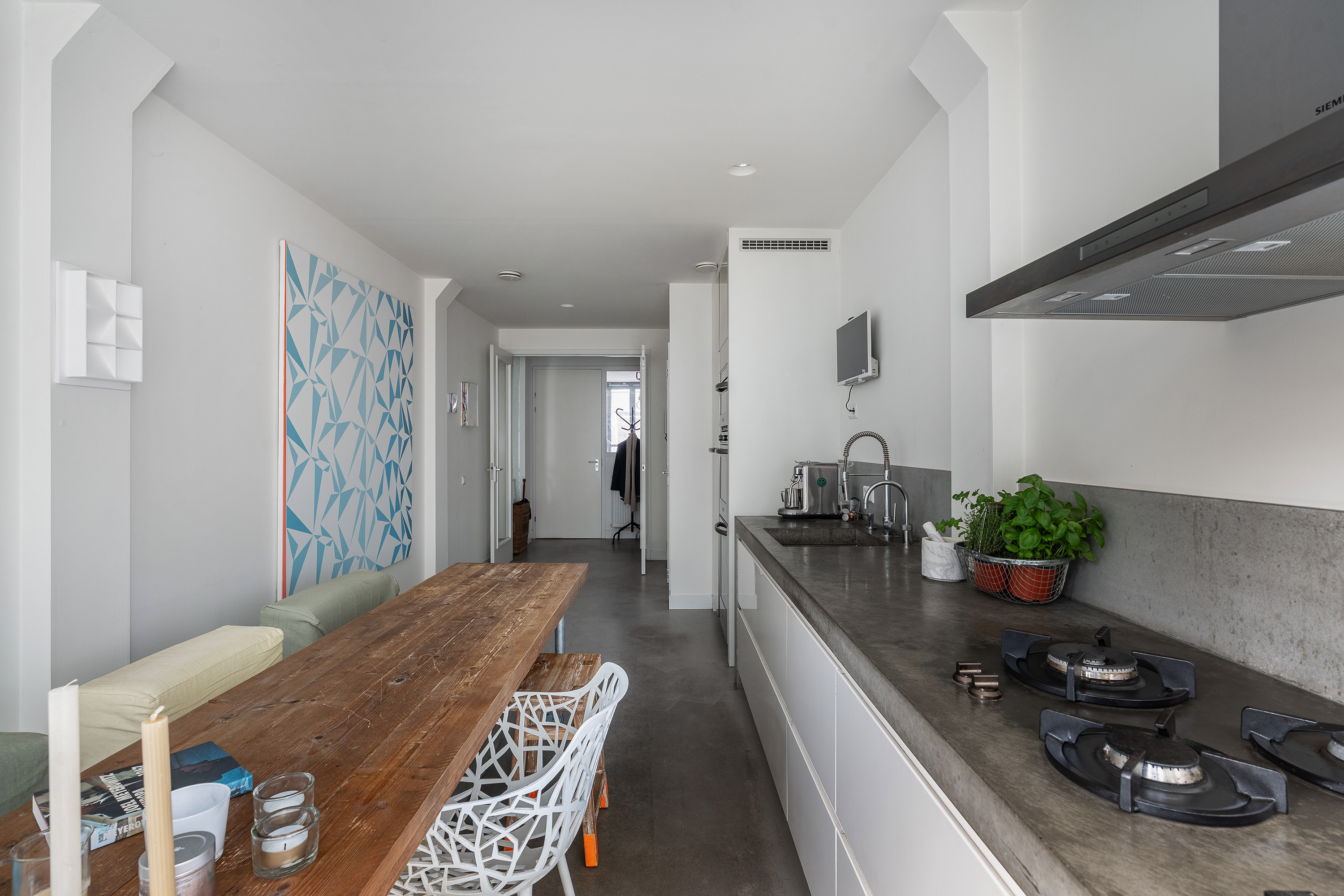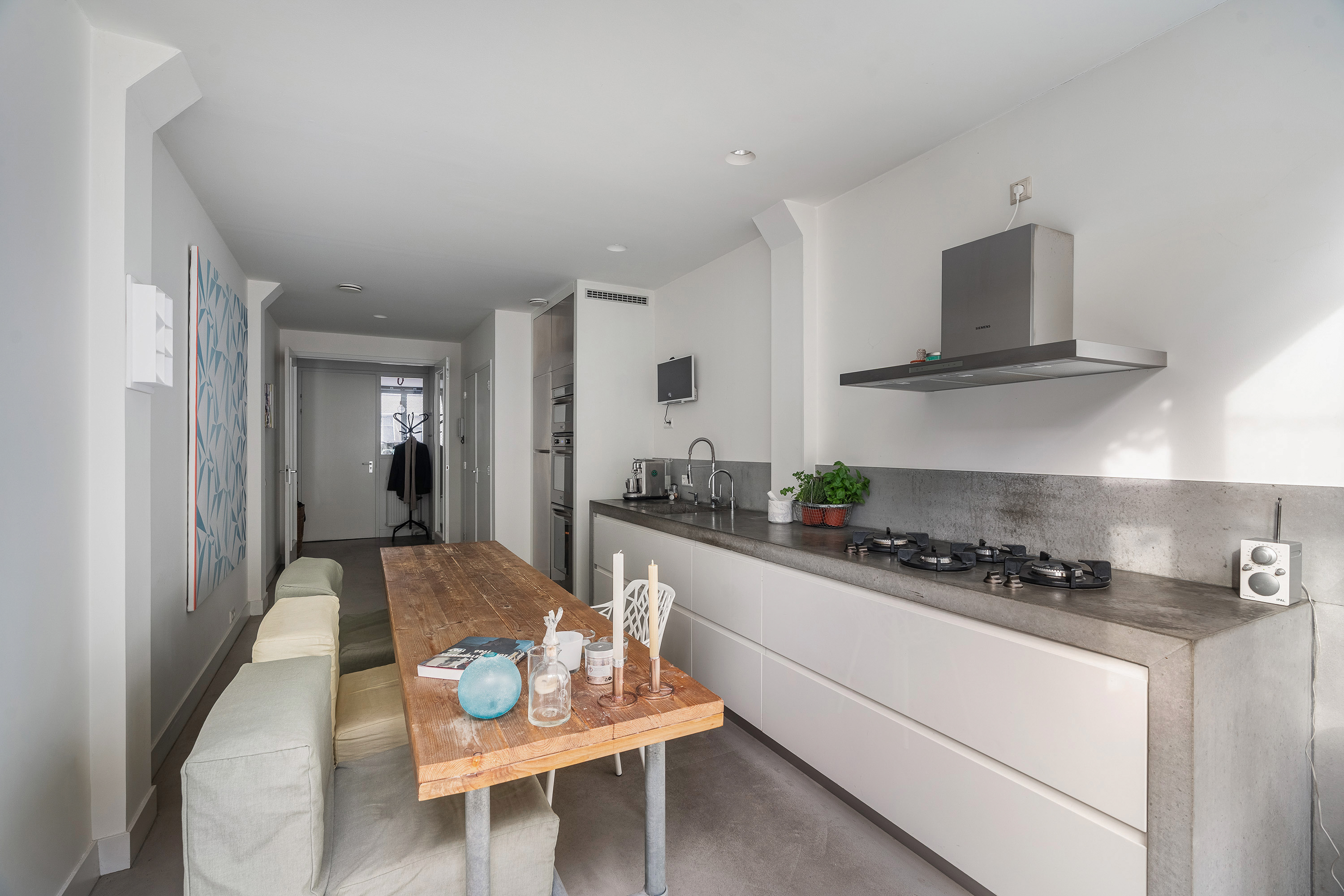 Zodra je thuiskomt, rijd je moeiteloos je eigen garage in, uitgerust met een automatische deur. Zo parkeer je je auto altijd comfortabel en beveiligd. Ideaal! Hier bevindt zich ook de meterkast. Vanuit de garage loop je door naar de entree, waar openslaande deuren toegang geven tot de woonkeuken. De stoere gietvloer en strakke afwerking geven de ruimte een moderne uitstraling, terwijl de open keuken met betonlook perfect bij deze stijl past. De keuken is volledig uitgerust met een 4-pits gasfornuis, afzuigkap, oven, magnetron, wijnkoelkast, vaatwasser, Quooker en koelkast. Hier kun je heerlijk koken terwijl je toch in contact blijft met je gezelschap. De perfecte plek voor gezellig samenzijn! Daarnaast is er een vaste kast met een aansluiting voor de wasmachine.