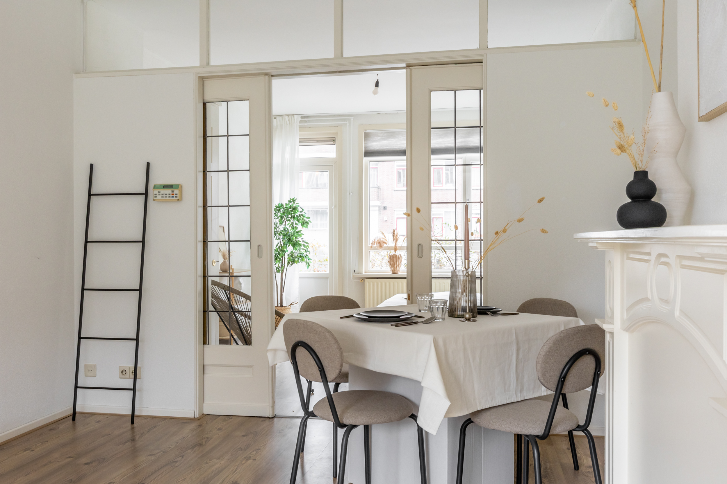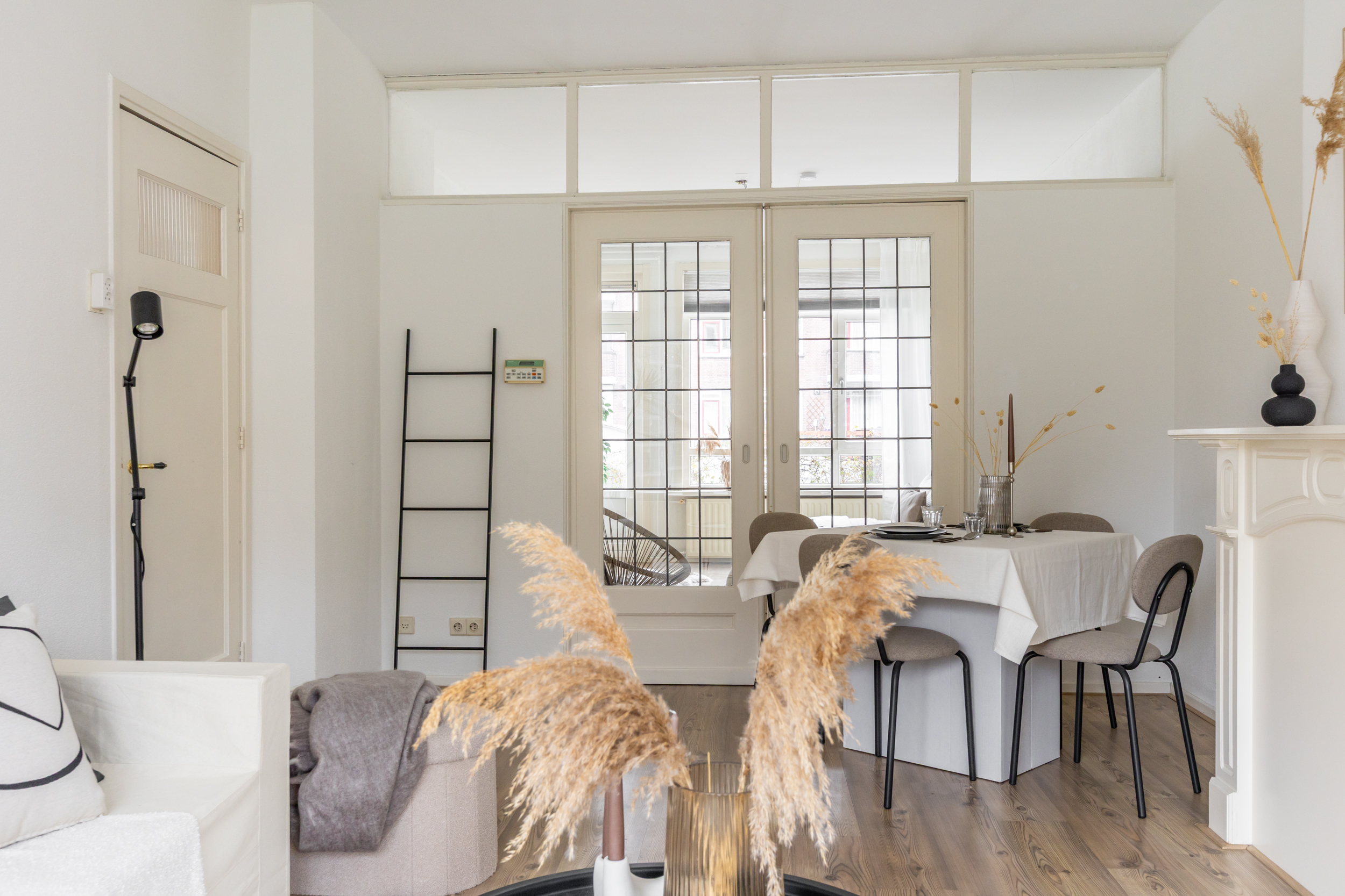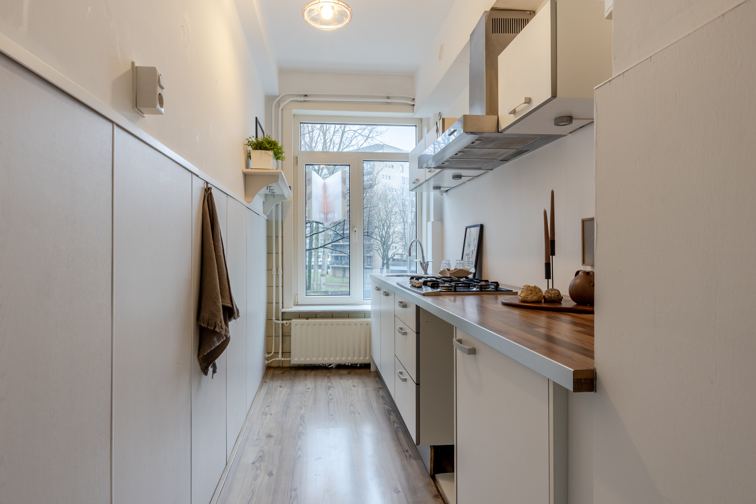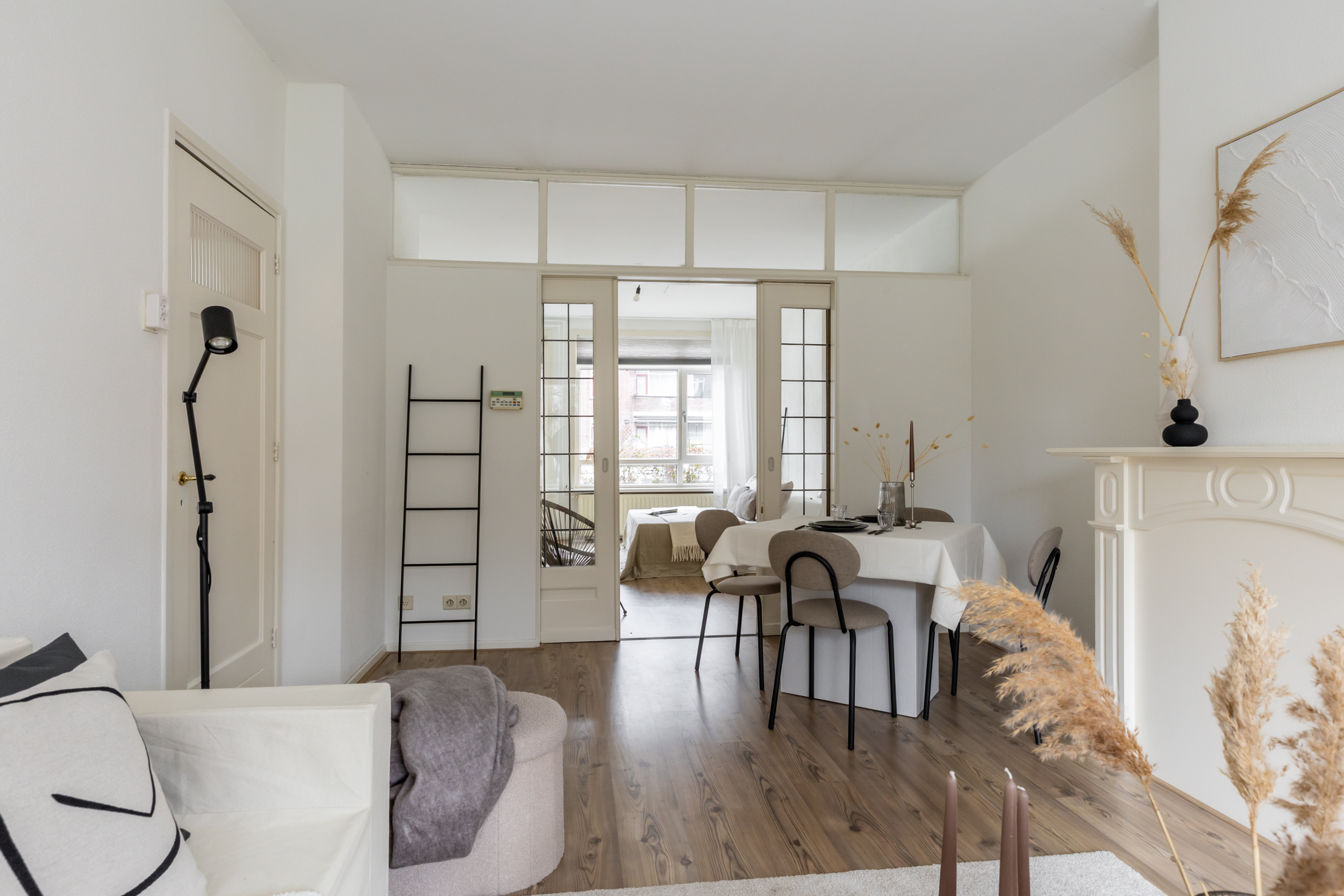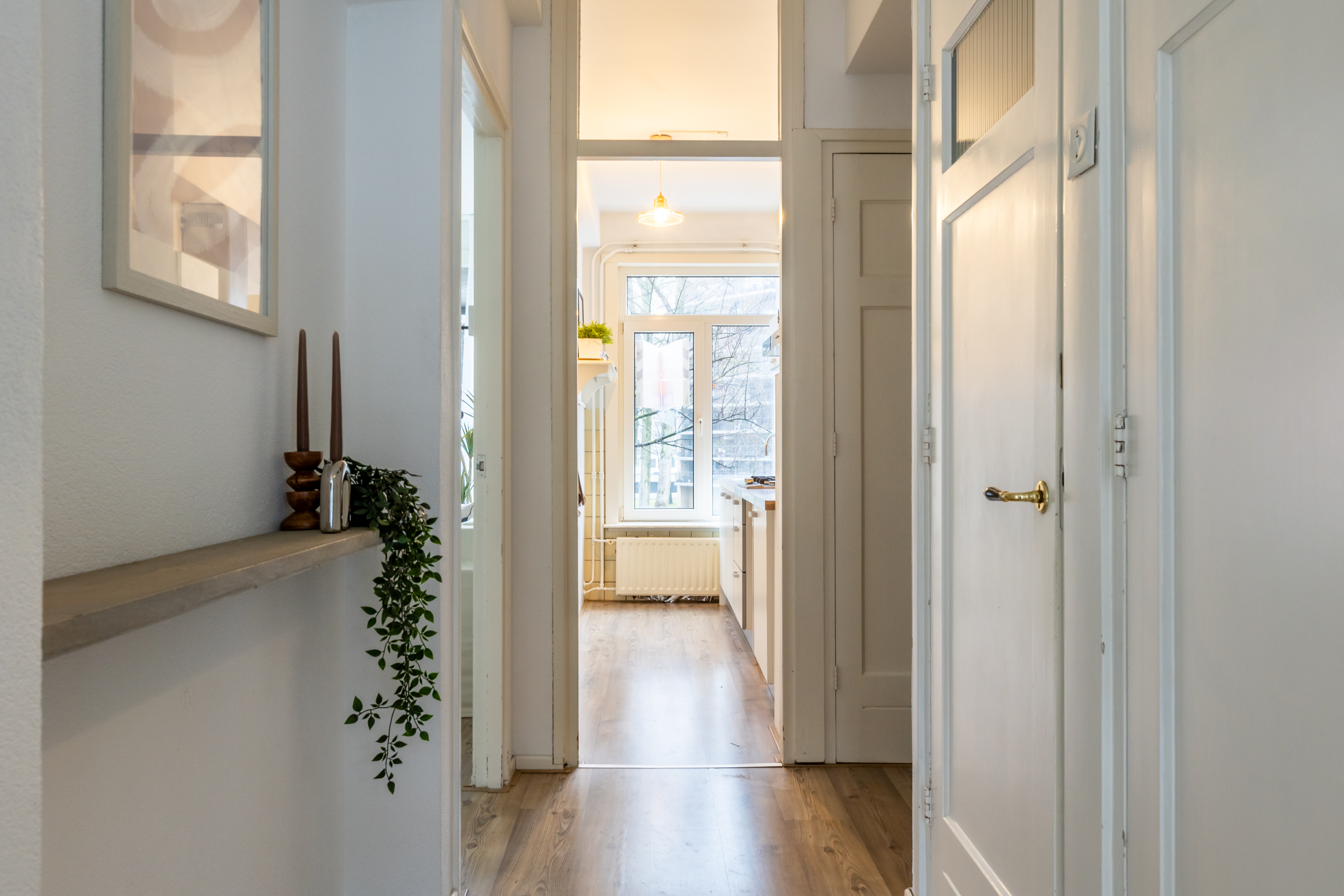 Binnenkomst in de entree met toegang tot de verschillende vertrekken. De leefruimte strekt zich uit over de volledige lengte van de woning, waardoor er een bijzonder ruimtelijk en licht gevoel ontstaat. Dit wordt prachtig aangevuld met de charme van authentieke details, zoals de en suite deuren met glas-in-lood, de elegante schouw en de verfijnde plafondornamenten. Een karaktervolle ruimte waar het heerlijk thuiskomen is! De functionele indeling maakt het eenvoudig om de ruimte naar wens te verdelen in een zit- en eetgedeelte. Extra fijn: er is zelfs ruimte om een extra slaapkamer te realiseren! Aan de voorzijde is de afgesloten keuken gesitueerd en deze beschikt over van een 4-pits gasfornuis, afzuigkap, koelkast, vriezer, vaatwasser en een aansluiting voor de wasmachine. Tevens is de cv-opstelling hier gevestigd.