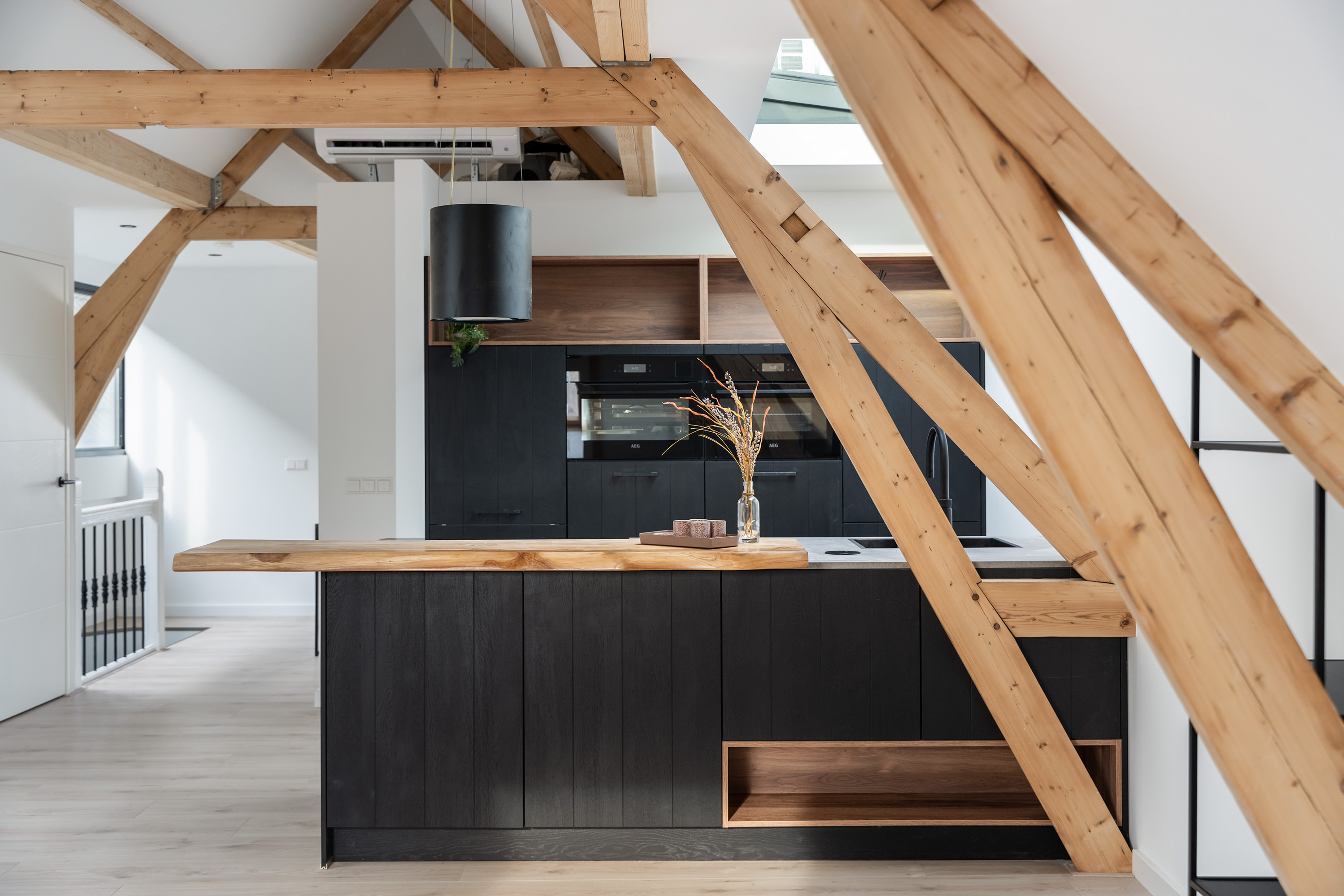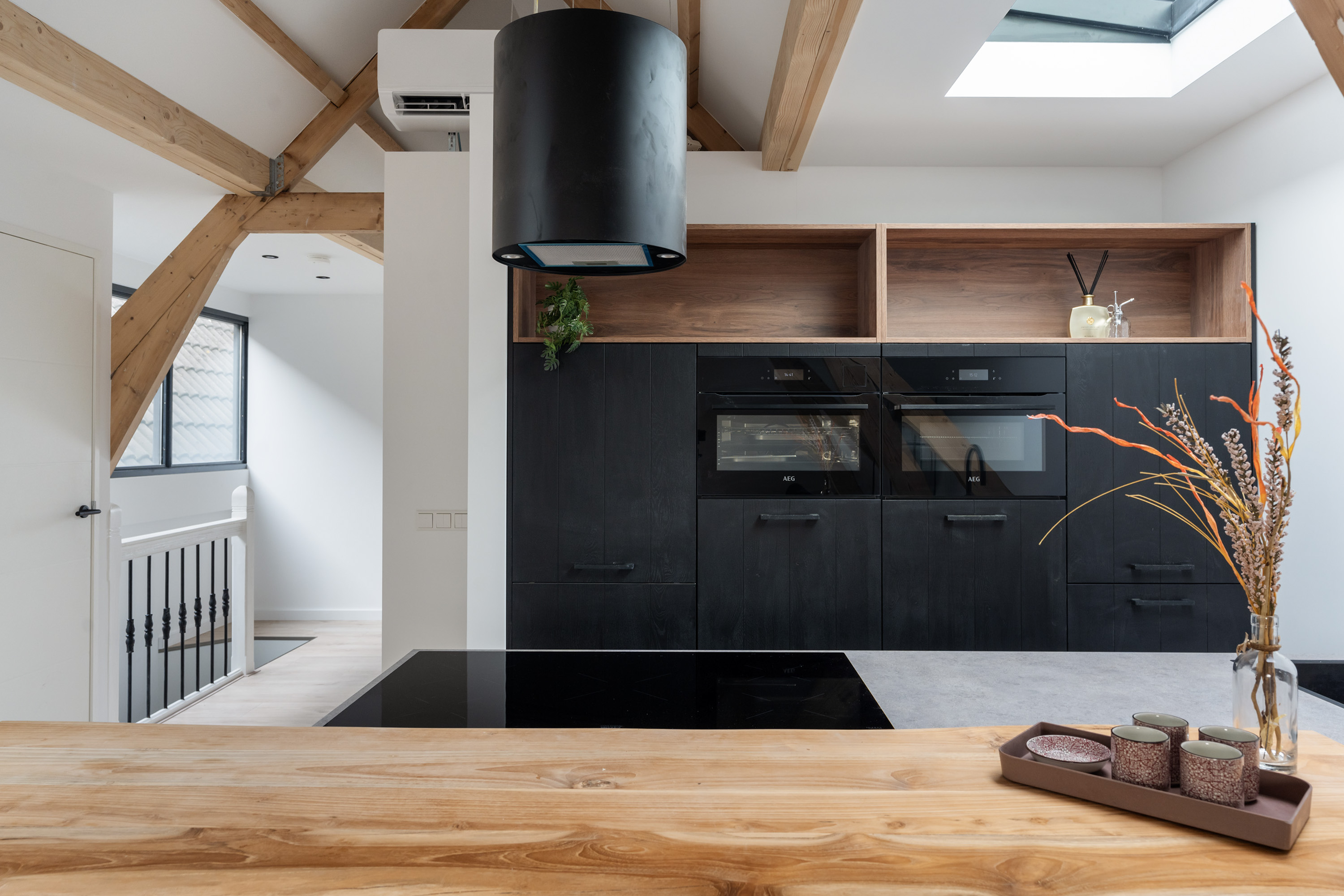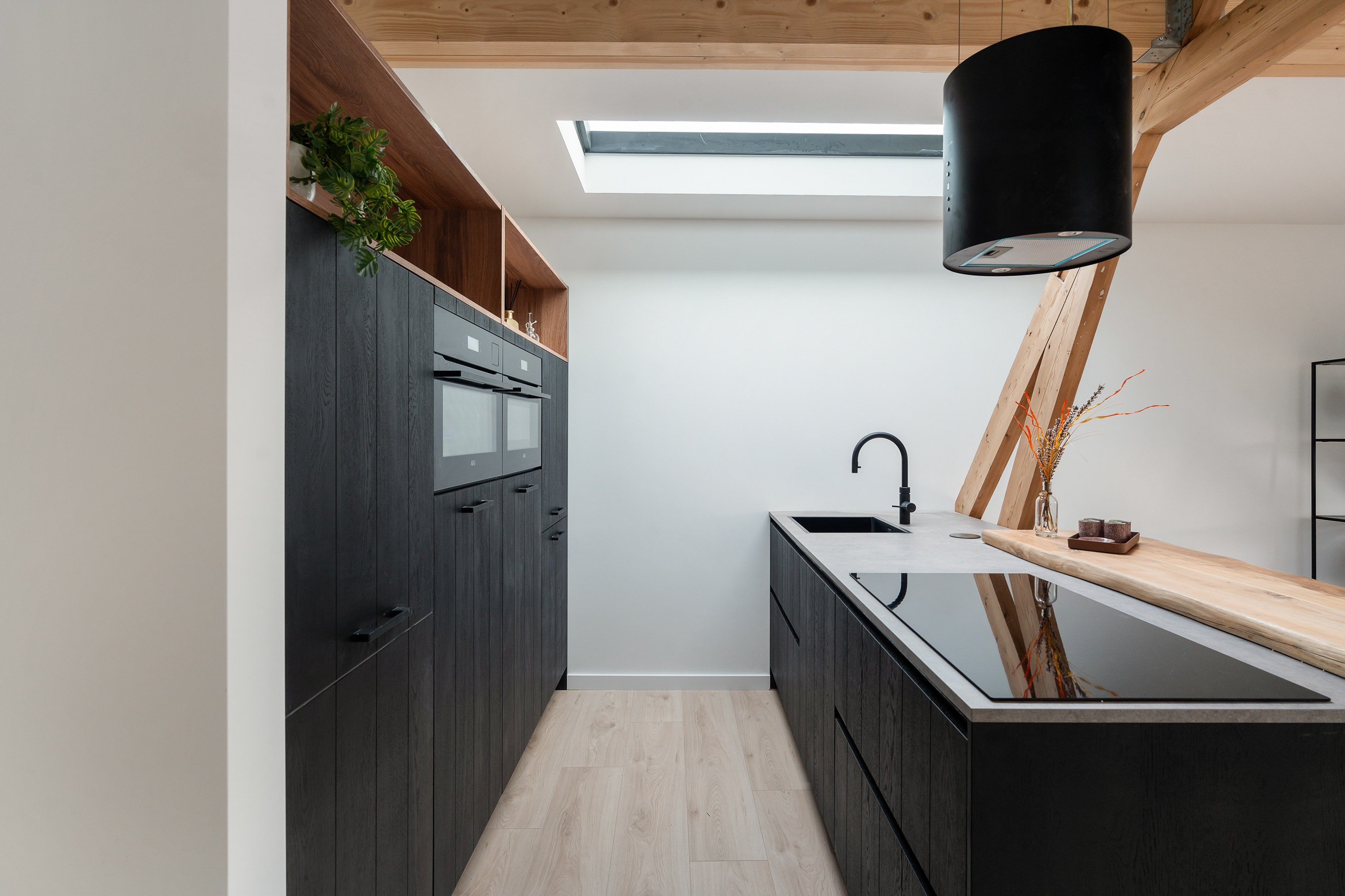 Via de open entree loop je direct het leefgedeelte binnen, dat aan de voorzijde is gelegen. De woning is met oog voor detail en gevoel voor stijl hoogwaardig gerenoveerd in 2025. Het resultaat is een warm en comfortabel geheel waarin alles klopt. Extra karakter wordt toegevoegd door de sfeervolle houten balken die in het zicht zijn gebleven; een prachtig detail dat extra charme uitstraalt! Dankzij de meerdere lichtstraten geniet de woning van een fijne lichtinval. De open keuken vormt het hart van de ruimte en is een echte blikvanger! Hier is werkelijk aan alles gedacht: de keuken beschikt over een inductiekookplaat, een moderne stijlvolle afzuigkap, koelkast, dubbele oven, vaatwasser en direct kokend water, aangevuld met enorm veel opbergruimte. Daarnaast zijn er drie vaste kasten aanwezig die zijn onderverdeeld in de meterkast, boiler en een aansluiting voor de wasmachine- en droger.