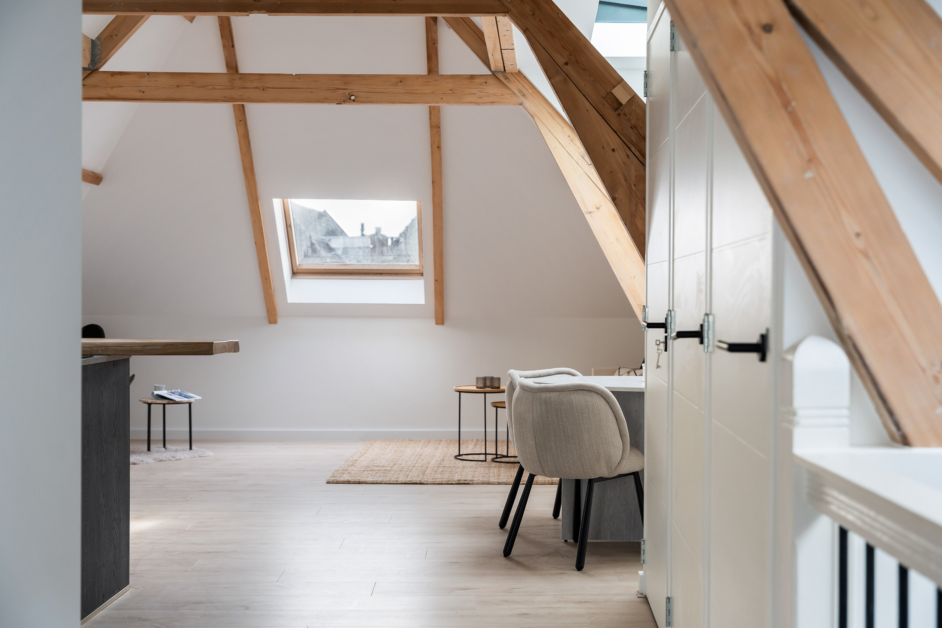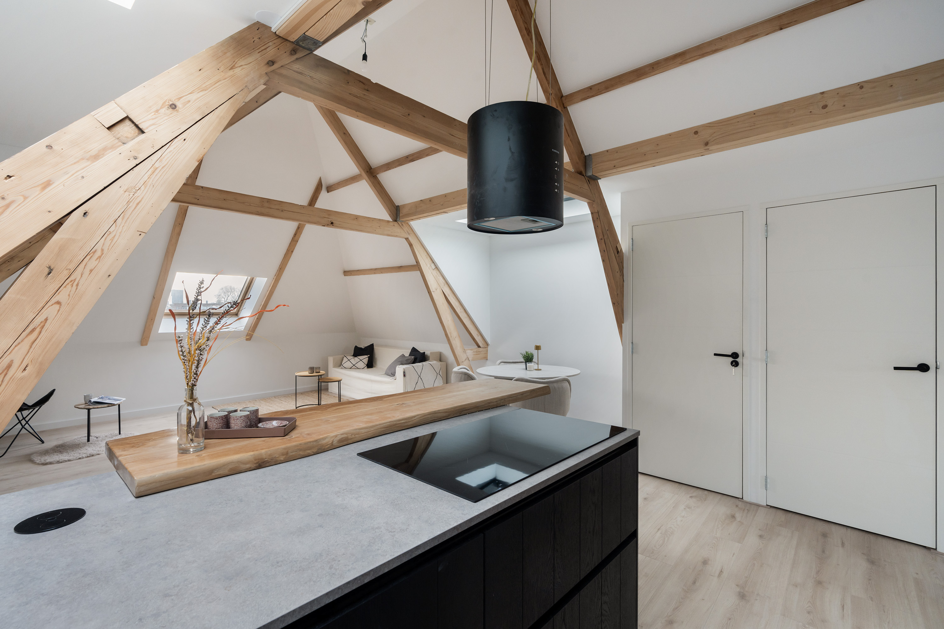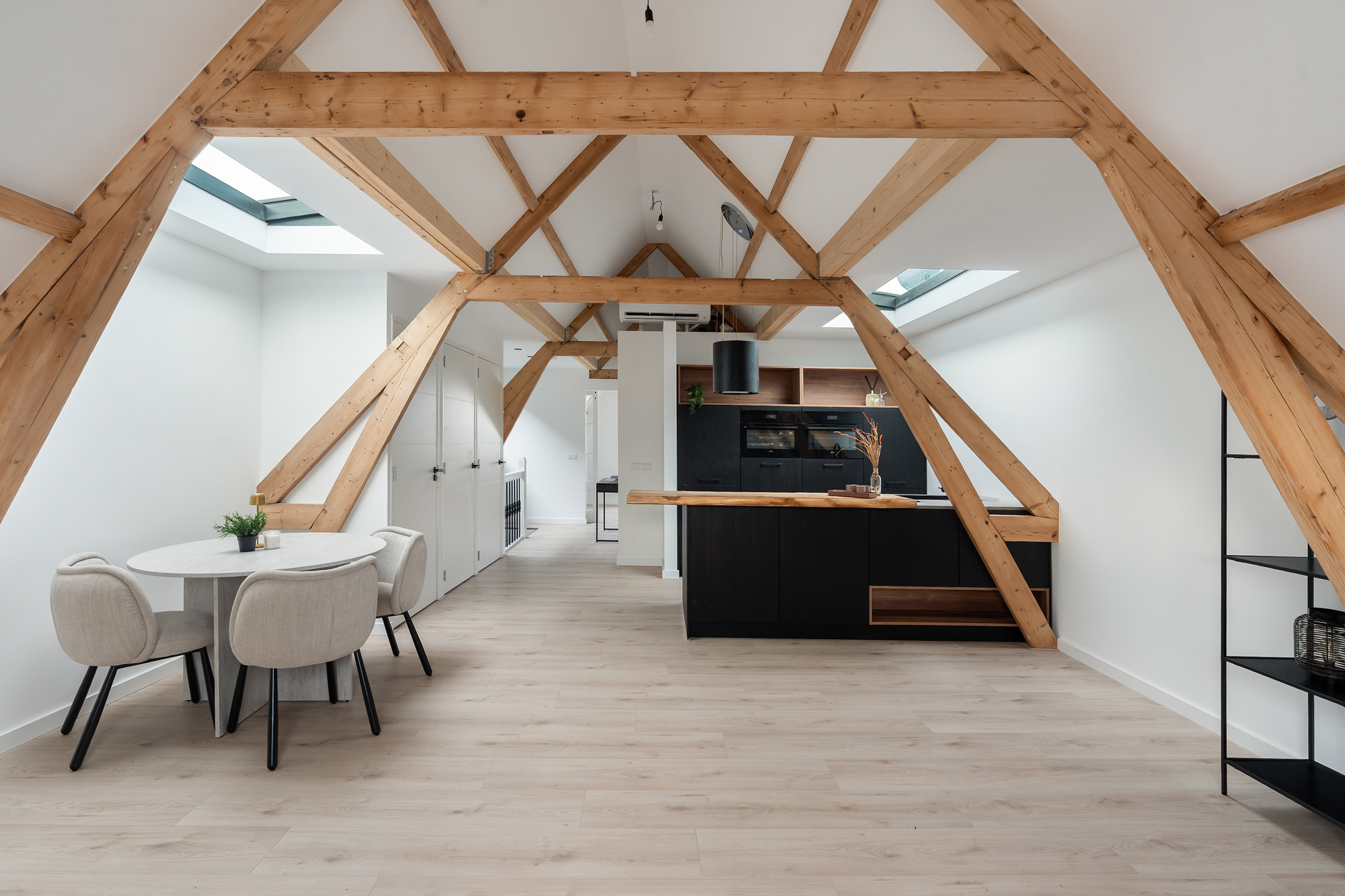 Via de open entree loop je direct het leefgedeelte binnen, dat aan de voorzijde is gelegen. De woning is met oog voor detail en gevoel voor stijl hoogwaardig gerenoveerd in 2025. Het resultaat is een warm en comfortabel geheel waarin alles klopt. Extra karakter wordt toegevoegd door de sfeervolle houten balken die in het zicht zijn gebleven; een prachtig detail dat extra charme uitstraalt! Dankzij de meerdere lichtstraten geniet de woning van een fijne lichtinval. De open keuken vormt het hart van de ruimte en is een echte blikvanger! Hier is werkelijk aan alles gedacht: de keuken beschikt over een inductiekookplaat, een moderne stijlvolle afzuigkap, koelkast, dubbele oven, vaatwasser en direct kokend water, aangevuld met enorm veel opbergruimte. Daarnaast zijn er drie vaste kasten aanwezig die zijn onderverdeeld in de meterkast, boiler en een aansluiting voor de wasmachine- en droger.