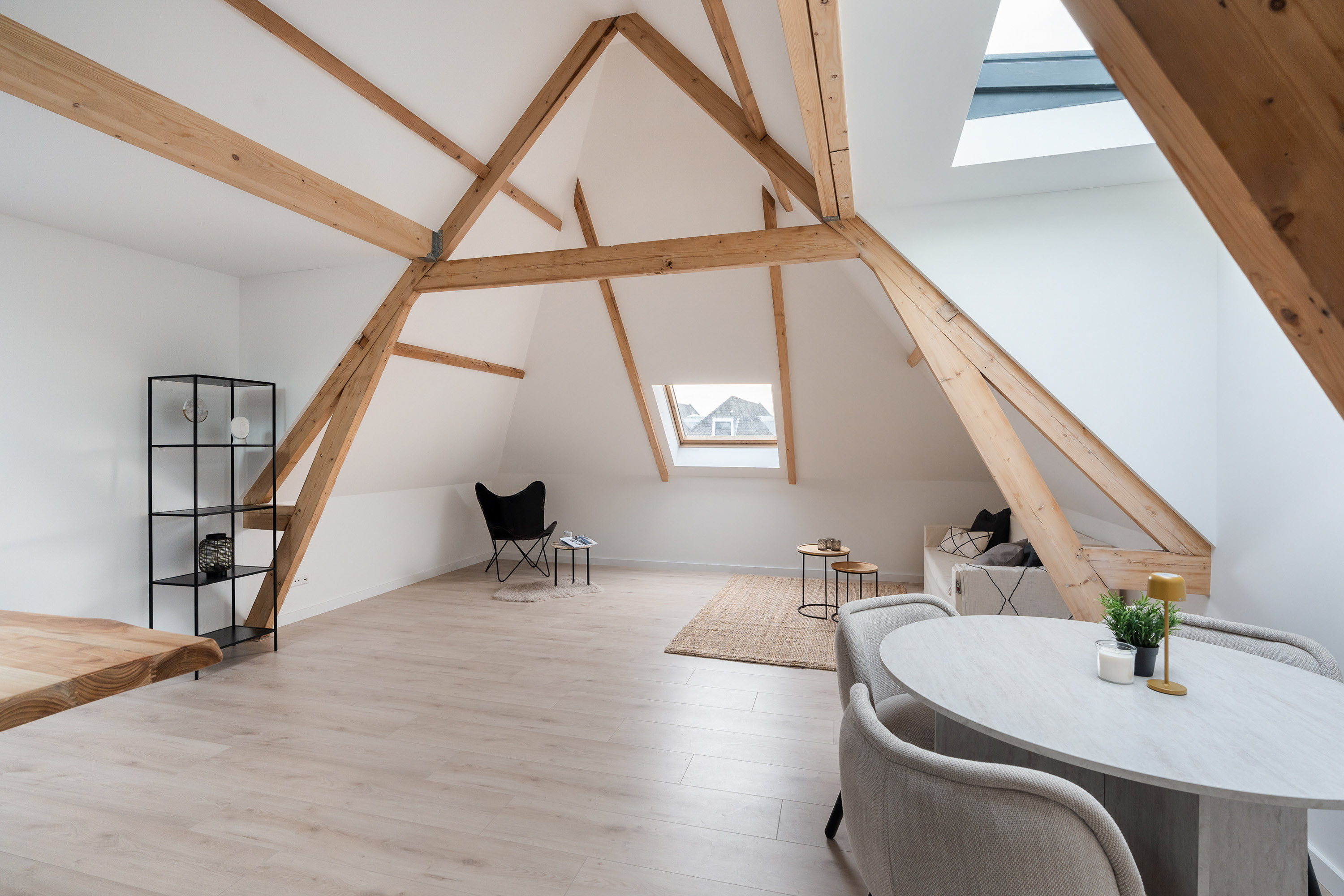 Turn-key, gasloos en stijlvol wonen op een topetage! Dit hoogwaardige 2-kamer appartement combineert modern comfort met karaktervolle details zoals zichtbare houten balken en meerdere lichtstraten. De afwerking is premium en turn-key: strak stucwerk, een warme laminaatvloer en beschikt over een luxe badkamer die aanvoelt als boutique-wellness. Het appartement is volledig gasloos, uitstekend geïsoleerd en voorzien van airco’s, wat resulteert in lage maandelijkse lasten en een toekomstbestendige manier van wonen. Kartaker en comfort op hoog niveau!