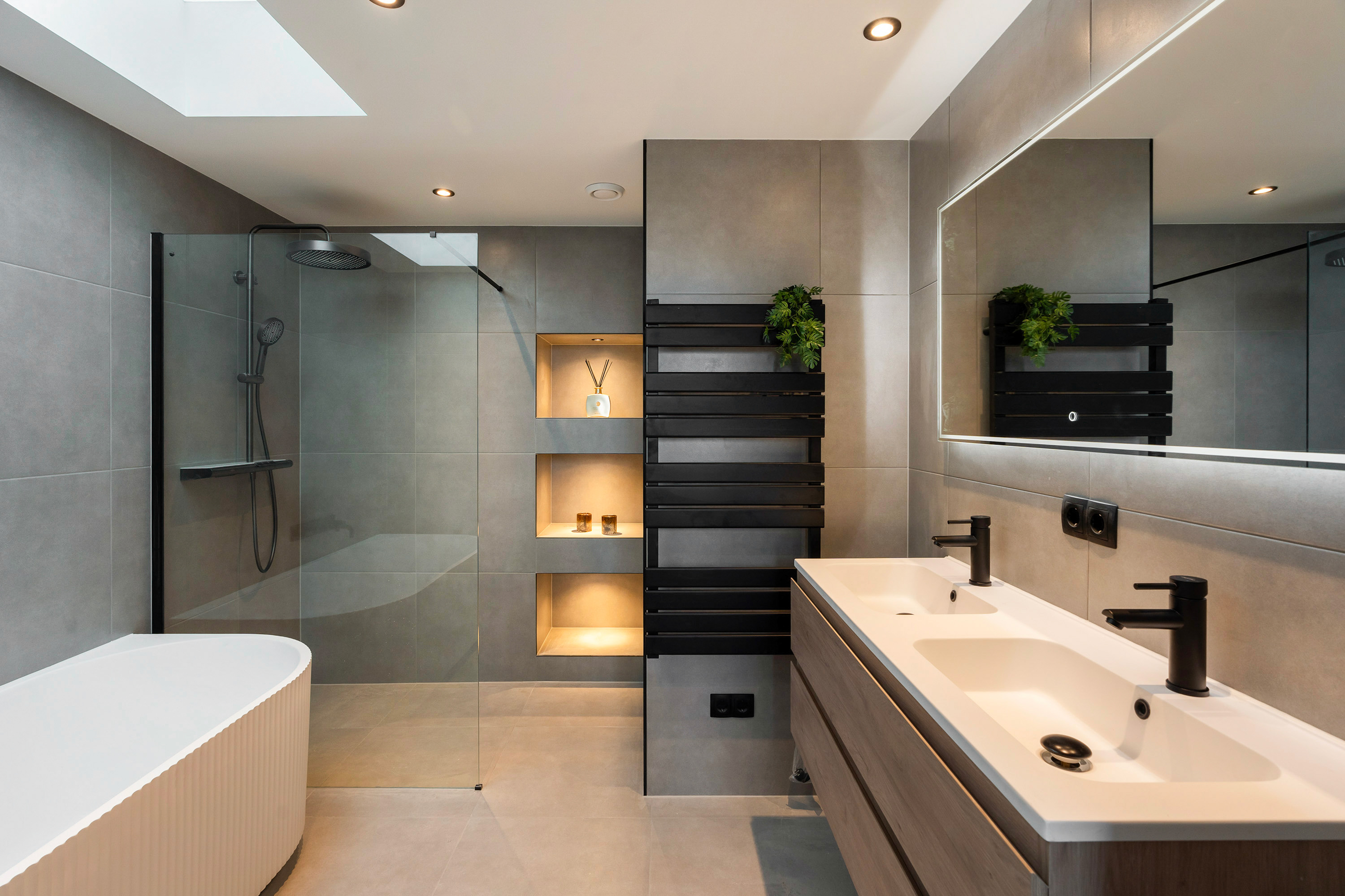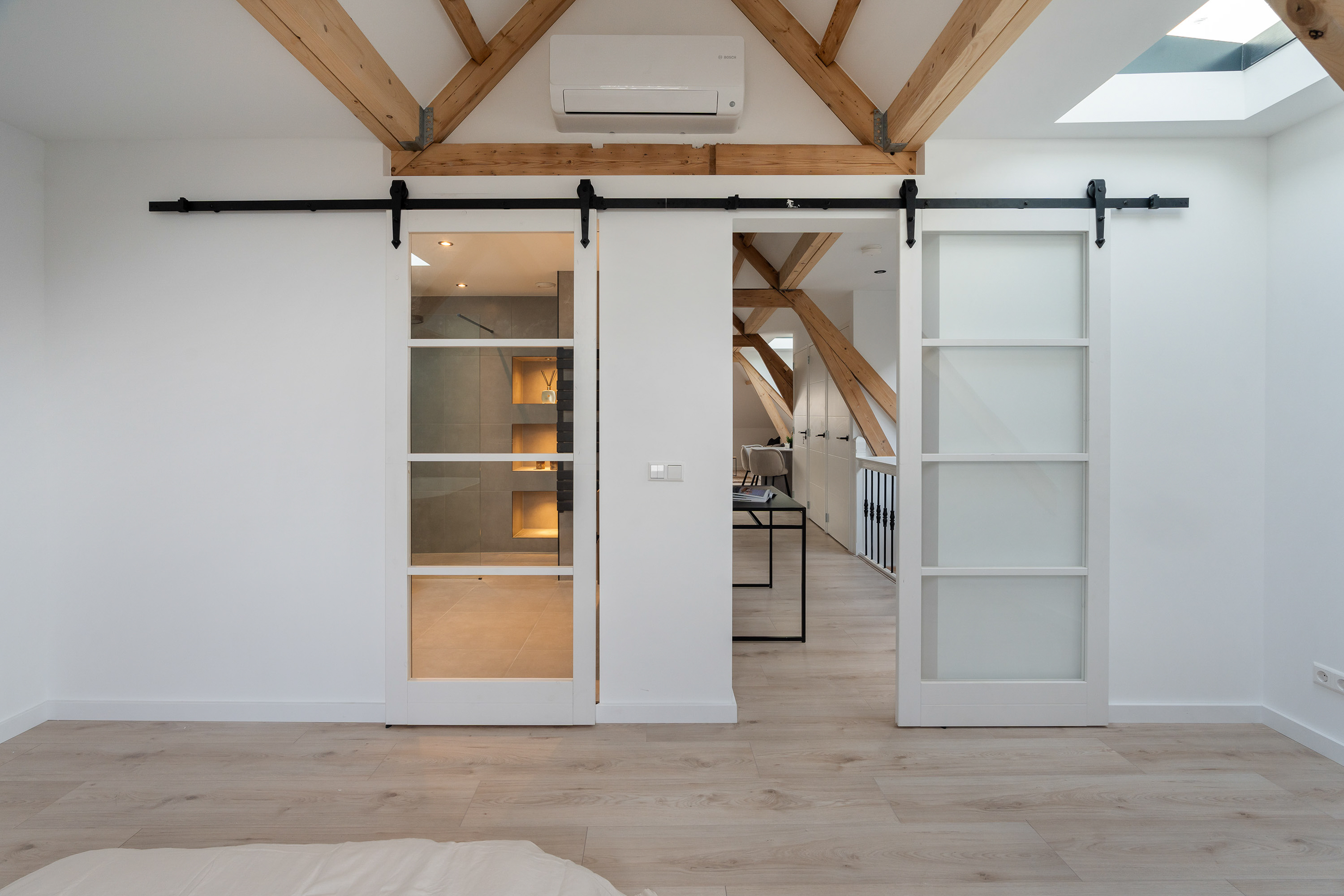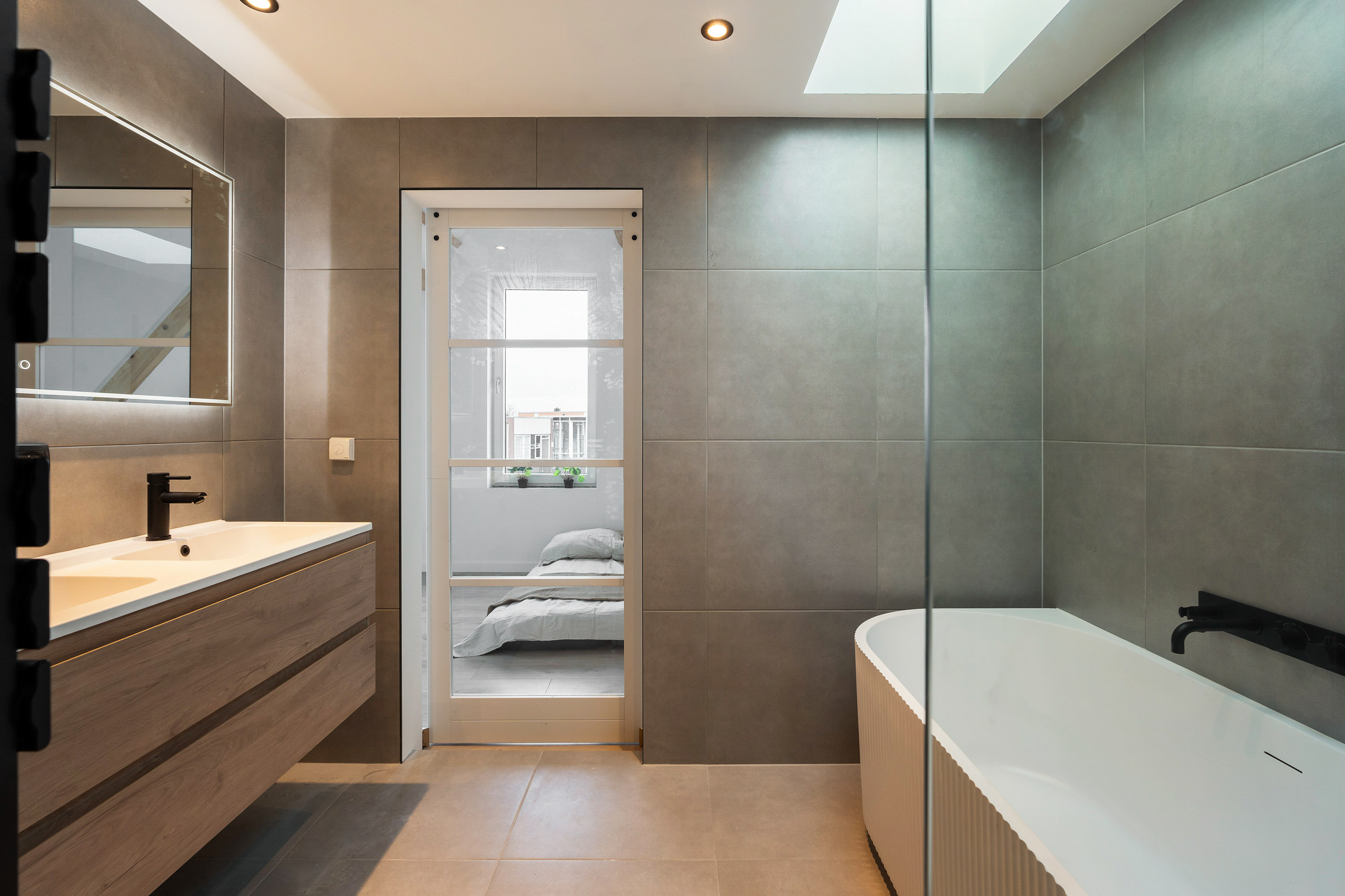 Aan de andere zijde bevindt zich de slaapkamer met dakraam en en-suite badkamer. De badkamer is werkelijk een plaatje voelt aan als een luxe wellnessruimte! Deze is uitgerust met een modern ligbad, inloopdouche met grote rainshower, dubbele wastafel met meubel, handdoekradiator en ingebouwde nissen met inbouwspots. Terug op de overloop is het separate toilet met fonteintje te vinden.