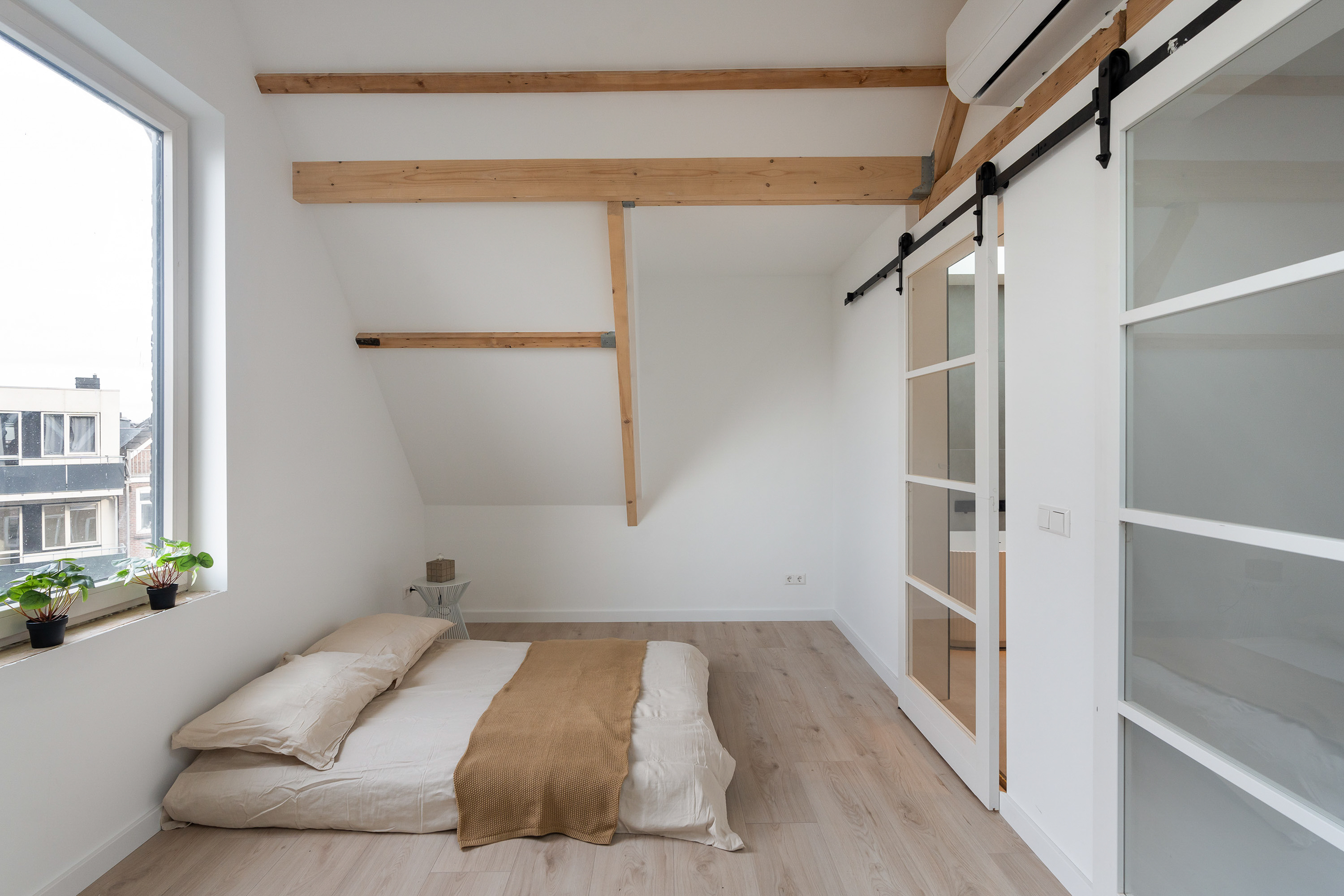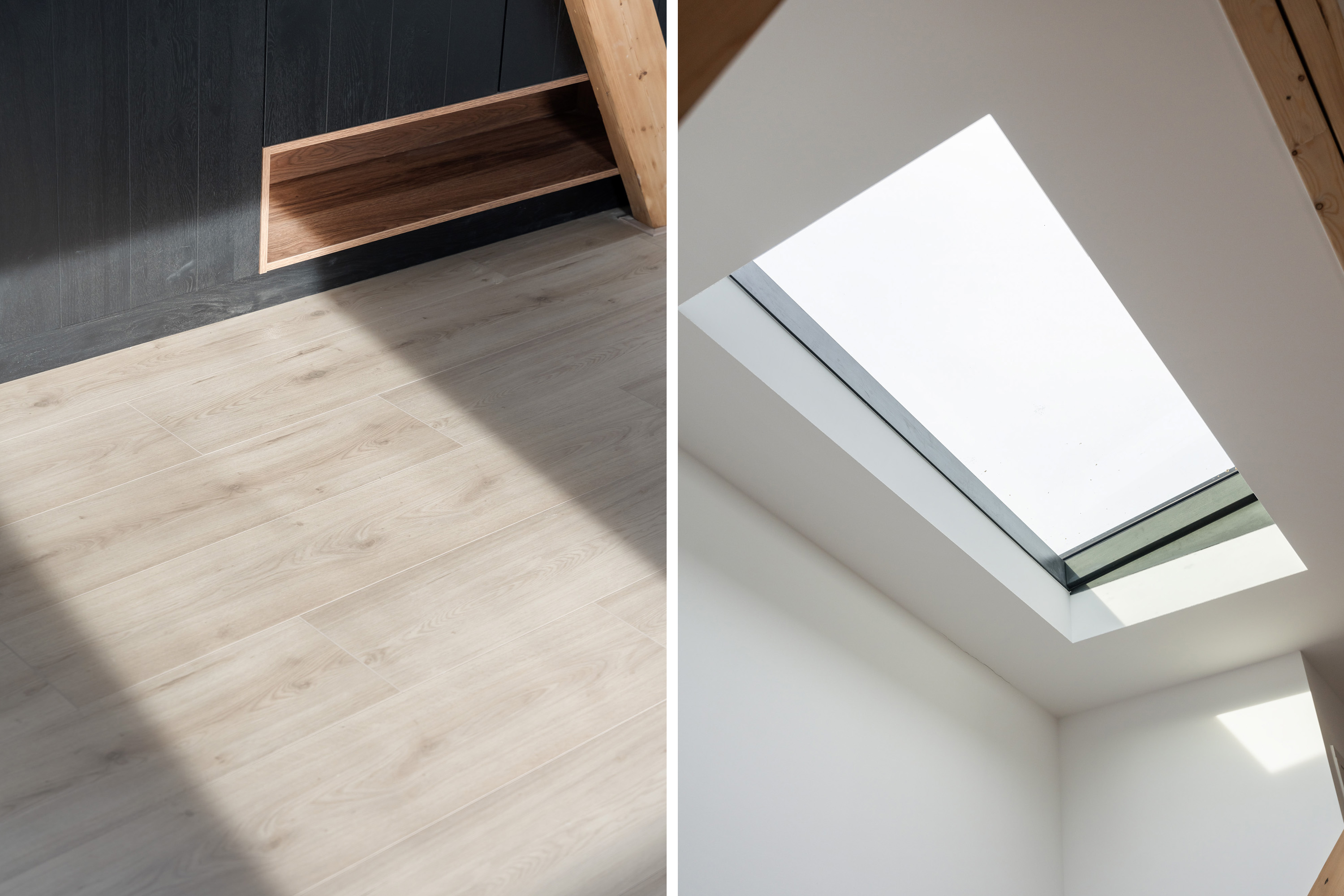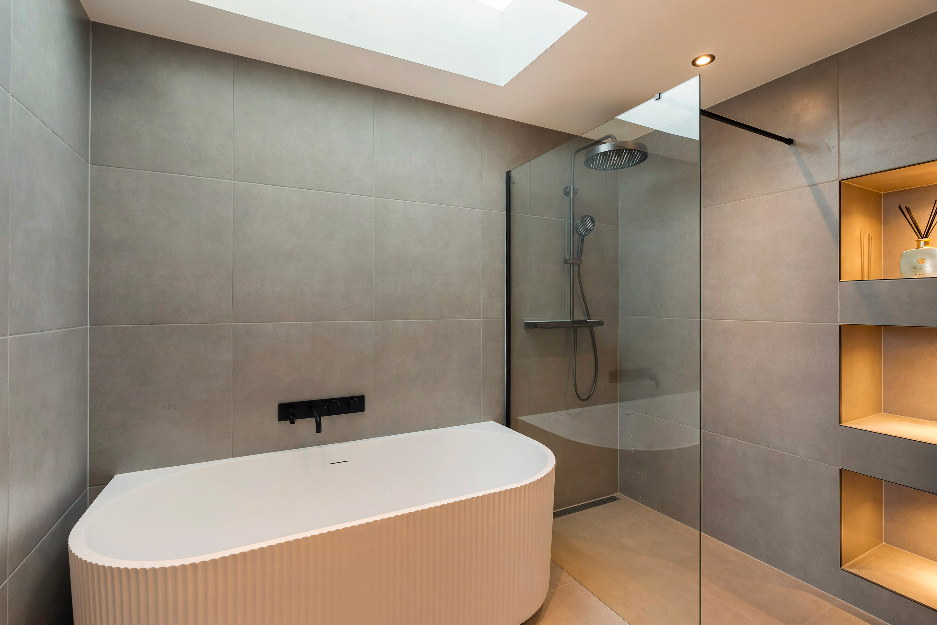Aan de andere zijde bevindt zich de slaapkamer met dakraam en en-suite badkamer. De badkamer is werkelijk een plaatje voelt aan als een luxe wellnessruimte! Deze is uitgerust met een modern ligbad, inloopdouche met grote rainshower, dubbele wastafel met meubel, handdoekradiator en ingebouwde nissen met inbouwspots. Terug op de overloop is het separate toilet met fonteintje te vinden.