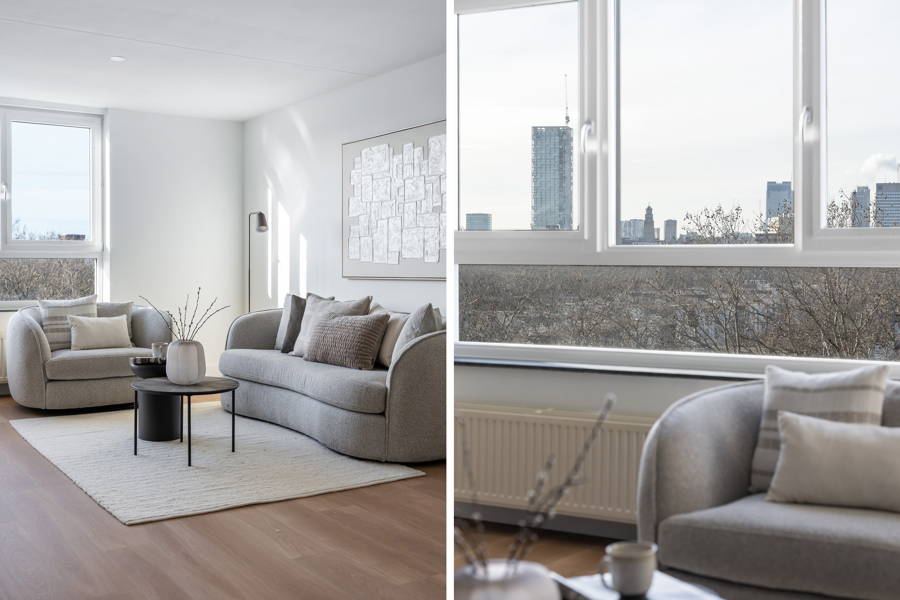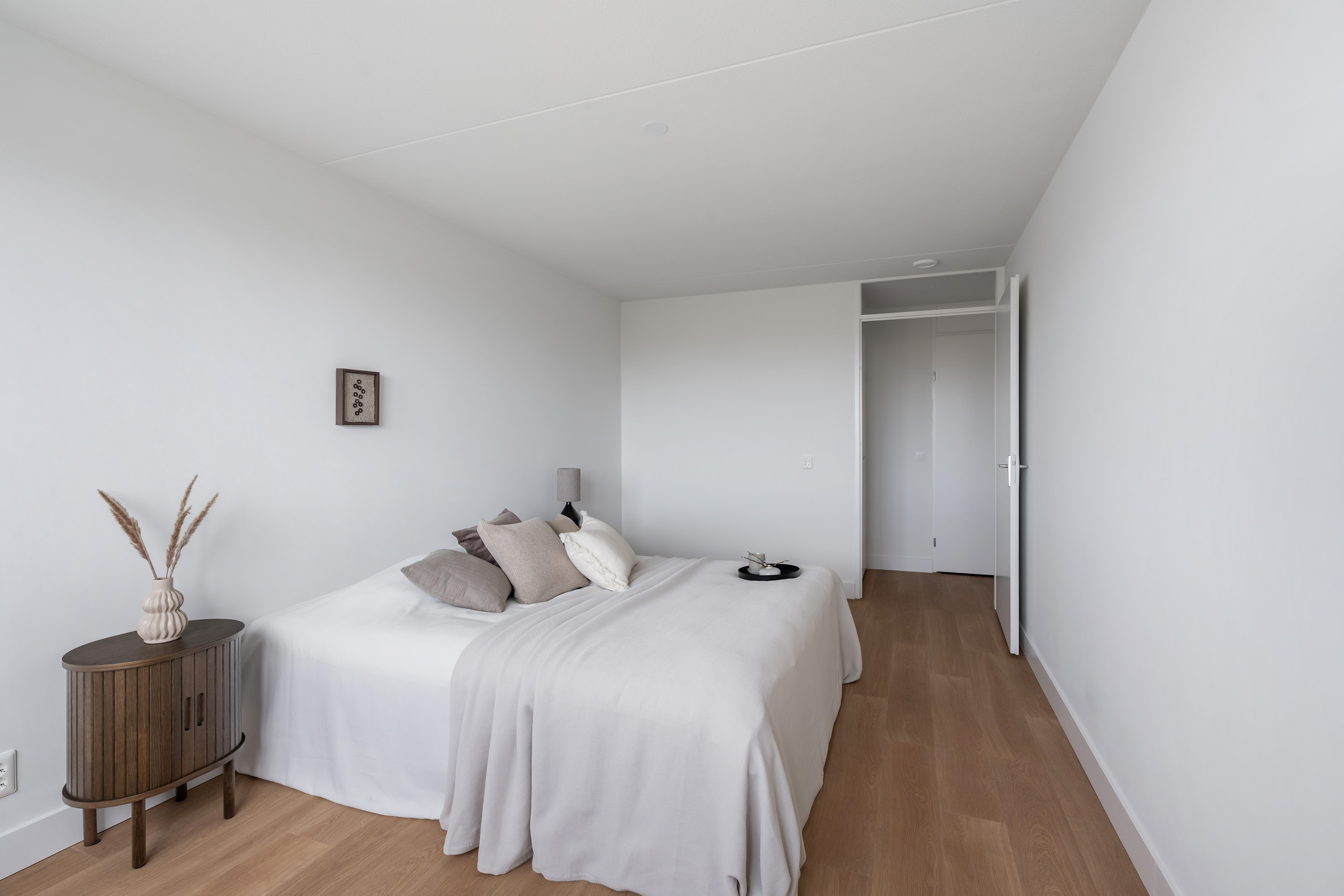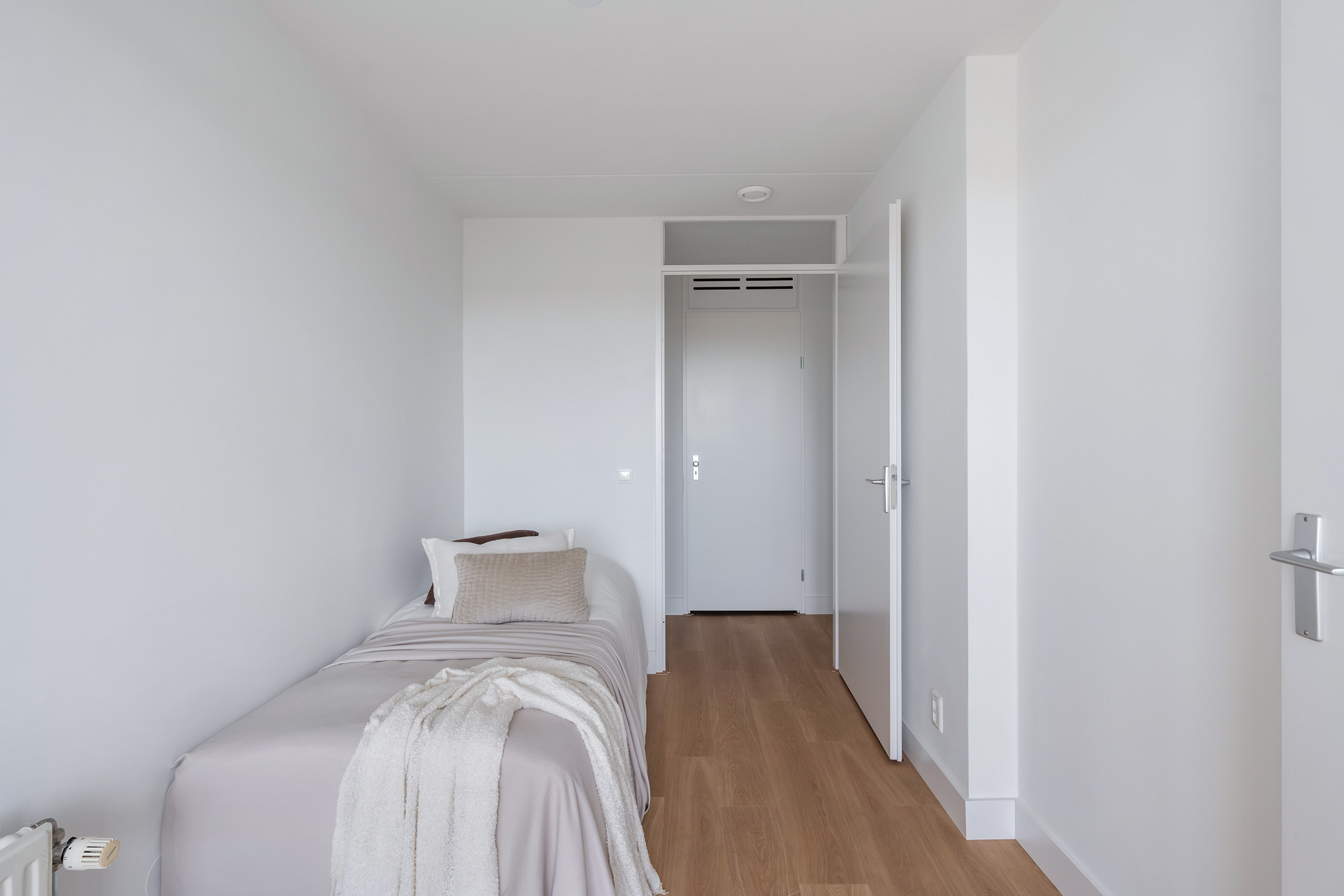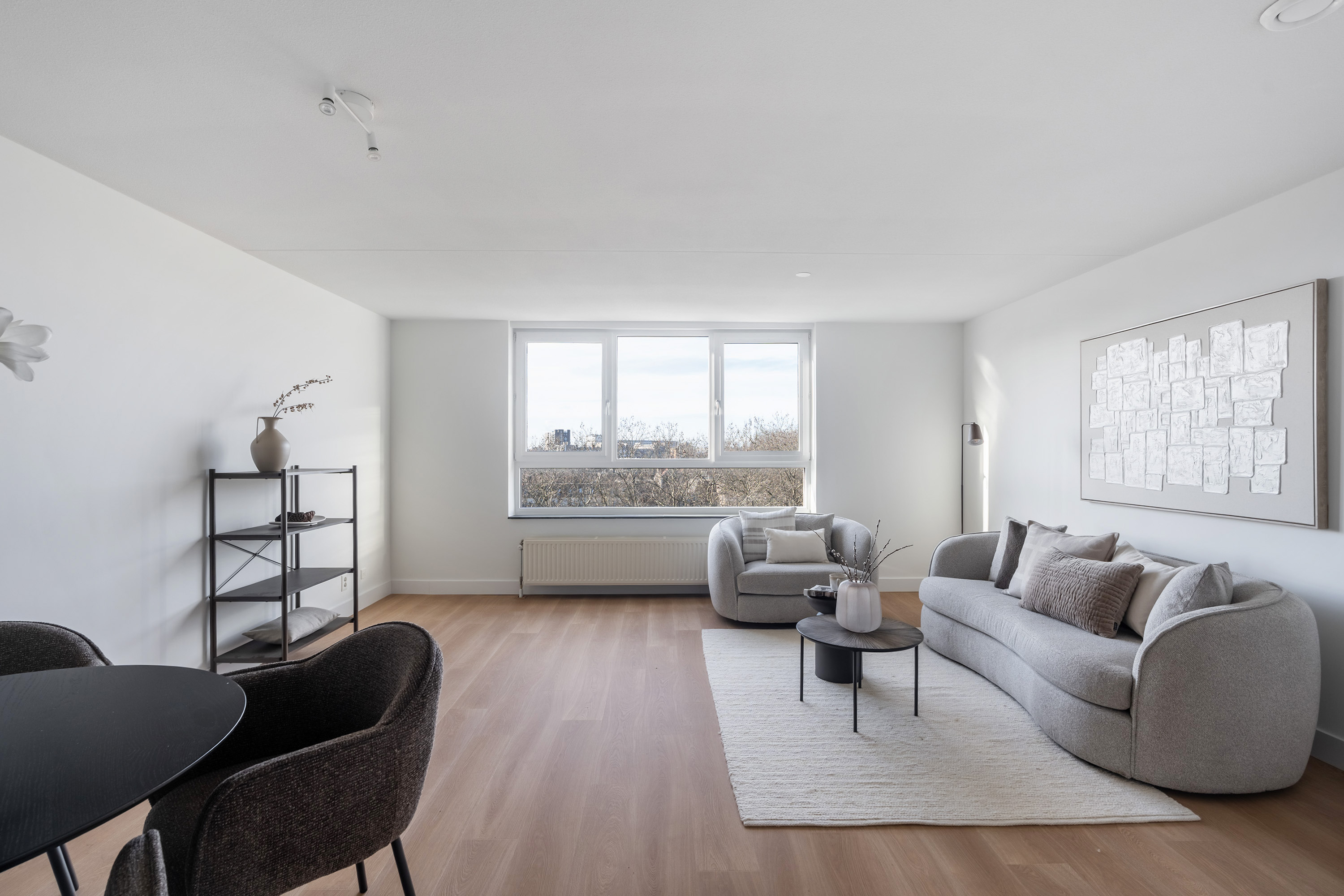 Aan deze zijde zijn ook twee prettige slaapkamers gesitueerd, waarvan er één directe toegang biedt tot de loggia met uitzicht op de skyline van Rotterdam. Hier geniet je in alle rust van het uitzicht, een zeldzaam rustige plek in de stad.
