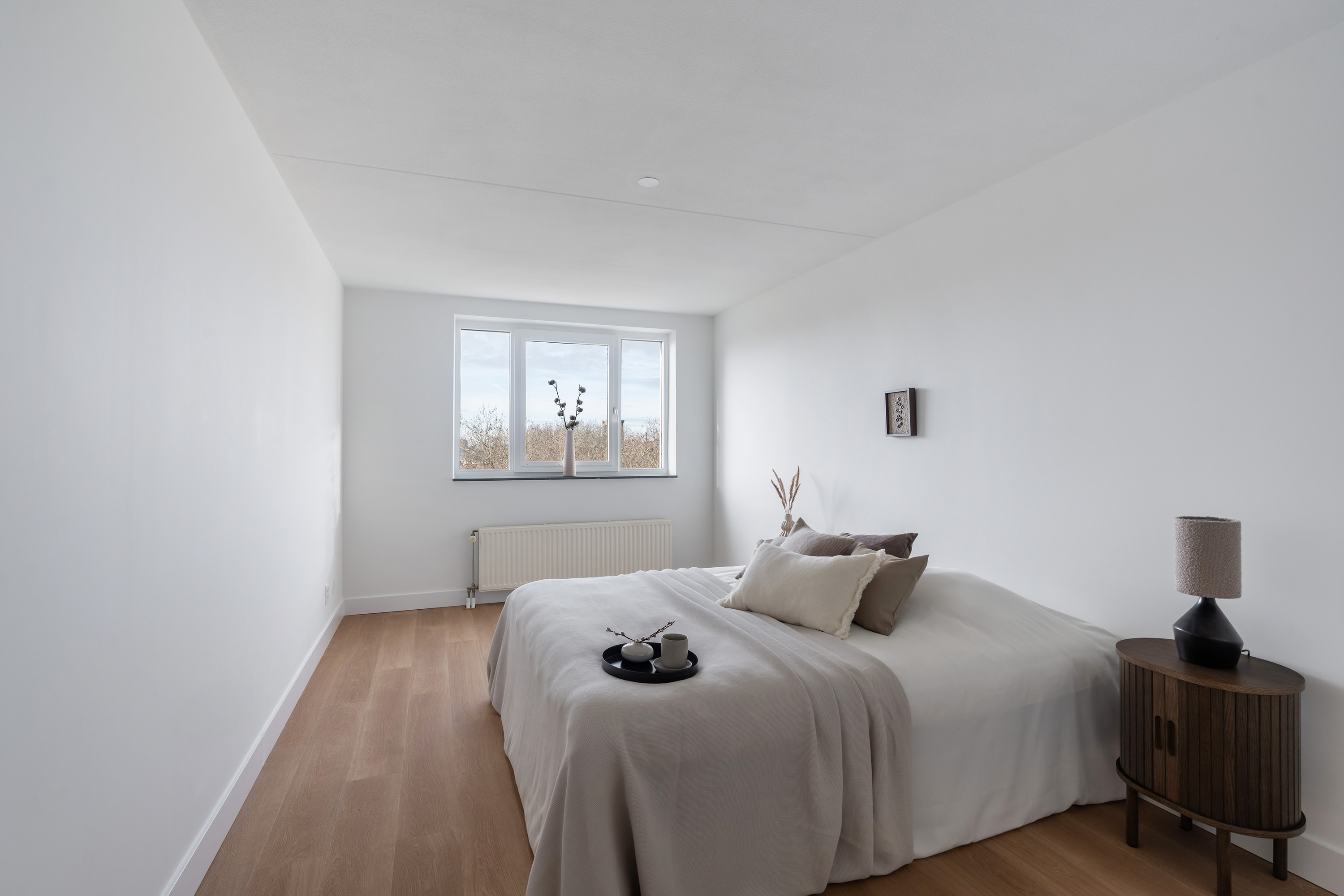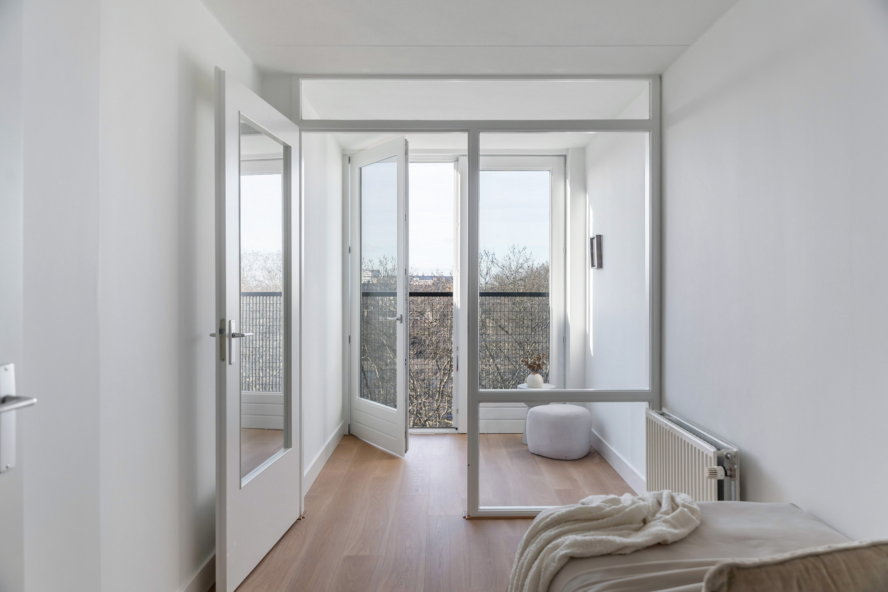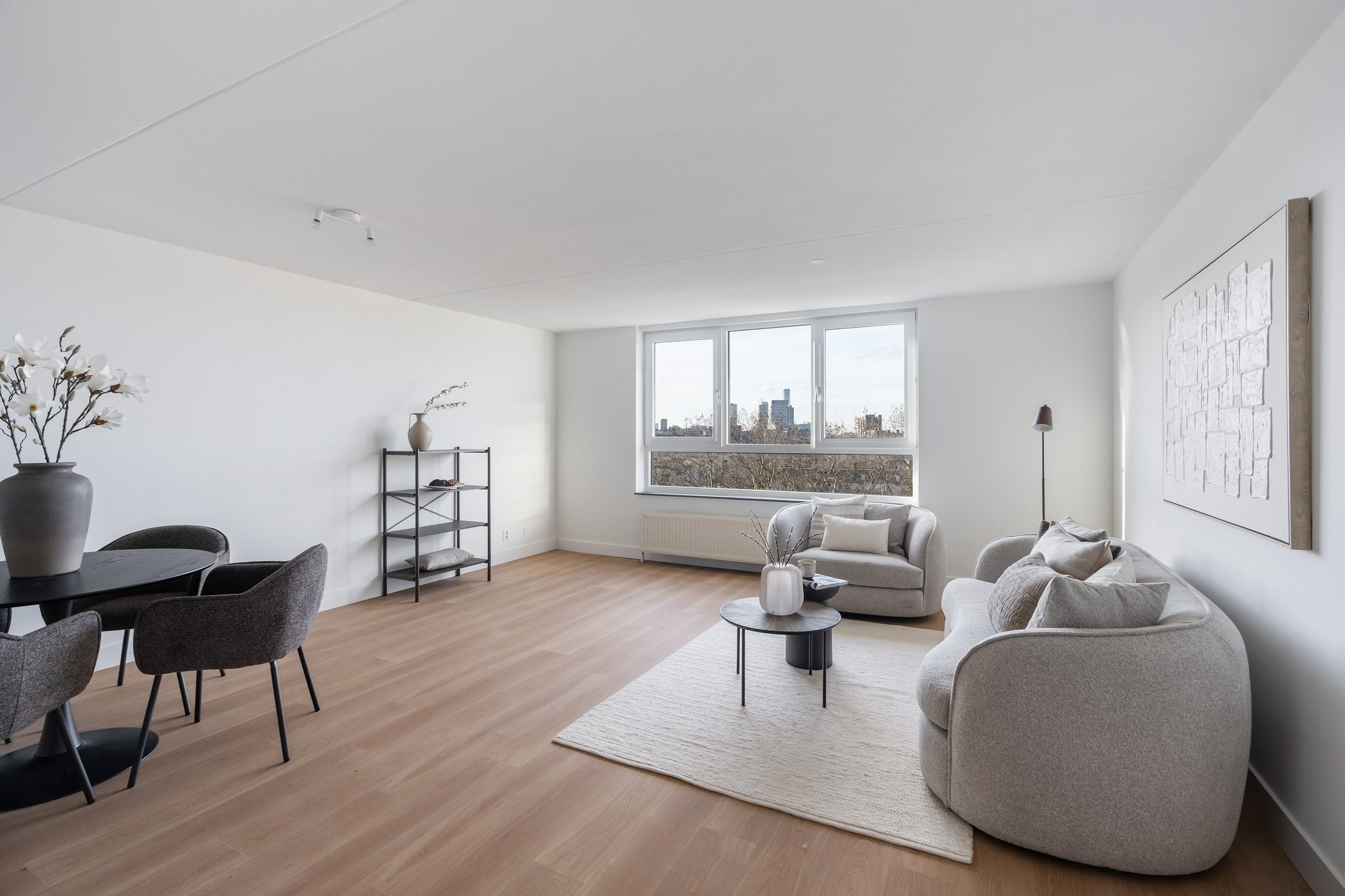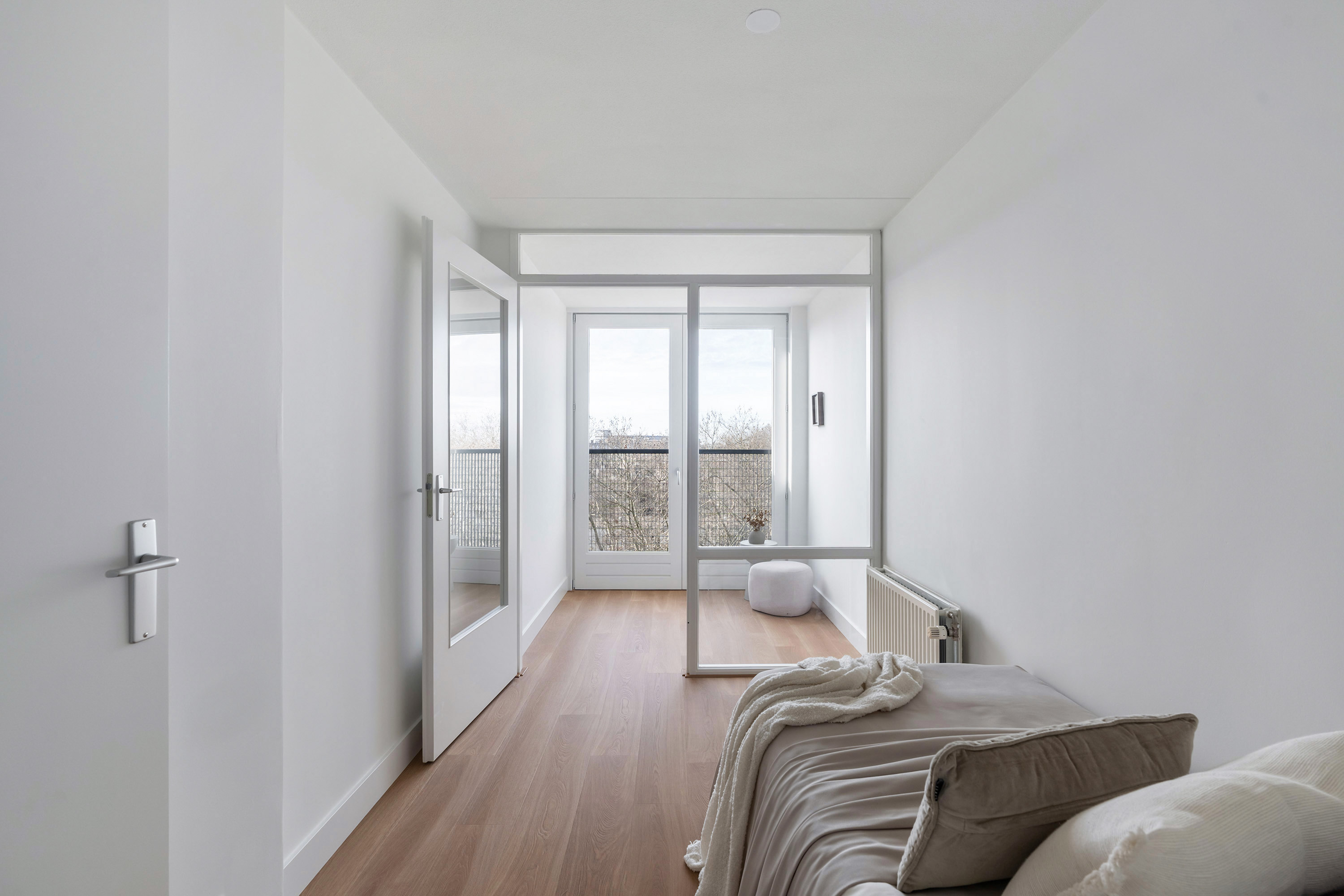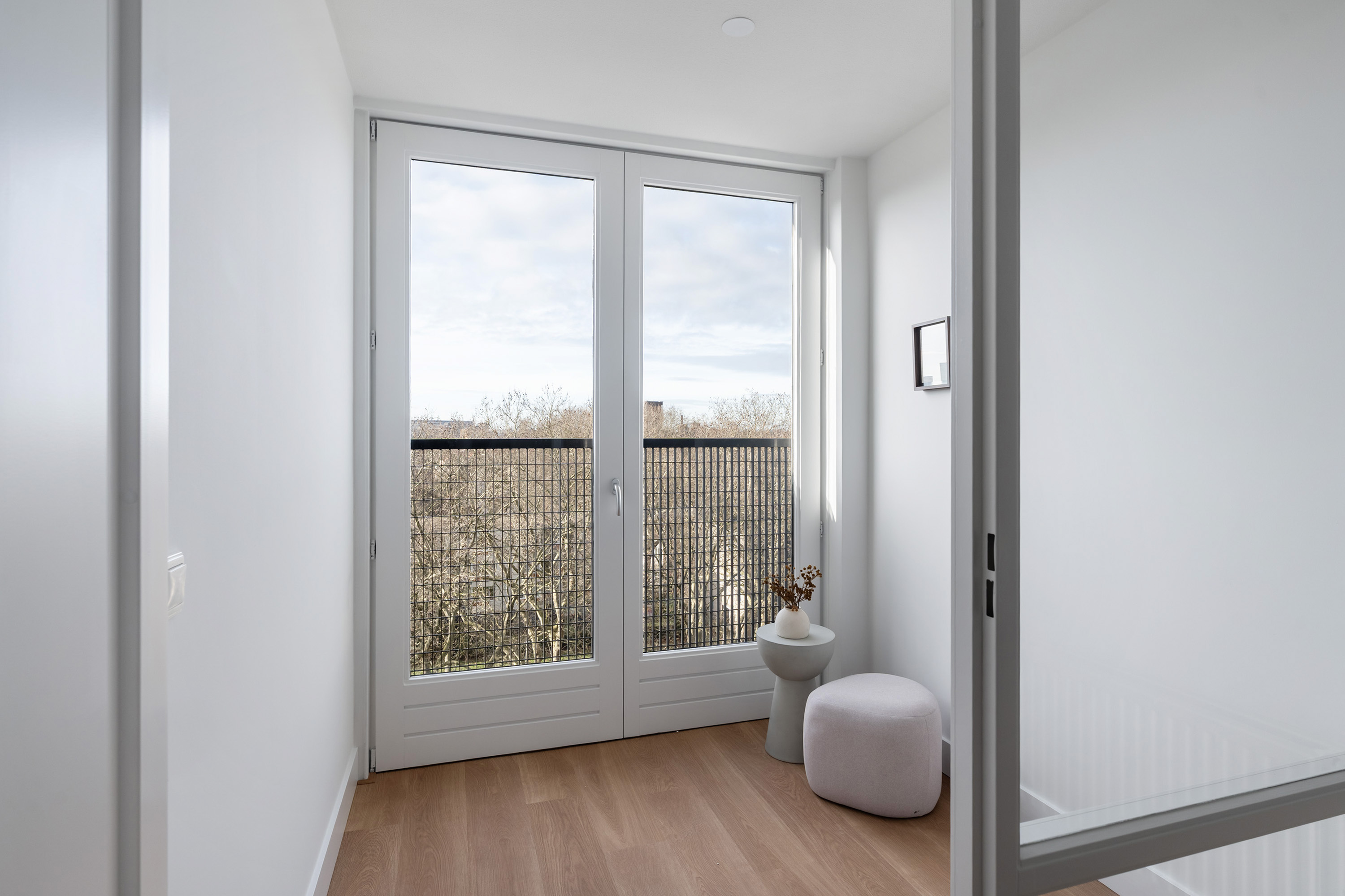 Aan deze zijde zijn ook twee prettige slaapkamers gesitueerd, waarvan er één directe toegang biedt tot de loggia met uitzicht op de skyline van Rotterdam. Hier geniet je in alle rust van het uitzicht, een zeldzaam rustige plek in de stad.