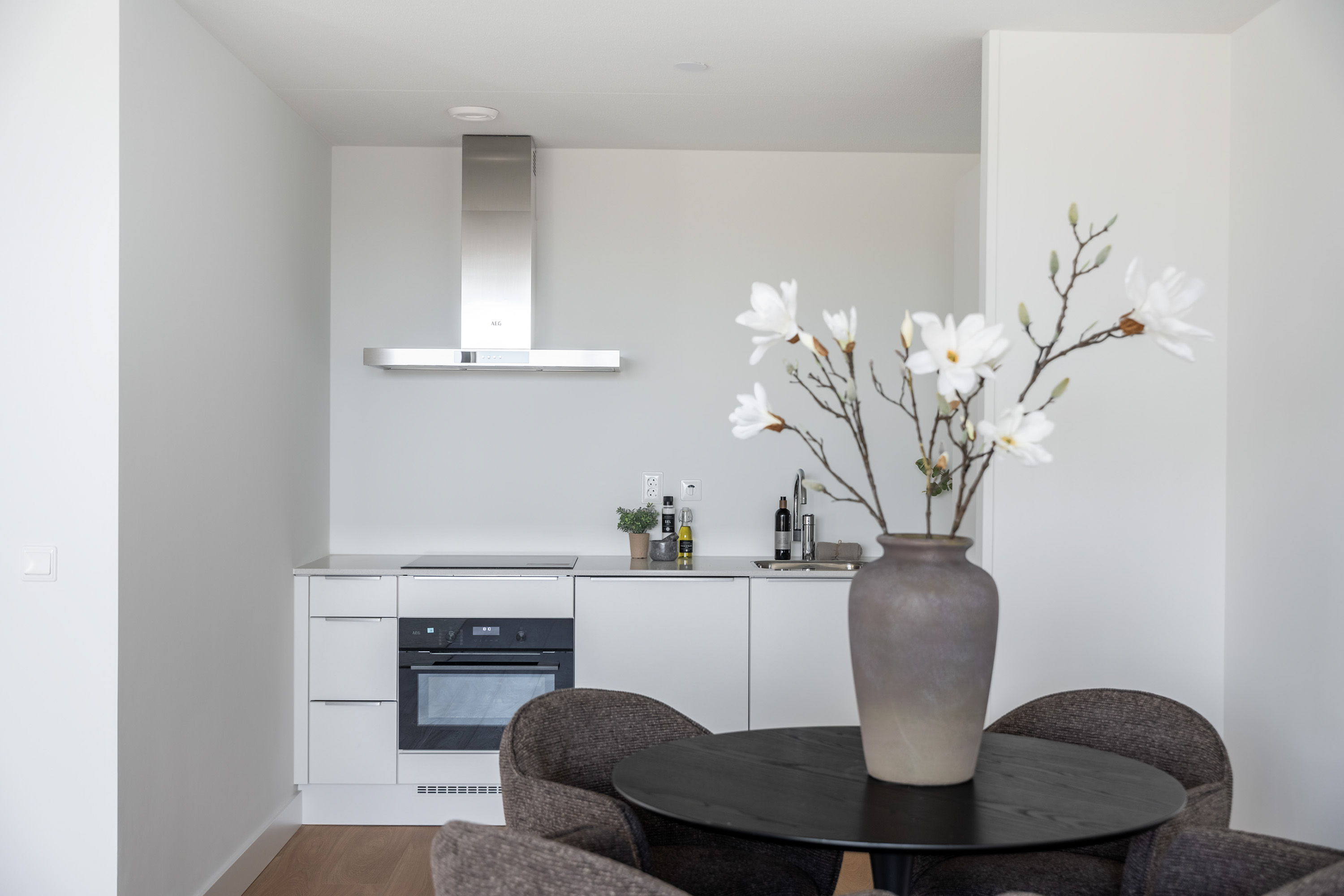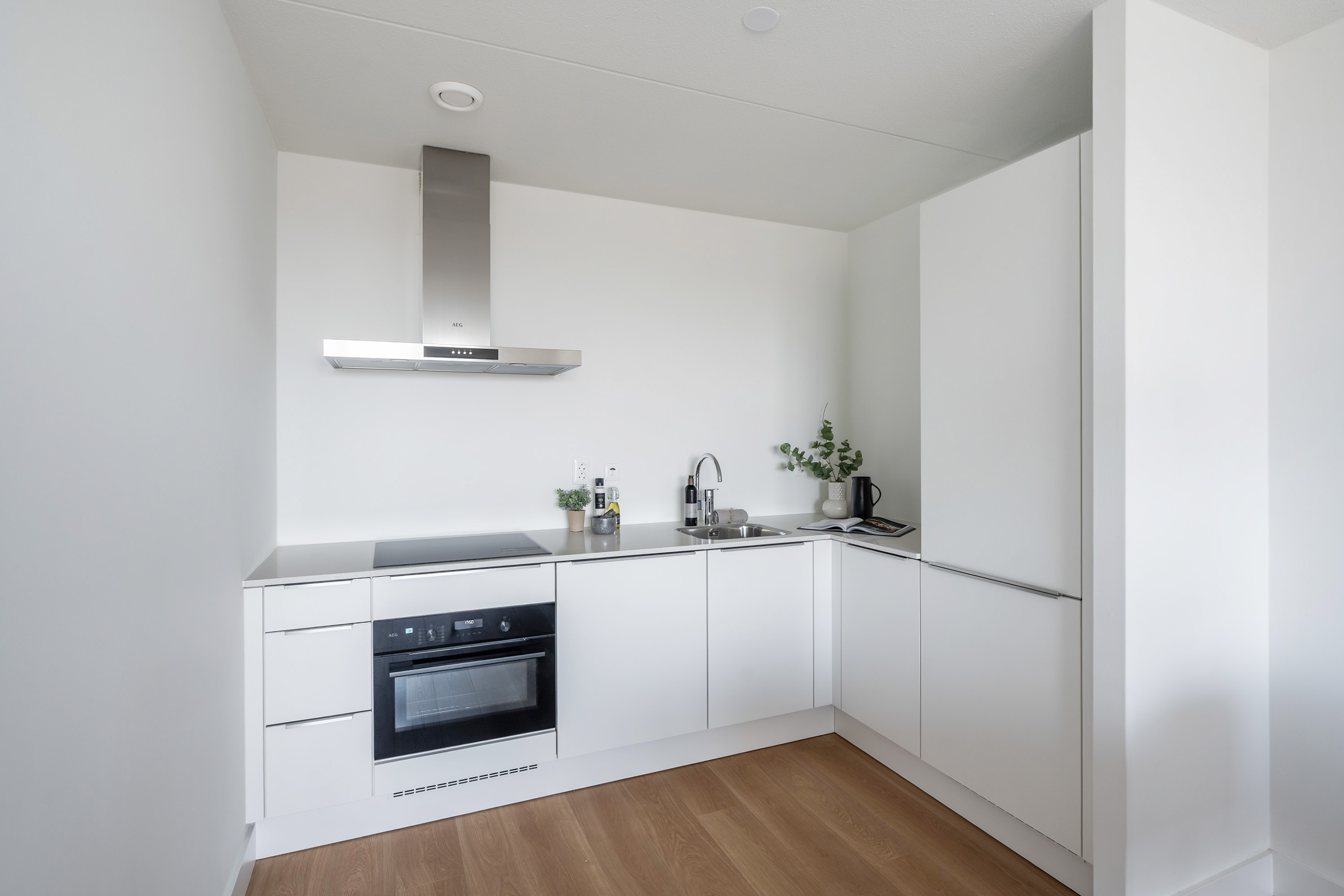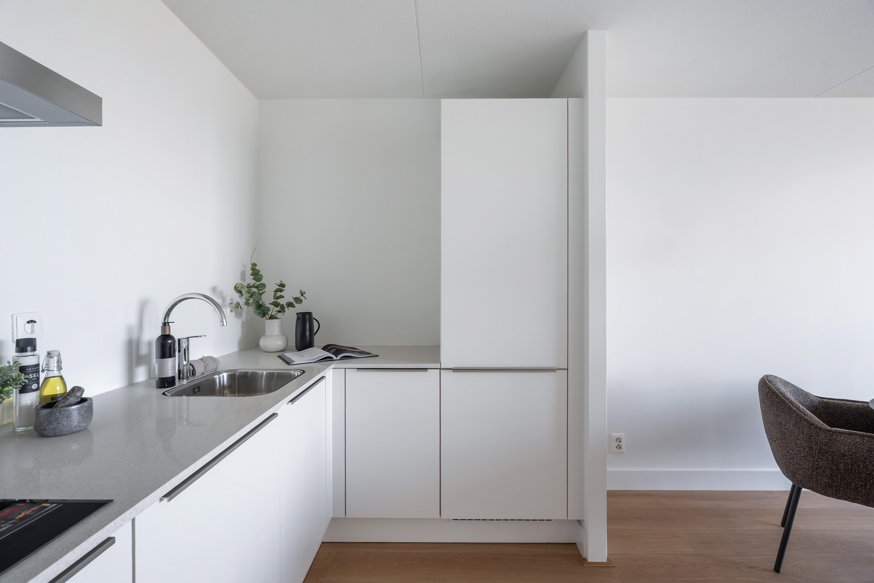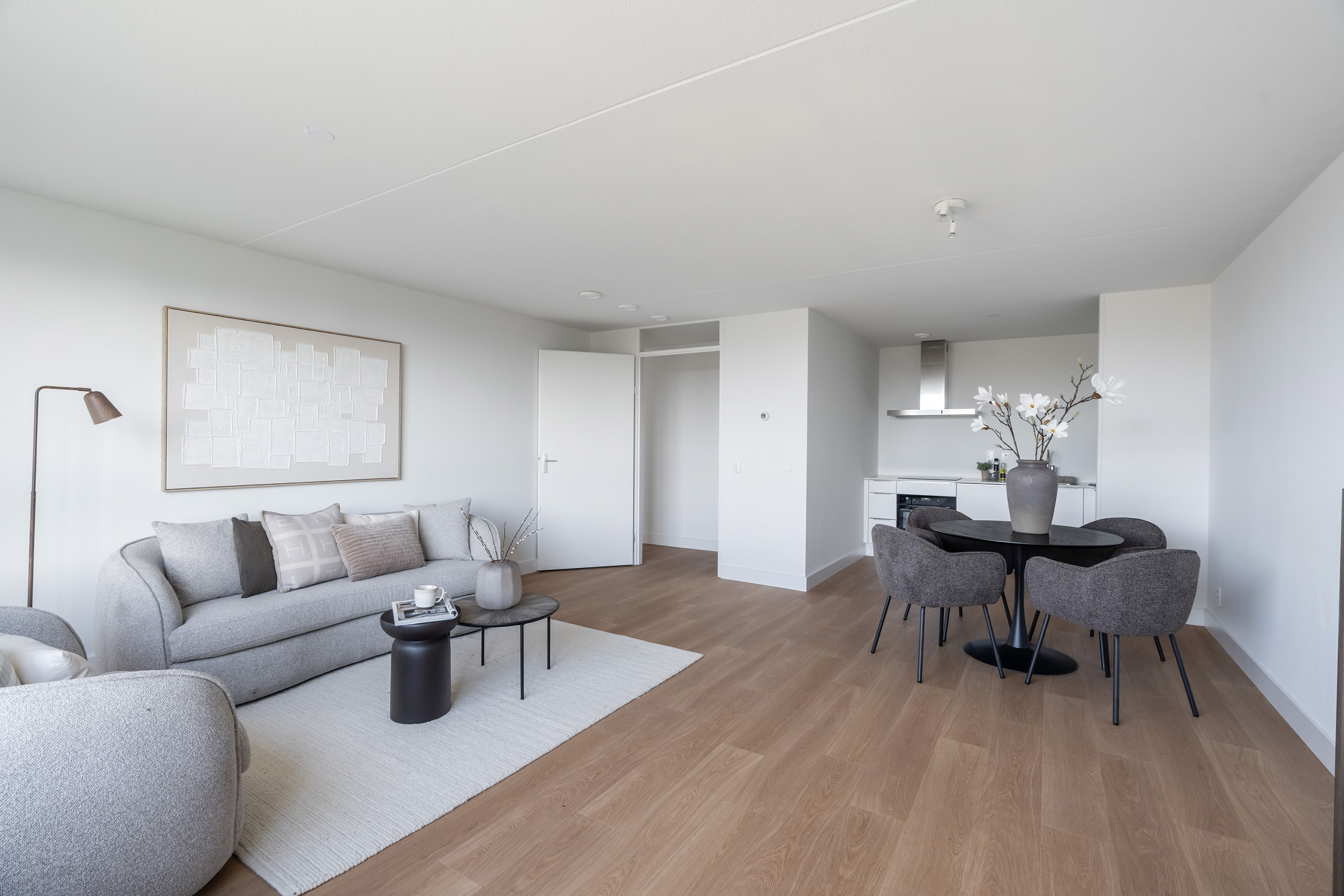 Bij binnenkomst tref je een nette hal die toegang biedt tot alle vertrekken. Door het hele appartement ligt een strak afgewerkte laminaatvloer die zorgt voor een rustige uitstraling en samenhang tussen de ruimtes. Kom binnen in de ruime woonkamer met een eigentijdse open keuken. Echt een fraaie leefruimte waar koken, tafelen en ontspannen moeiteloos samengaan. De keuken is ideaal voor kookliefhebbers: ruim van opzet, voorzien van moderne apparatuur en volop werkruimte.