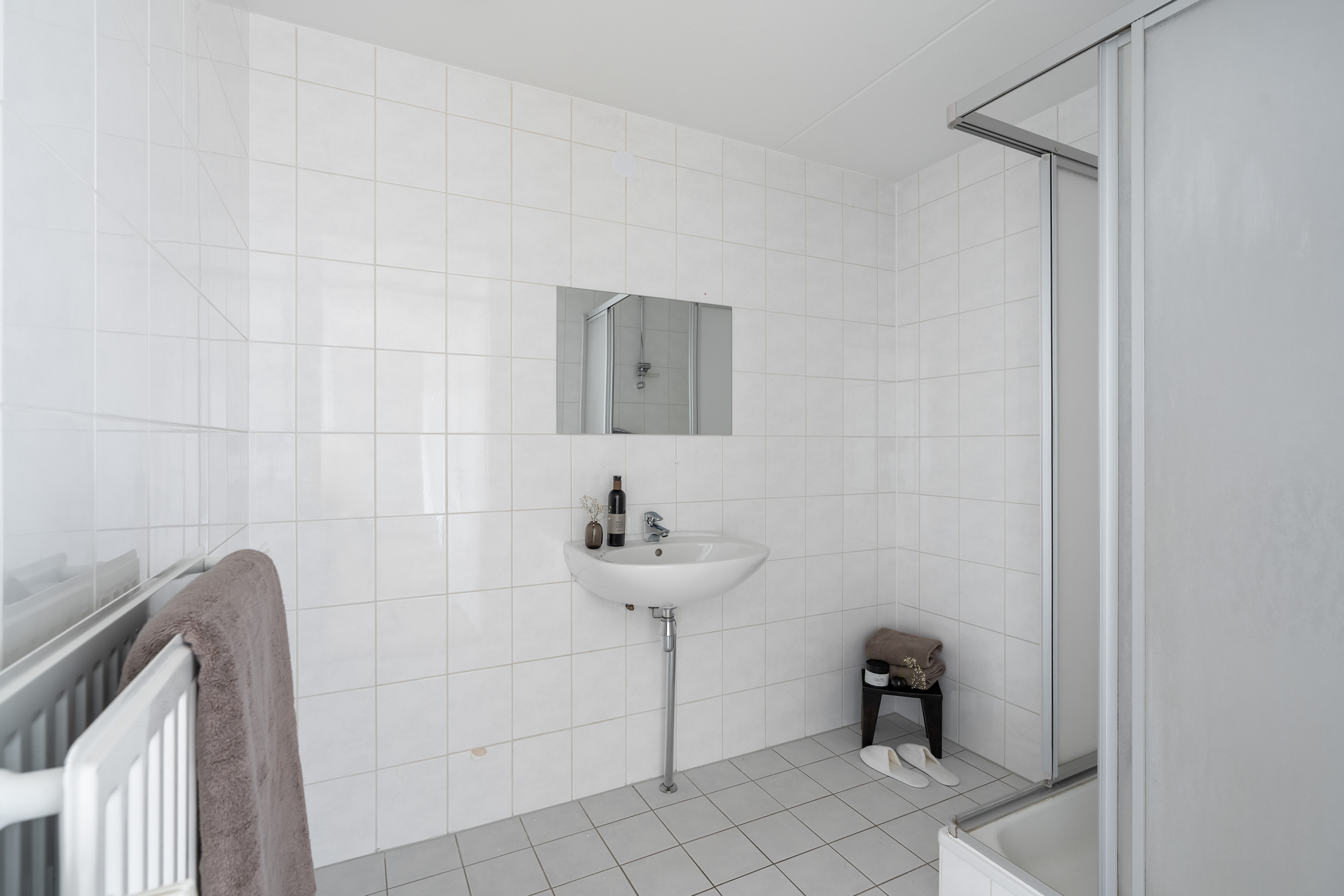 De badkamer beschikt over een douchecabine en een wastafel. Vanuit de hal zijn ook het toilet met separaat fonteintje en een praktische bergruimte met aansluiting voor de wasmachine te bereiken.