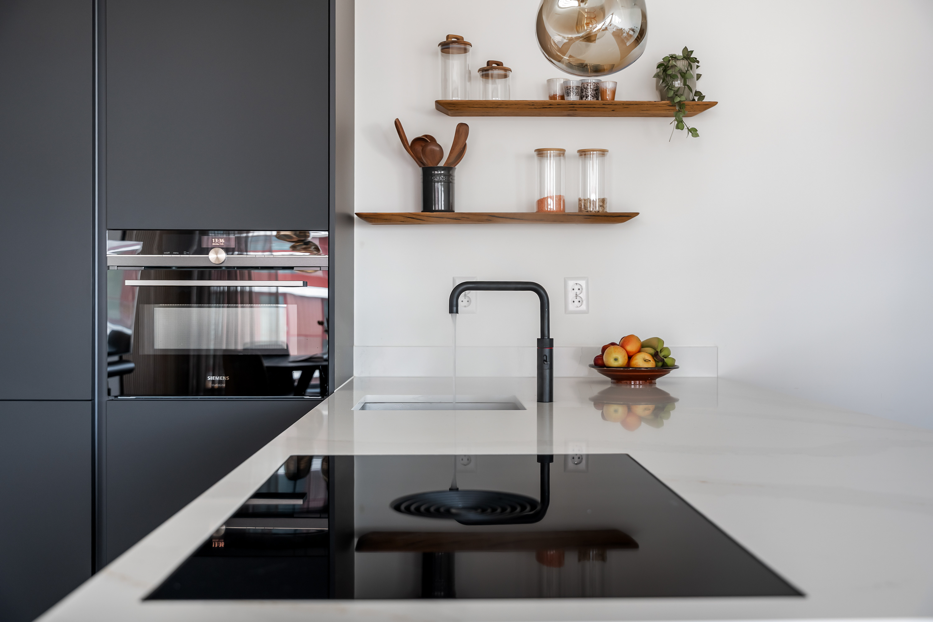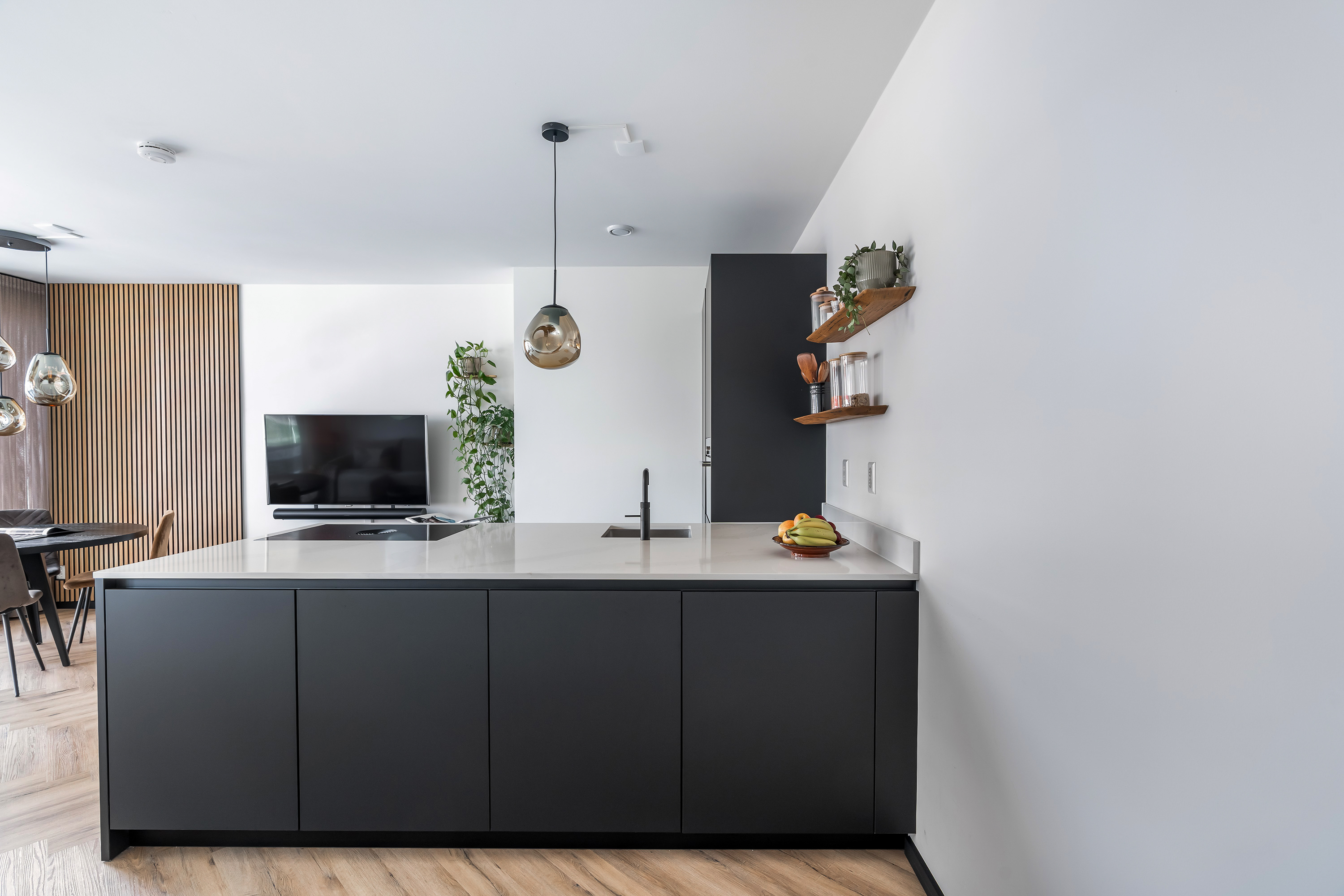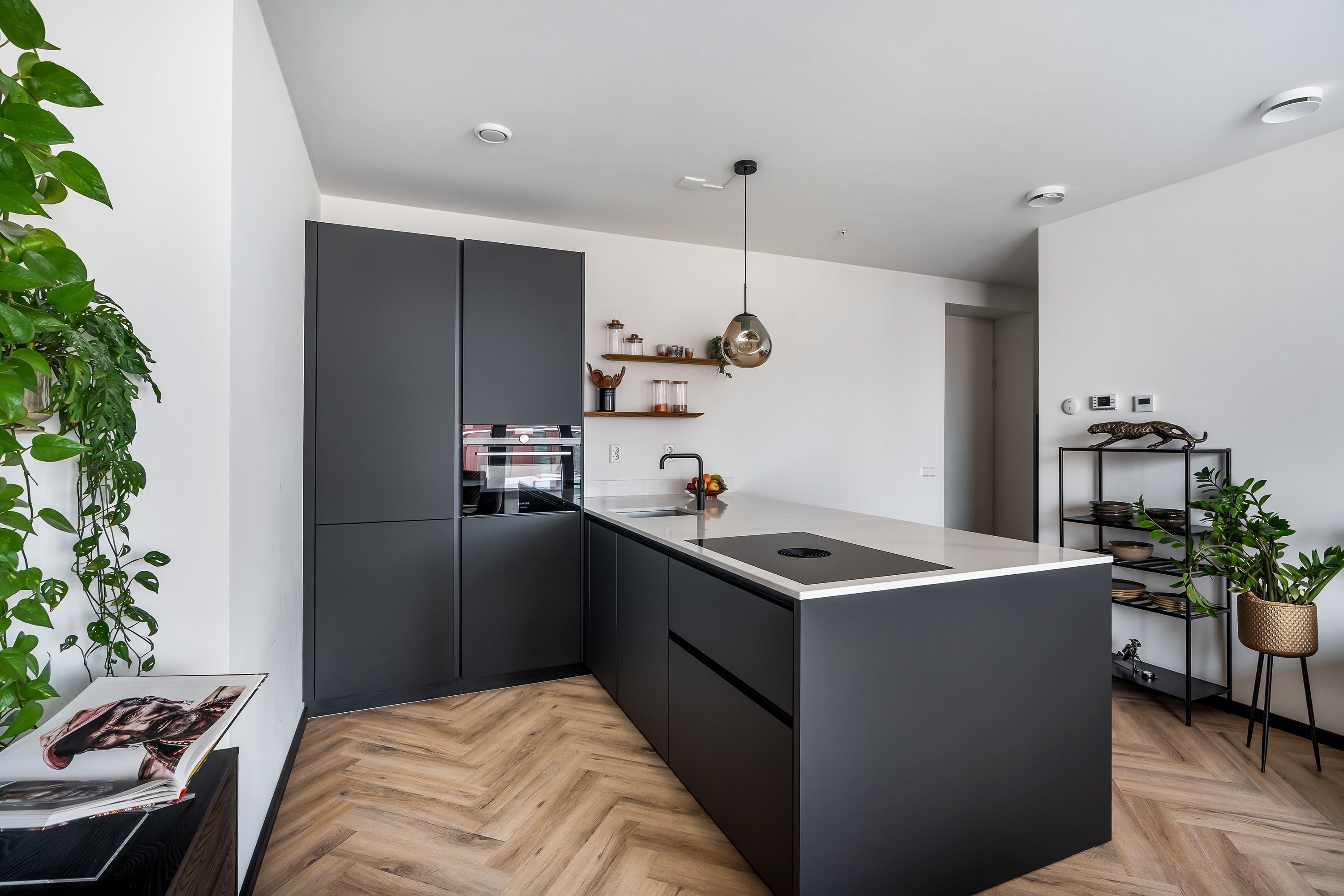 De open keuken is voorzien van een mooie mat zwartenfronten, een werkblad van composiet, een schier-kookeiland en is uitgerust met alle wenselijke inbouwapparatuur: een koelkast, vriezer, combi-oven, vaatwasser, inductiekookplaat (BORA) met geïntegreerde afzuiging, en een Quooker voor direct kokend water.