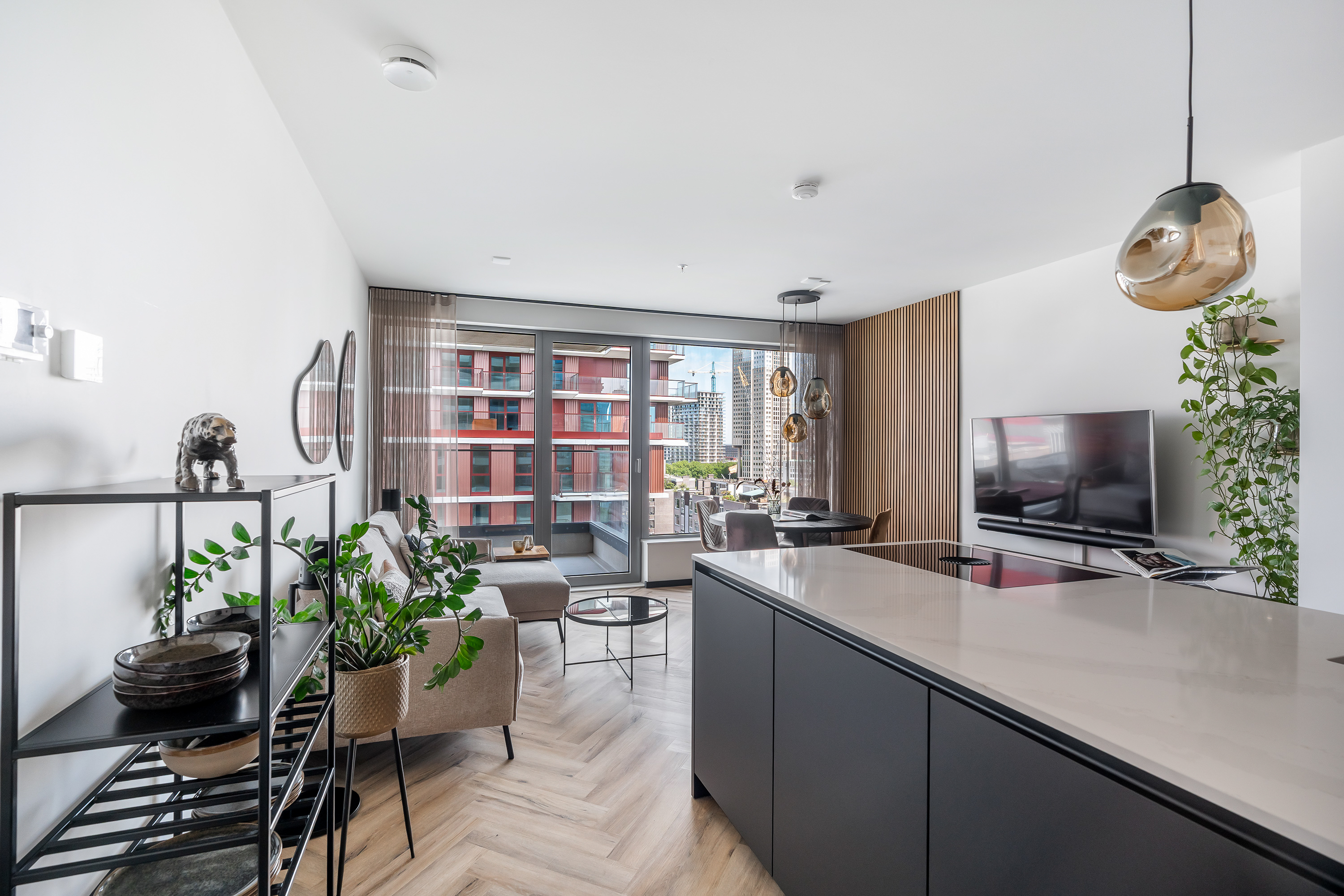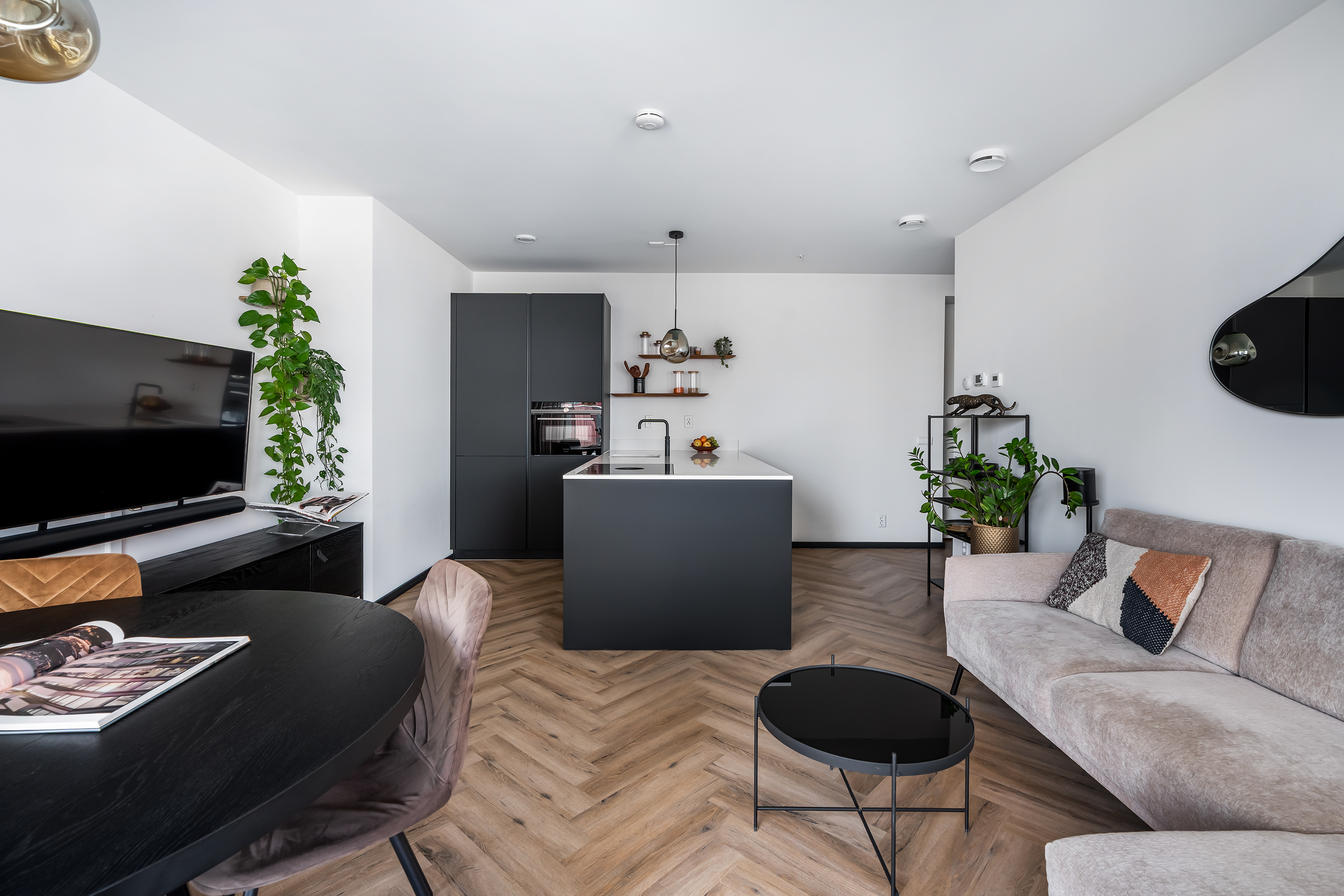 Je komt het appartement binnen via de hal, die toegang biedt tot alle vertrekken. Wat direct opvalt is de grote glaswand in de woonkamer, hierdoor heb je heel veel natuurlijke lichtinval. De woonkamer is ruim en heerlijk licht dankzij de grote raampartijen en een schuifpui naar het balkon van circa 10 m². gelegen op het noordoosten. Perfect gepositioneerd om te genieten van de ochtendzon en een kop koffie met uitzicht. De vloer is voorzien van een luxe, strak gelegde visgraatvloer die doorloopt in de gehele woning.