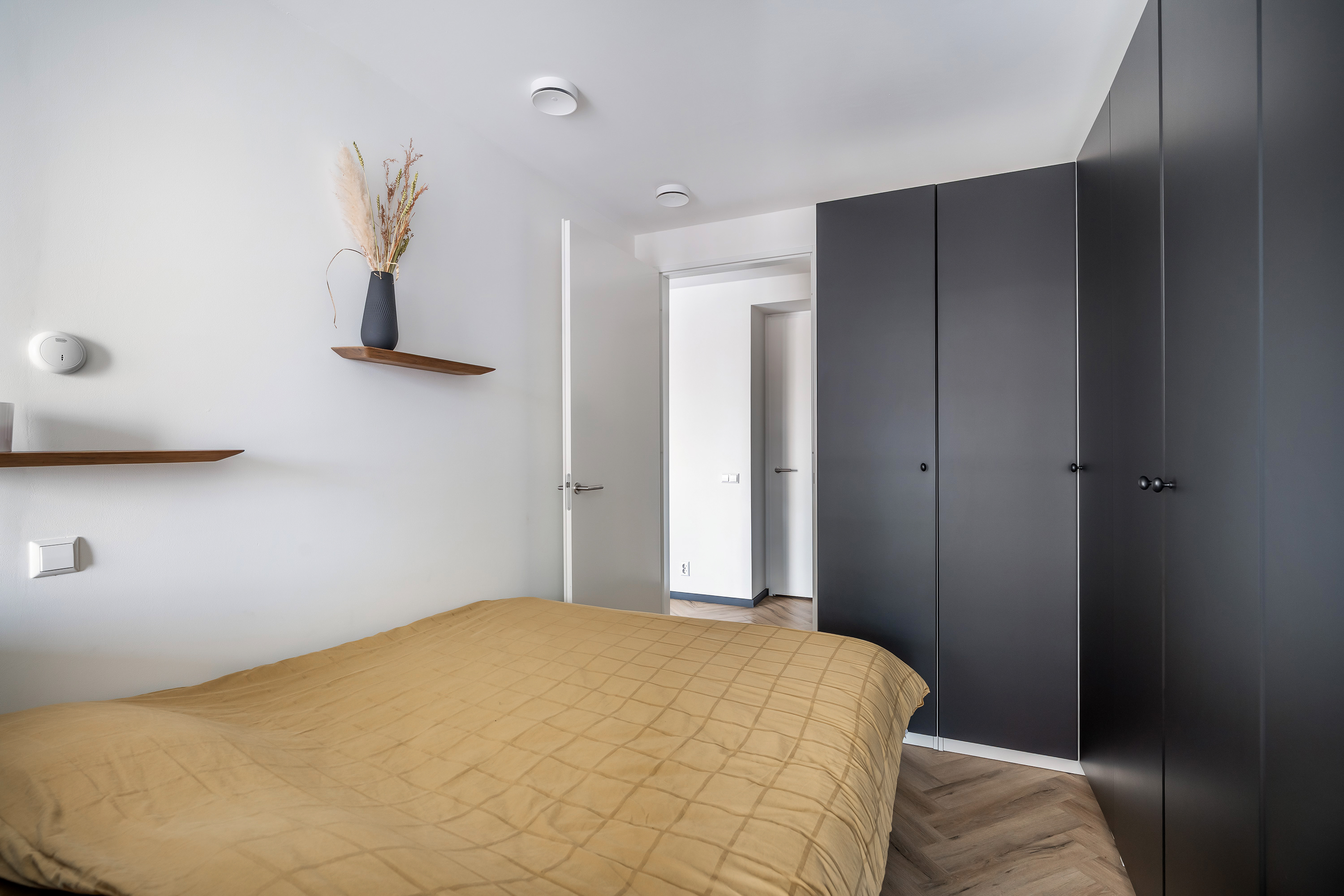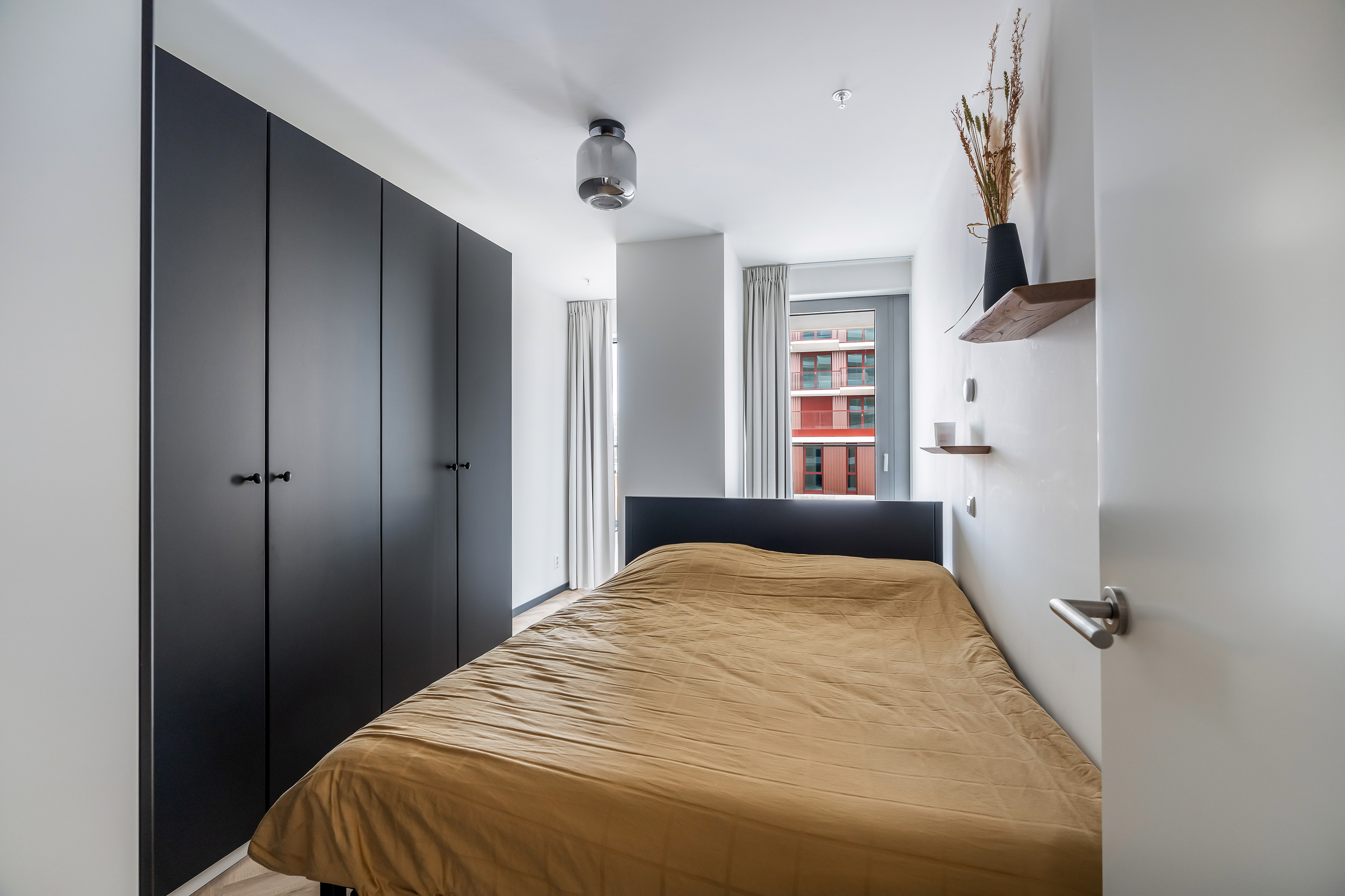 The bedroom, like the rest of the apartment, benefits from abundant natural light and offers ample space for a double bed and large wardrobe. From here, you can also enjoy the expansive city view. The bathroom is finished to a high standard, with a walk-in shower, double washbasin, designer radiator, and washing machine connection cleverly concealed behind a separate door that also provides additional storage. The toilet with small washbasin is separate, located in the hallway.