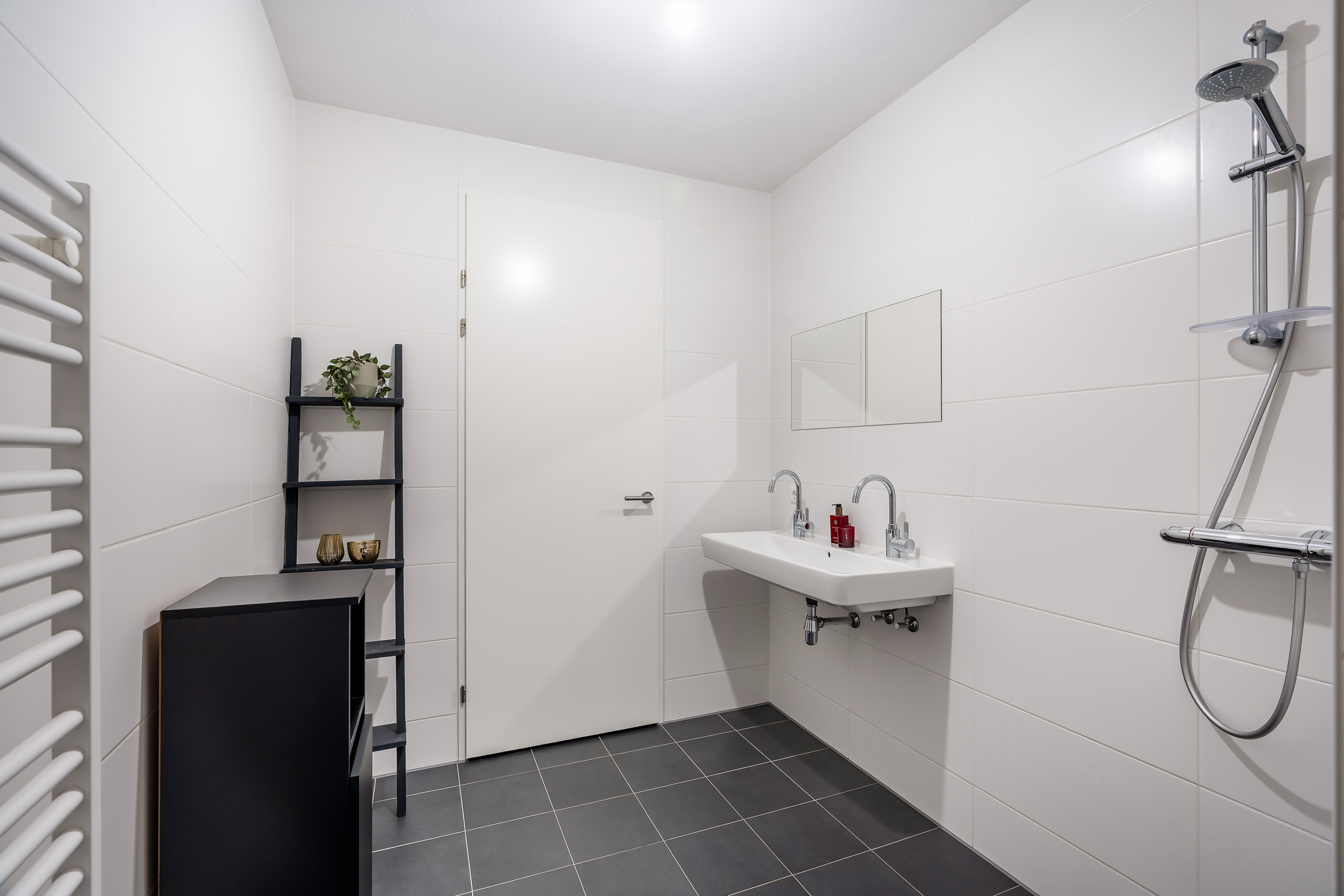De slaapkamer is net als de rest van de woning voorzien van veel natuurlijk licht, met voldoende ruimte voor een tweepersoonsbed en een grote garderobekast. Vanuit hier geniet je eveneens van het weidse uitzicht. De badkamer is strak afgewerkt met een inloopdouche, dubbele wastafel, designradiator en de aansluiting voor de wasmachine, slim weggewerkt achter een aparte deur, waar ook nog wat opbergruimte is. Het toilet met fonteintje bevindt zich apart, in de gang.