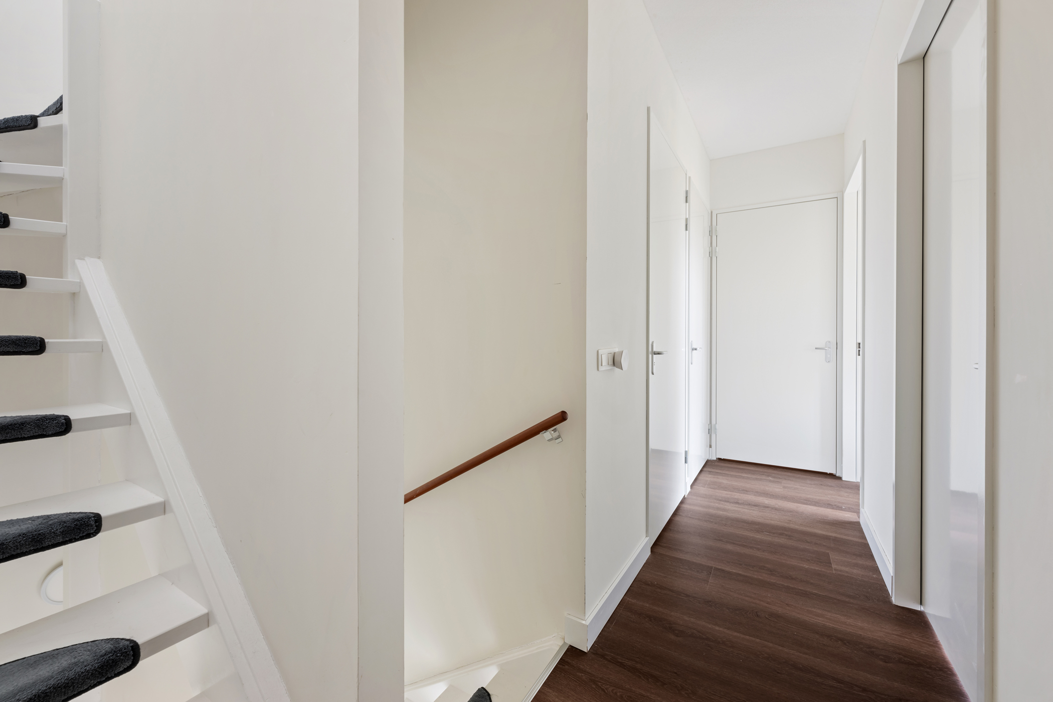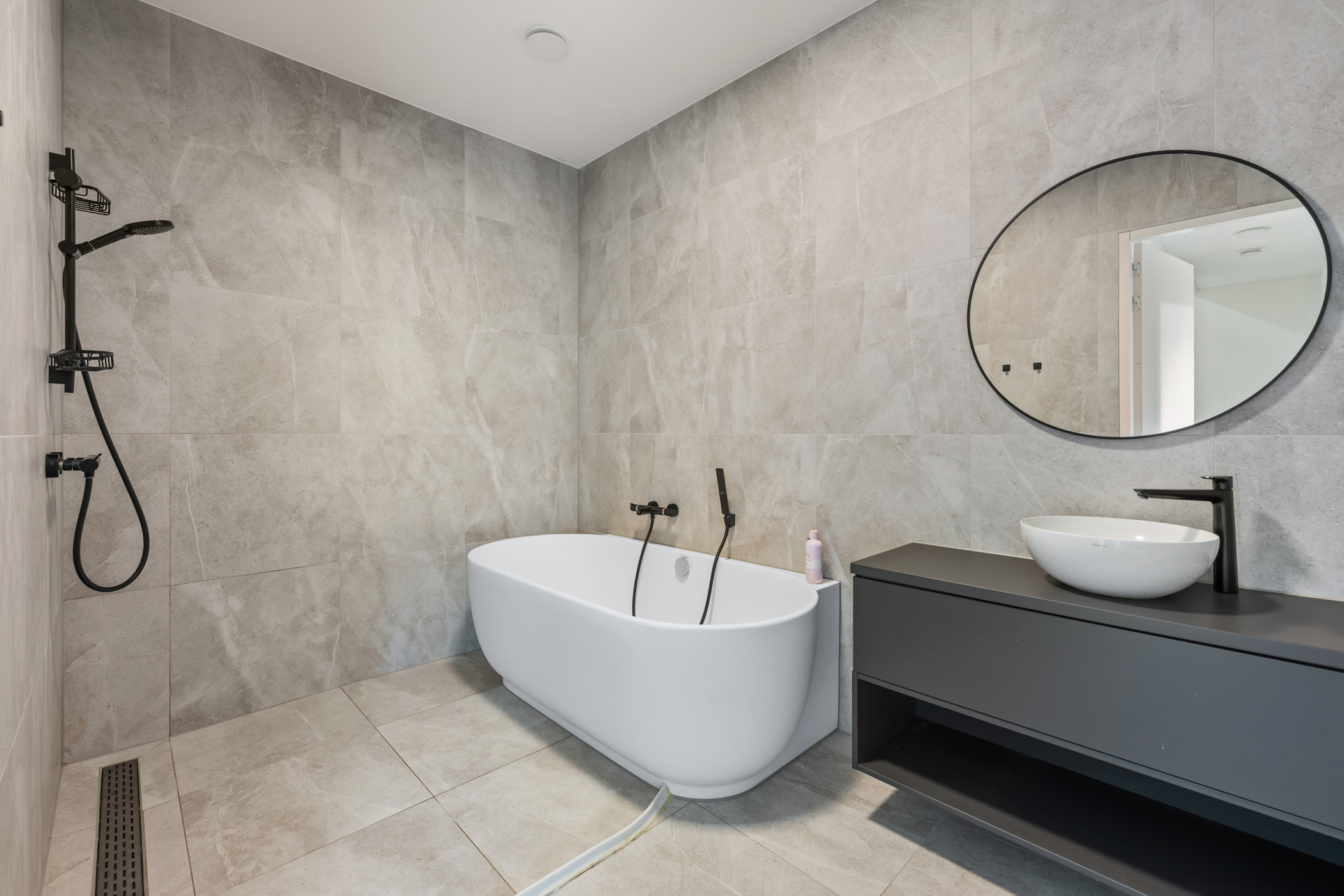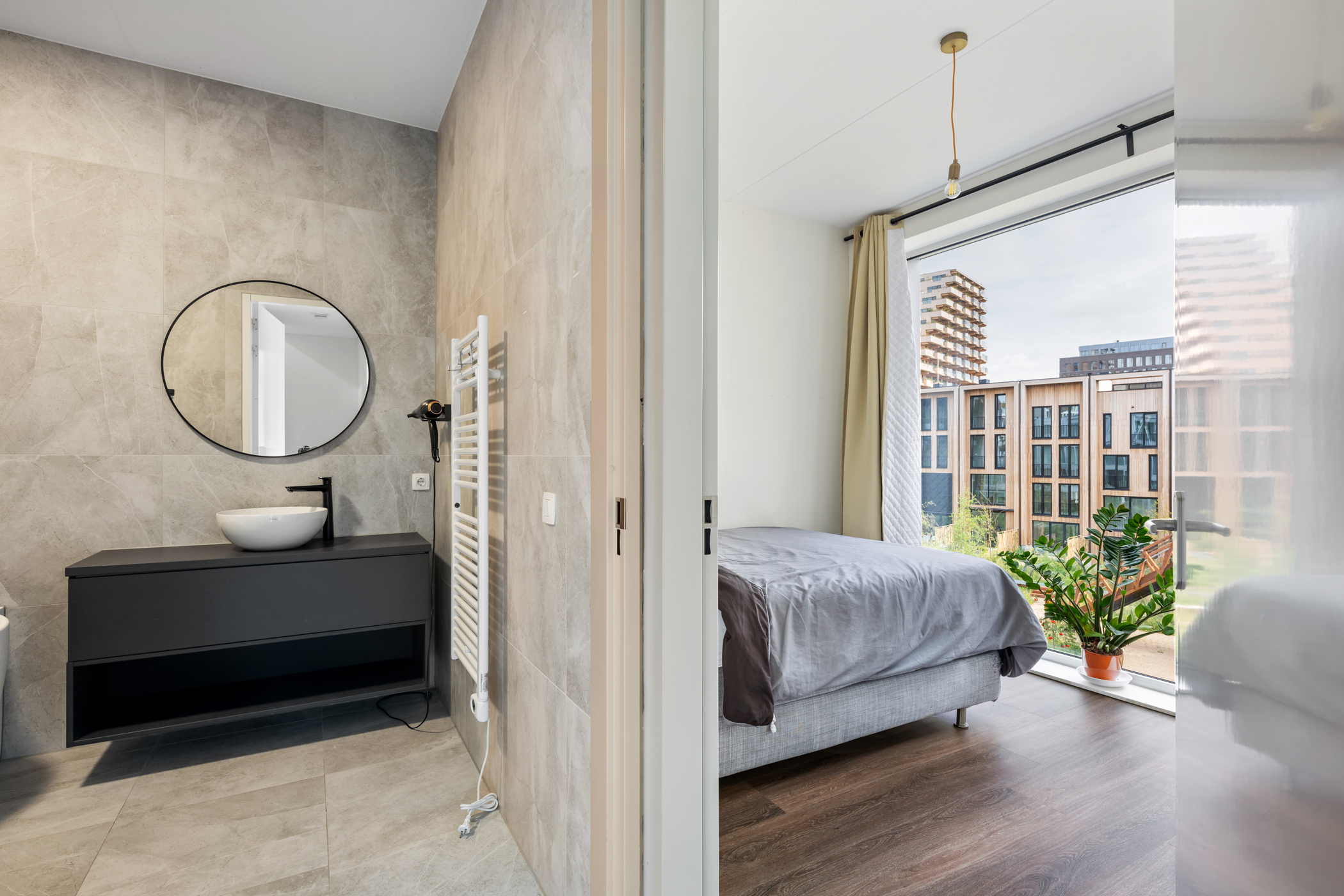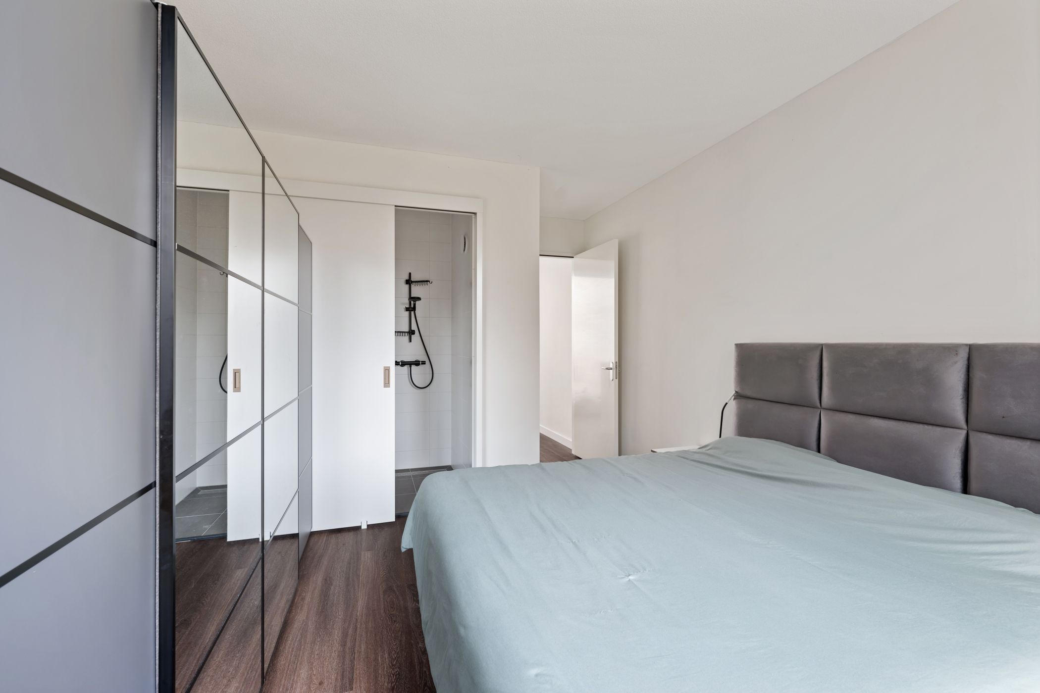 Hier bevinden zich twee ruime slaapkamers, beide met grote raampartijen van vloer tot plafond. De badkamer is een luxe wellnessruimte met een strak wastafelmeubel, ligbad, royale inloopdouche en stijlvol tegelwerk. Een separate toiletruimte en een handige berging met wasmachine-/drogeraansluiting maken deze verdieping compleet. Alles straalt comfort, luxe en eigentijds design uit.