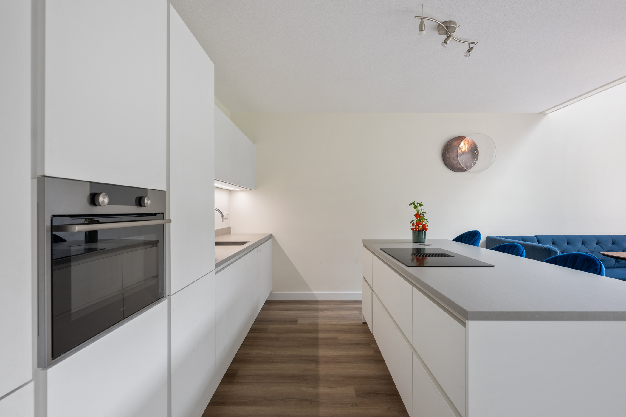 Via de stijlvolle entree betreed je een indrukwekkende leefruimte met hoge raampartijen die zorgen voor een overvloed aan lichtinval. De moderne open woonkeuken vormt het hart van deze verdieping: een royaal kookeiland met barfunctie nodigt uit tot gezellige borrels, etentjes of een goed gesprek tijdens het koken. De keuken is luxe uitgevoerd met strakke greeploze fronten, een strak werkblad, en hoogwaardige inbouwapparatuur: een inductiekookplaat met geïntegreerde afzuiging, een Quooker, vaatwasser, combi-oven en een koel-vriescombinatie. Dankzij de royale schuifpui (welke helemaal open kan) heb je een directe verbinding met de tuin van ca. 28 m², waar je op zonnige dagen heerlijk buiten kunt genieten.
