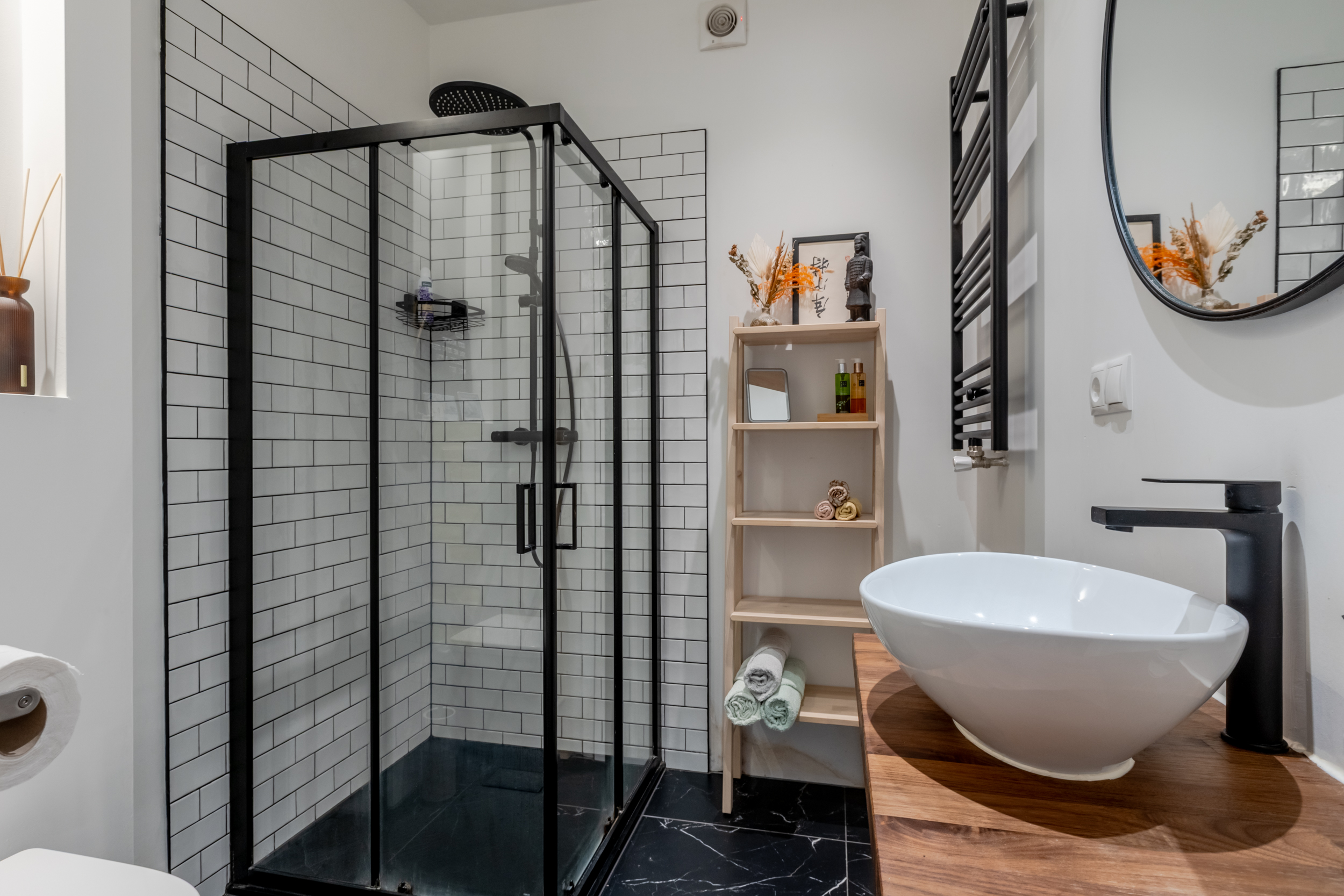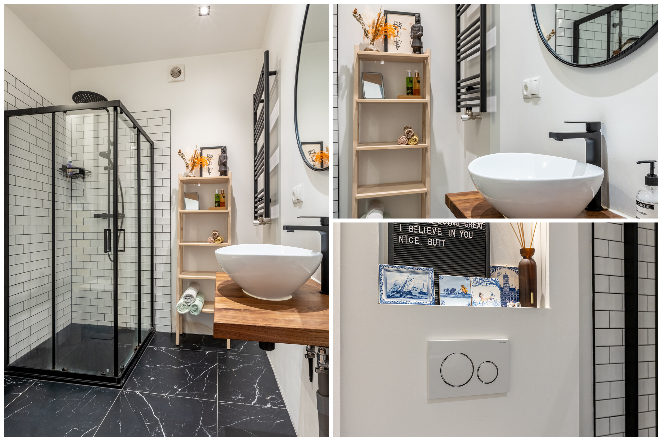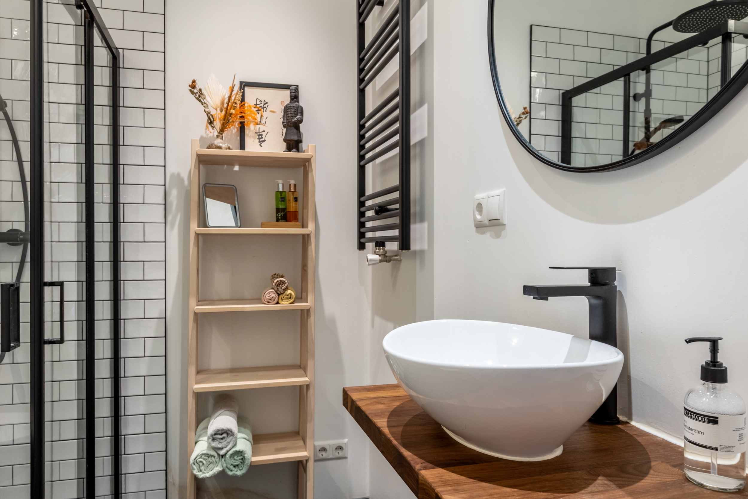 Terug in de woning bereik je via de authentieke en suitedeuren de slaapkamer aan de voorzijde. Een heerlijke plek om je 's avonds in alle rust terug te trekken. De moderne badkamer is eveneens bereikbaar vanuit de woonkamer en is voorzien van een regendouche, toilet en wastafel. Een frisse, comfortabele ruimte om de dag ontspannen te beginnen.