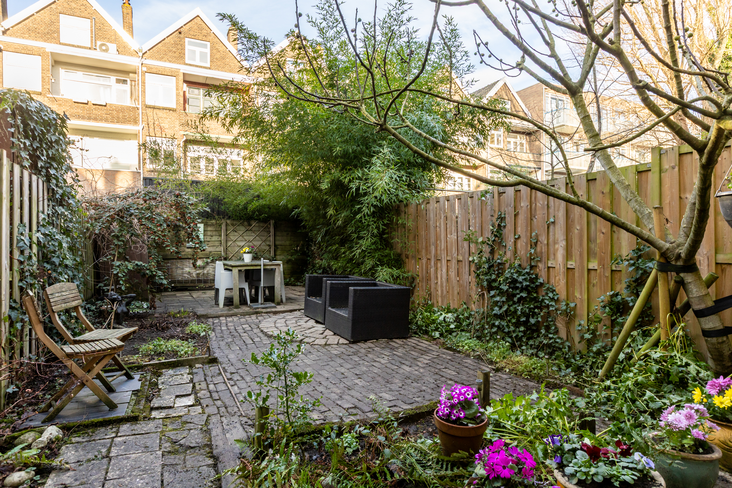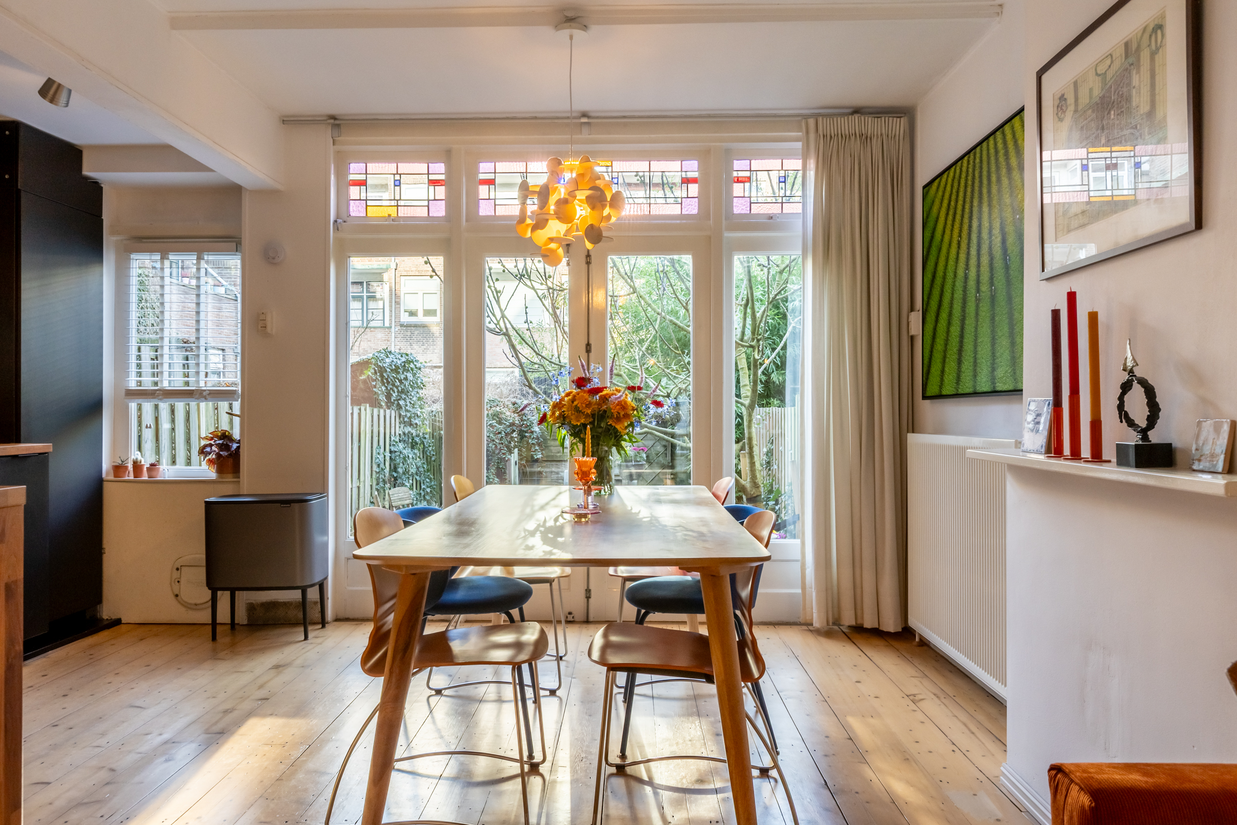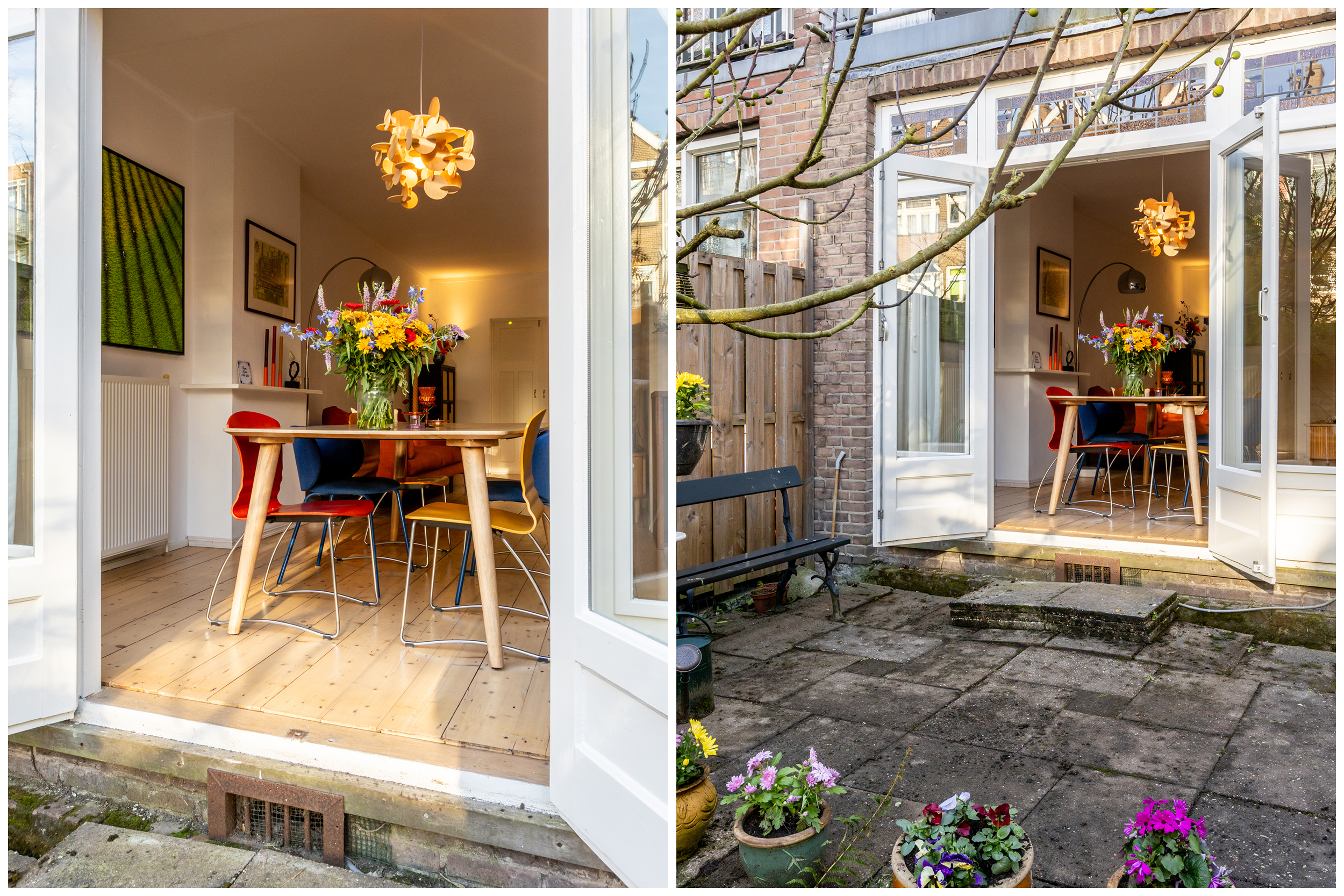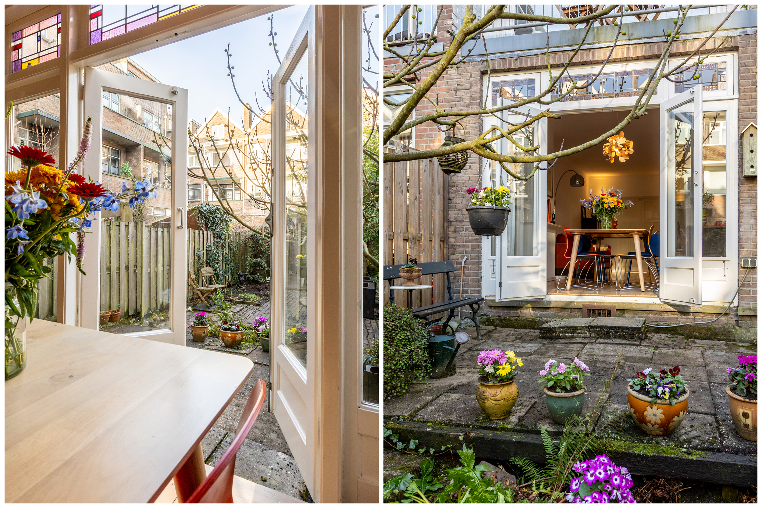 Dankzij de openslaande deuren met glas-in-lood stroomt het licht rijkelijk naar binnen en verbindt het binnen op natuurlijke wijze met buiten. De tuin op het noorden van circa 60 m2 is een echte groene oase midden in de stad. Of je nu geniet van een goed boek, een glas wijn of simpelweg de rust van het buiten zijn, deze tuin is een plek om te genieten.